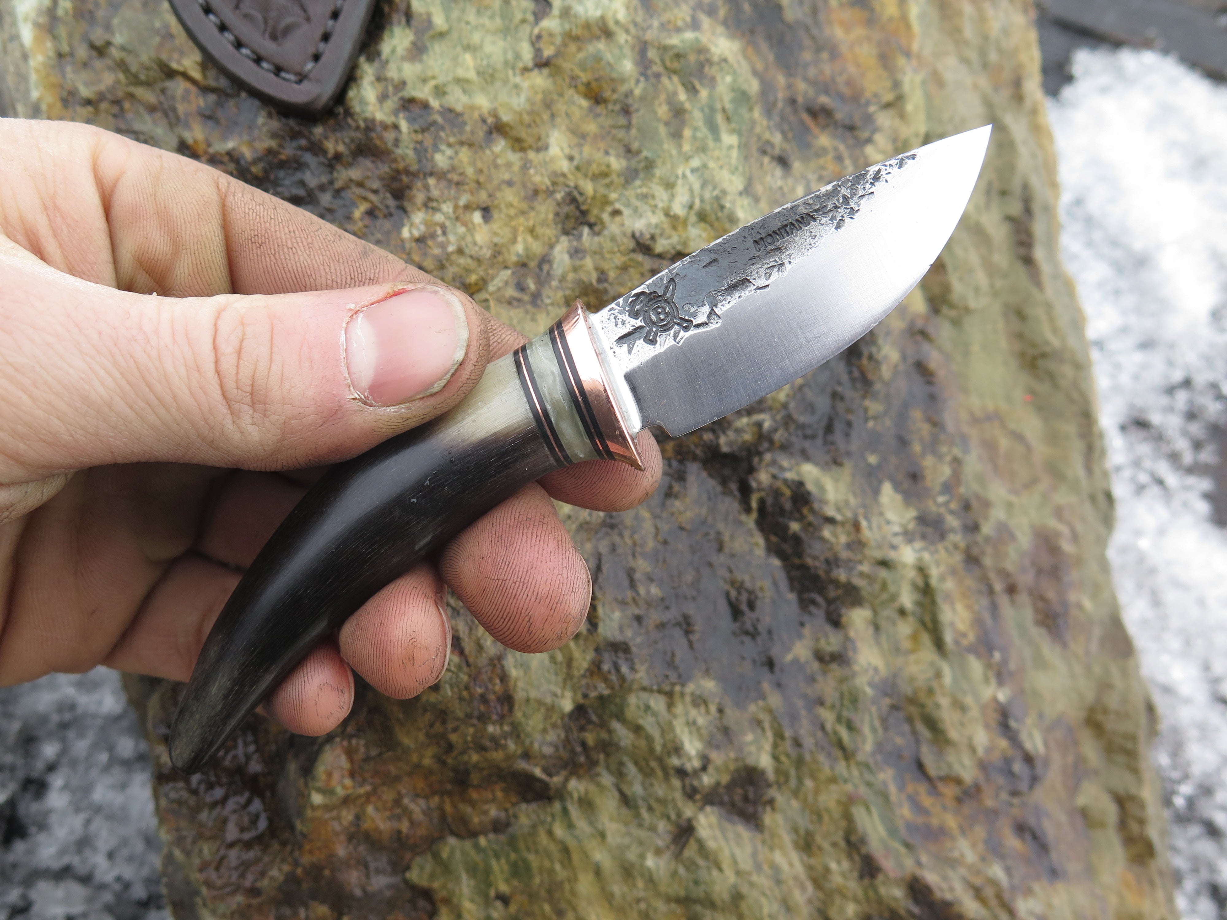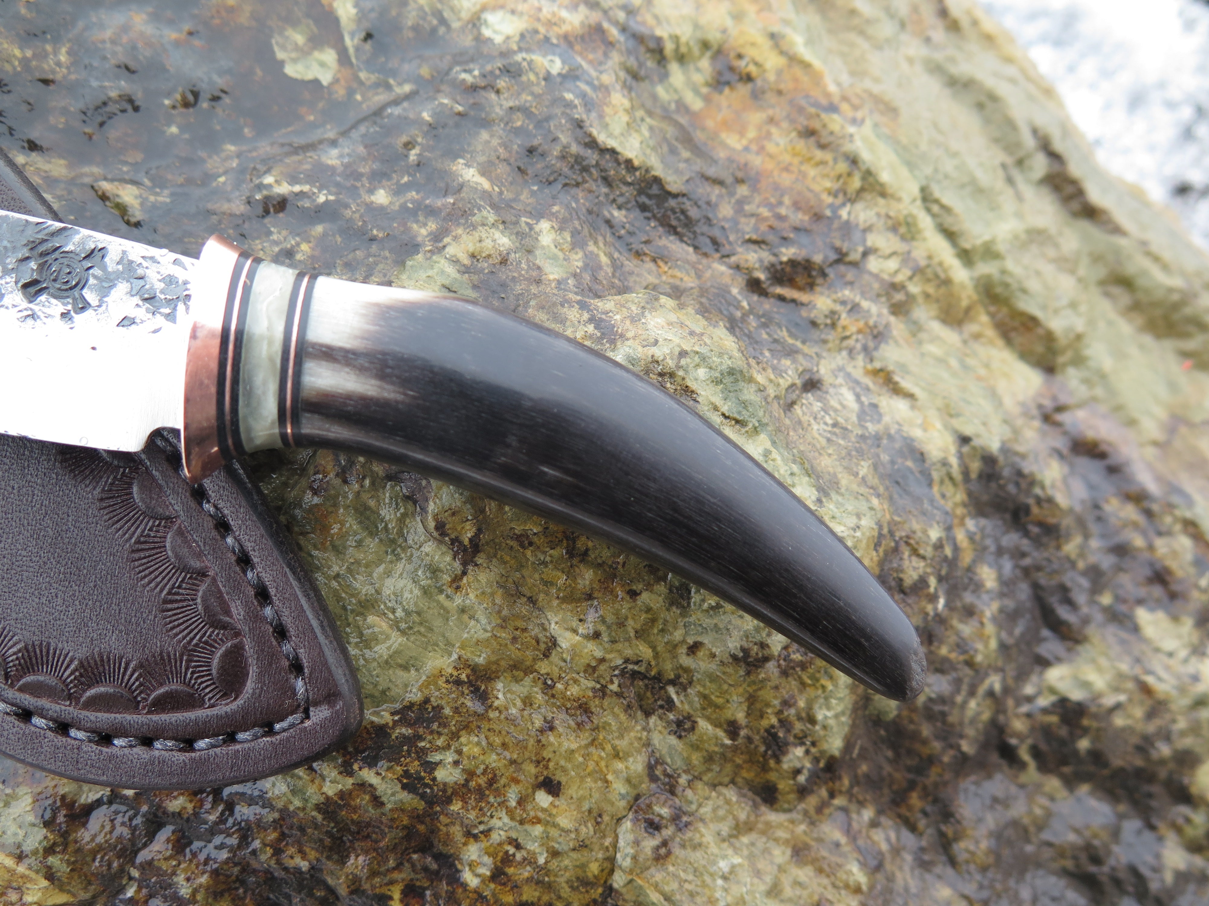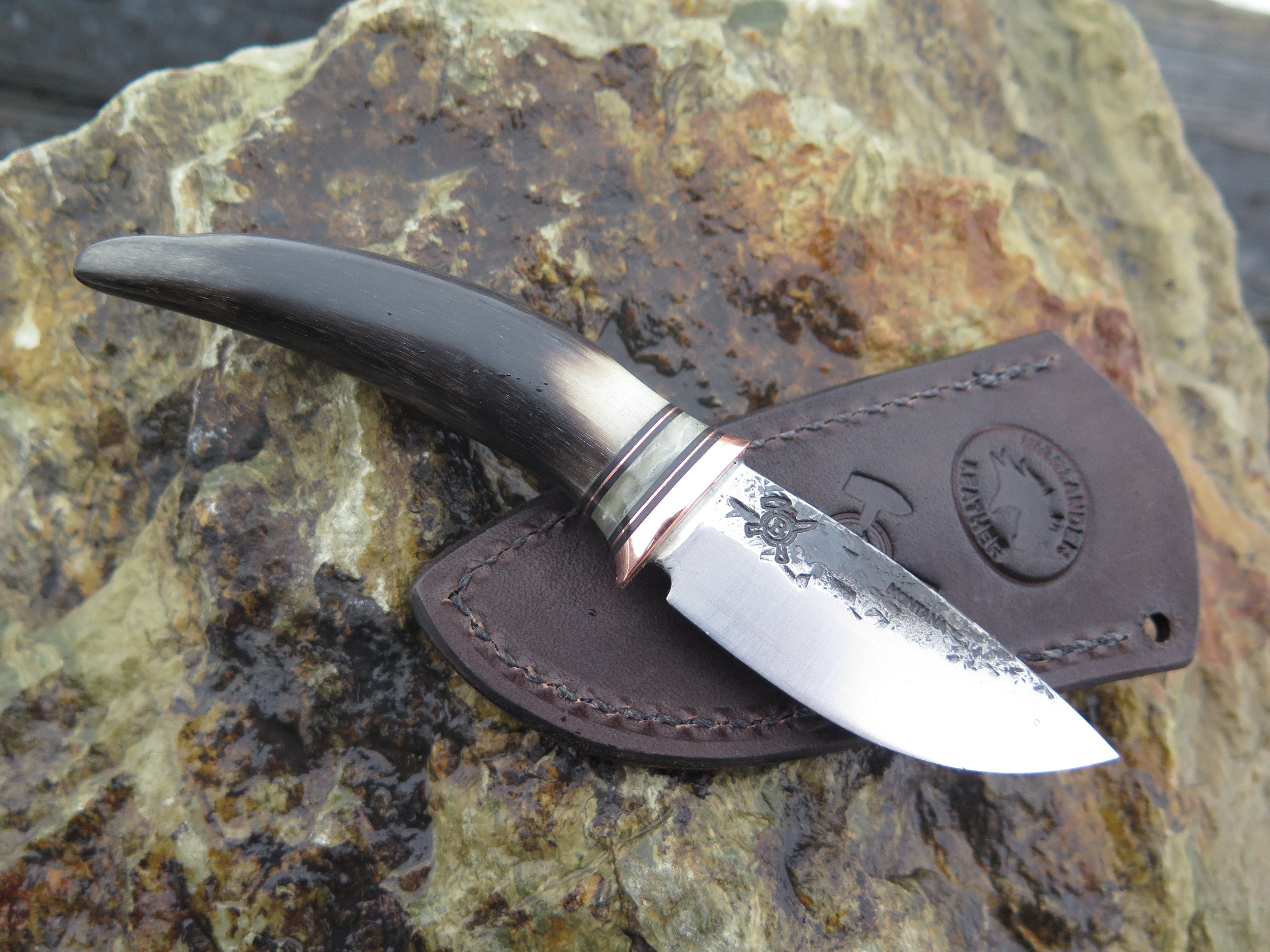 This bad ass new 5th pocket from Behring Made© features a drop point profile with our hammermark finish and it measures 2 3/8" with a razor sharp hollow grind. The copper guard is soldered in place above black fiber, copper and musk ox boss spacers. The handle is the tip (or "tine") of a beautiful black musk ox horn and it brings our overall length to measure 5 1/2". It's designed to ride in the small pocket of your britches and comes in premium Warlander Leather to boot.