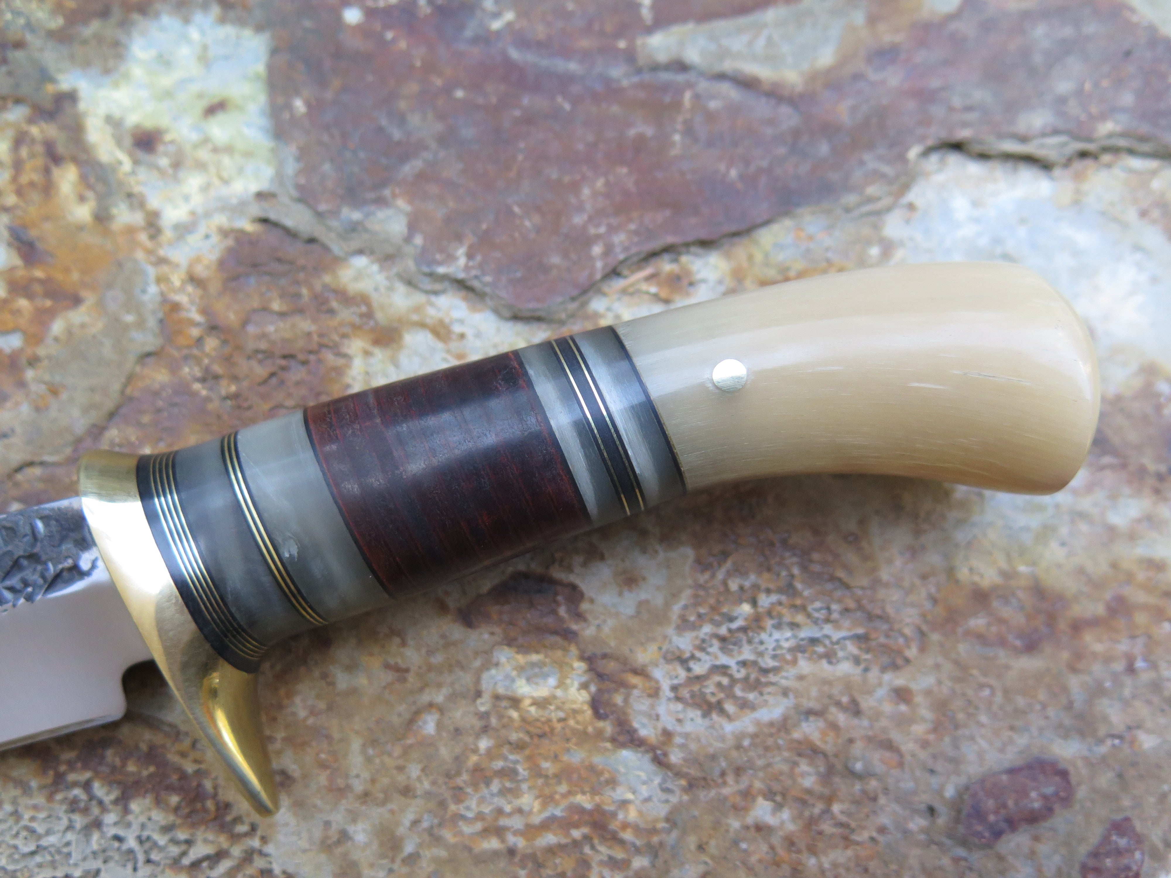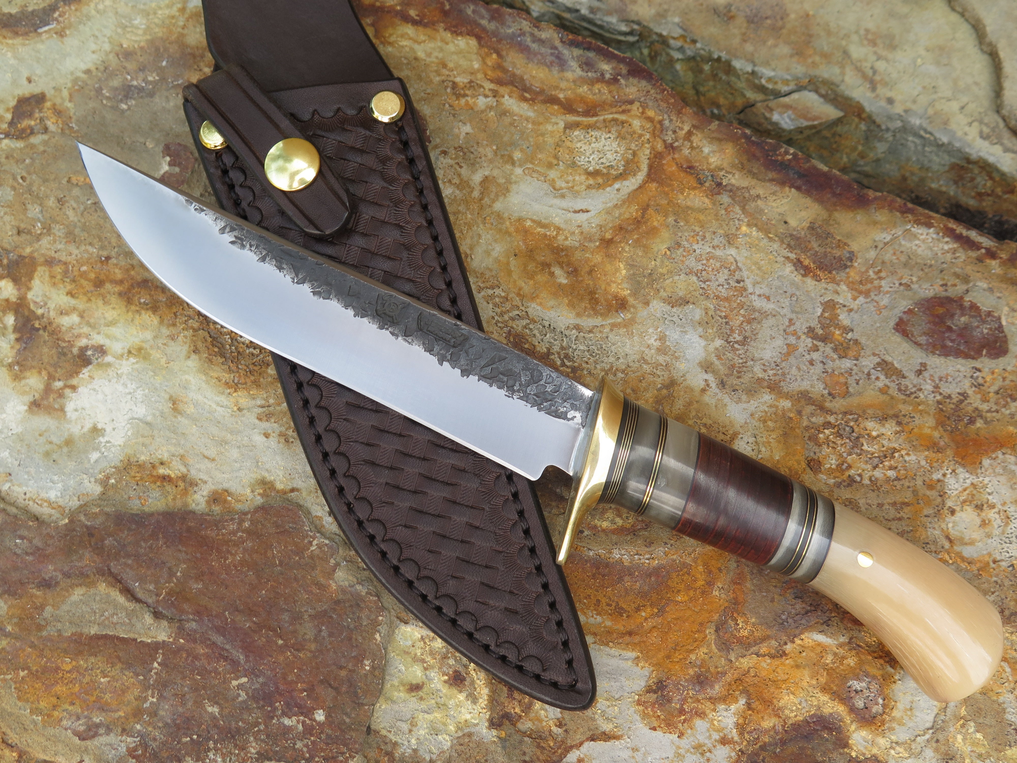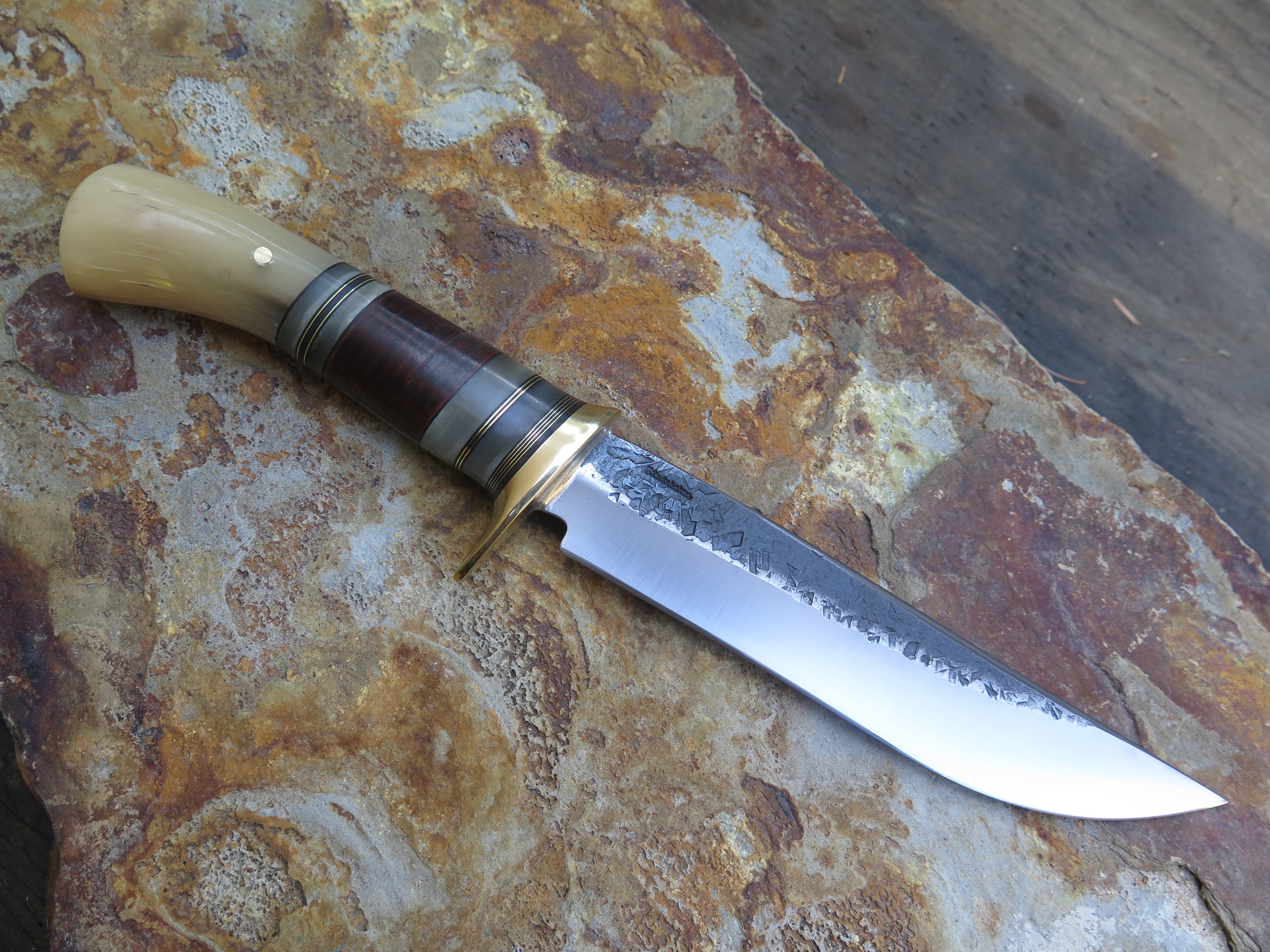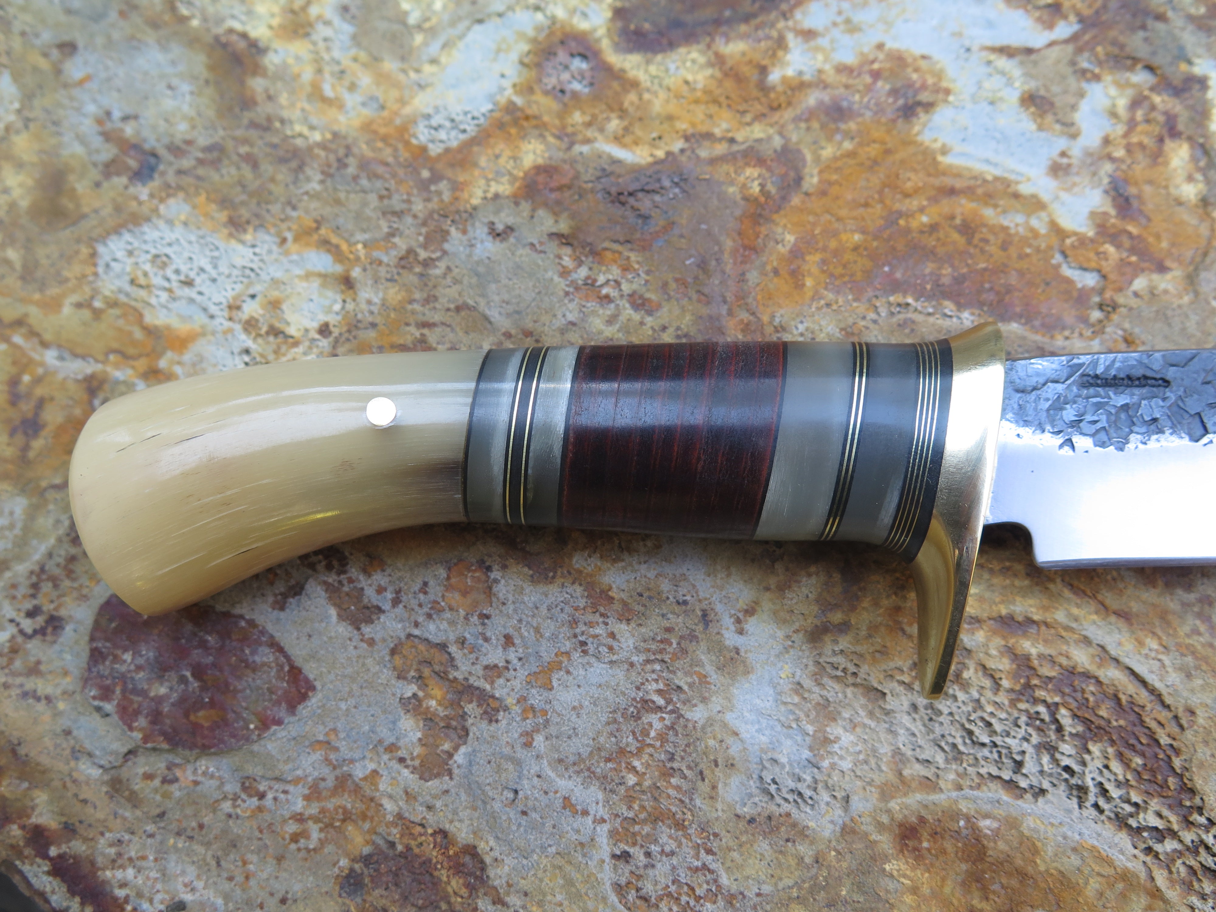 This incredible new Behring Made© Fighter is and forged from 3/16" thick Studebaker truck leaf springs (from 1949-51) and it measures 6 1/4" from tip to guard with a razor sharp hollow grind and our hammermark finish. The brass guard is soldered in place above black fiber, brass, horsehide and musk ox boss spacers as well as a musk ox horn butt that's pinned through the tang with brass. The overall length measures just shy of 11" and it comes in a custom sheath from Warlander Leather.