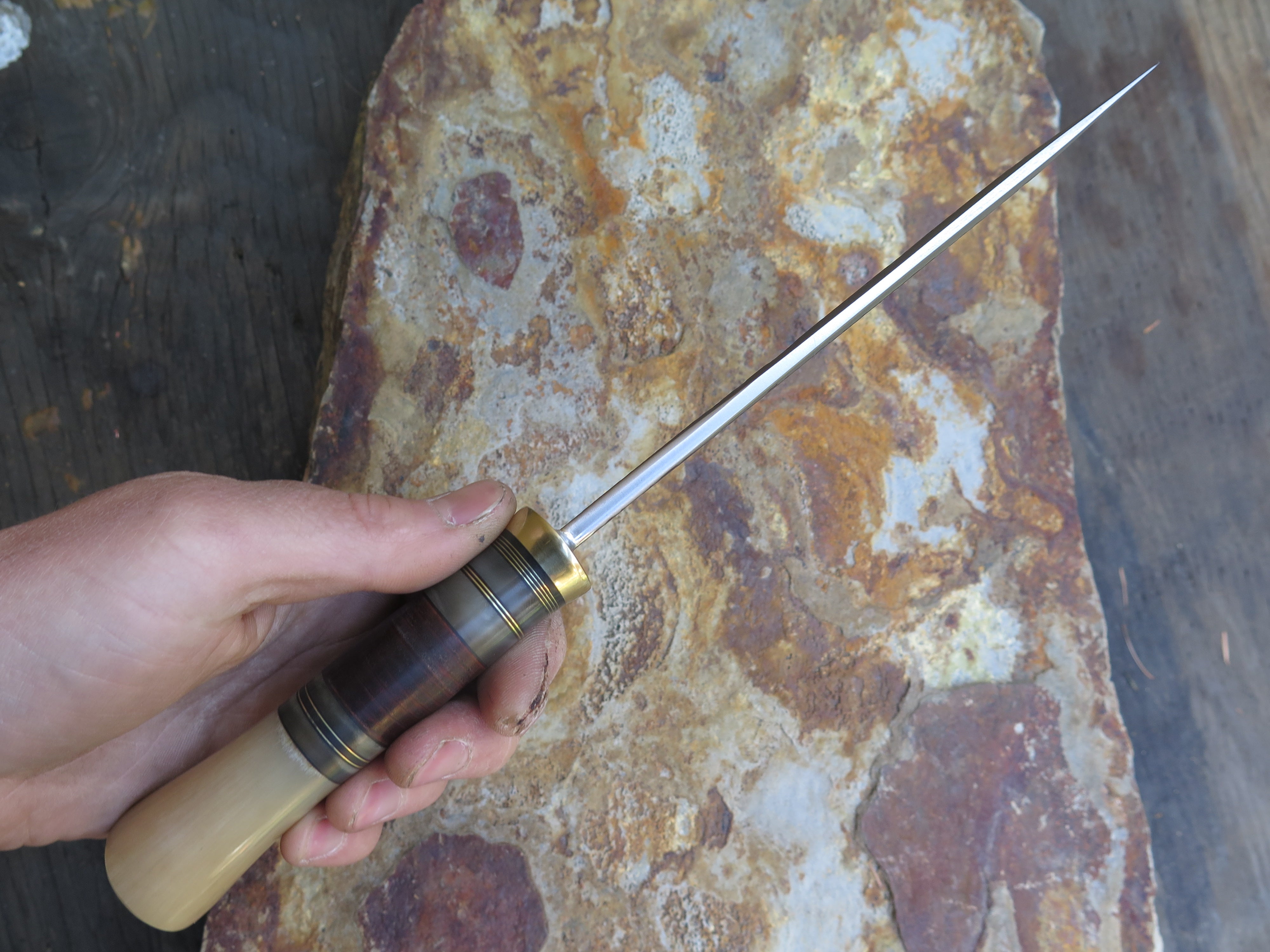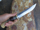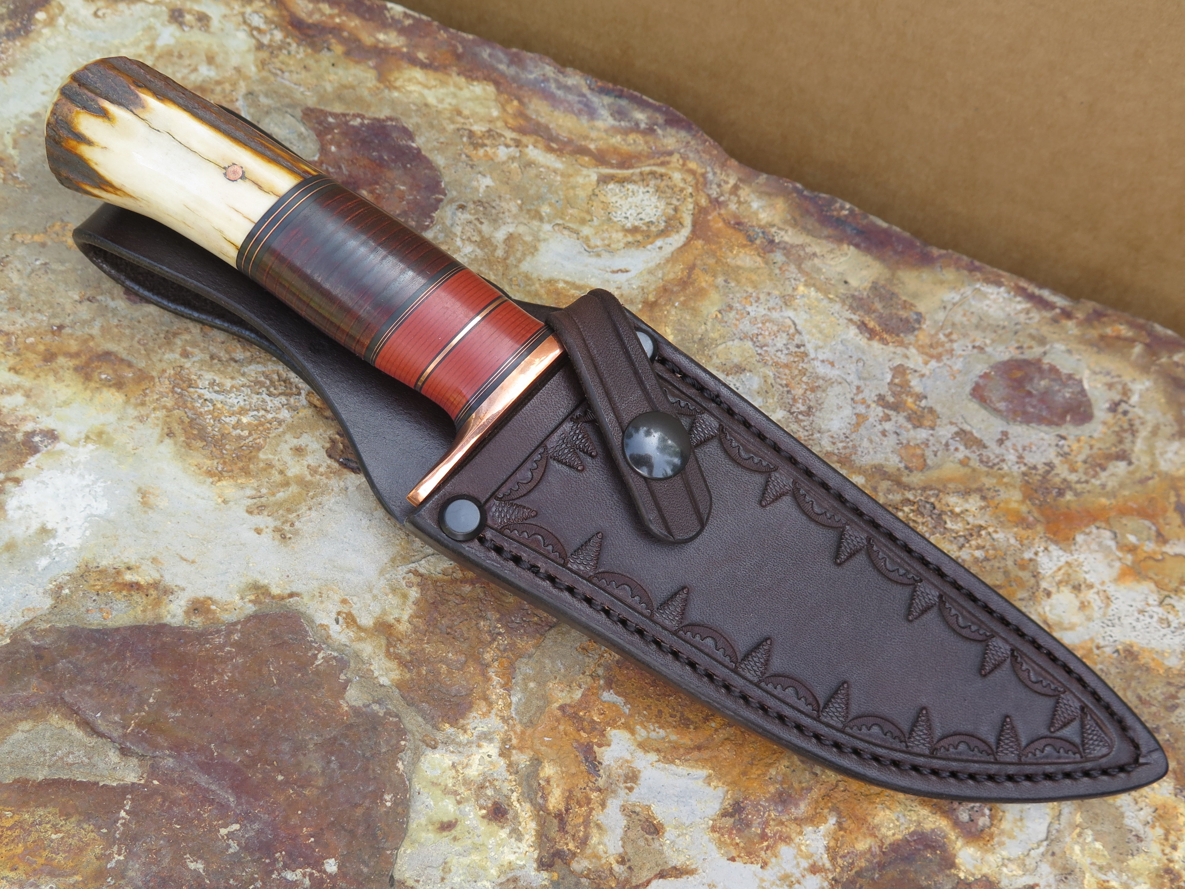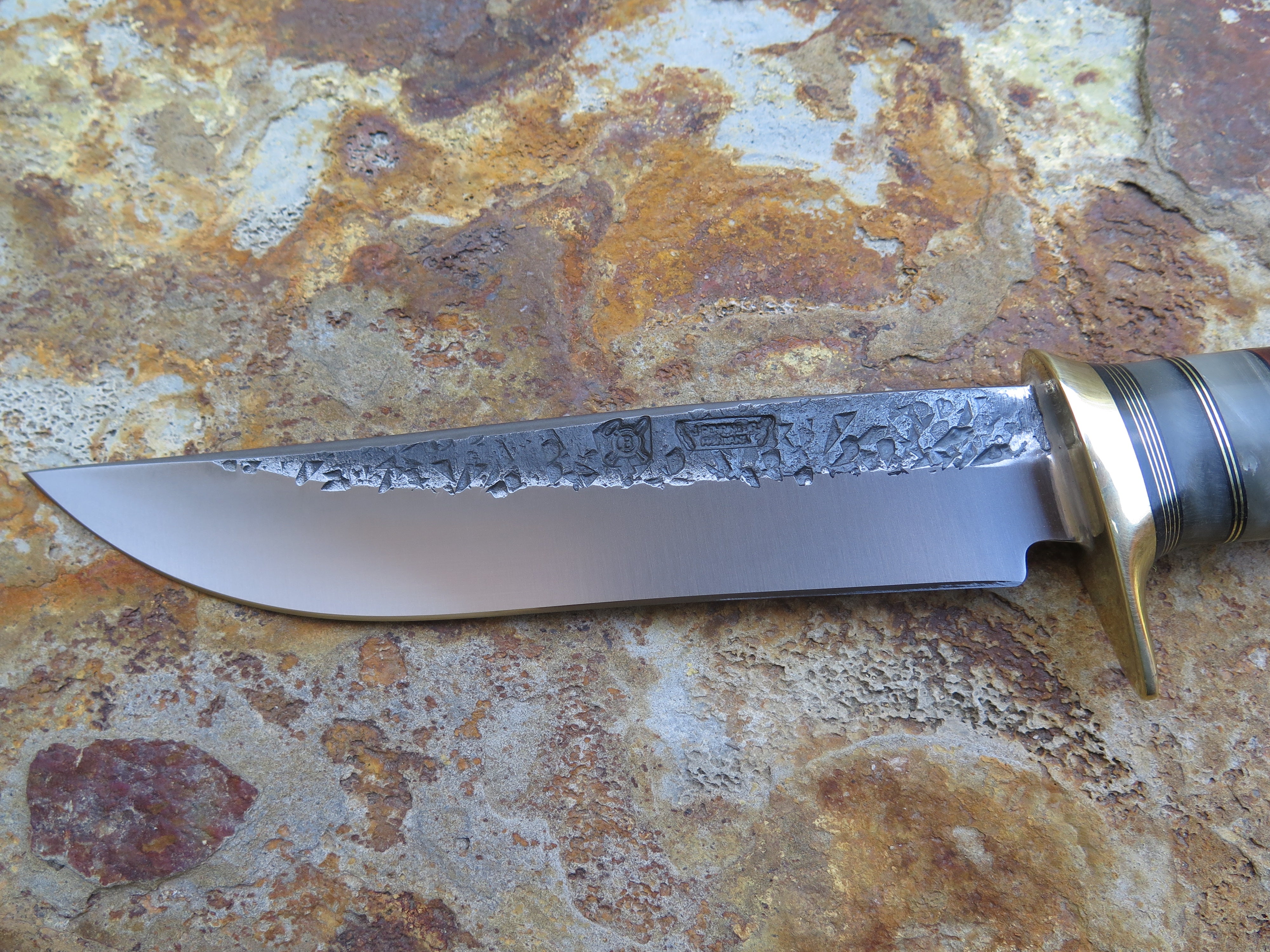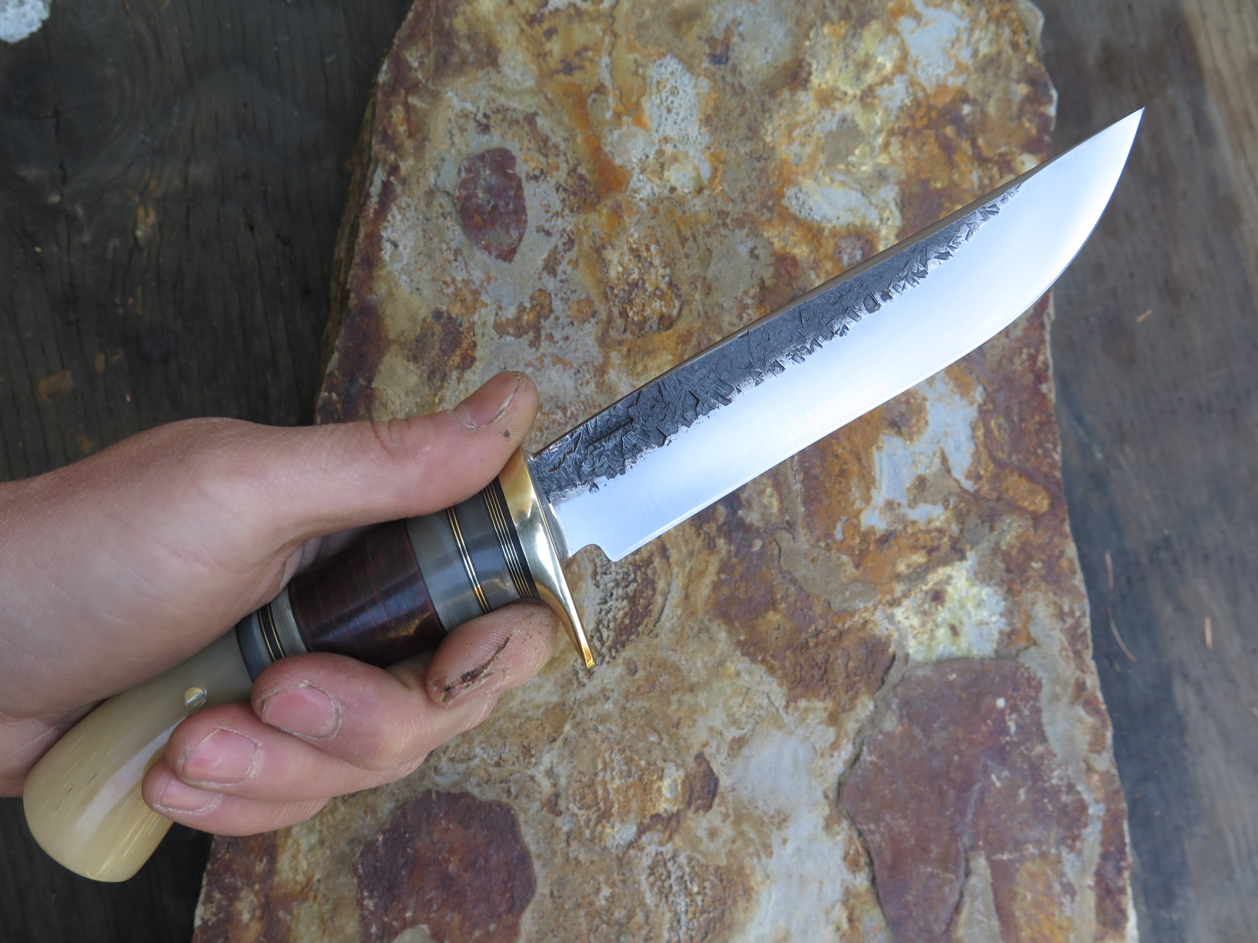 This incredible new Behring Made© Fighter is and forged from 3/16" thick Studebaker truck leaf springs (from 1949-51) and it measures 6 1/4" from tip to guard with a razor sharp hollow grind and our hammermark finish. The brass guard is soldered in place above black fiber, brass, horsehide and musk ox boss spacers as well as a musk ox horn butt that's pinned through the tang with brass. The overall length measures just shy of 11" and it comes in a custom sheath from Warlander Leather.