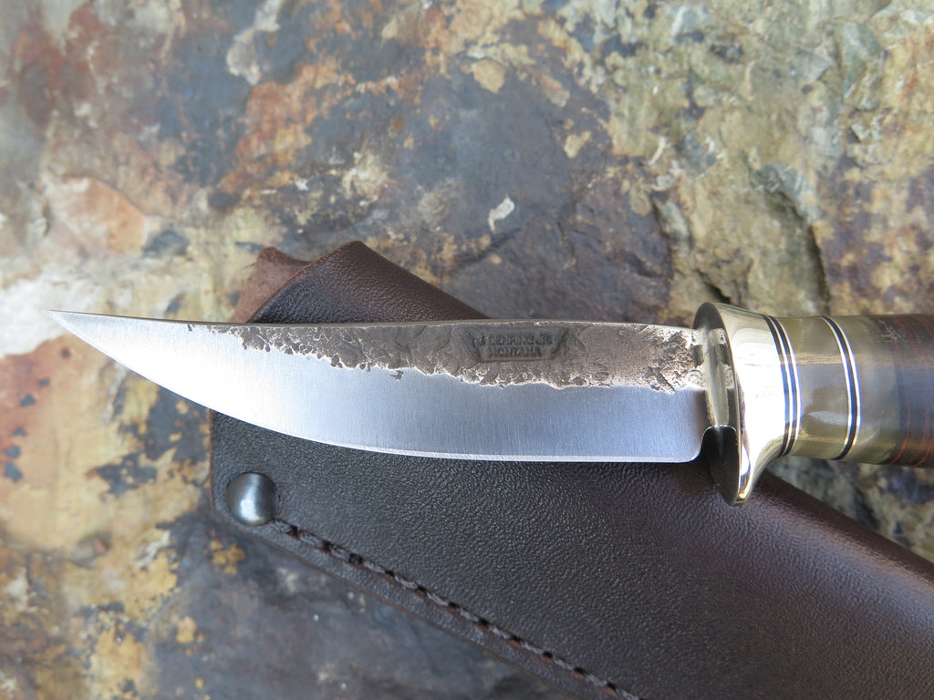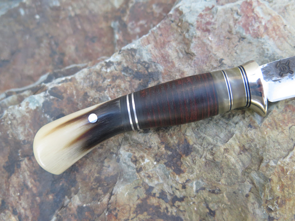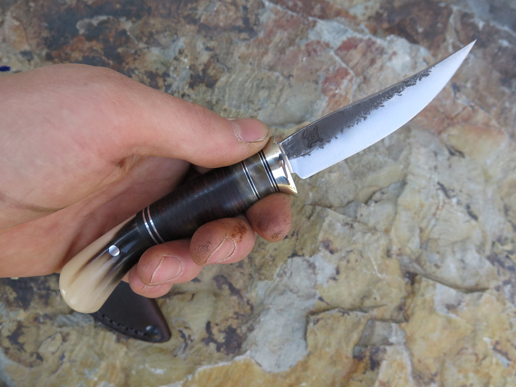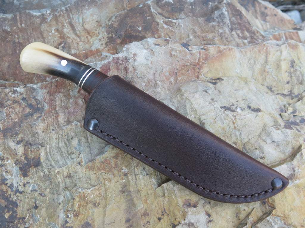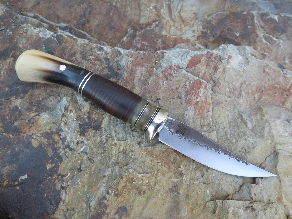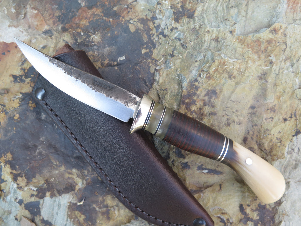 At Behring Made™, we're confident that it doesn't require a big knife to get a great deal of work done and this new Pintail is the knife to prove it. Birds, fish, steak, or even dressing large game- you'll be astounding at the functionality. It's hand forged from 1/8" thick high carbon 01 tool steel and it measures 3 1/2" from tip to guard with a razor sharp hollow grind and our hammermark finish. The nickel silver guard is silver soldered in place above black fiber, aluminum, musk ox and horsehide leather spacers as well as a musk ox horn butt with a highly desirable black coloration as well as an aluminum pin through the tang. The overall length measures 7 1/2" and it comes in a Warlander Leather pouch sheath as well.