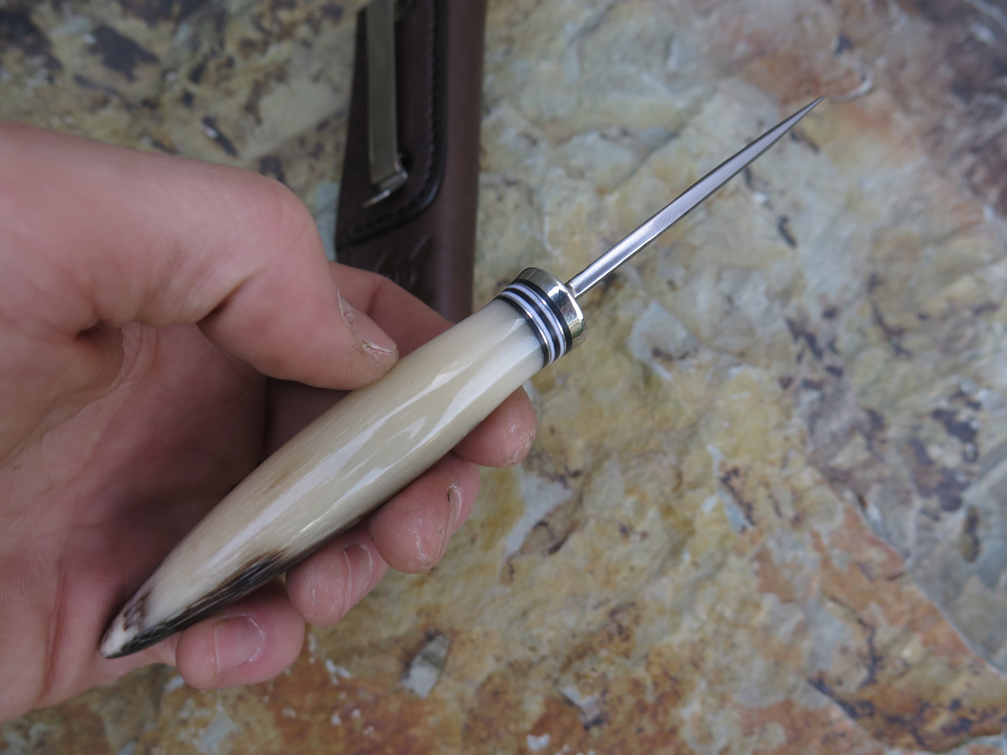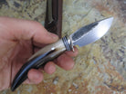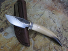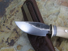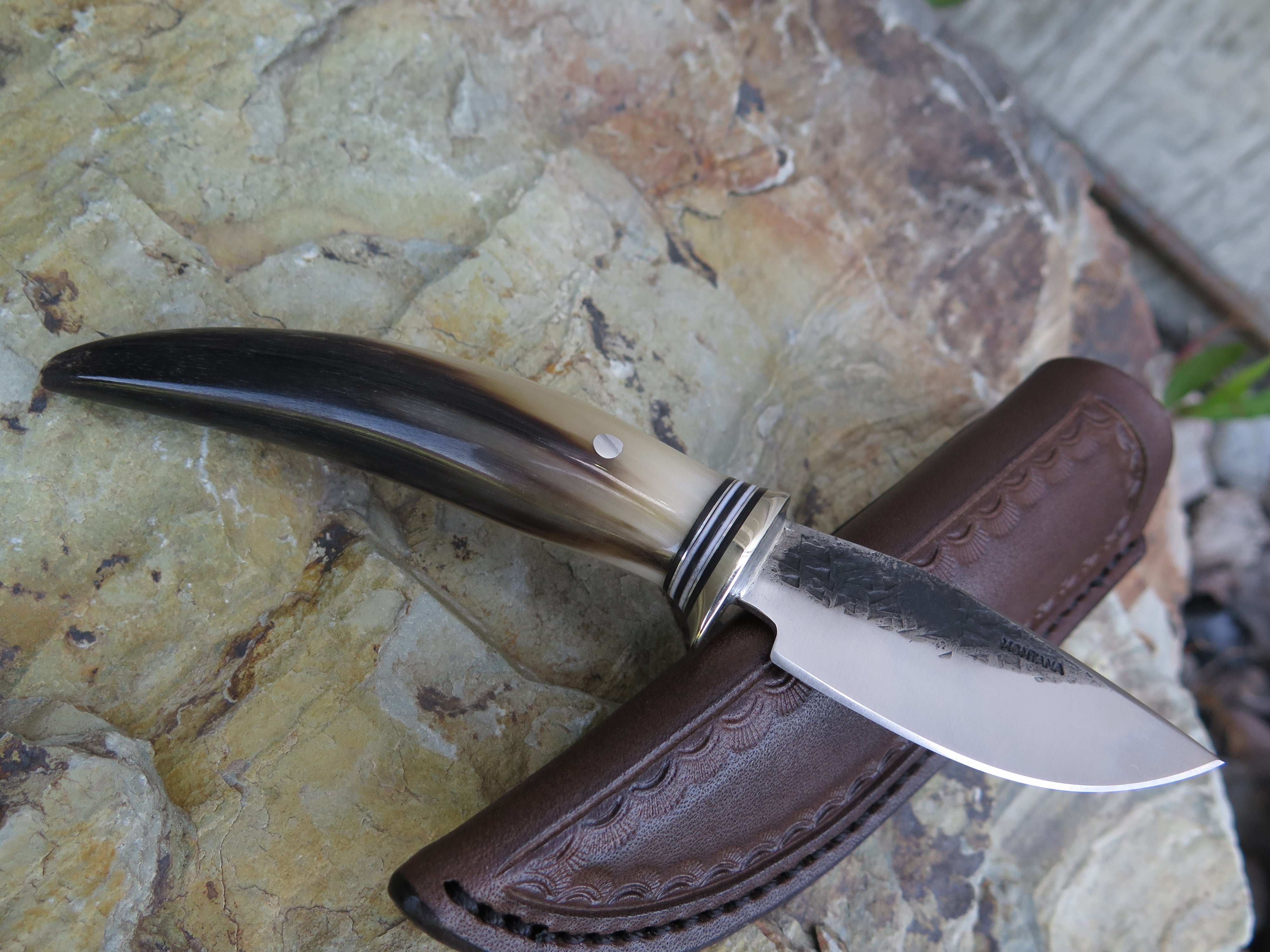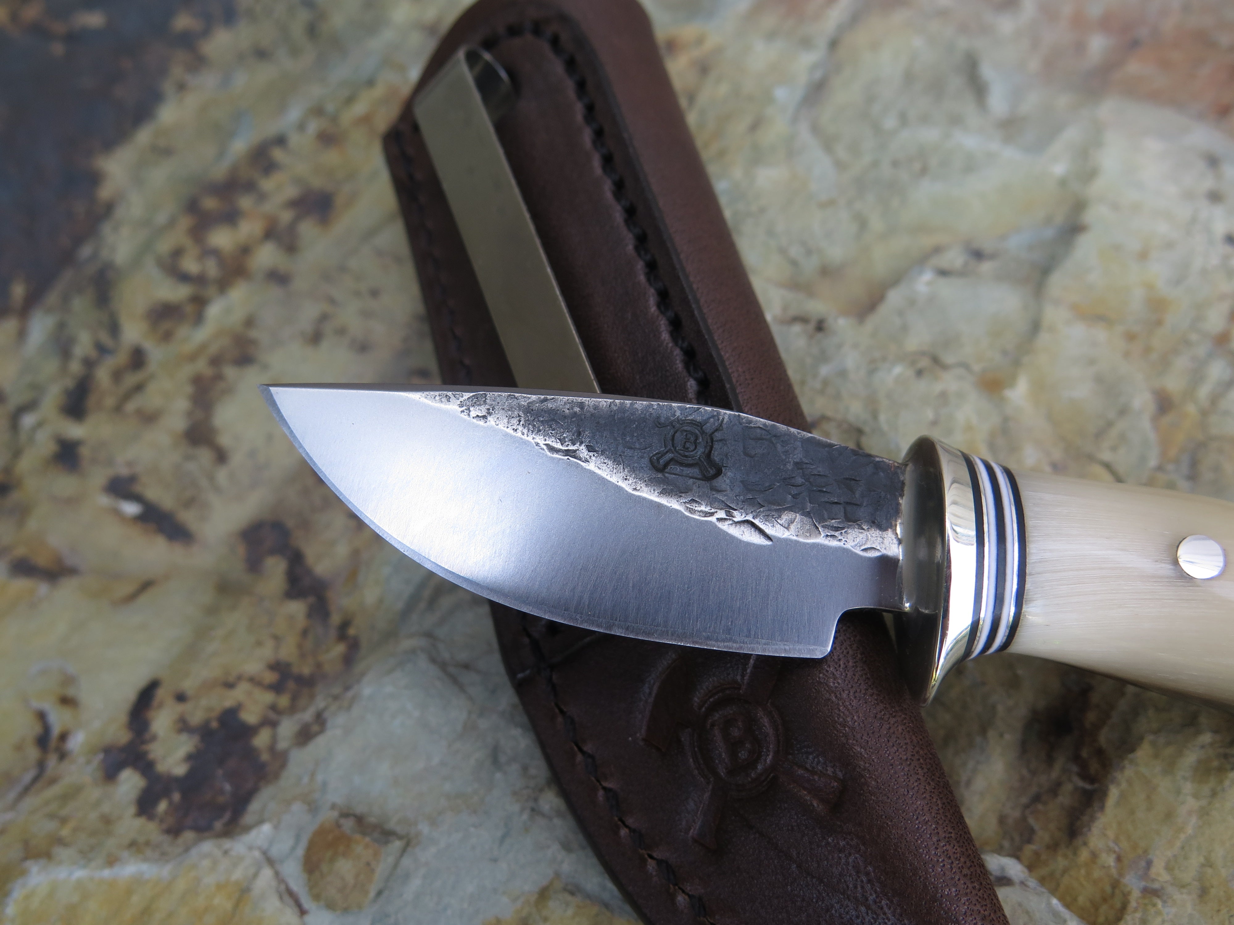 This outstanding new Alaskan style pocket knife from Behring Made© is hand forged from 1/8" thick high carbon 01 tool steel and it measures 2 1/2" from tip to guard with a razor sharp hollow grind and our hammermark finish. The nickel silver guard is soldered in place above black and white fiber with aluminum spacers. The handle is a high figure tip from a musk ox horn and it's pinned through the tang with aluminum. The overall length measures 6 3/8" and it comes in a pocket clip sheath from Warlander Leather.