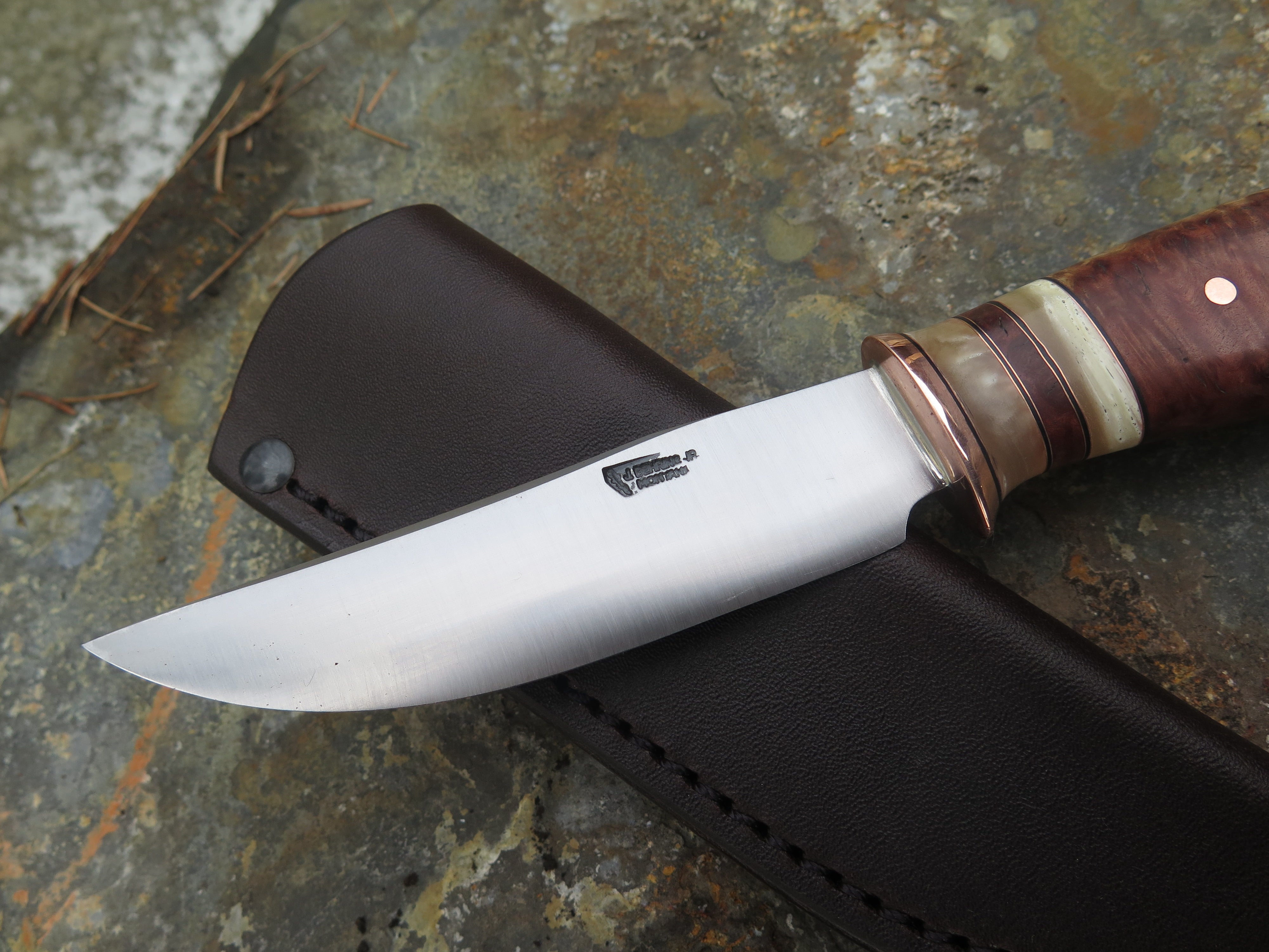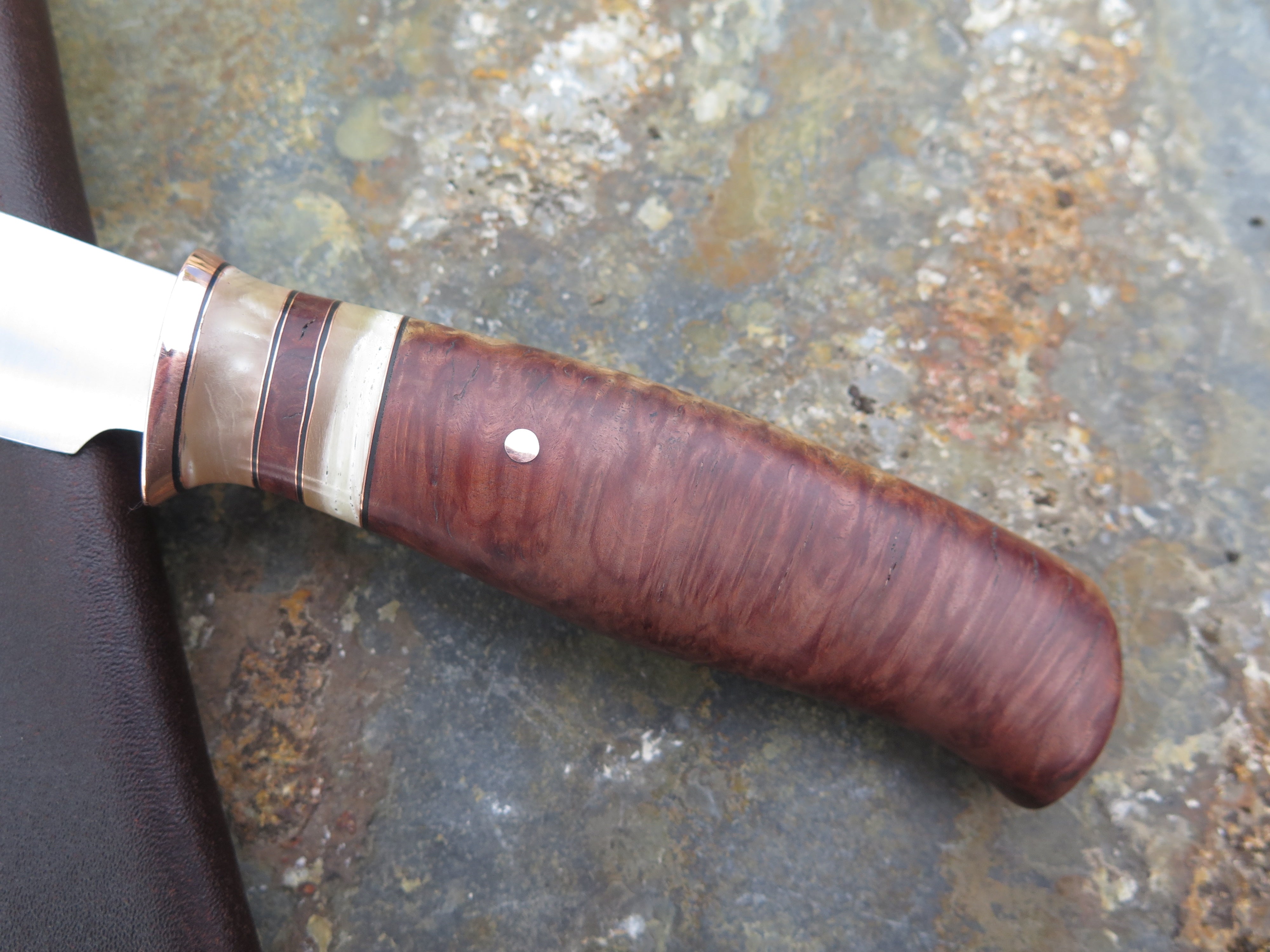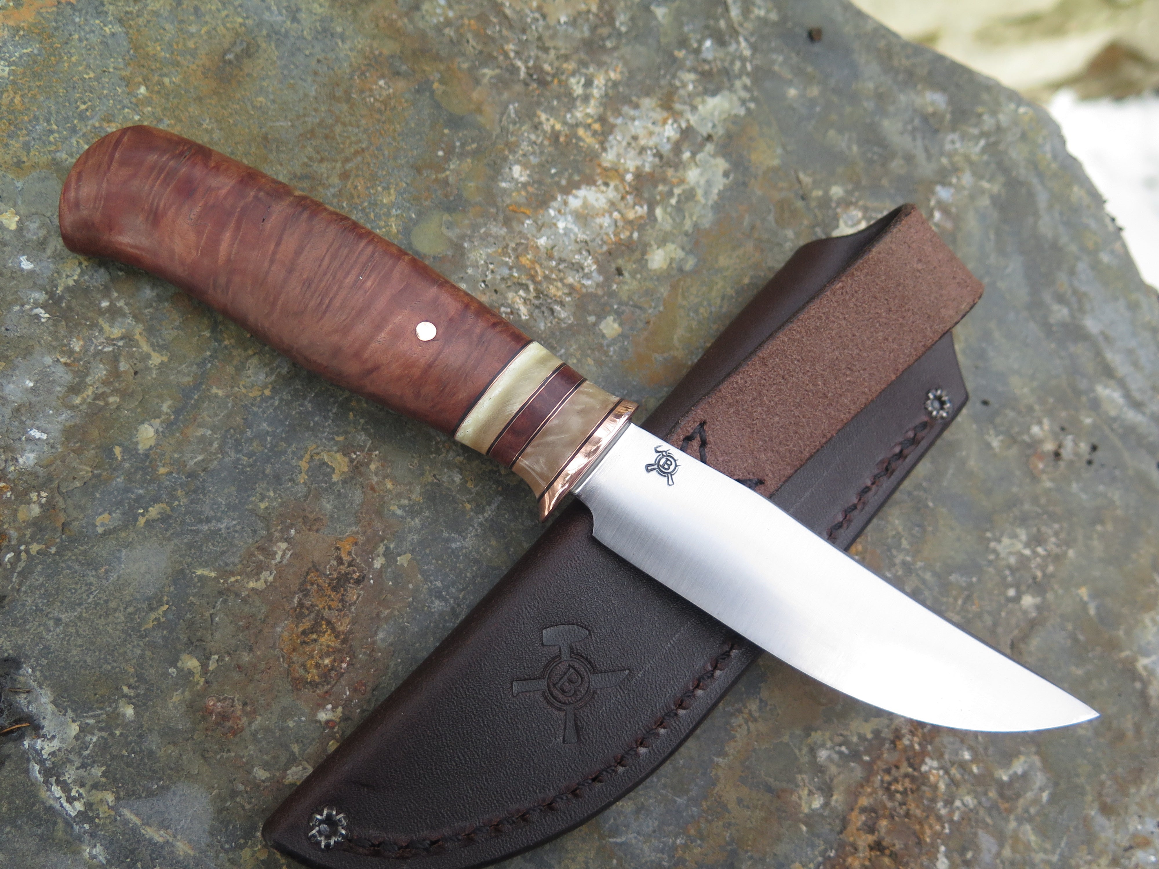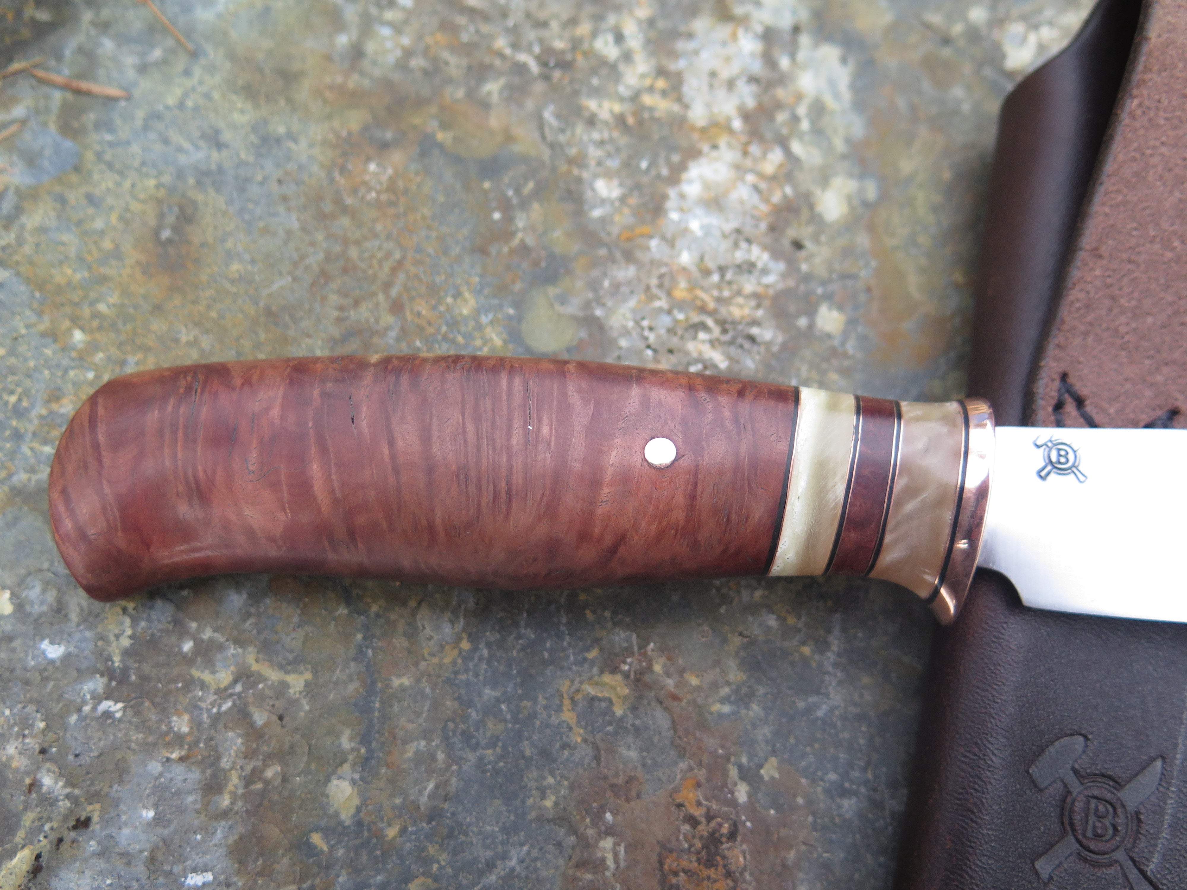 This beautiful new Behring Made© Trout & Bird is hand forged from 1/8" thick high carbon 01 tool steel and it measures 4 1/4" from tip to guard with a razor sharp convex grind. The copper guard is soldered in place above black fiber, copper, musk ox boss and amboyna spacers along with a premium amboyna handle with a remarkable blonde highlight along the spine, plus it's pinned with copper. The overall length measures about 8 5/8" and this one comes in a classic leather belt sheath.