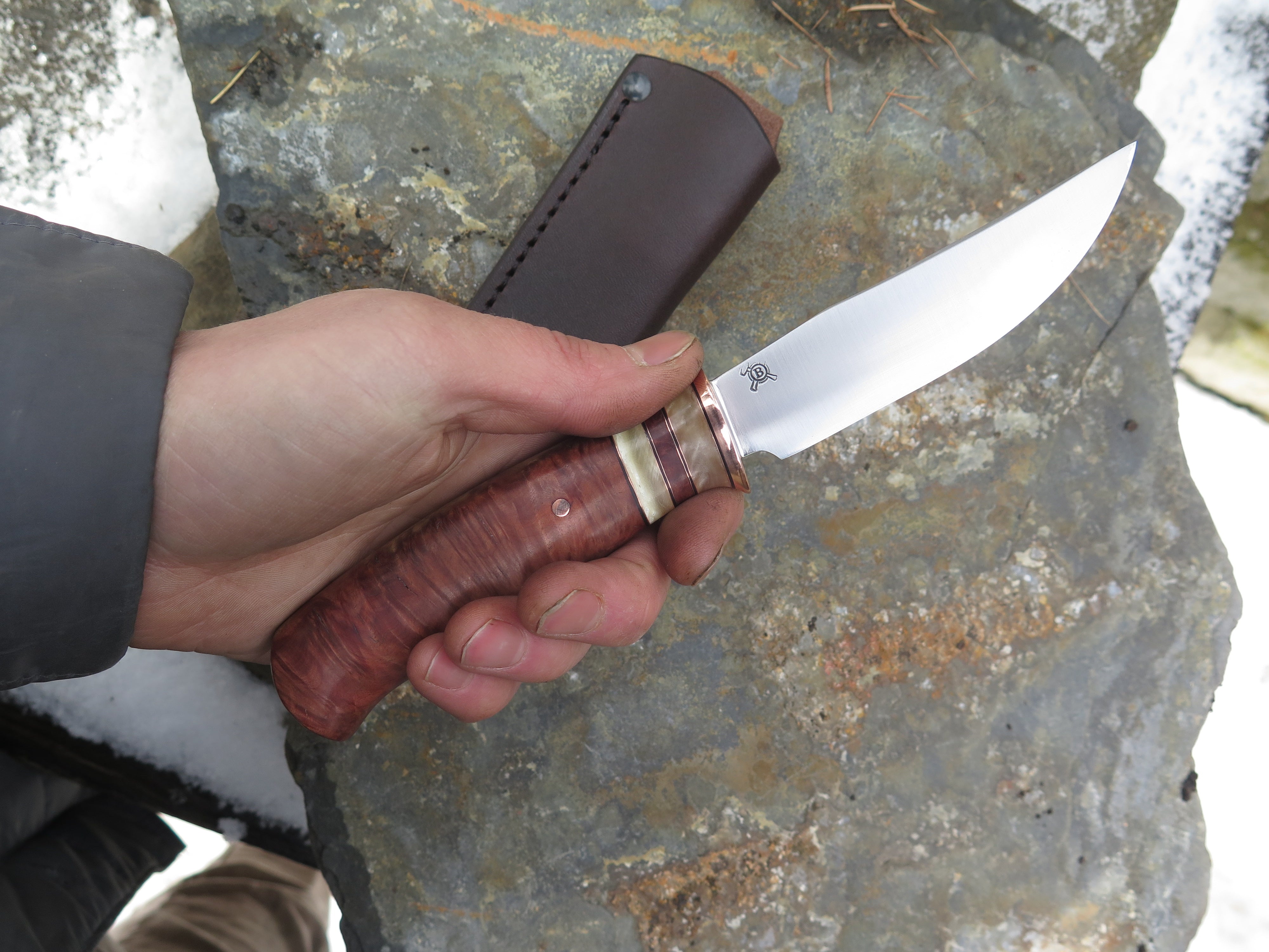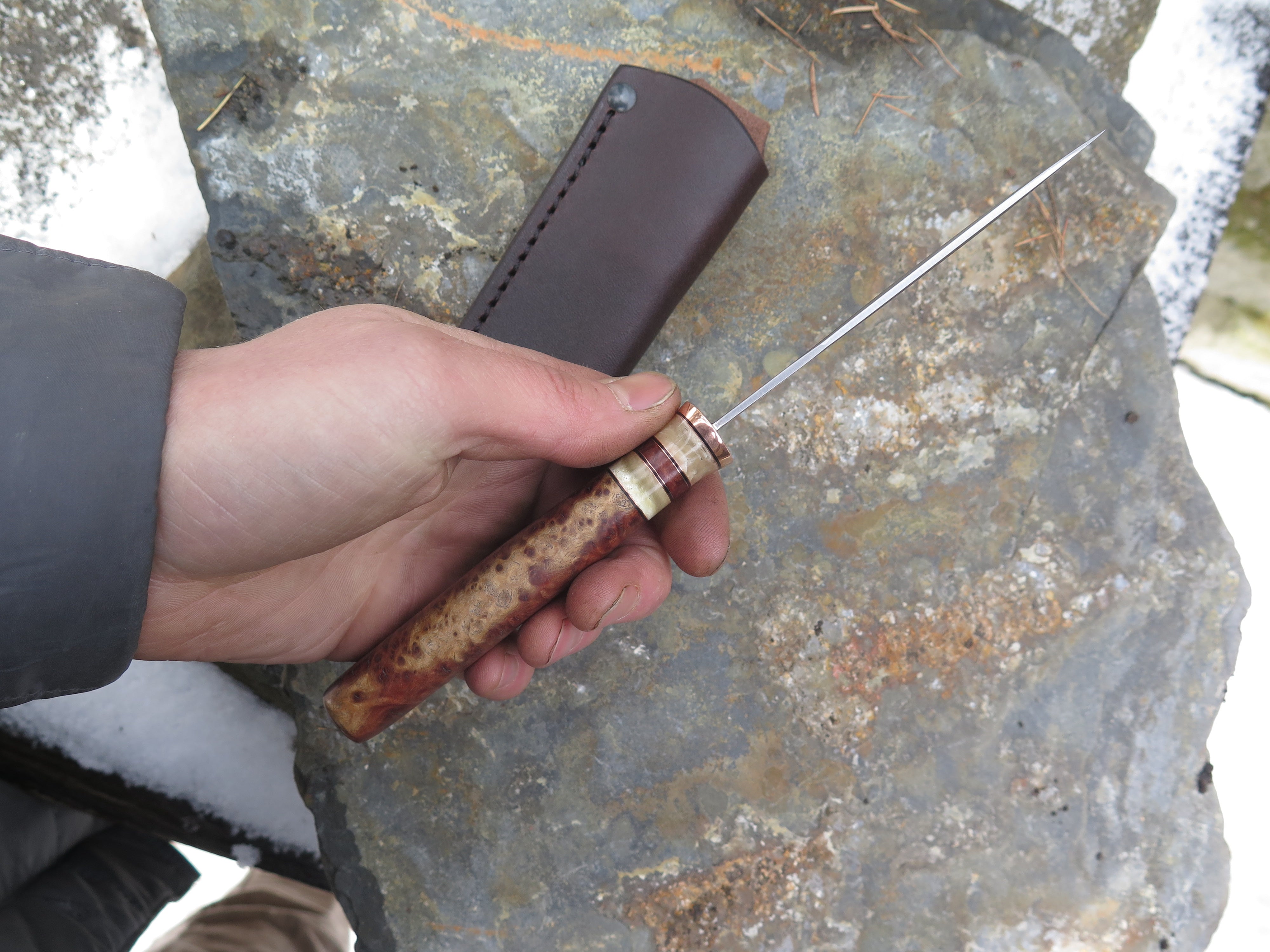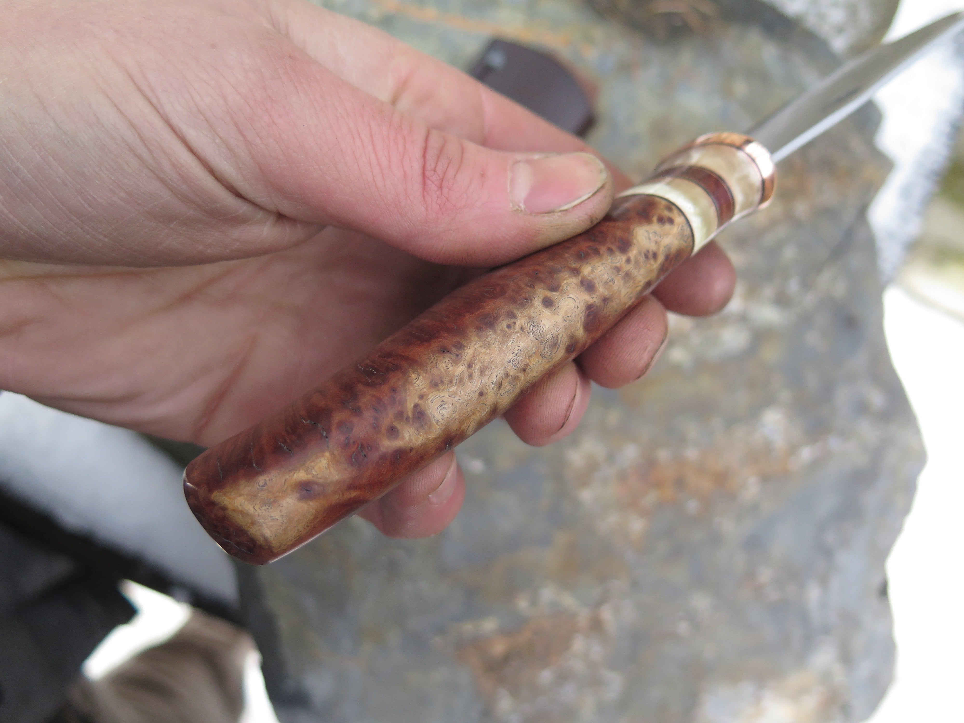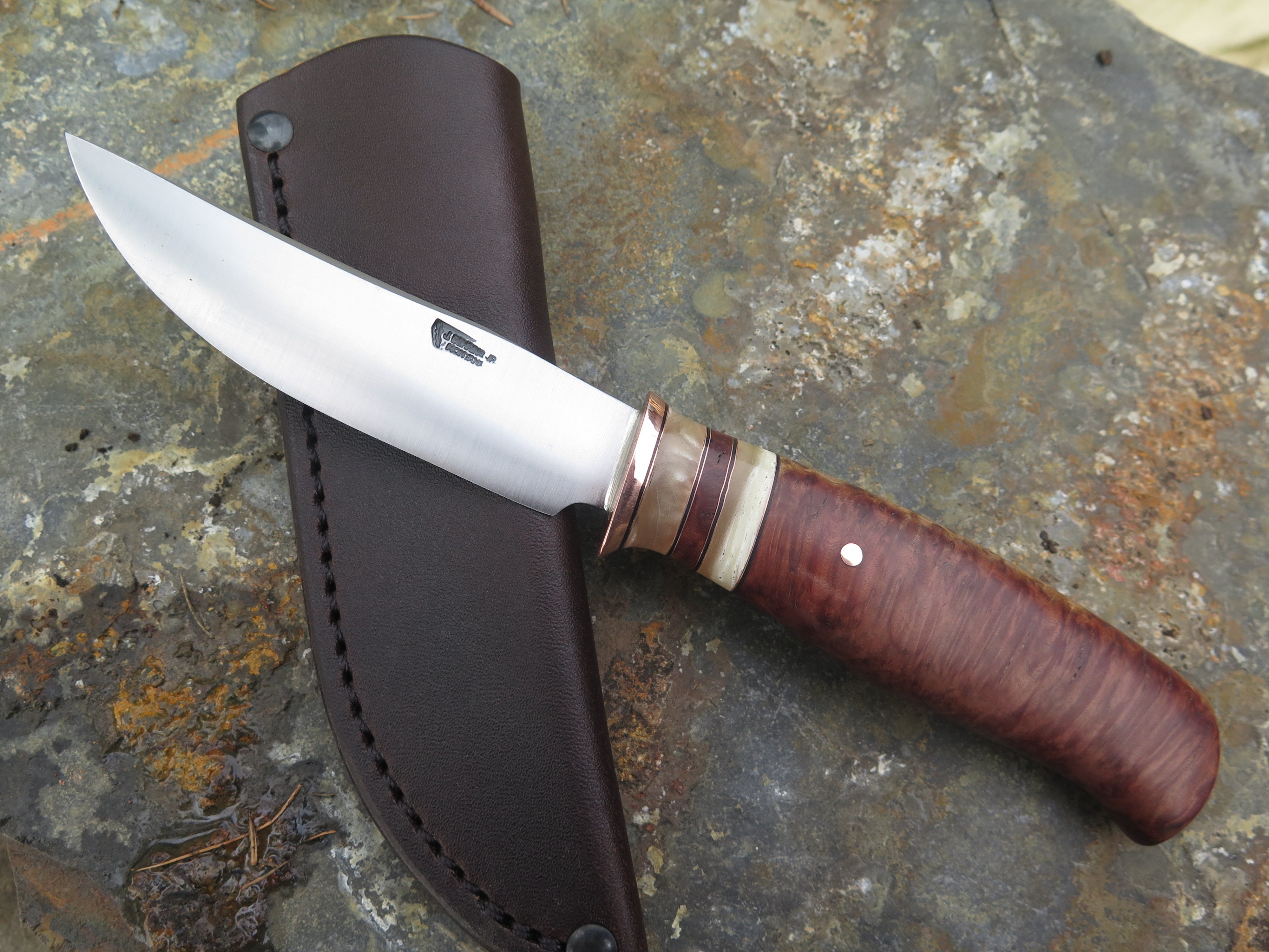 This beautiful new Behring Made© Trout & Bird is hand forged from 1/8" thick high carbon 01 tool steel and it measures 4 1/4" from tip to guard with a razor sharp convex grind. The copper guard is soldered in place above black fiber, copper, musk ox boss and amboyna spacers along with a premium amboyna handle with a remarkable blonde highlight along the spine, plus it's pinned with copper. The overall length measures about 8 5/8" and this one comes in a classic leather belt sheath.