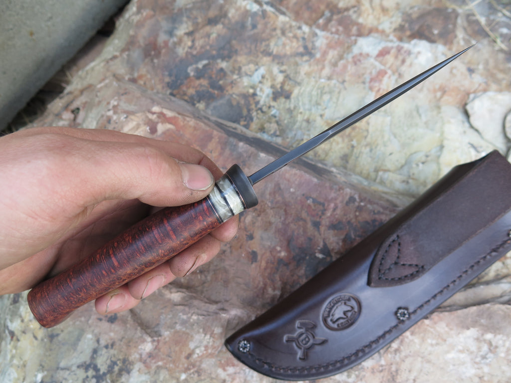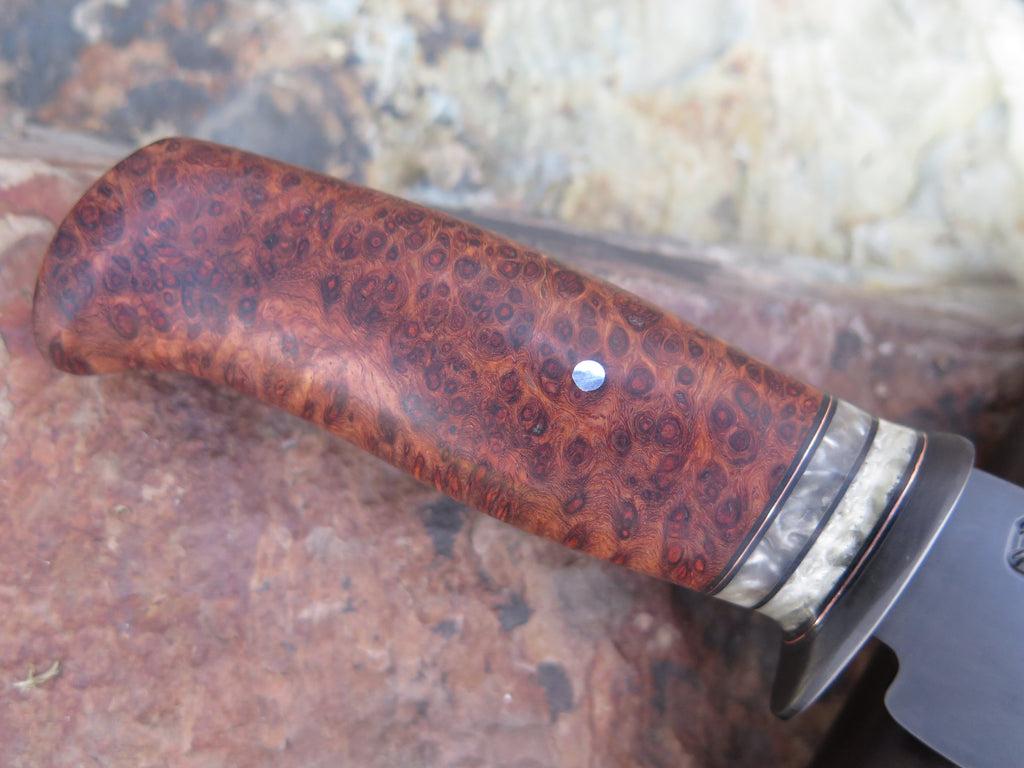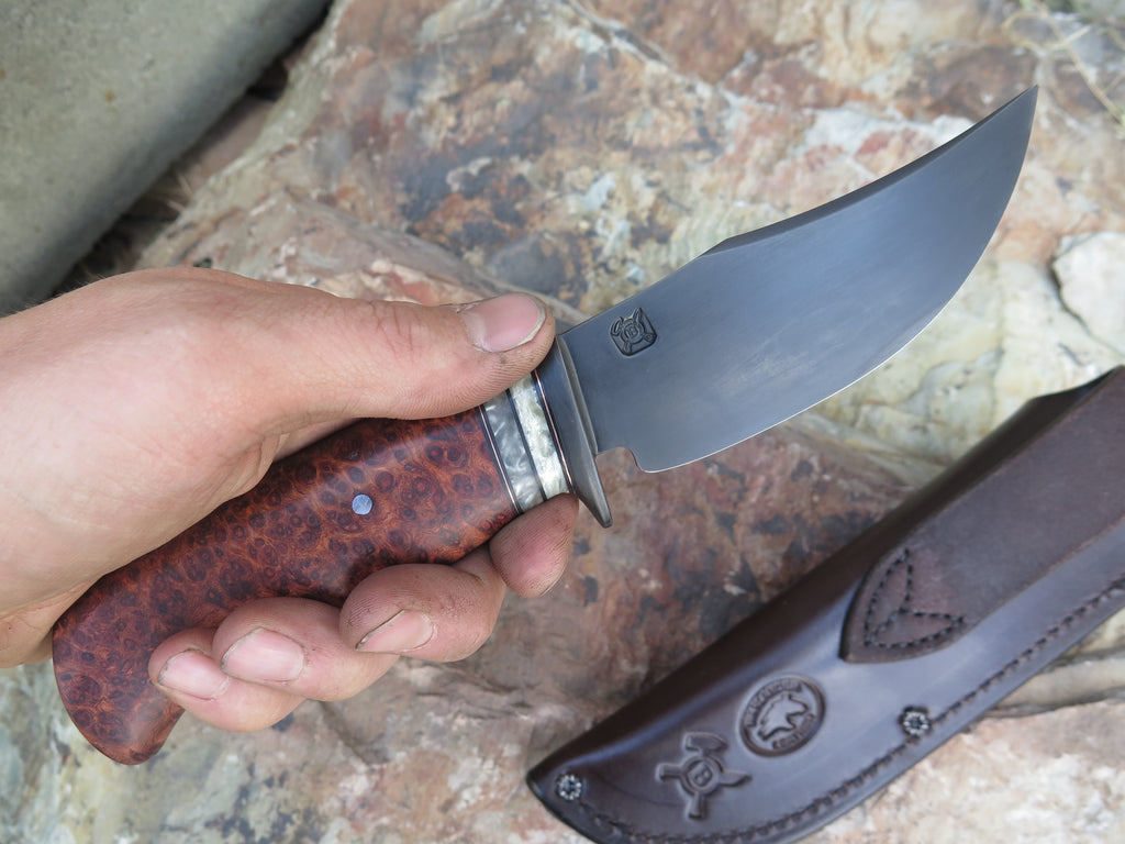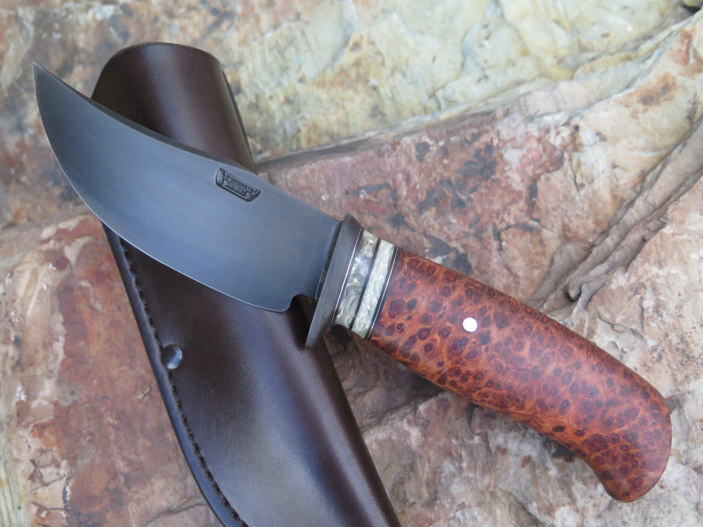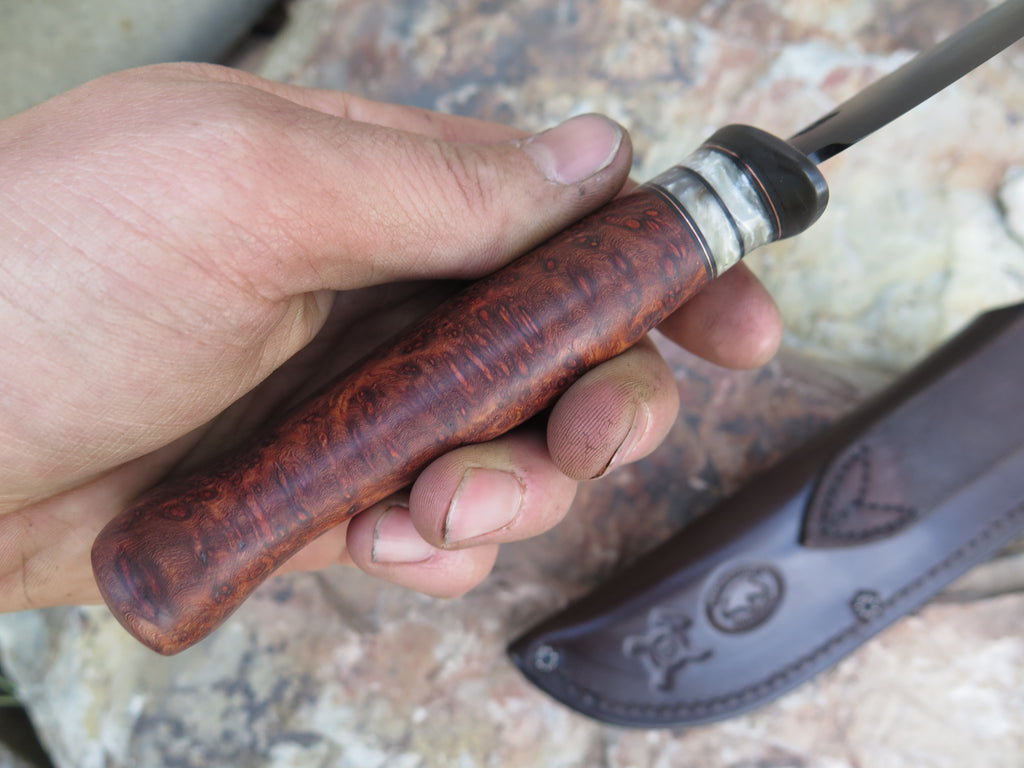 This incredible new Hunter from Behring Made™ is hand forged from 1/8" high carbon 01 tool steel and it measures 4 1/4" from tip to guard with a razor sharp convex grind and our forced patina blued finish. The blued steel guard is soldered in place above black fiber, copper and two premium musk ox boss spacers that both contrast and compliment the premium birdseye amboyna handle that's pinned through the tang with aluminum. Overall length measures 8 7/8" and it comes in a Warlander Leather pouch sheath.