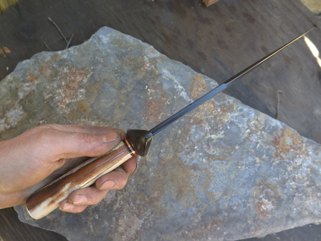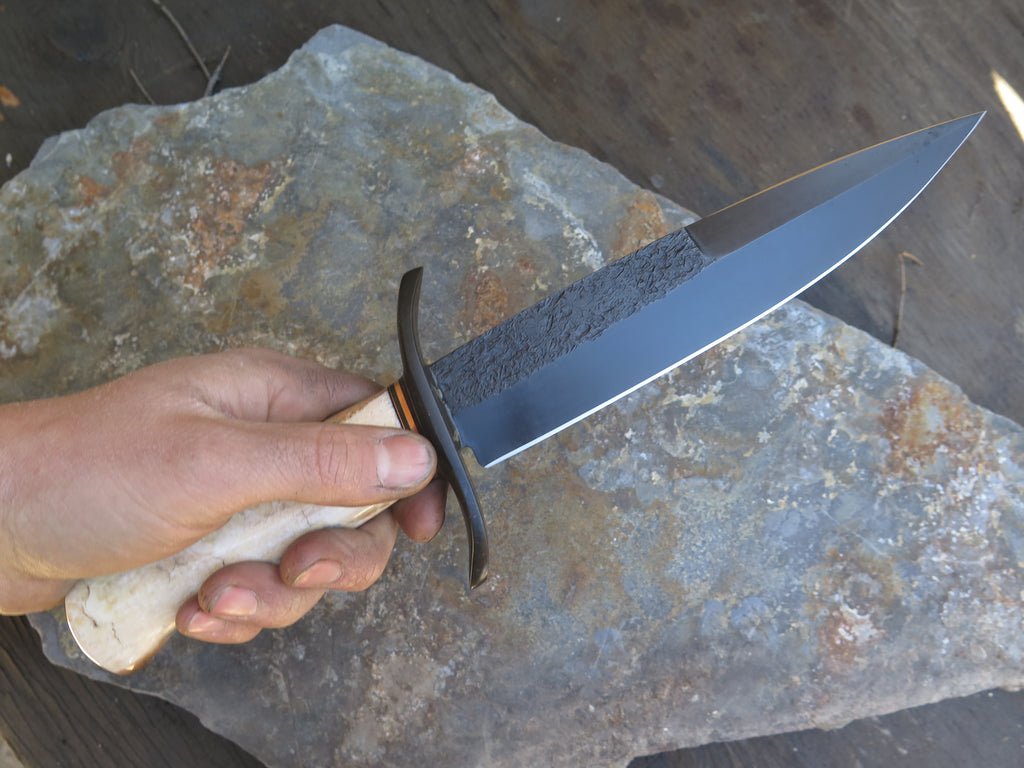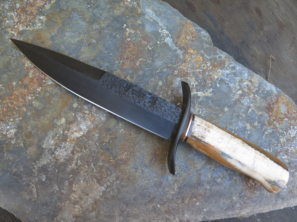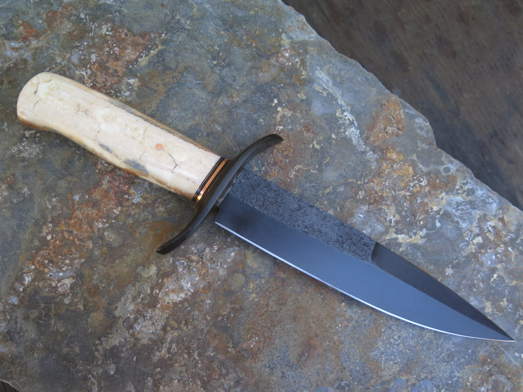 This bad ass new Chute Knife from Behring Made© is hand forged from 1/4" thick high carbon 01 tool steel and it measures 8" from tip to guard with a razor sharp hollow grind with hammermarks and our forced patina blued finish. The grind at the top is also sharpened, making this a nasty thing to be on the receiving end of. The blued steel forged s-guard is soldered in place above black fiber and copper spacers which top an astounding handle of premium artifact walrus ivory that is also pinned with copper. The overall length measures 12 3/4" and it will come in a custom sheath from Warlander Leather.