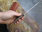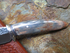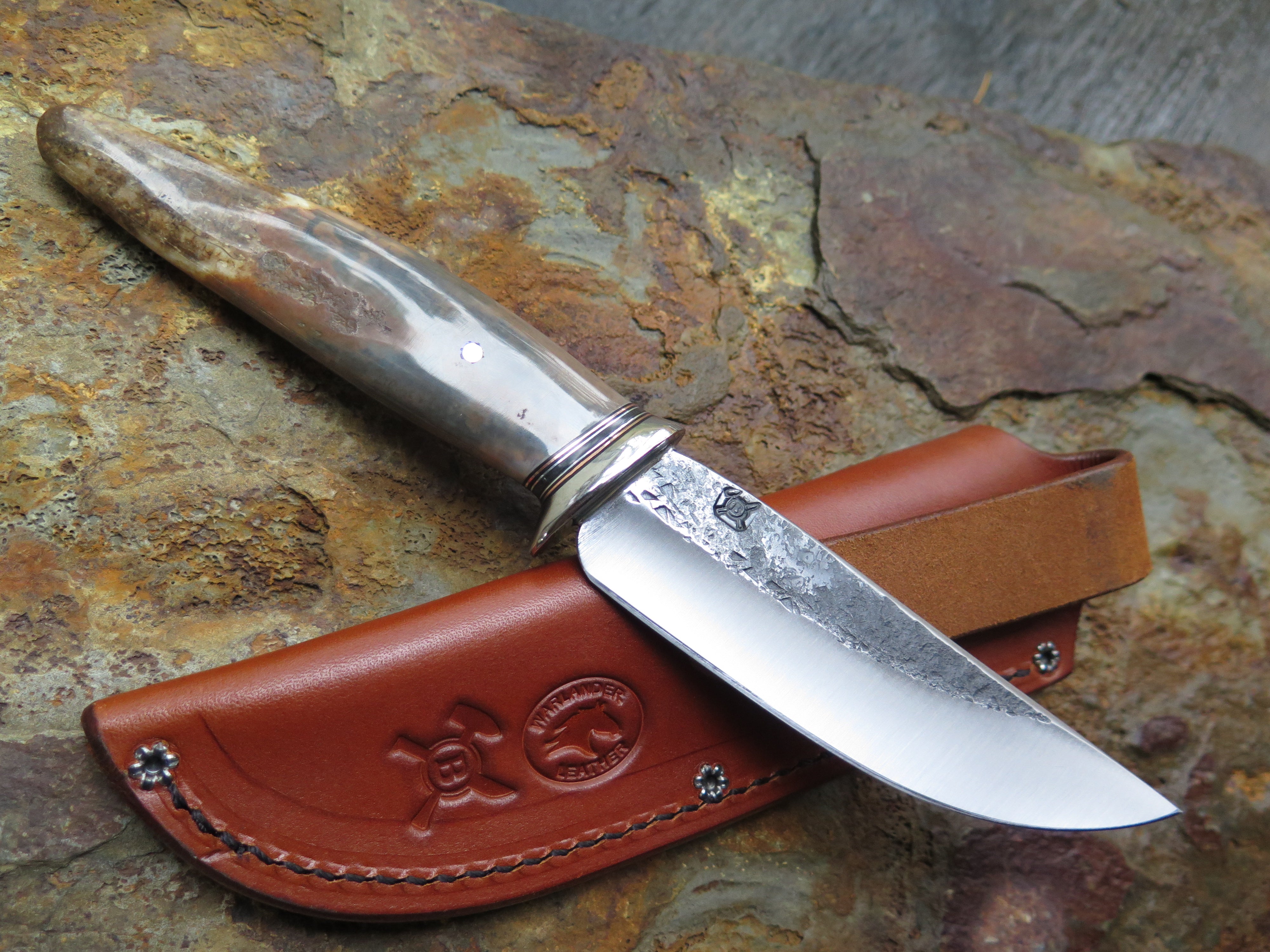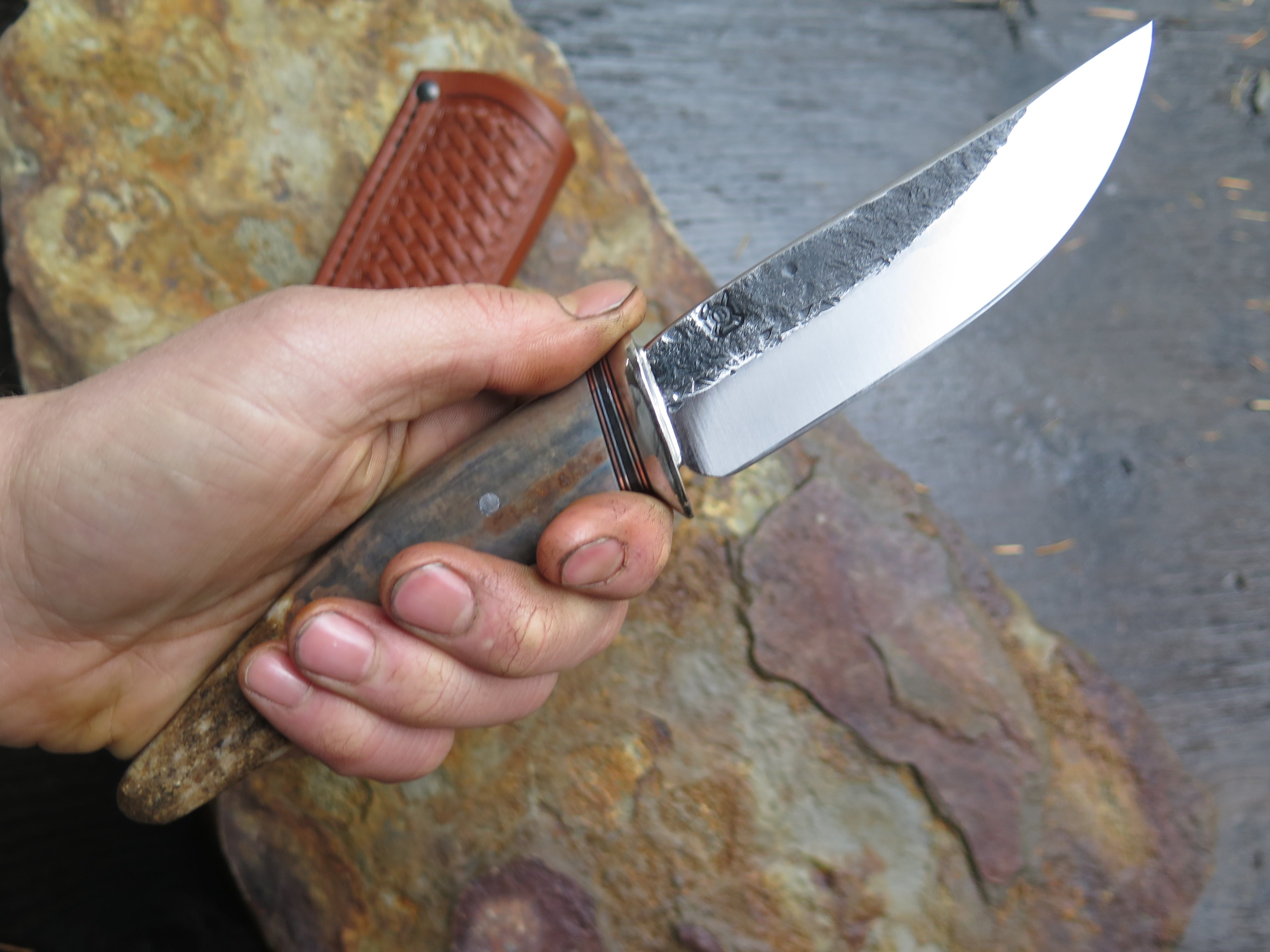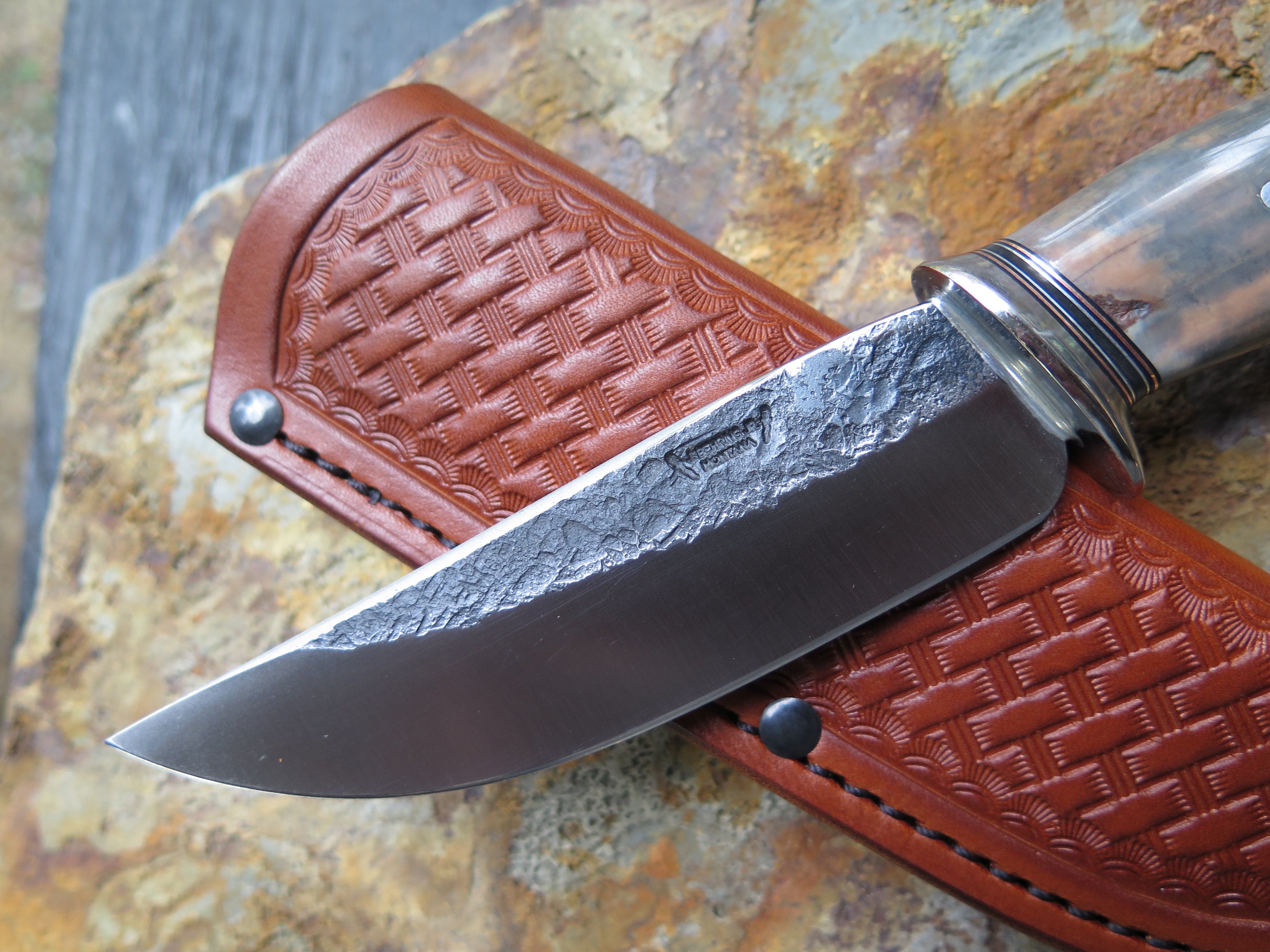 This incredible new Hunter from Behring Made© is hand forged from 3/16" thick 01 tool steel and it measures 4 3/4" from tip to guard with a razor sharp hollow grind and our hammermark finish. The stainless steel guard is soldered in place above black fiber, copper and aluminum spacers as well as a premium artifact walrus handle that's pinned through the tang with aluminum. The overall length measures 9 5/8" and it comes in a basketweave tooled pouch sheath.