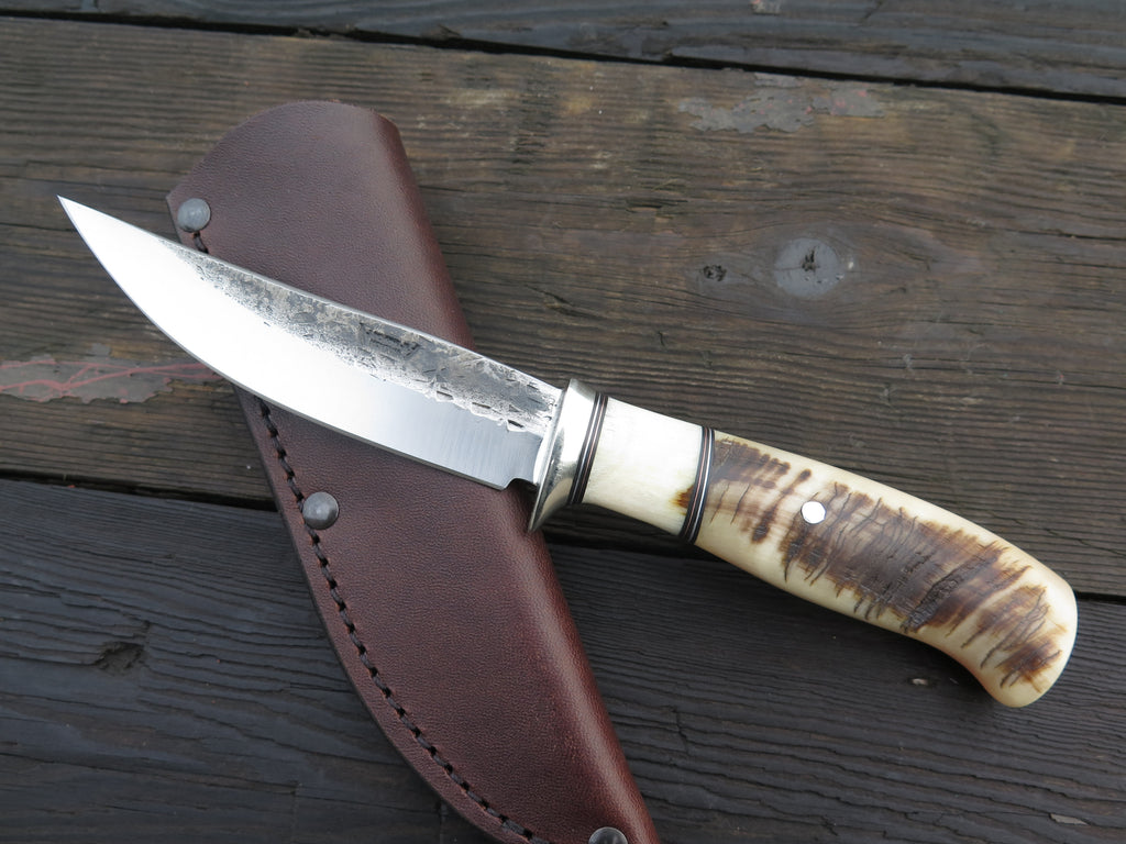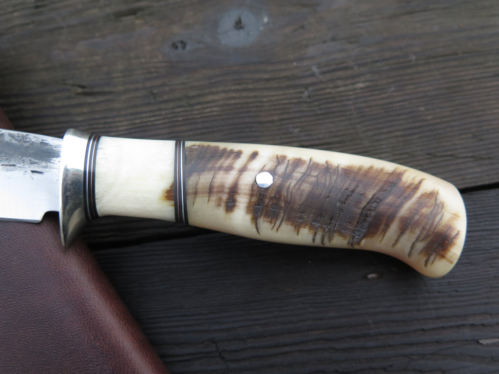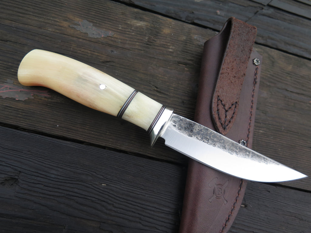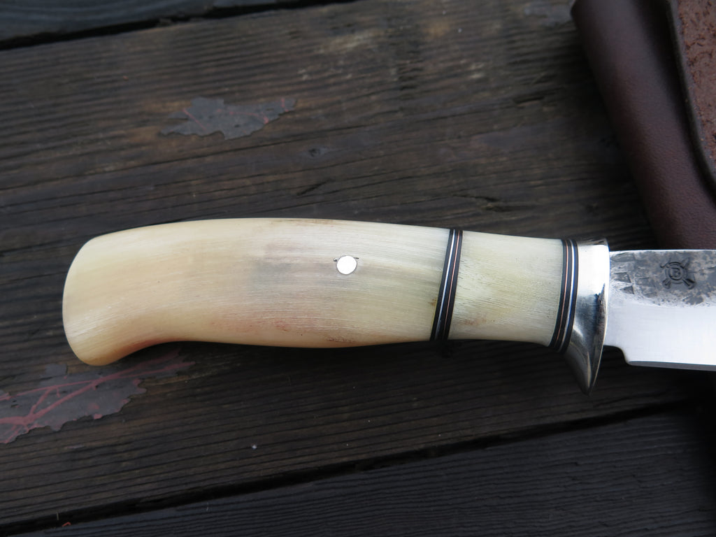 This beautiful Trout & Bird from Behring Made© is hand forged from 1/8" thick high carbon 01 tool steel and it measures 4 1/2" from tip to guard with a razor sharp hollow grind and our hammermark finish. The nickel silver guard is soldered in place above black fiber, aluminum and copper spacers with a Dall sheep horn spacer in the center as well as the remainder of the handle. The texture and contrasts are simply remarkable! The overall length measures 9" and this one comes in a classic brown pouch sheath.