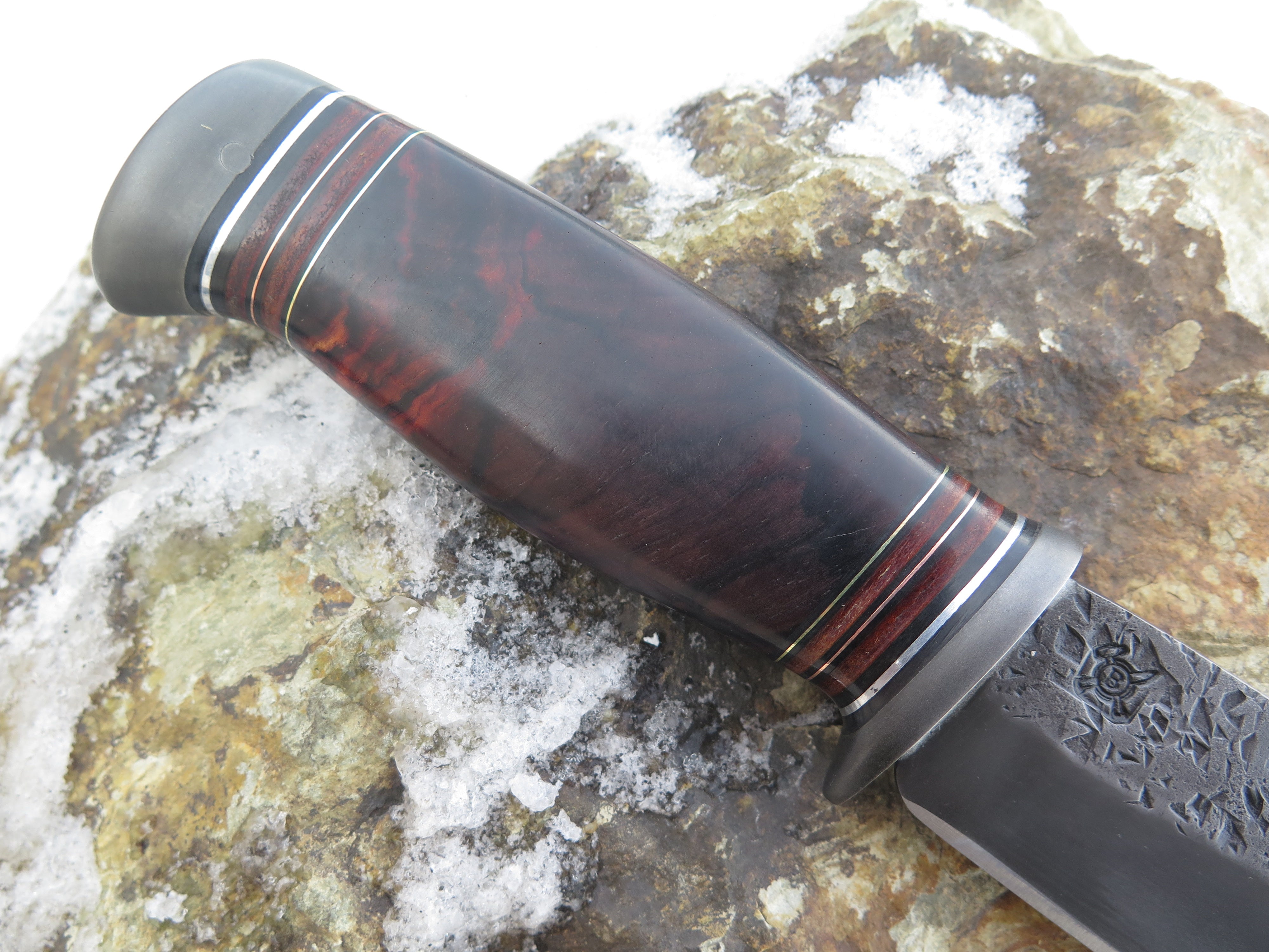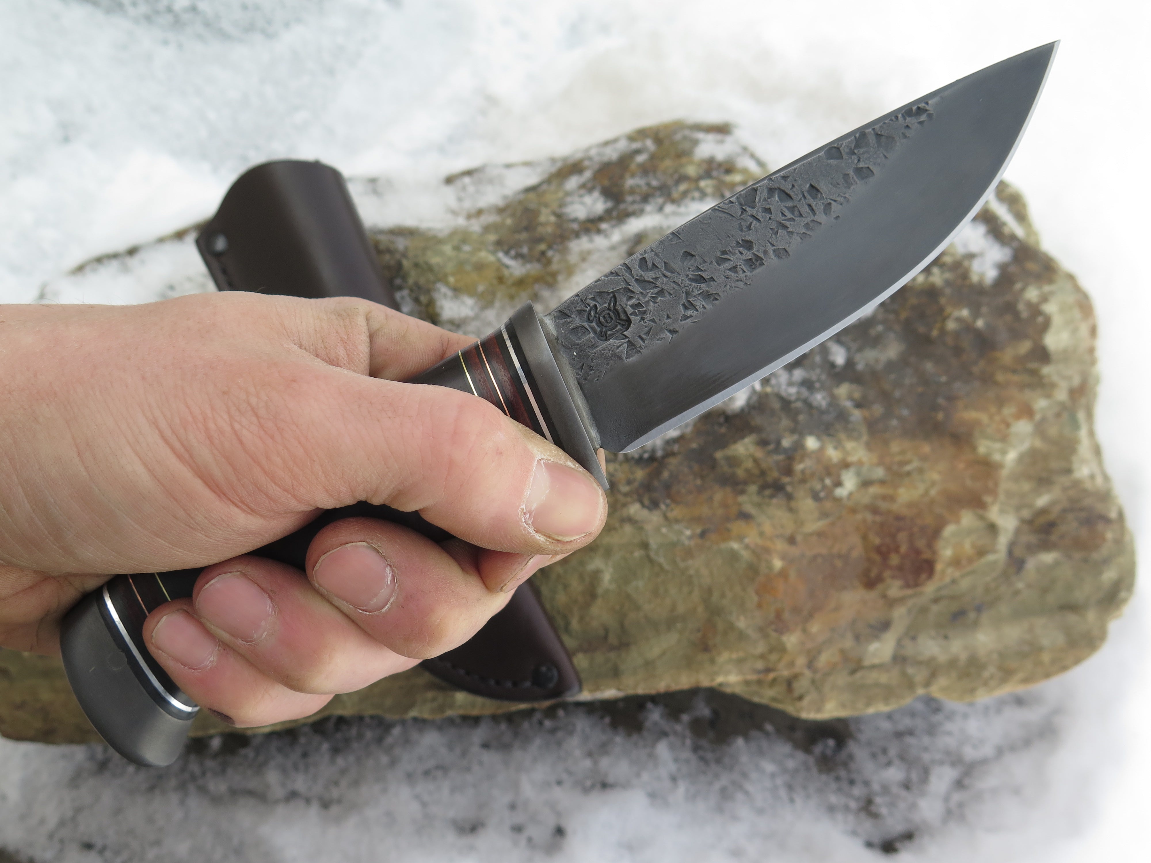 This remarkable new Drop Point from Behring Made™ was James' favorite from the batch and there's no arguing why! The blade is 3/16" thick high carbon 01 tool steel that's hand forged and features a razor sharp hollow grind with hammermarks and our forced patina blued finish and it measures 4 1/2" from tip to guard. The blued steel guard is soldered in place above black fiber, horsehide, copper, aluminum and brass spacers as well as a gorgeous cocobolo handle that's pinned with steel and pinned through the tang with copper. The overall length measures 8 7/8" and it comes in a Warlander Leather pouch sheath.