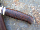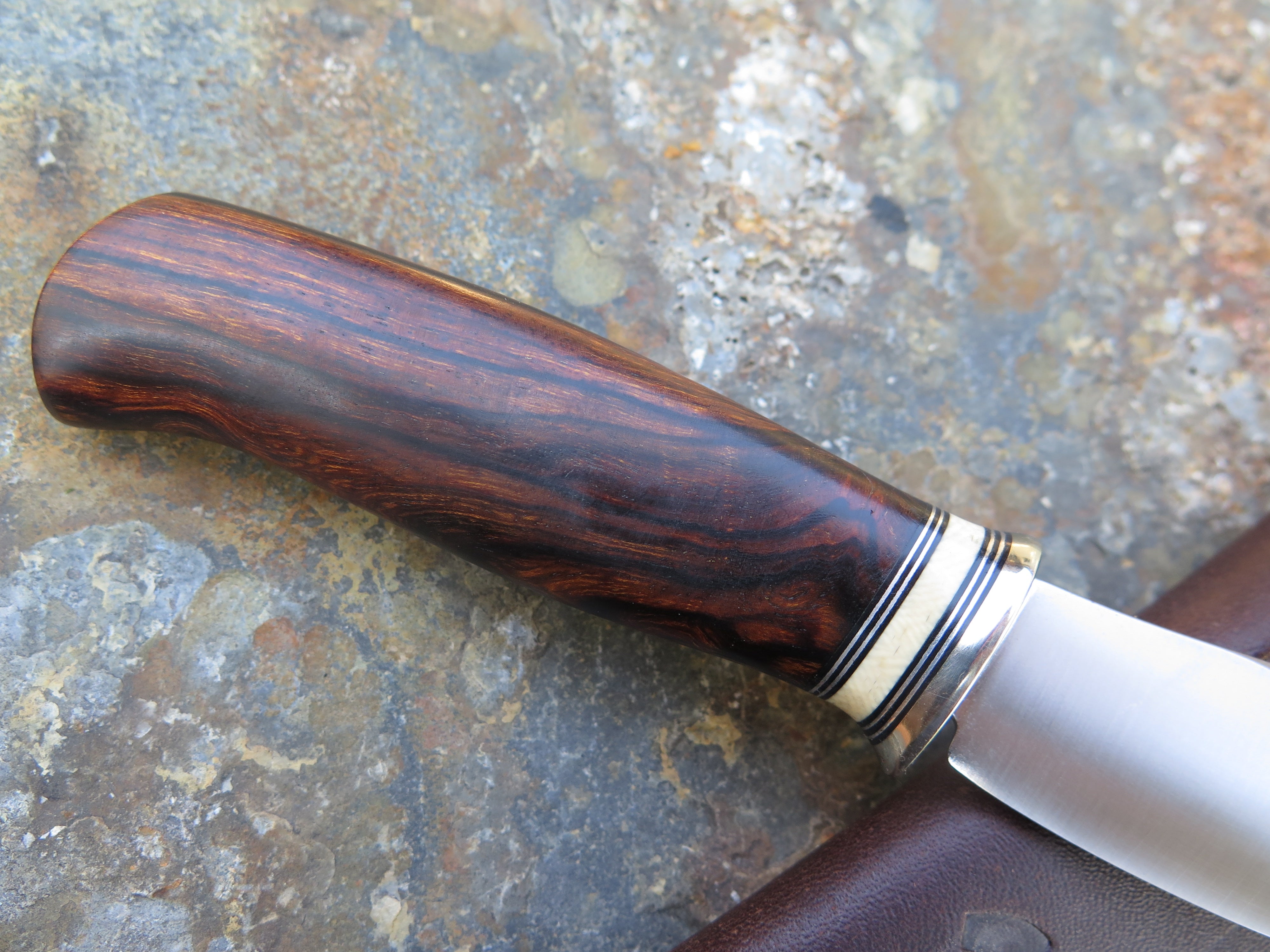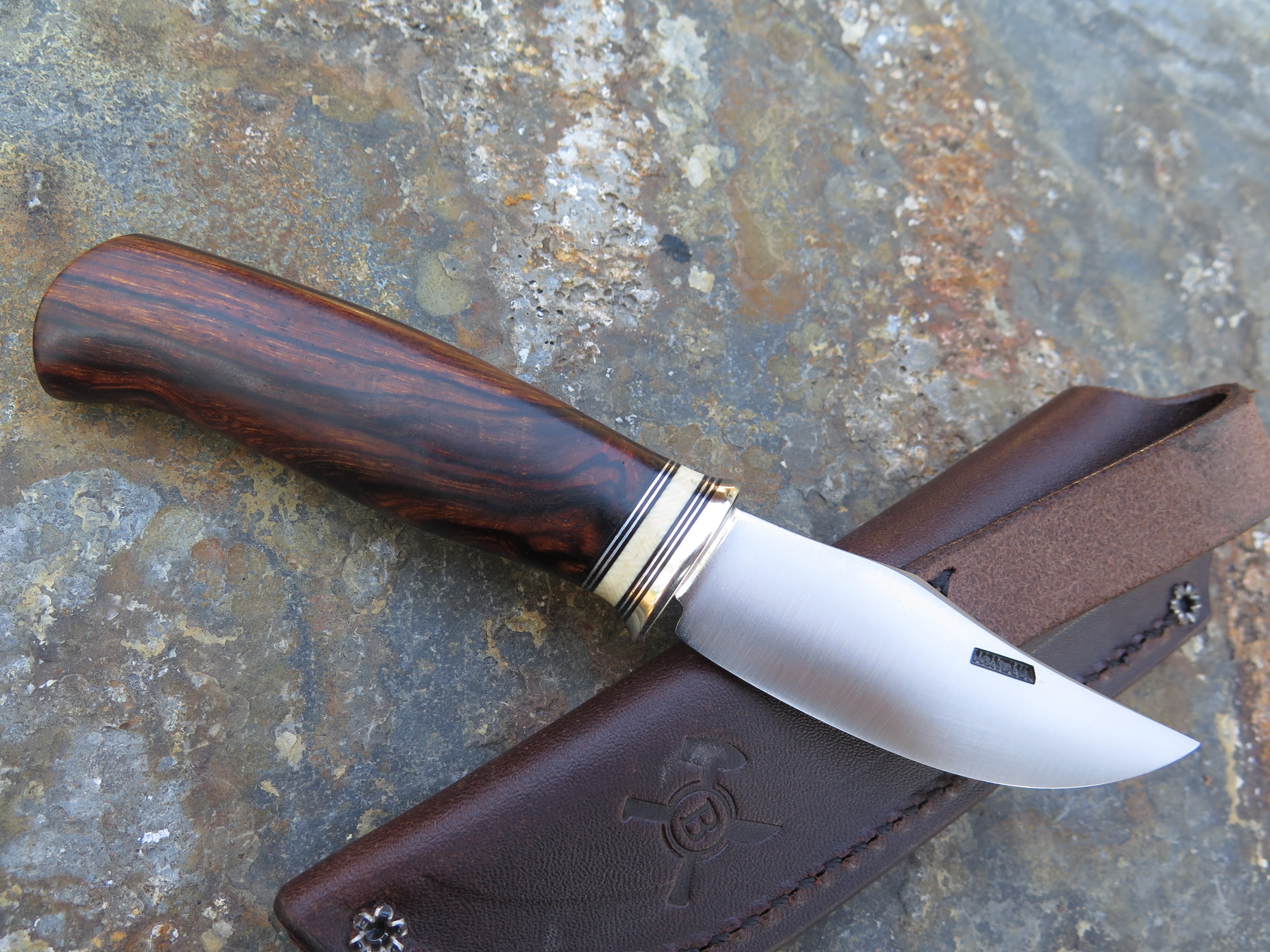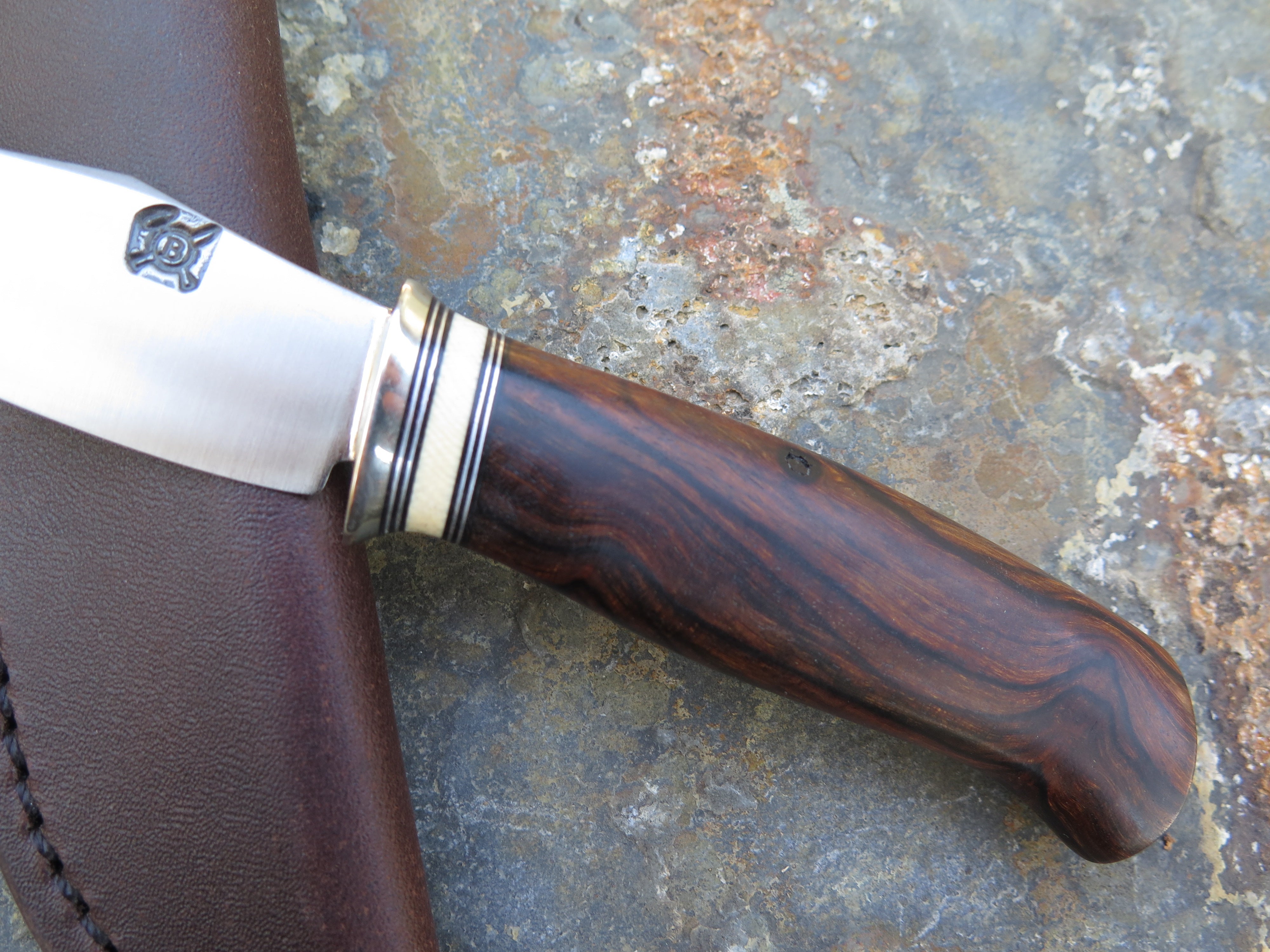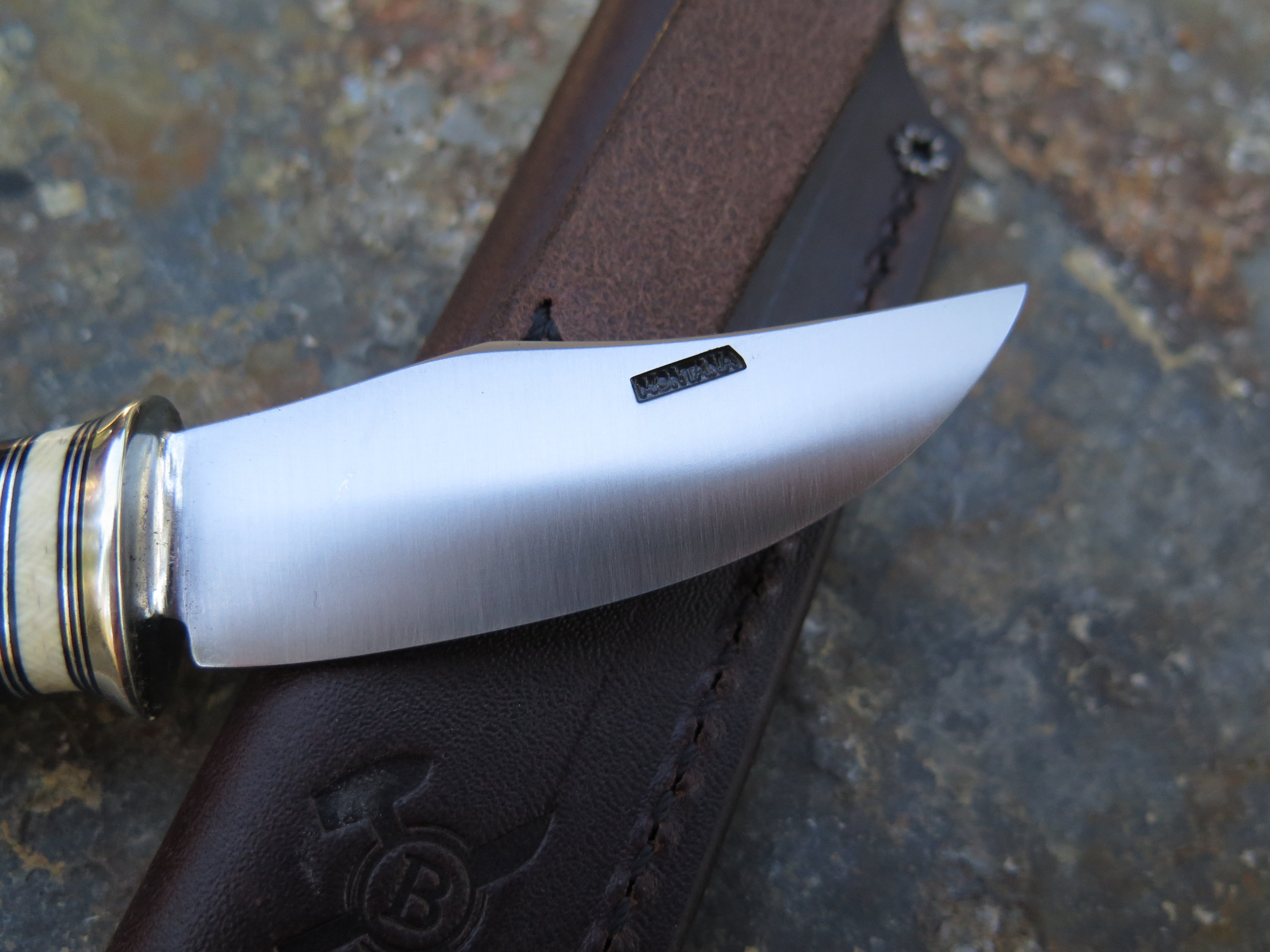 This handsome new Clip Point from Behring Made© is hand forged from 1/8" thick high carbon 01 tool steel and it measures 3" from tip to guard with a razor sharp convex grind. The nickel silver guard is soldered in place above black, aluminum and mammoth ivory spacers as well as a premium desert ironwood handle. The overall length measures just under 6 1/2" and it comes in a classic leather belt pouch sheath.