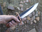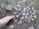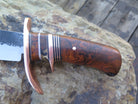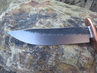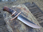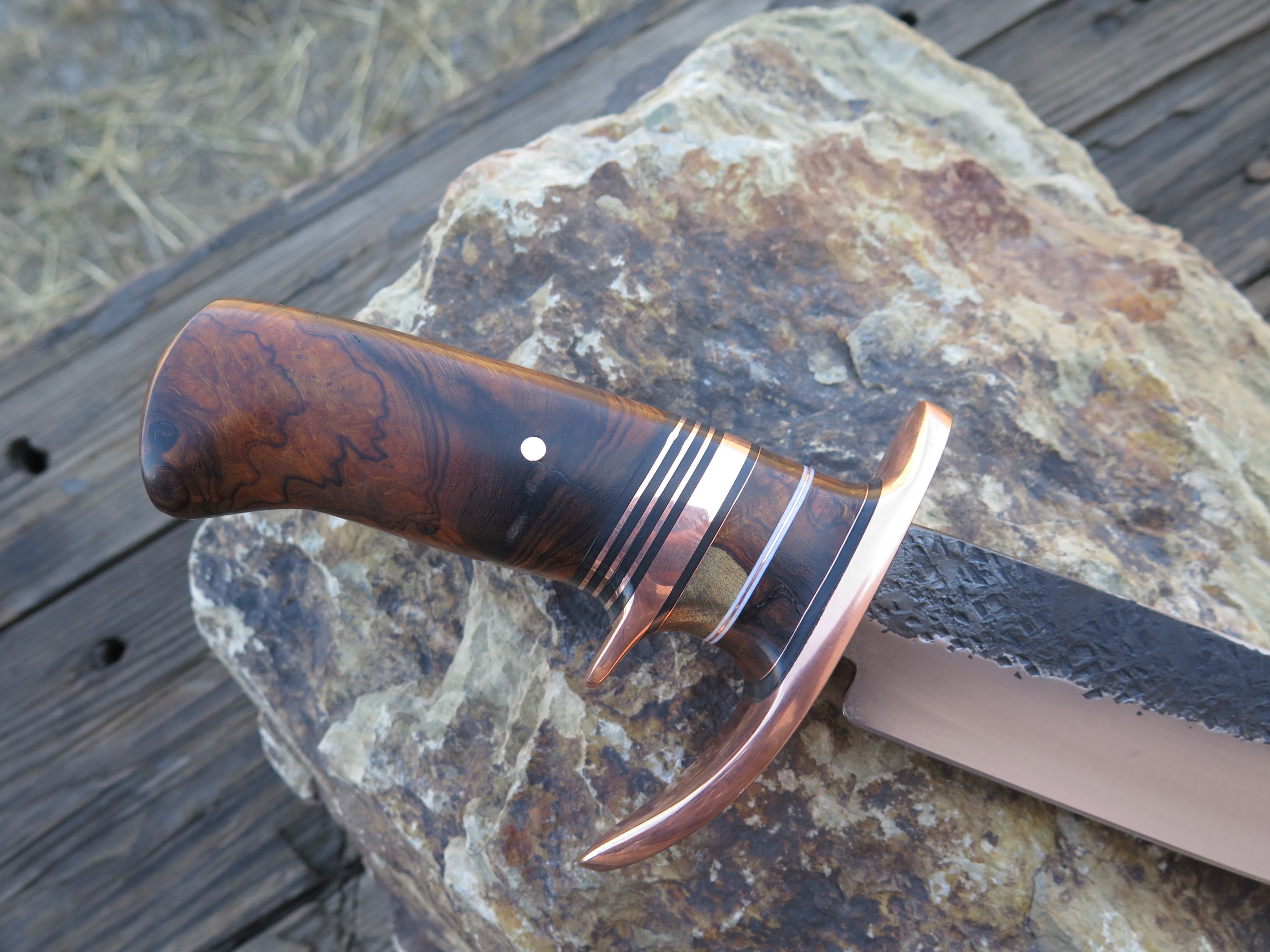 This XL Desert Ironwood Fighter flexes an aggressive hand forged half-s copper guard atop a sub-hilt for a remarkable grip both standard or reversed. We hand forged the 13/64" thick 5160 spring steel blade to measure 7 1/4" from tip to guard with a razor sharp hollow grind and a hammermark finish. The guard is soldered in place above black and white fiber, copper and ironwood spacers with a premium ironwood handle that's also pinned with copper. The overall length measures 12" and it comes in a custom sheath in the style of your choosing. Wouldn't want to be on the business end of this one!