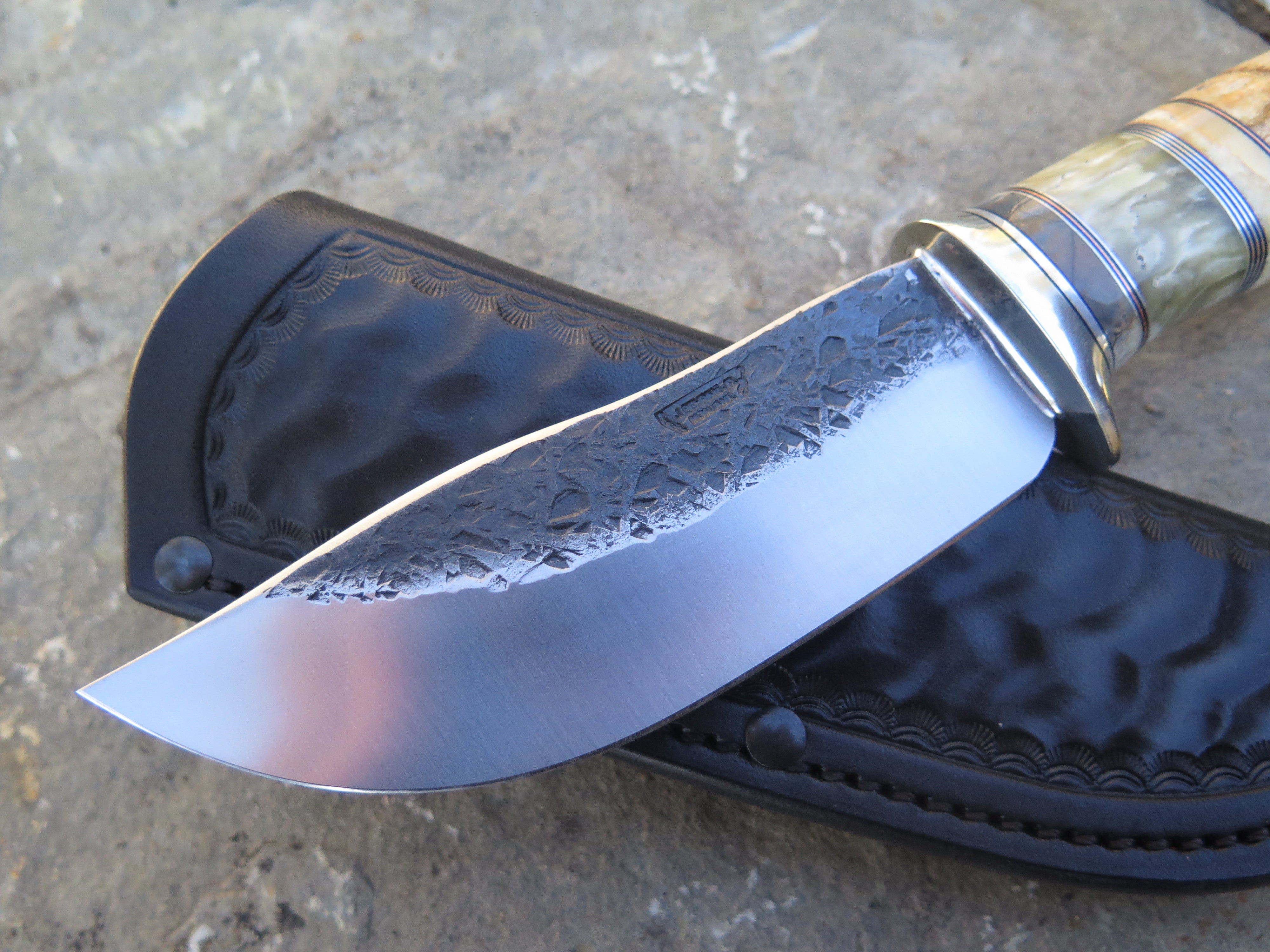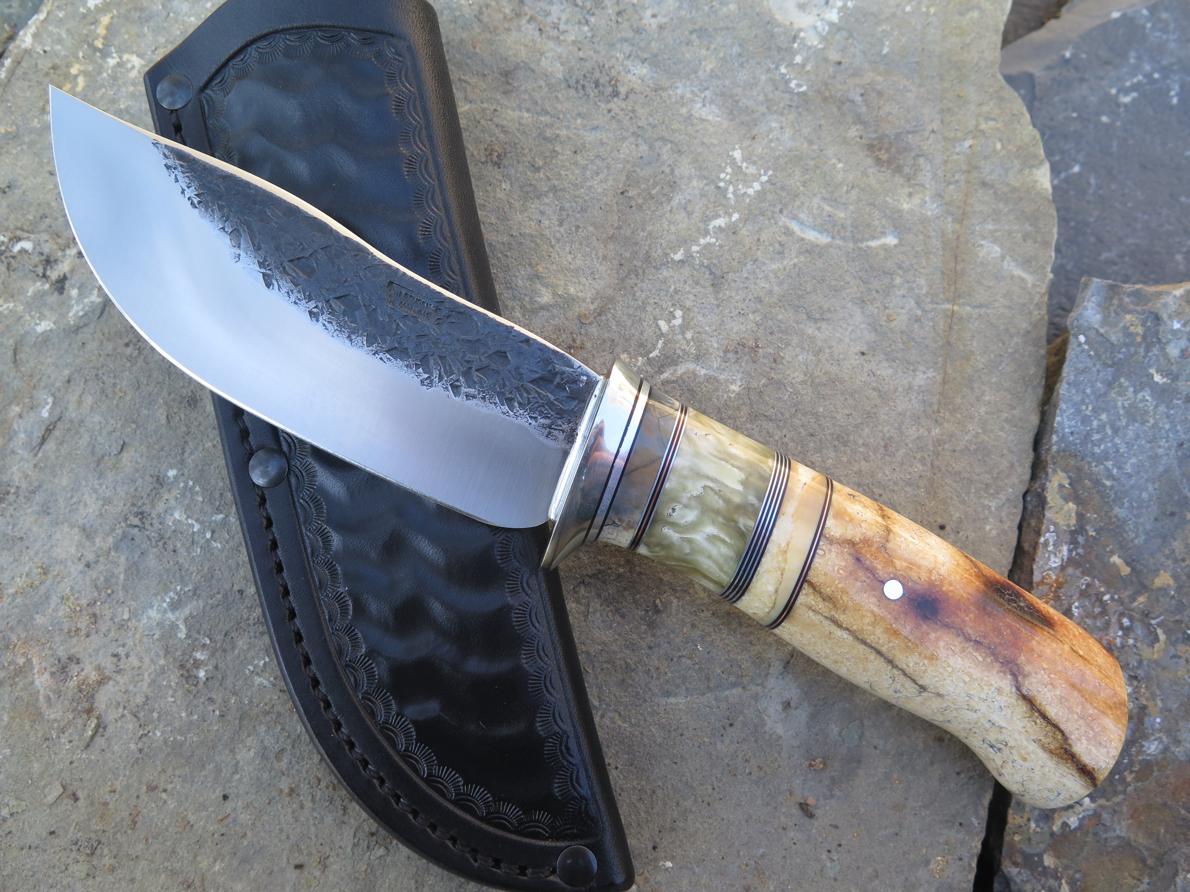 This unique new Hunter from Behring Made© is hand forged out of 3/16" thick high carbon 01 tool steel and it measures 5" from tip to guard with a razor sharp hollow grind and our hammermark finish. The nickel silver guard is soldered in place above black fiber, aluminum and copper spacers amidst an array of walrus and musk ox boss. The fossil walrus ivory handle is pinned through the tang with aluminum and the overall length measures 9 5/8". Too pretty for the plain ones, we outfitted this sheath with a premium tooled leather belt pouch.