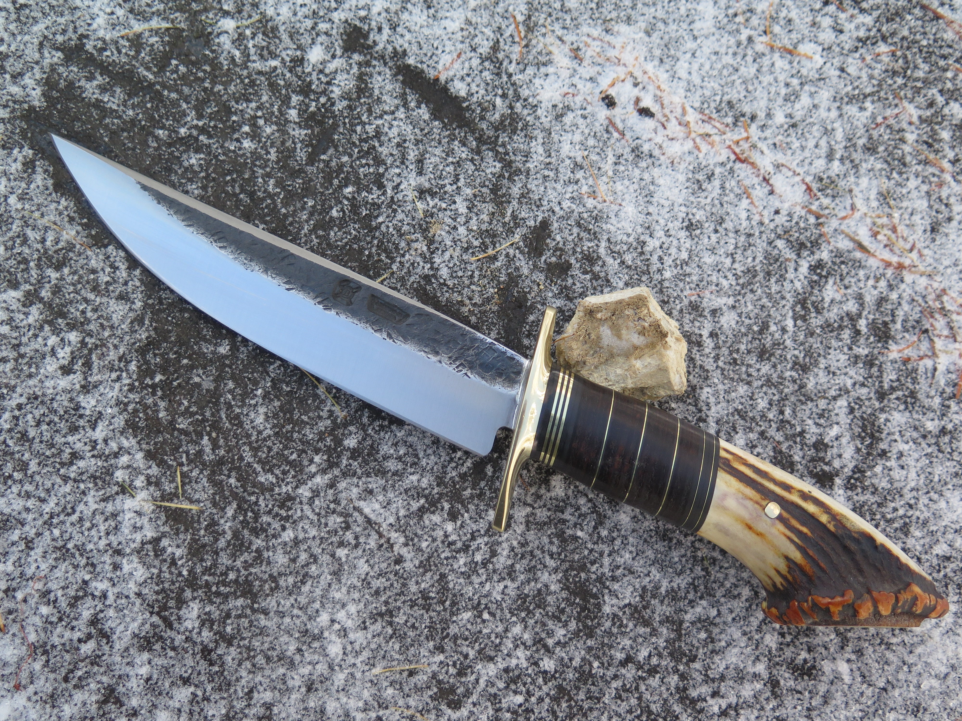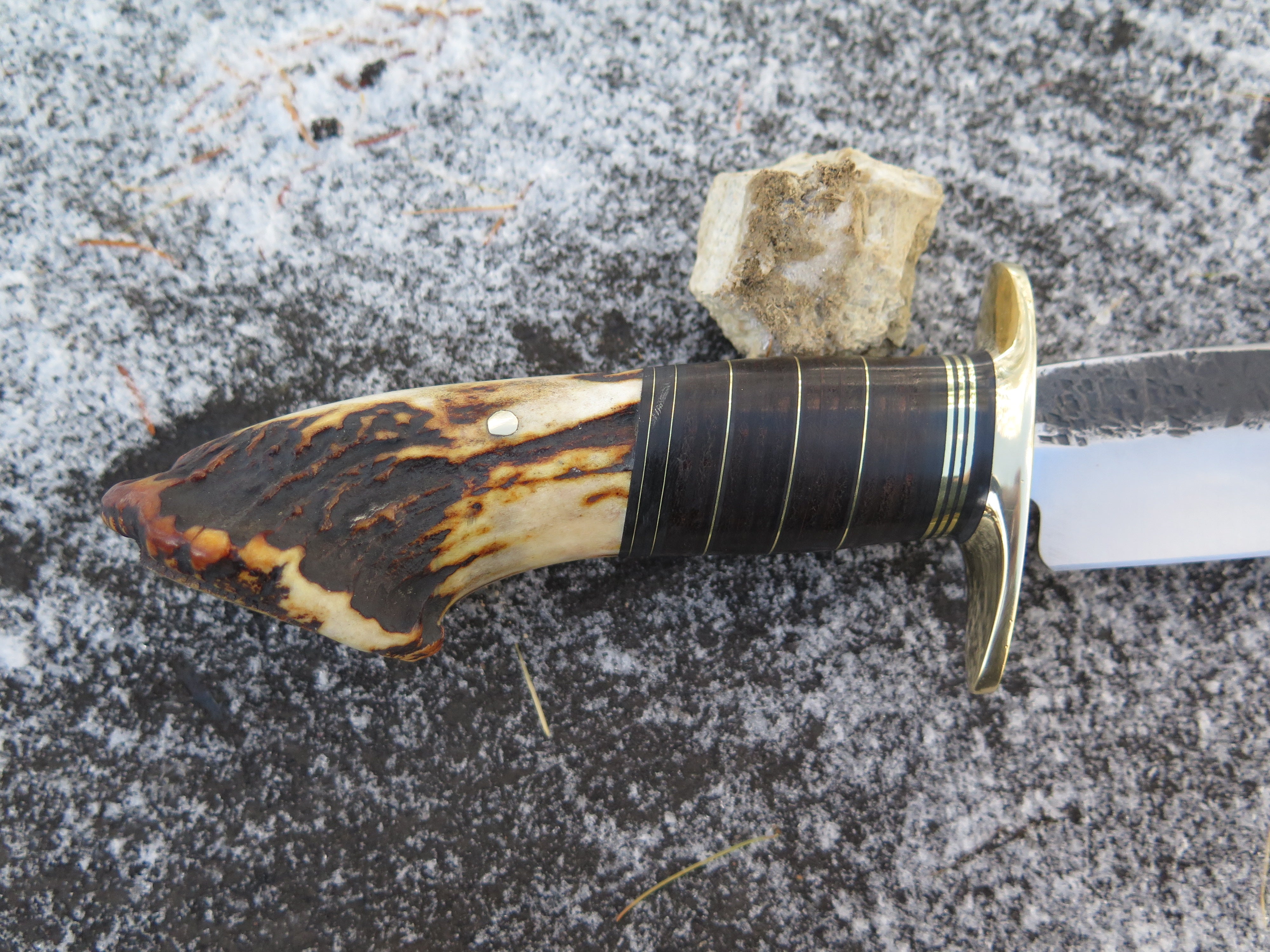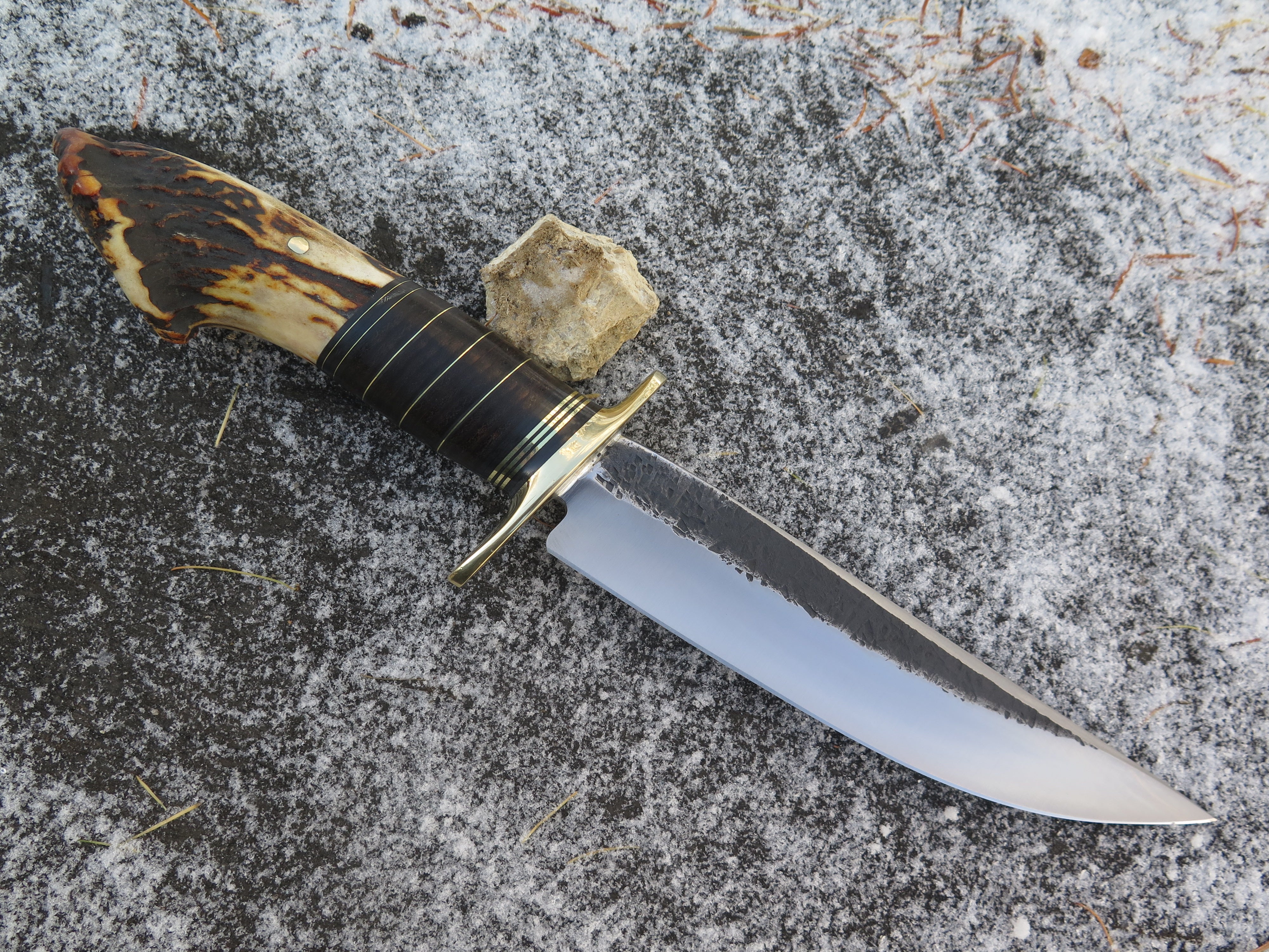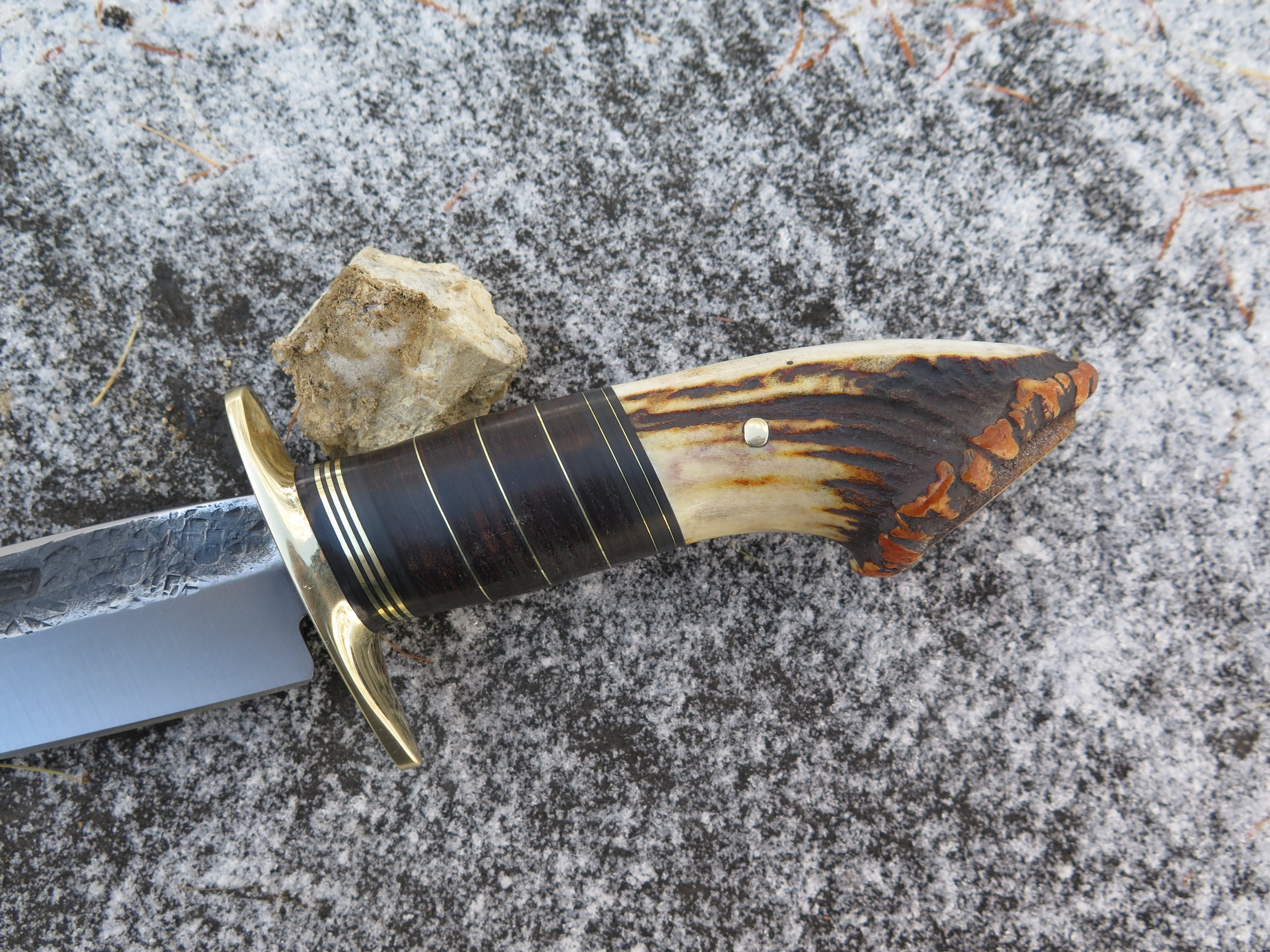 There's nothing uglier than a knife fight, but few things are prettier than this Behring Made© Fighter! We hand forged from blade from 13/64" thick 5160 spring steel and it measures 7" from tip to guard with a razor sharp hollow grind and a hammemark finish. The tall brass guard is soldered in place above black fiber, brass and horsehide leather spacers with an ever-desirable down turned sambar stag crown stag butt that's pinned with brass. The overall length measures 12 1/2" and it comes in a custom leather sheath from Warlander.