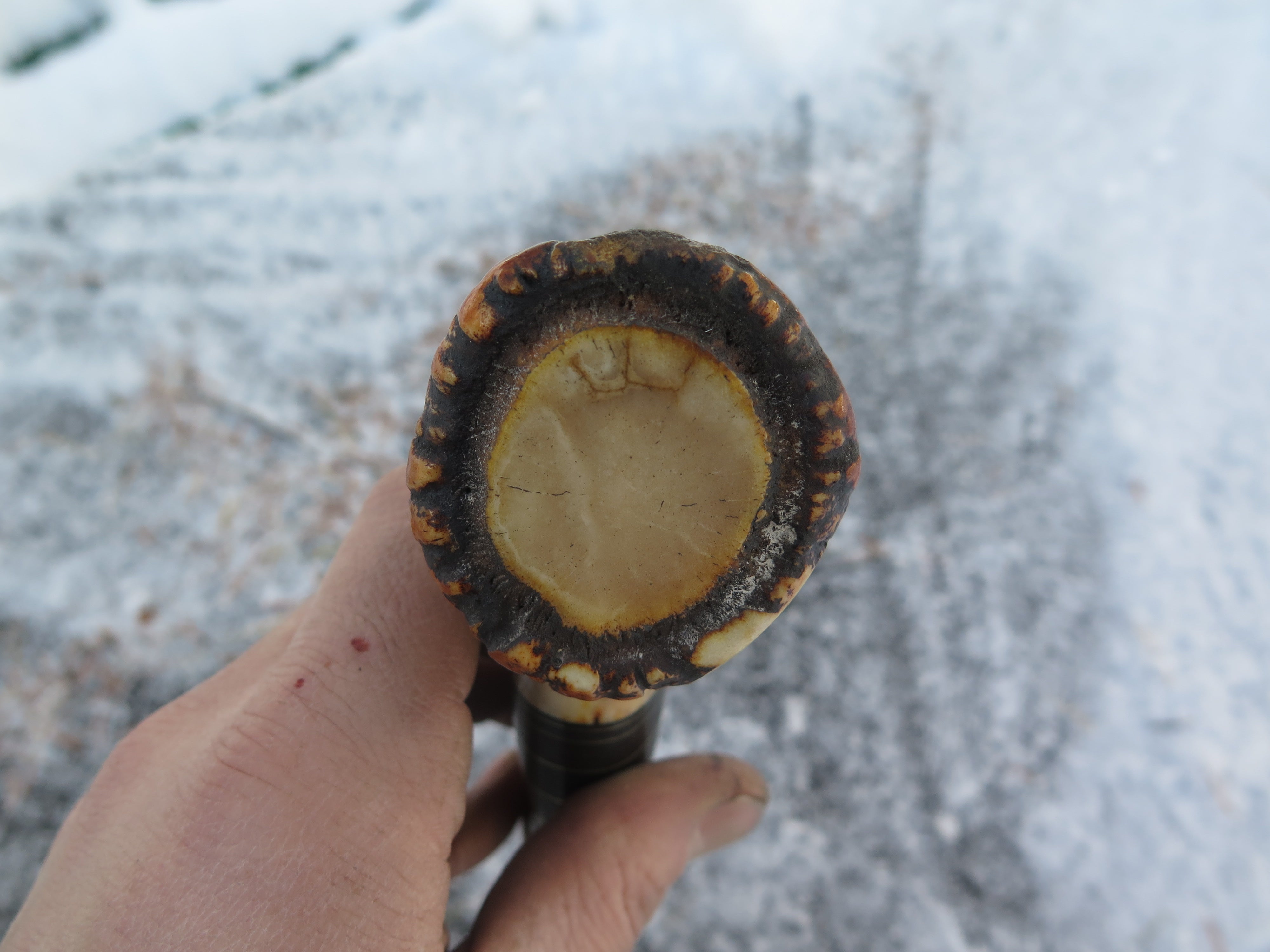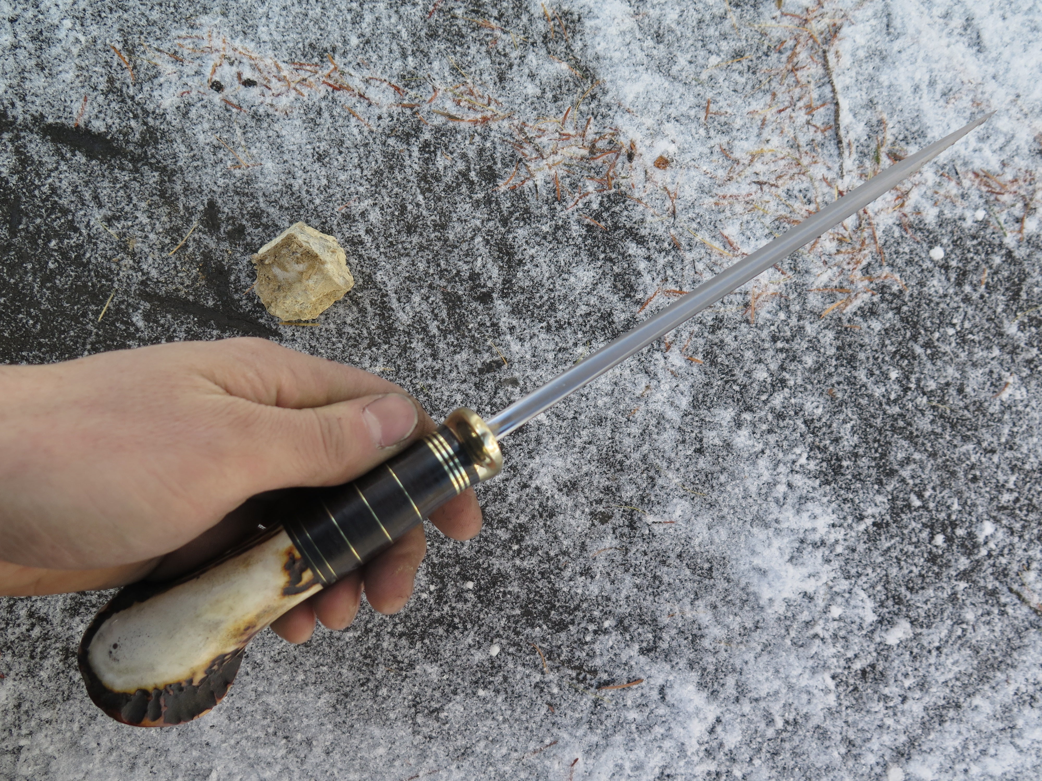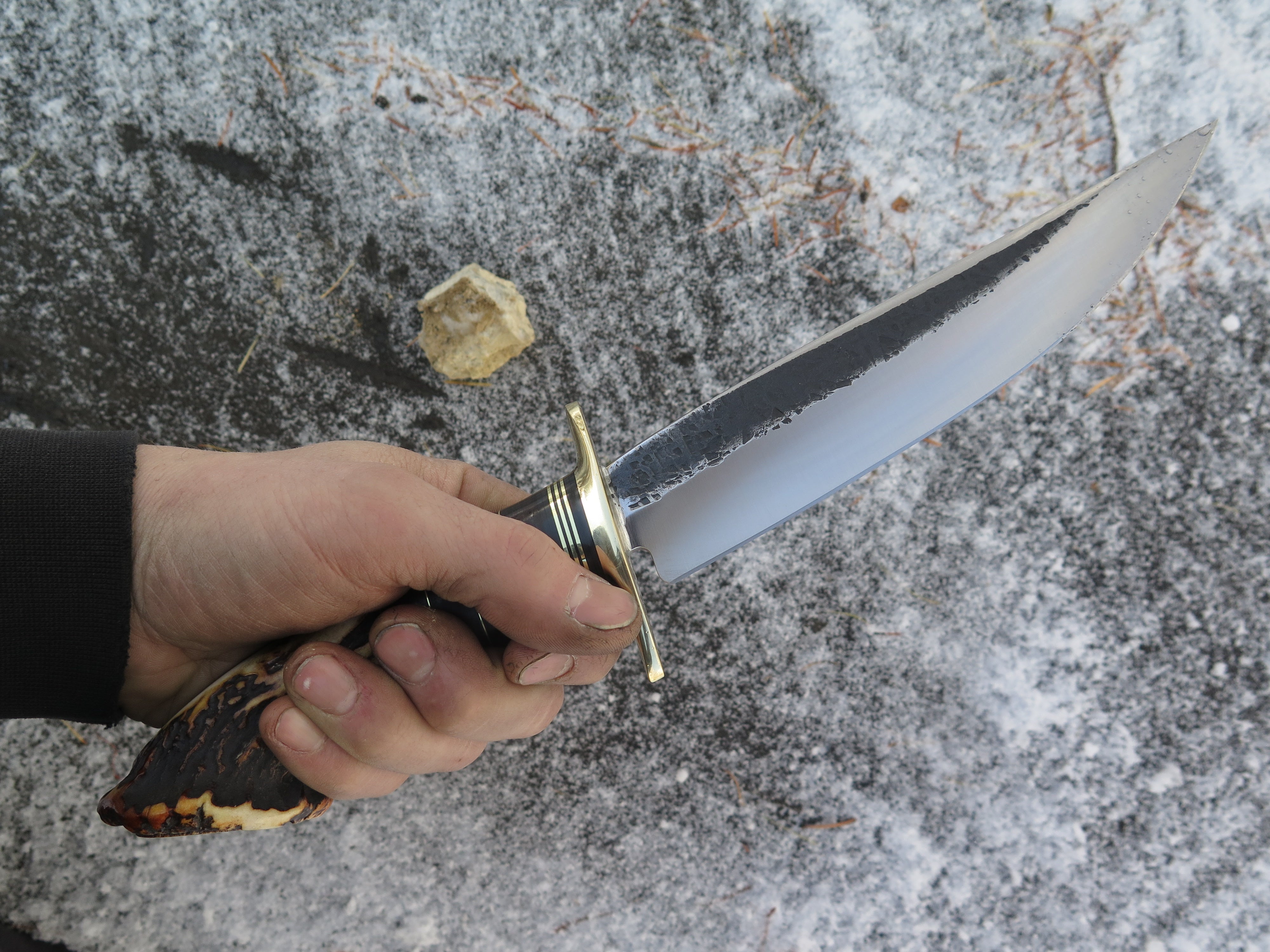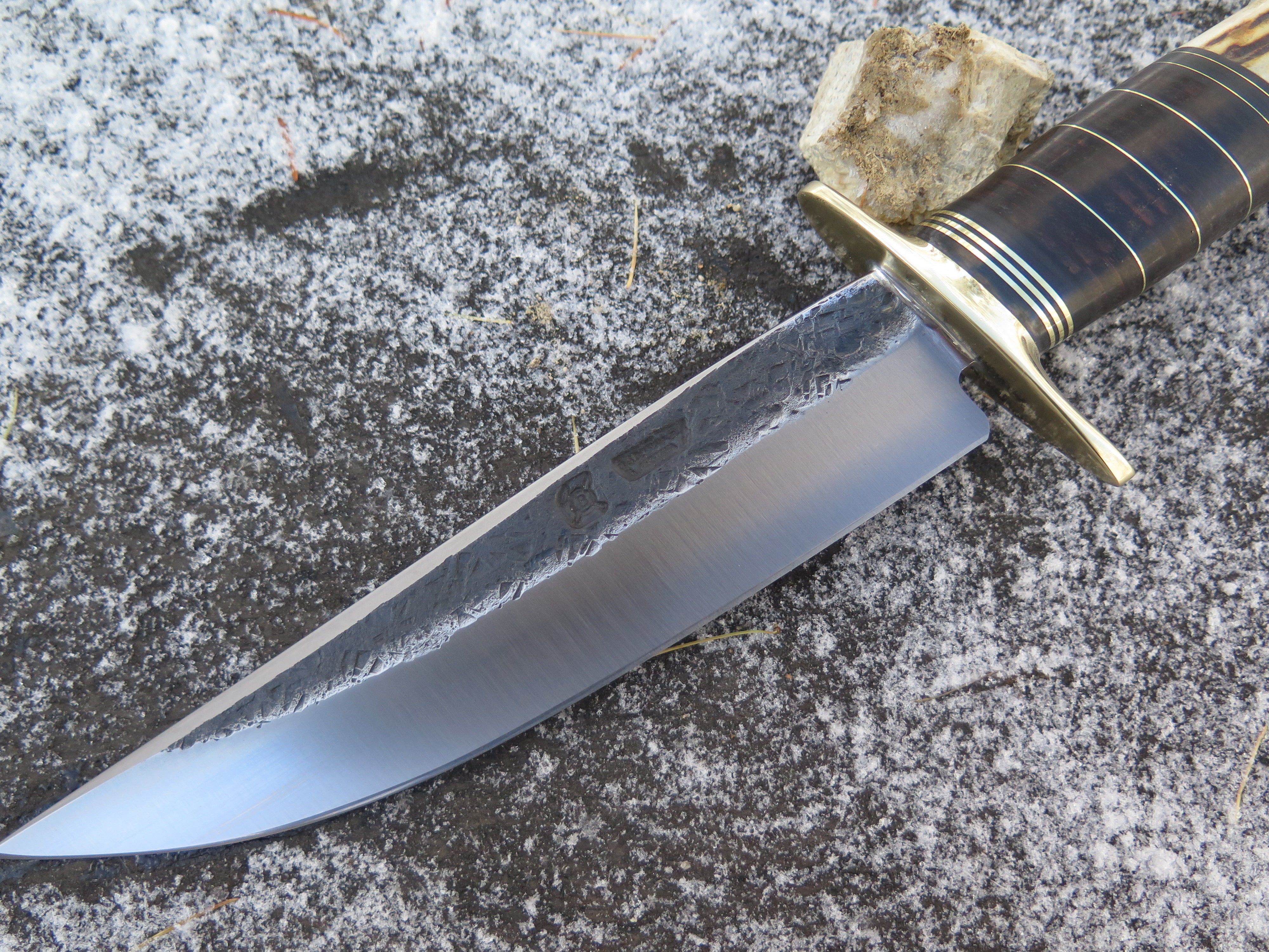 There's nothing uglier than a knife fight, but few things are prettier than this Behring Made© Fighter! We hand forged from blade from 13/64" thick 5160 spring steel and it measures 7" from tip to guard with a razor sharp hollow grind and a hammemark finish. The tall brass guard is soldered in place above black fiber, brass and horsehide leather spacers with an ever-desirable down turned sambar stag crown stag butt that's pinned with brass. The overall length measures 12 1/2" and it comes in a custom leather sheath from Warlander.