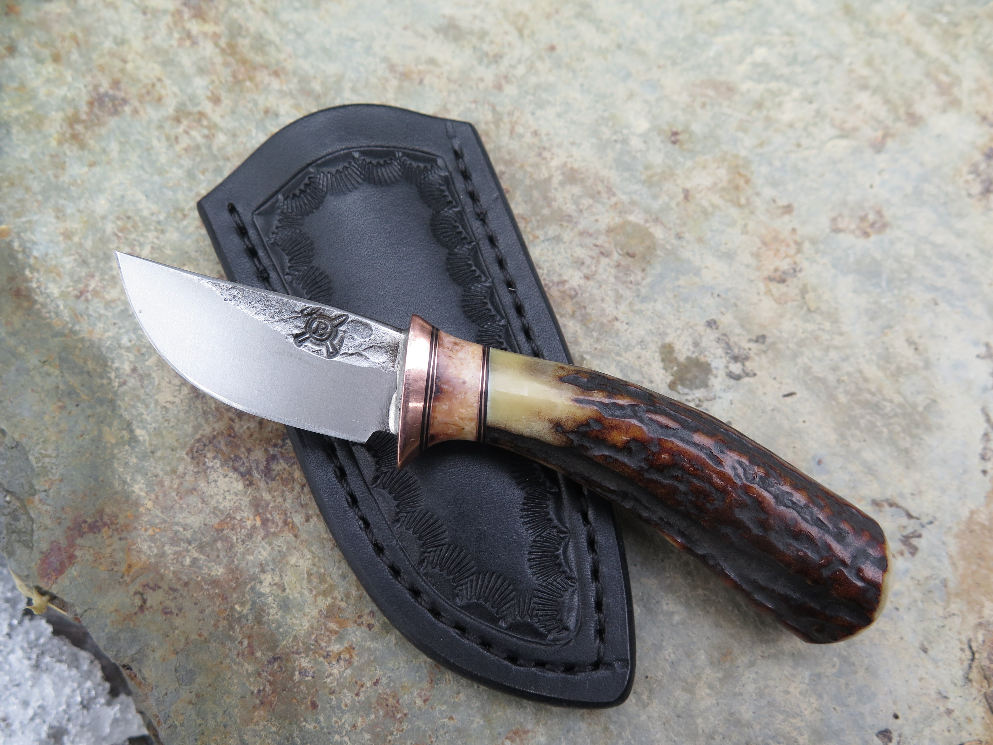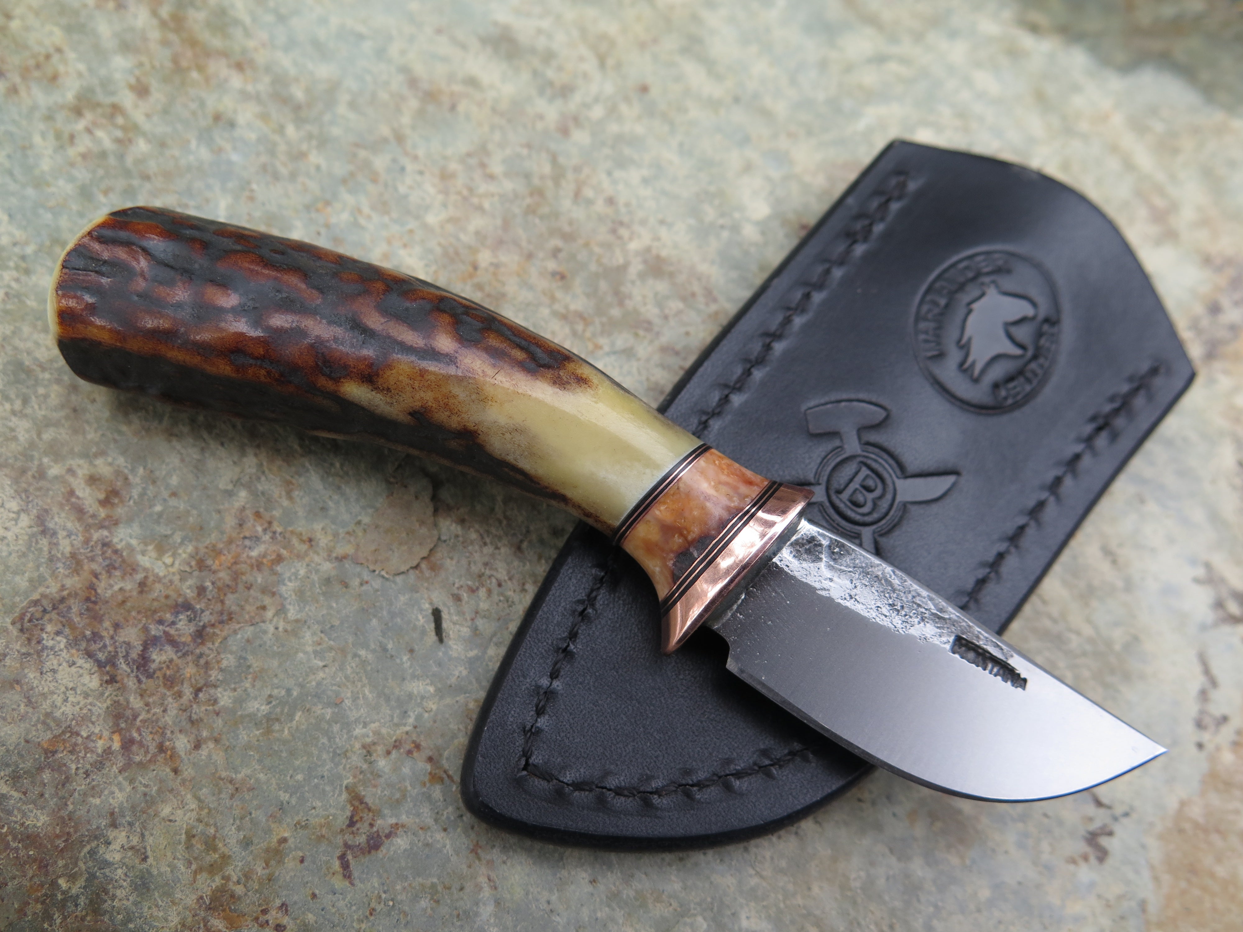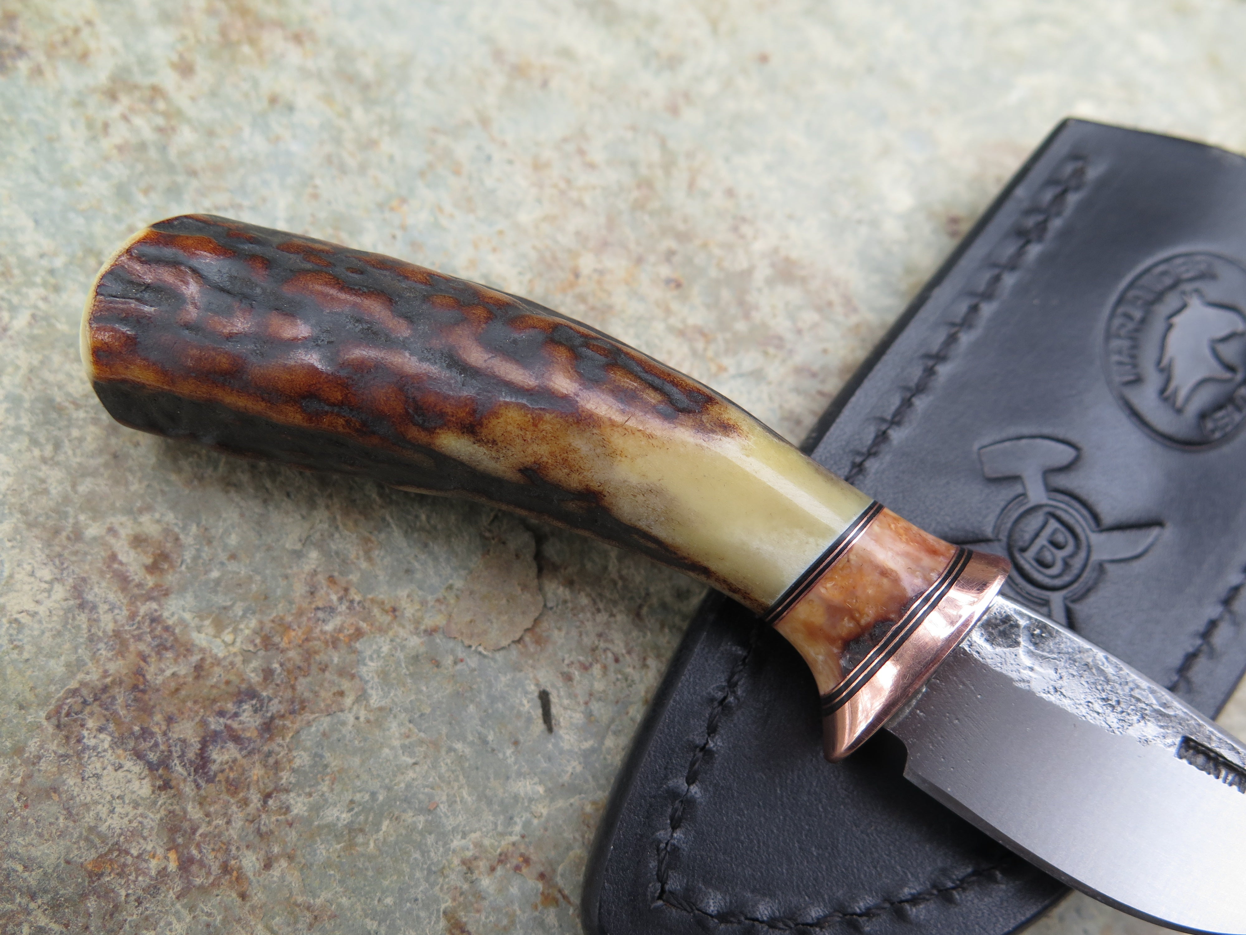 This sleek new 5th pocket from Behring Made© is hand forged from 1/8" thick high carbon 01 tool steel and it measures 1 3/4" from tip to guard with a razor sharp hollow grind and our hammermark finish. The copper guard is soldered in place above black fiber, copper, and fossil walrus ivory spacers with a beautiful sambar stag handle that brings the overall length out to 4 5/8". The simple leather sleeve makes this a discreet and easy carry, and we guarantee it a joy to use!