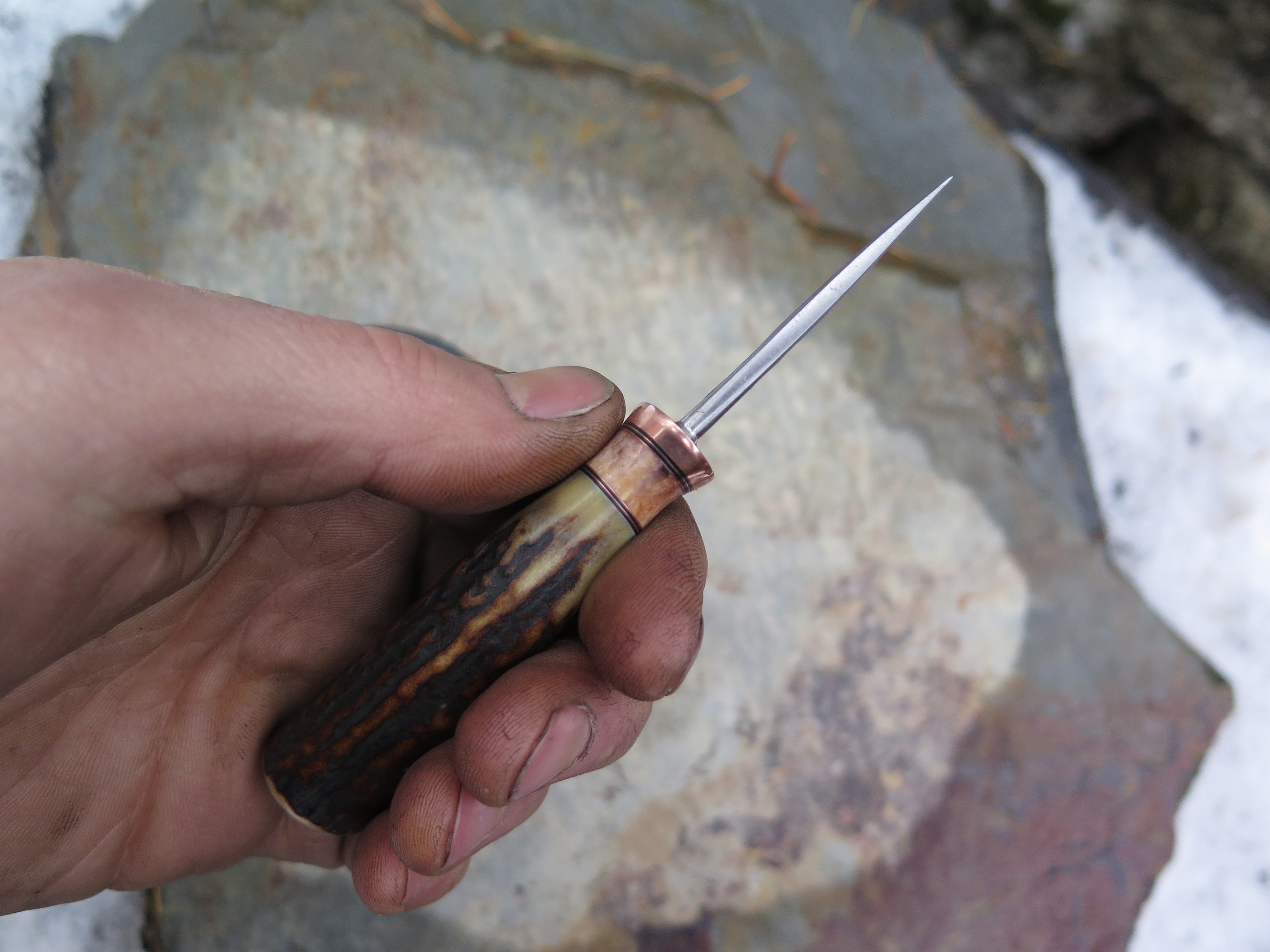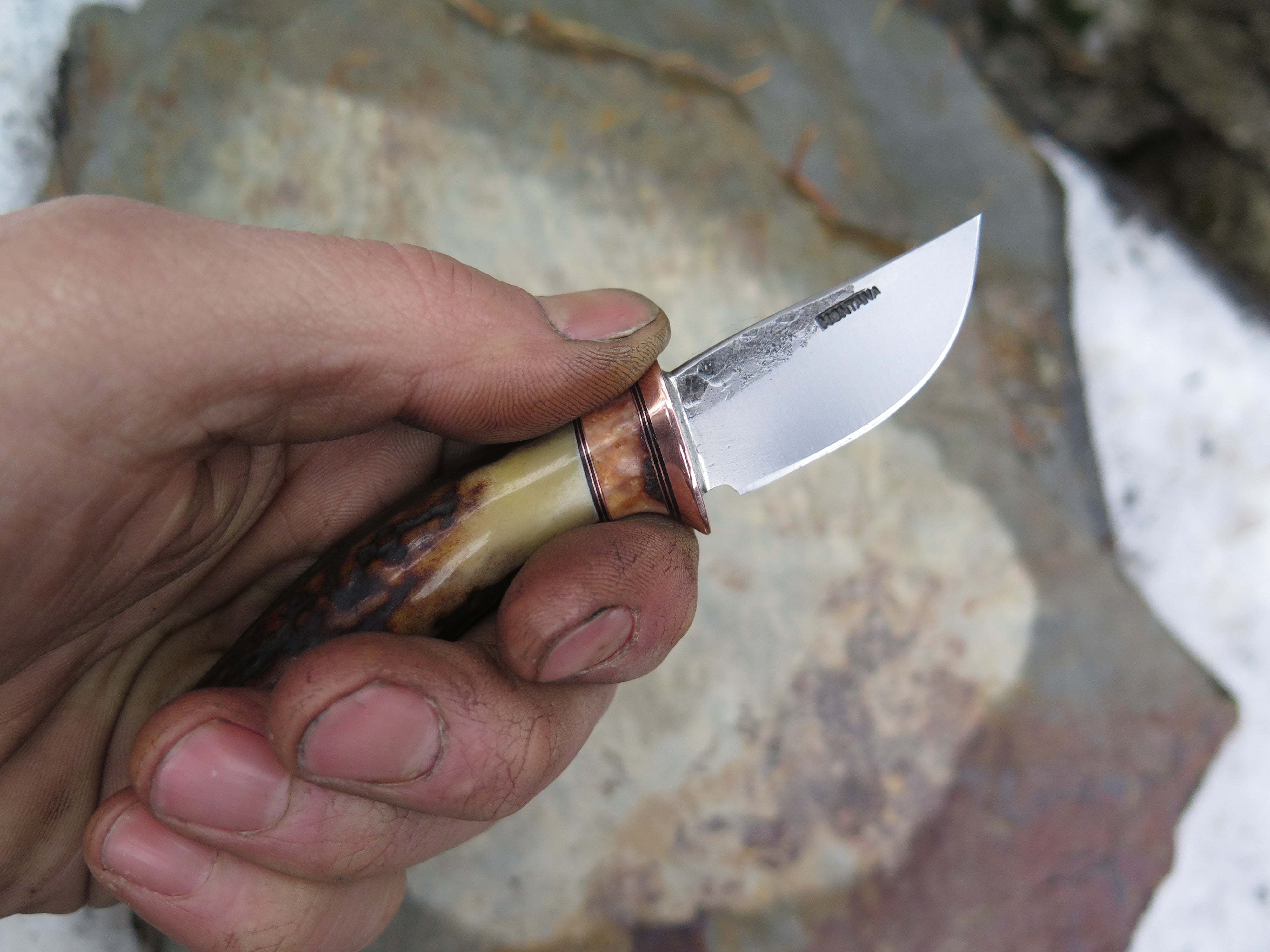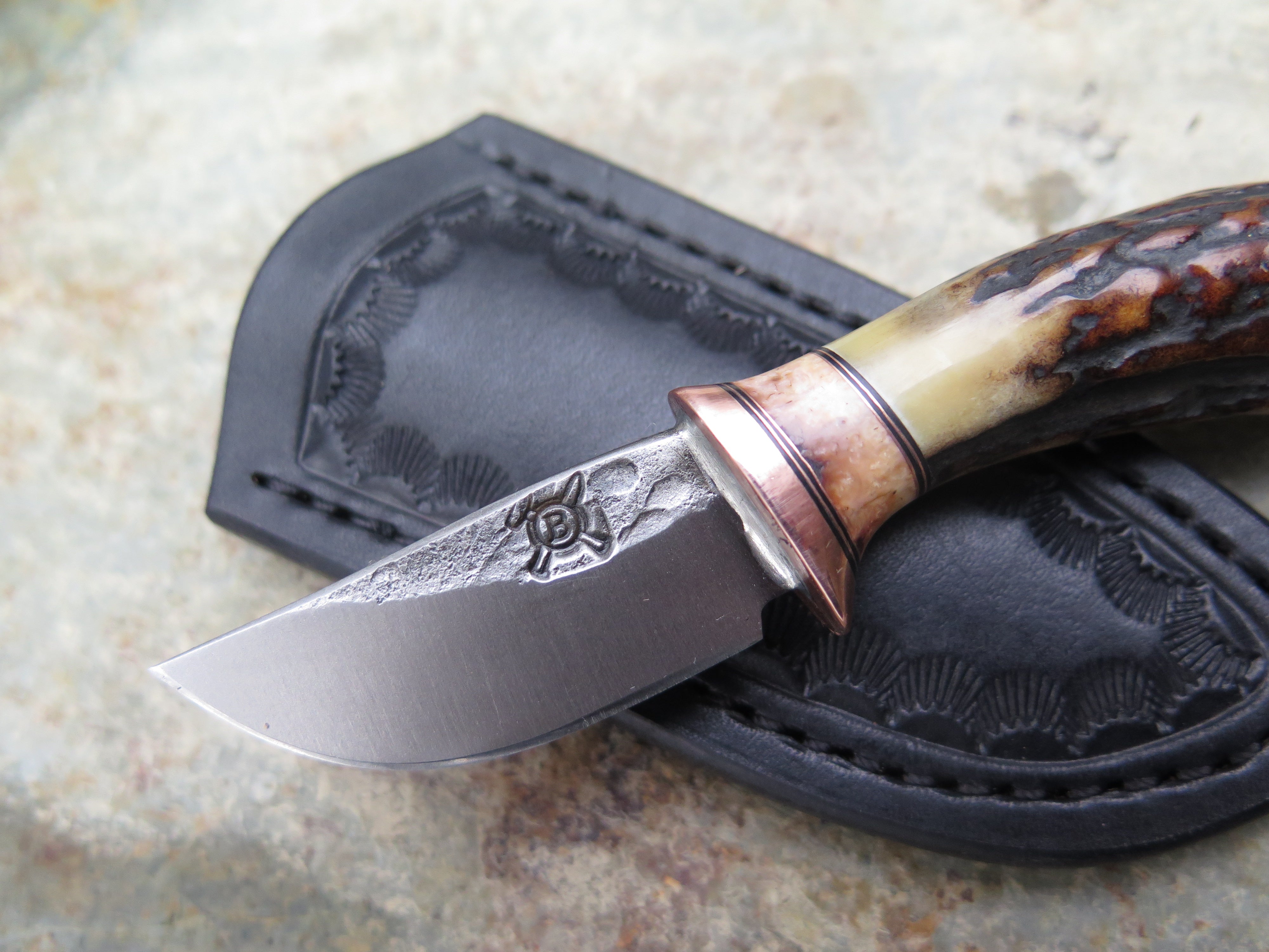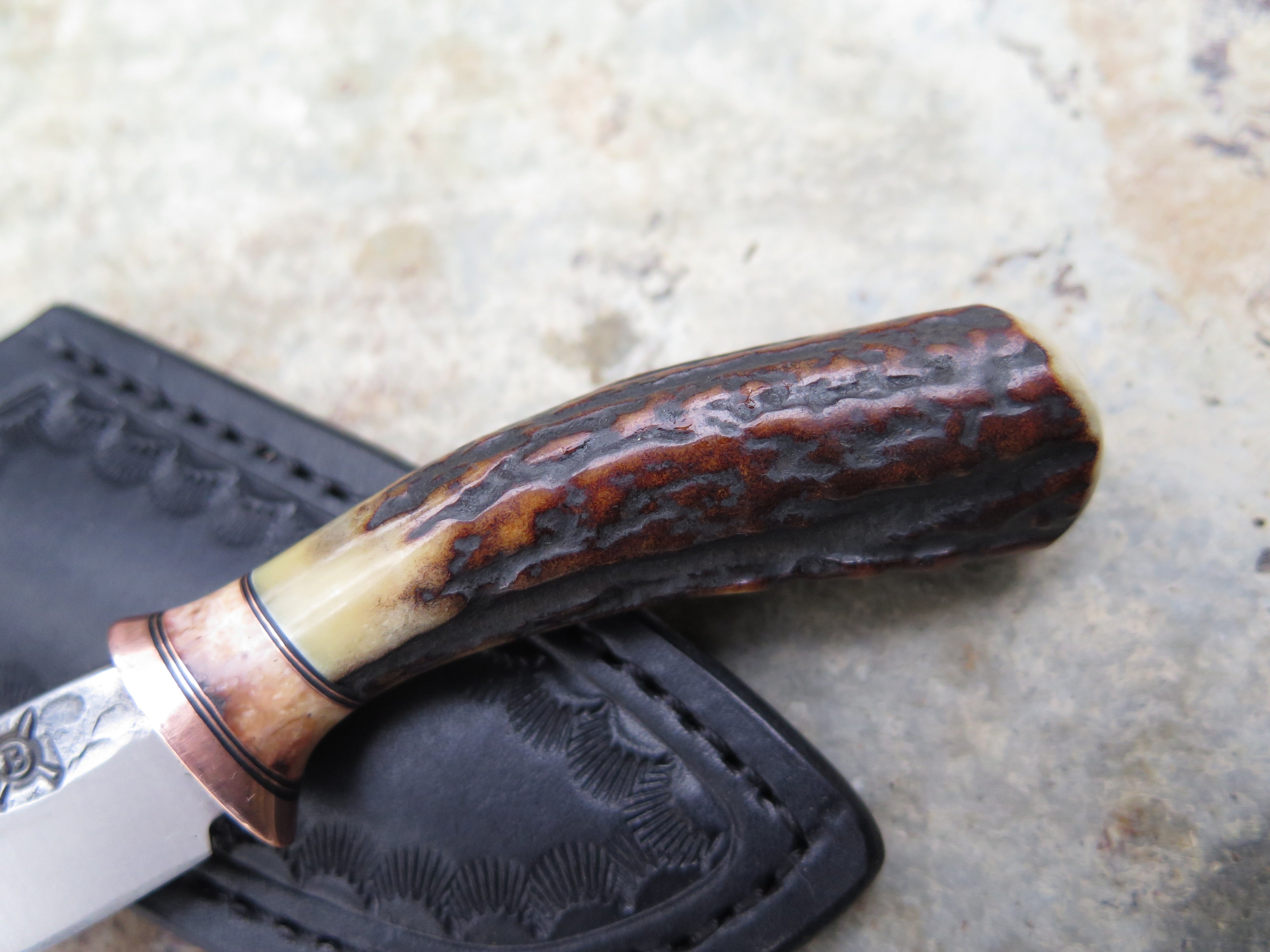 This sleek new 5th pocket from Behring Made© is hand forged from 1/8" thick high carbon 01 tool steel and it measures 1 3/4" from tip to guard with a razor sharp hollow grind and our hammermark finish. The copper guard is soldered in place above black fiber, copper, and fossil walrus ivory spacers with a beautiful sambar stag handle that brings the overall length out to 4 5/8". The simple leather sleeve makes this a discreet and easy carry, and we guarantee it a joy to use!