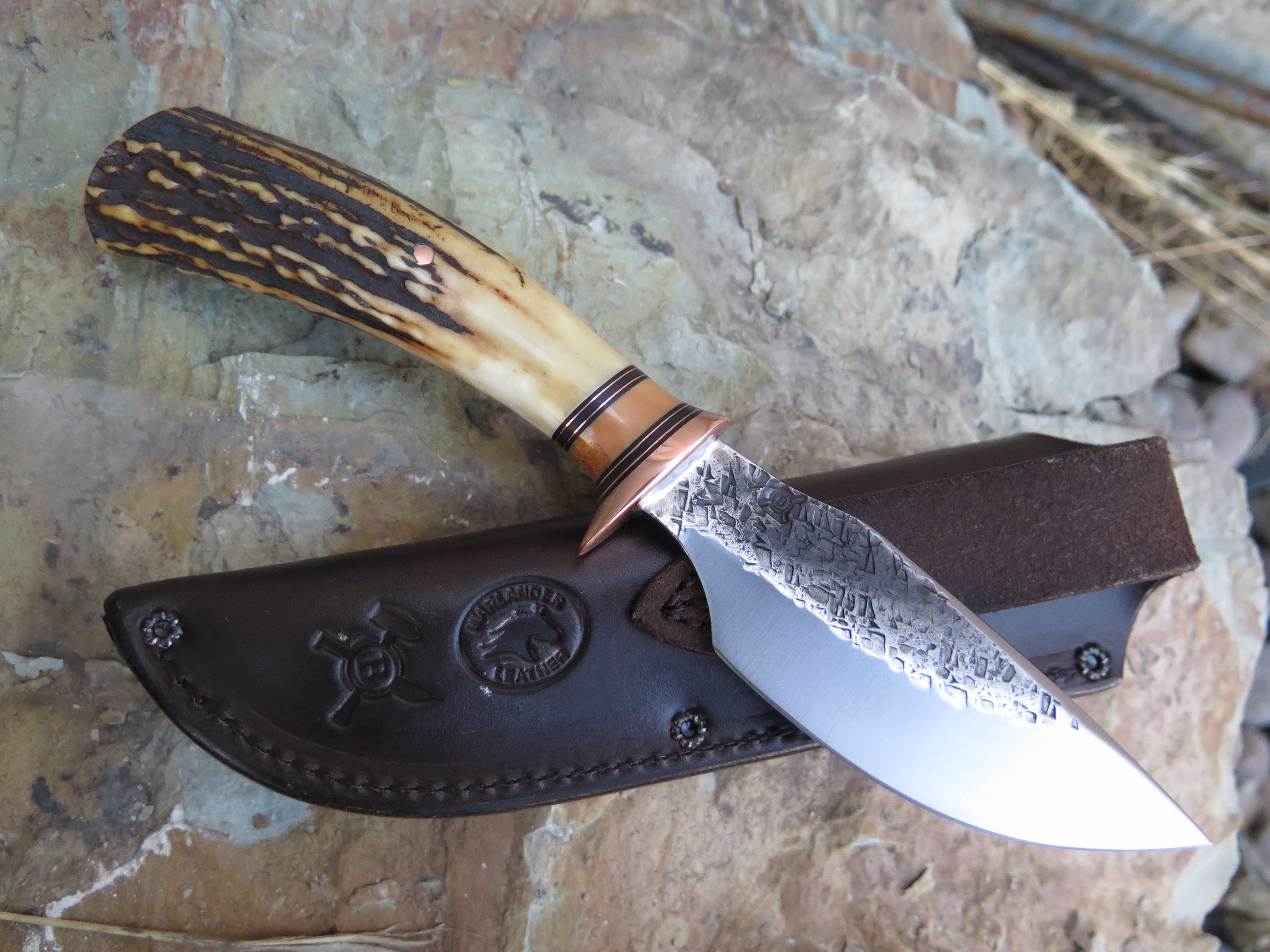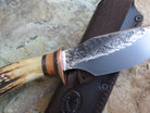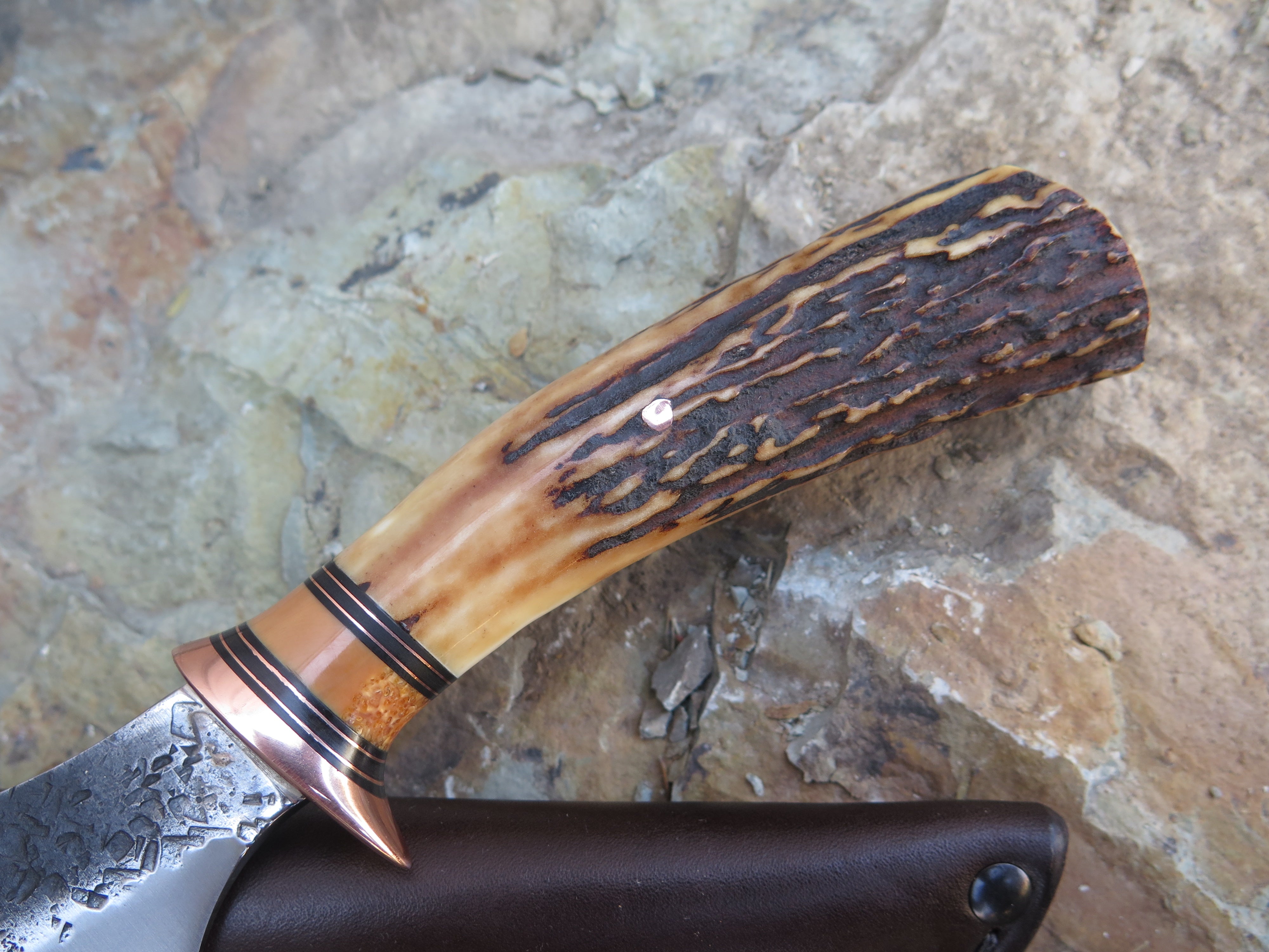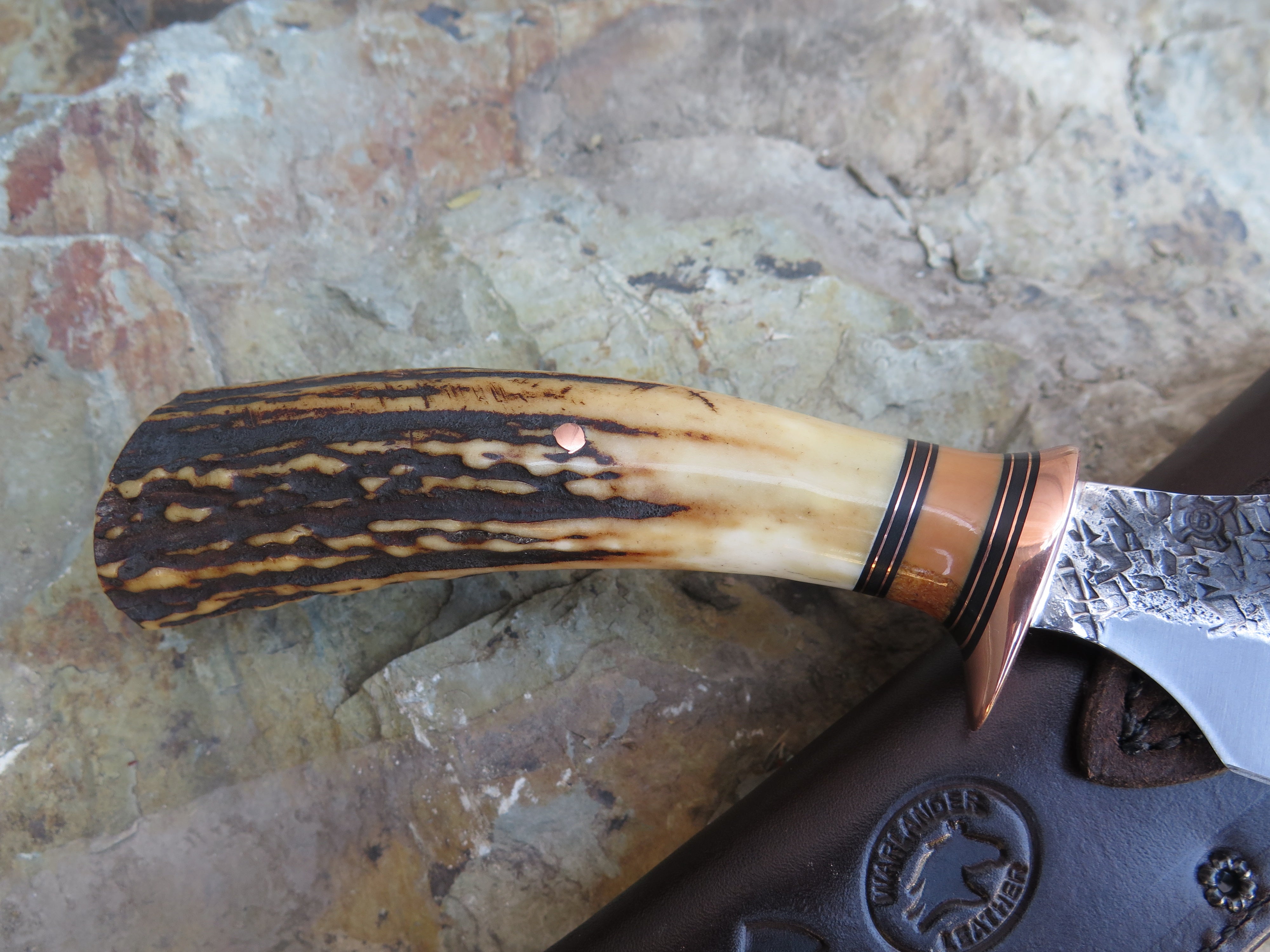 This beautiful new Alaskan from Behring Made™ is hand forged from 3/16" thick high carbon 01 tool steel and it measures 4 1/2" from tip to guard with a razor sharp hollow grind and our hammermark finish. The copper guard is soldered to the tang above black fiber, copper and fossil walrus ivory spacers that wonderfully compliment the premium sambar stag handle that's pinned through the tang with copper. The overall length measures 9 1/4" and it comes in a perfect fitting pouch sheath from Warlander Leather.