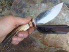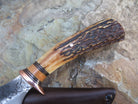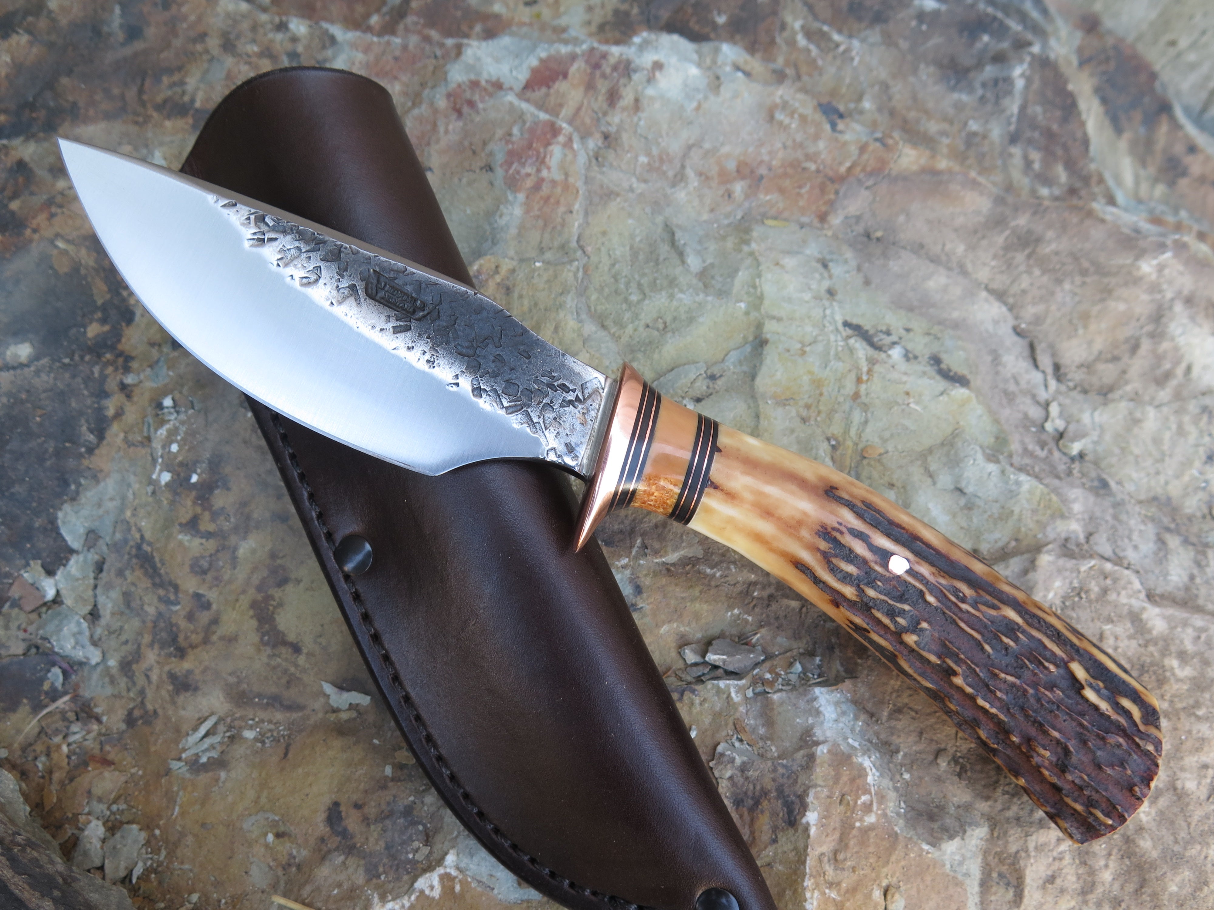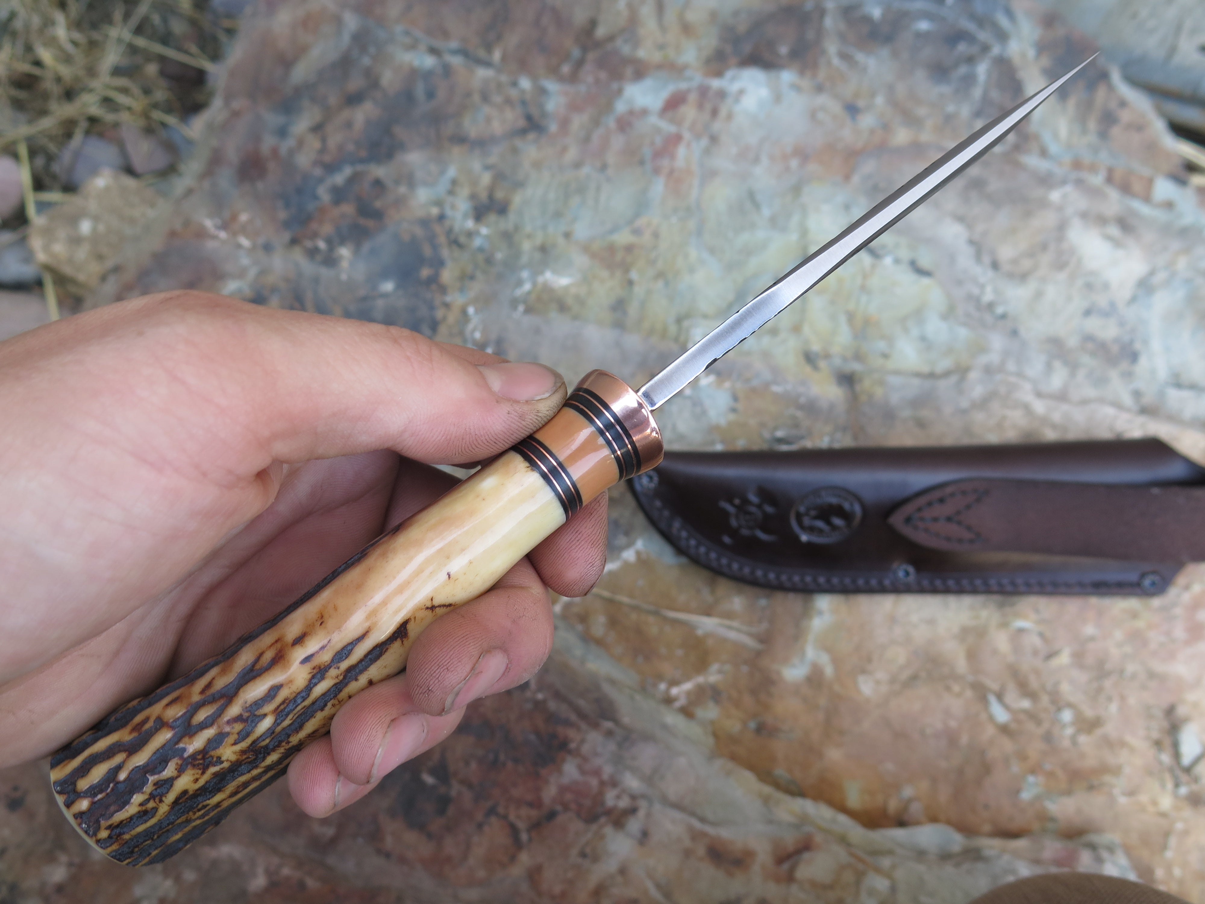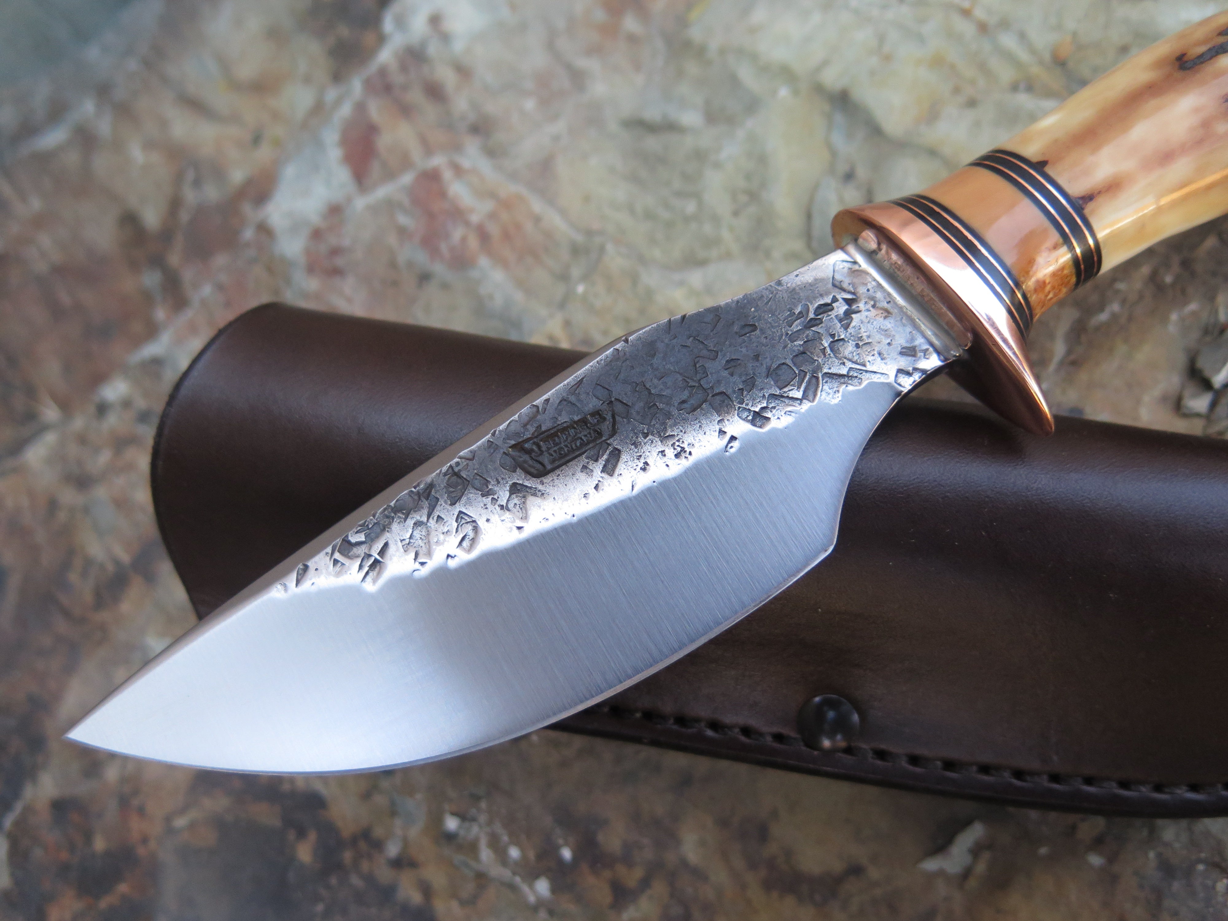 This beautiful new Alaskan from Behring Made™ is hand forged from 3/16" thick high carbon 01 tool steel and it measures 4 1/2" from tip to guard with a razor sharp hollow grind and our hammermark finish. The copper guard is soldered to the tang above black fiber, copper and fossil walrus ivory spacers that wonderfully compliment the premium sambar stag handle that's pinned through the tang with copper. The overall length measures 9 1/4" and it comes in a perfect fitting pouch sheath from Warlander Leather.