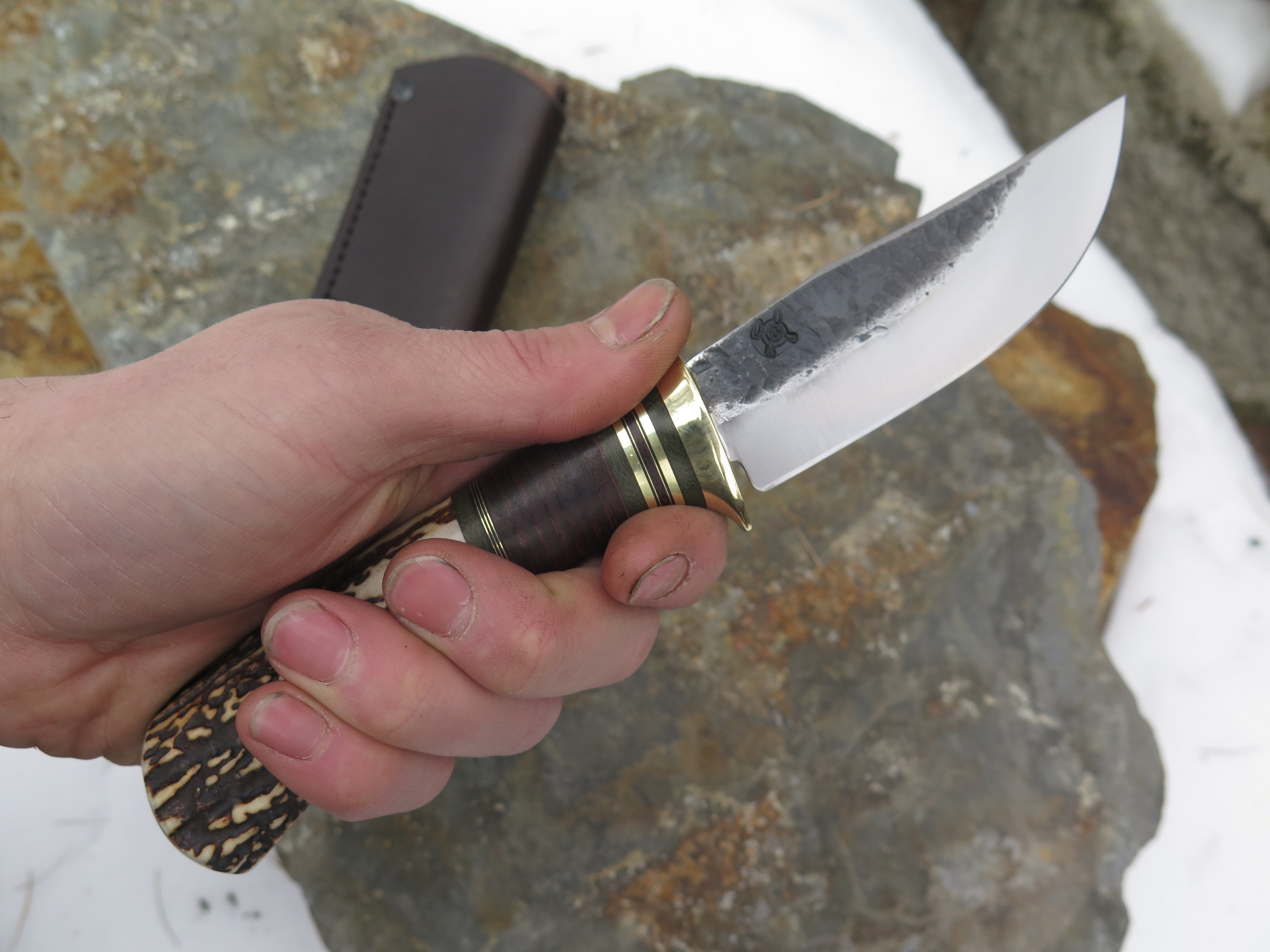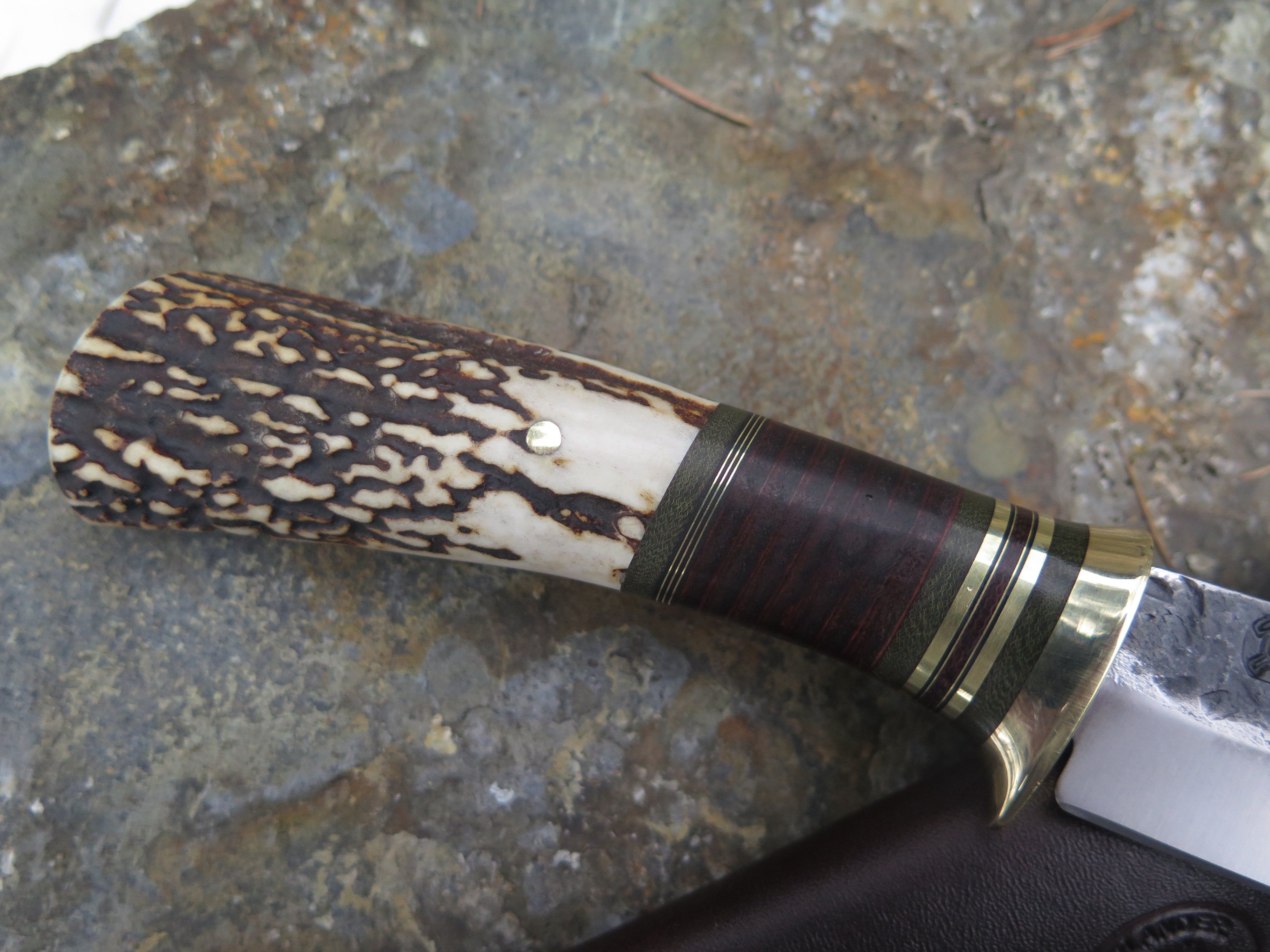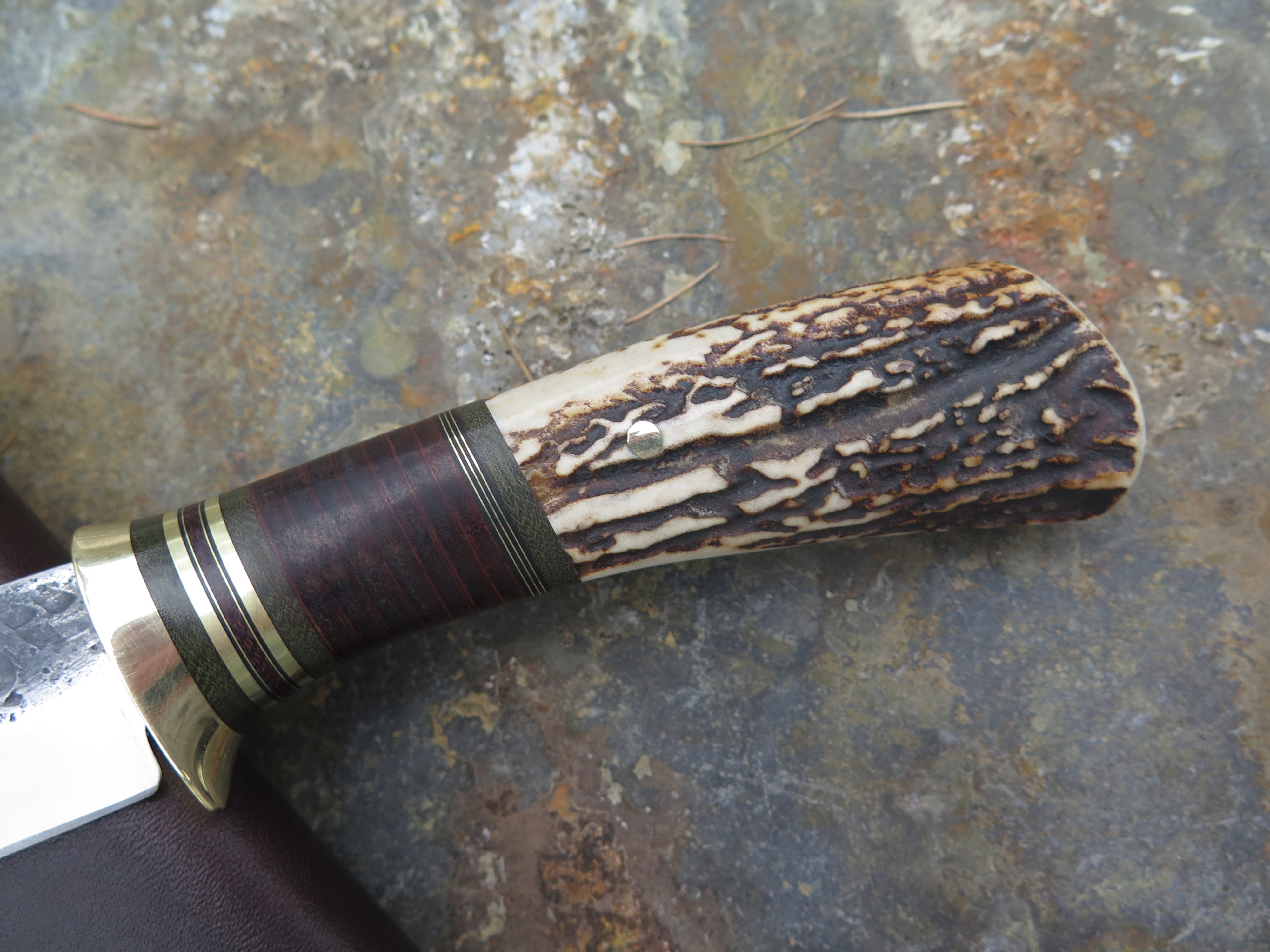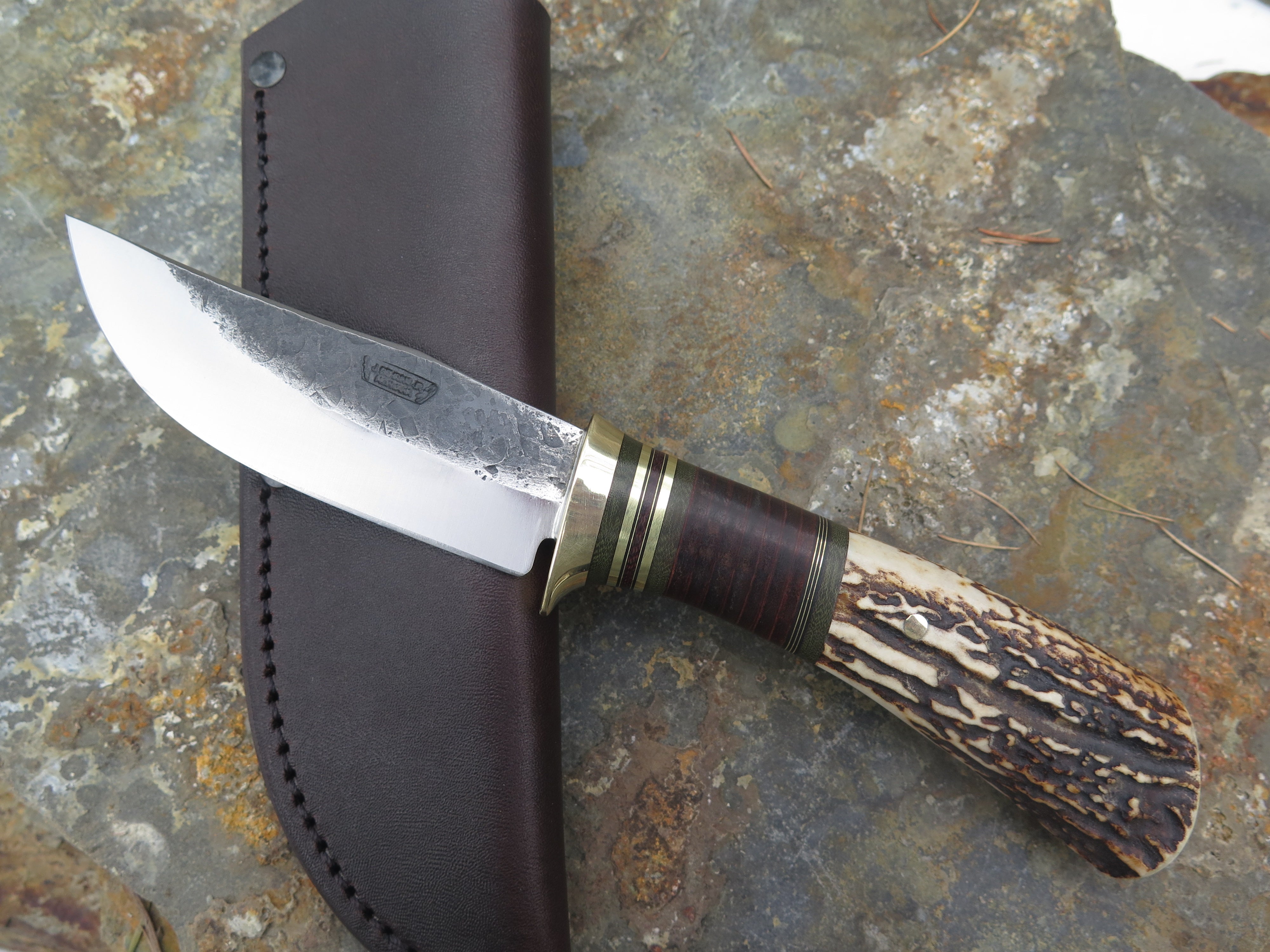 This new Hunter from Behring Made© is hand forged from 1/8" thick high carbon 01 tool steel and it measures 4" from tip to guard with a razor sharp hollow grind and our hammermark finish. The brass guard is soldered in place above black fiber, brass, green and brown micarta and horsehide leather spacers as well as a premium sambar stag handle that pinned with brass. The overall length measures 8 3/4" and it comes in a classic leather brown pouch sheath.