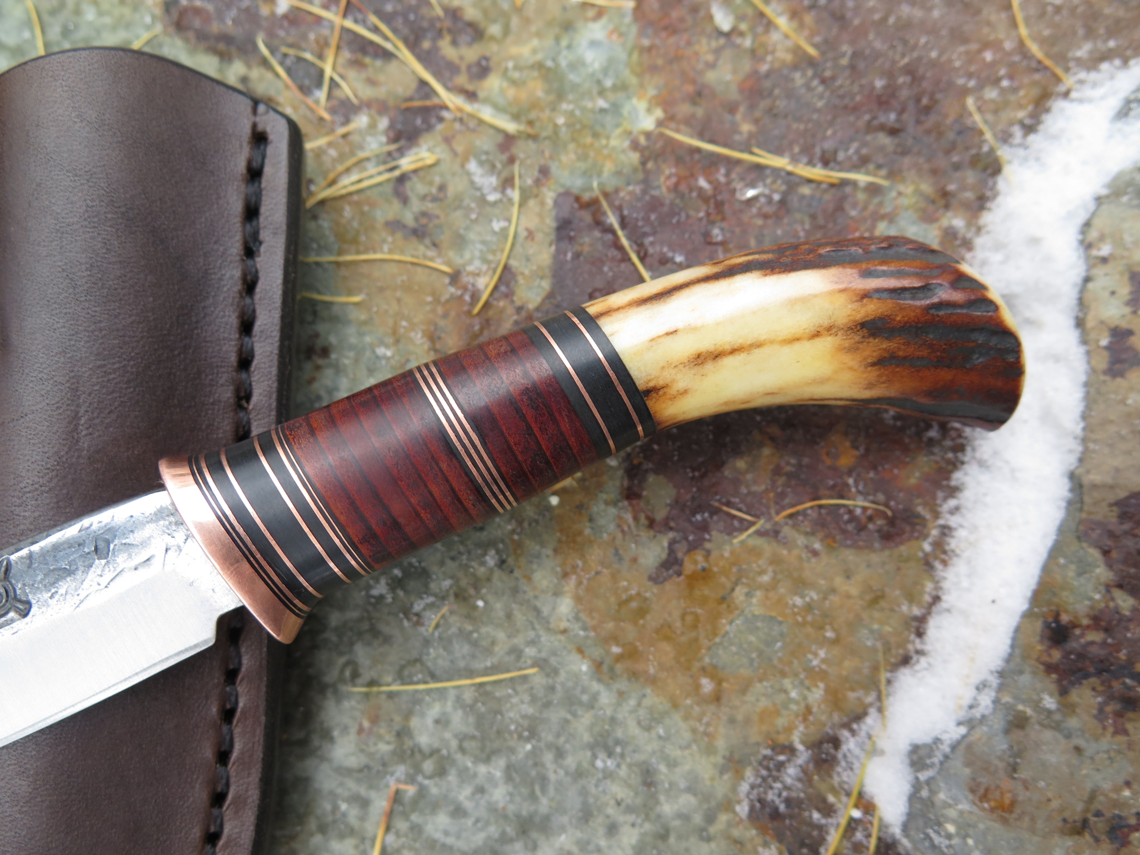 This handsome new Pocket Knife from Behring Made© is hand forged from 1/8" thick high carbon 01 tool steel and measures 3 1/4" from tip to guard with a razor sharp hollow grind and our hammermark finish. The copper guard is soldered in place above black fiber, copper and horsehide leather spacers as well as a beautiful sambar stag butt that is pinned through the tang. The overall length measures 6 3/4" and it comes in the shown spring clip pocket sheath, though substitutions are available upon request.