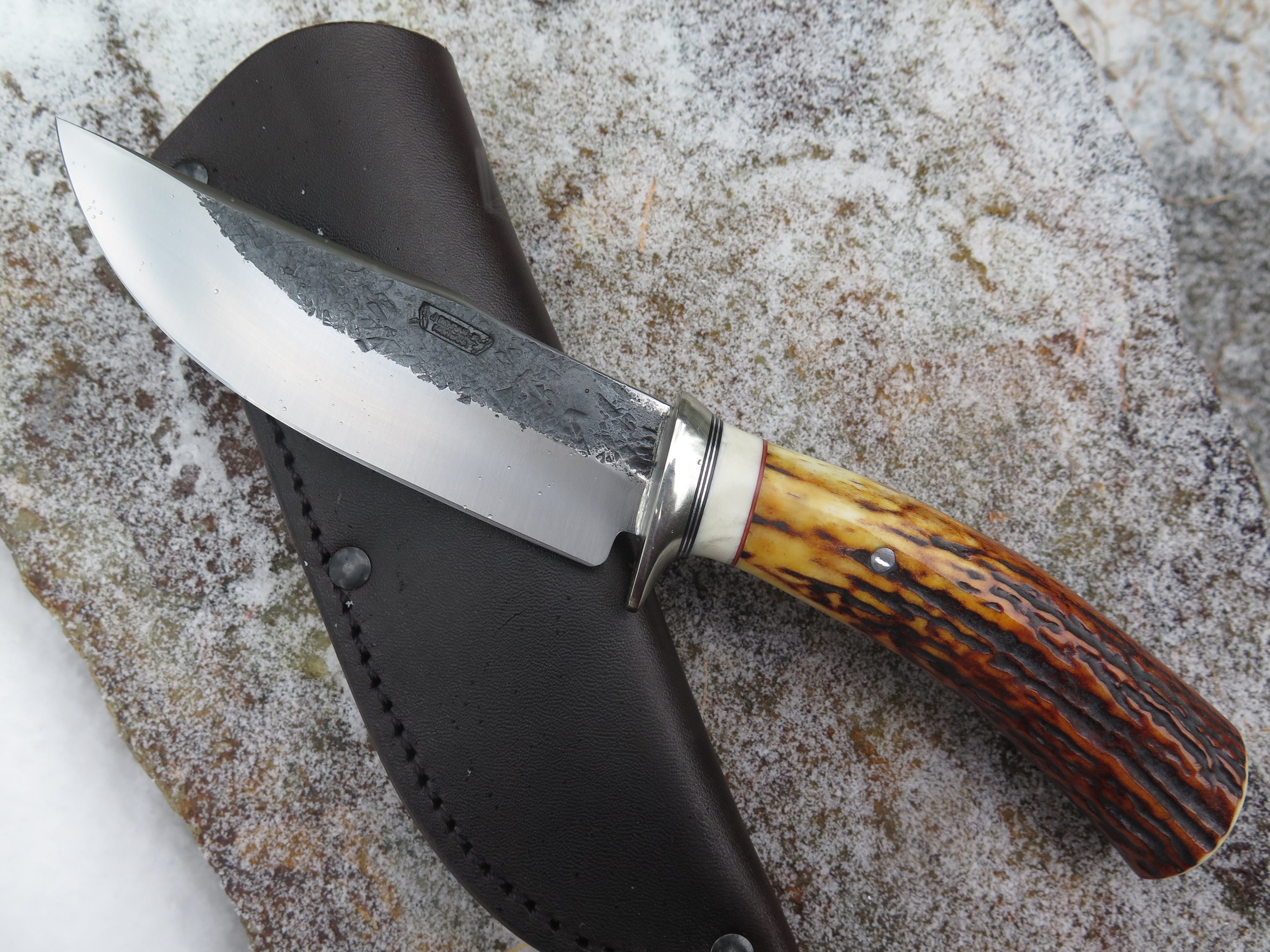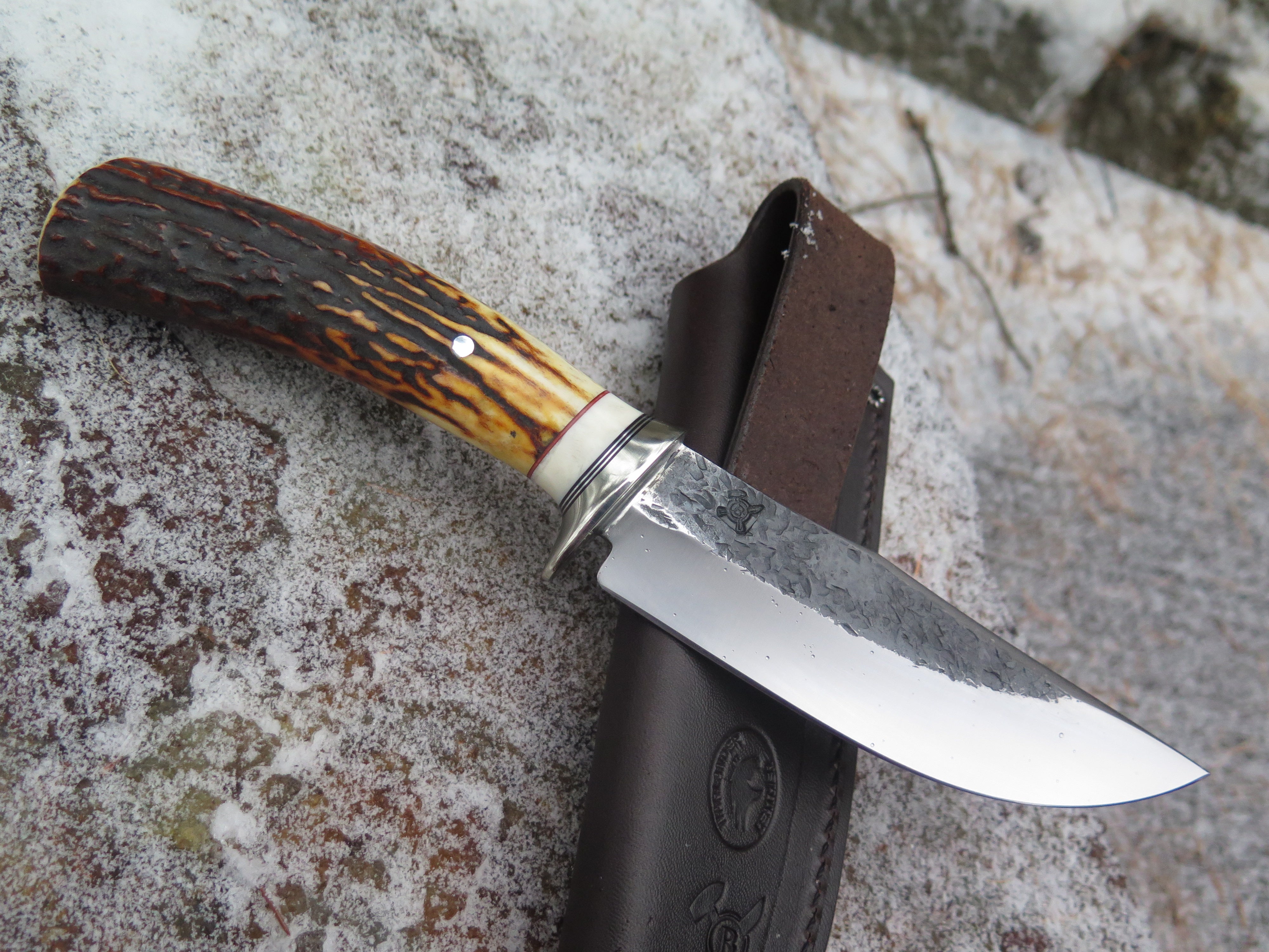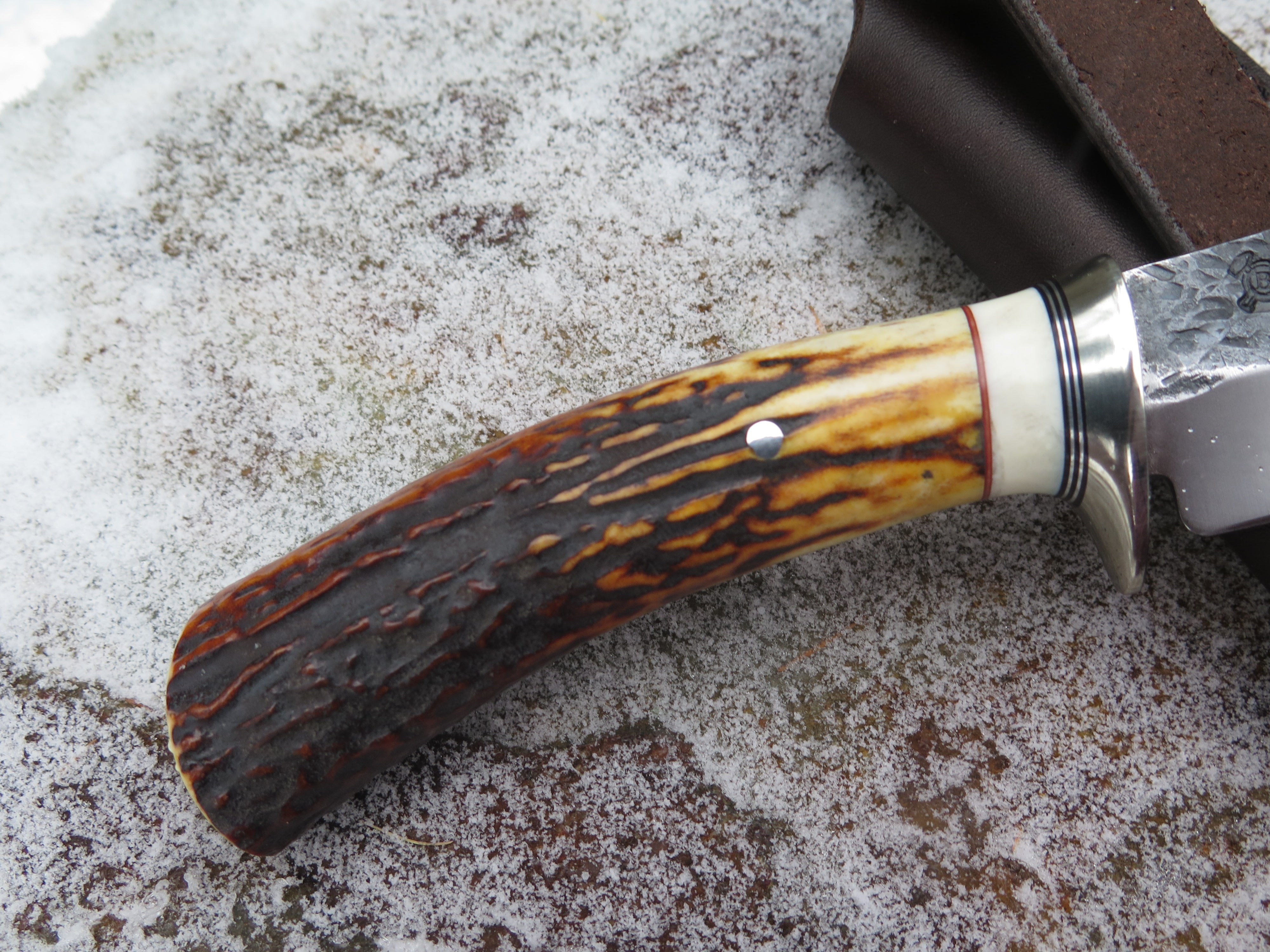 This incredible new Hunter from Behring Made© is hand forged from 3/16" thick high carbon 01 tool steel and it measures 5" from tip to guard with a razor sharp hollow grind and our hammermark finish. The nickel silver guard is soldered in place above black and maroon fiber, aluminum and mammoth ivory spacers. The premium sambar stag handle is pinned through the tang with aluminum and overall it measures 9 3/4". This one comes in a classic leather belt pouch sheath.
