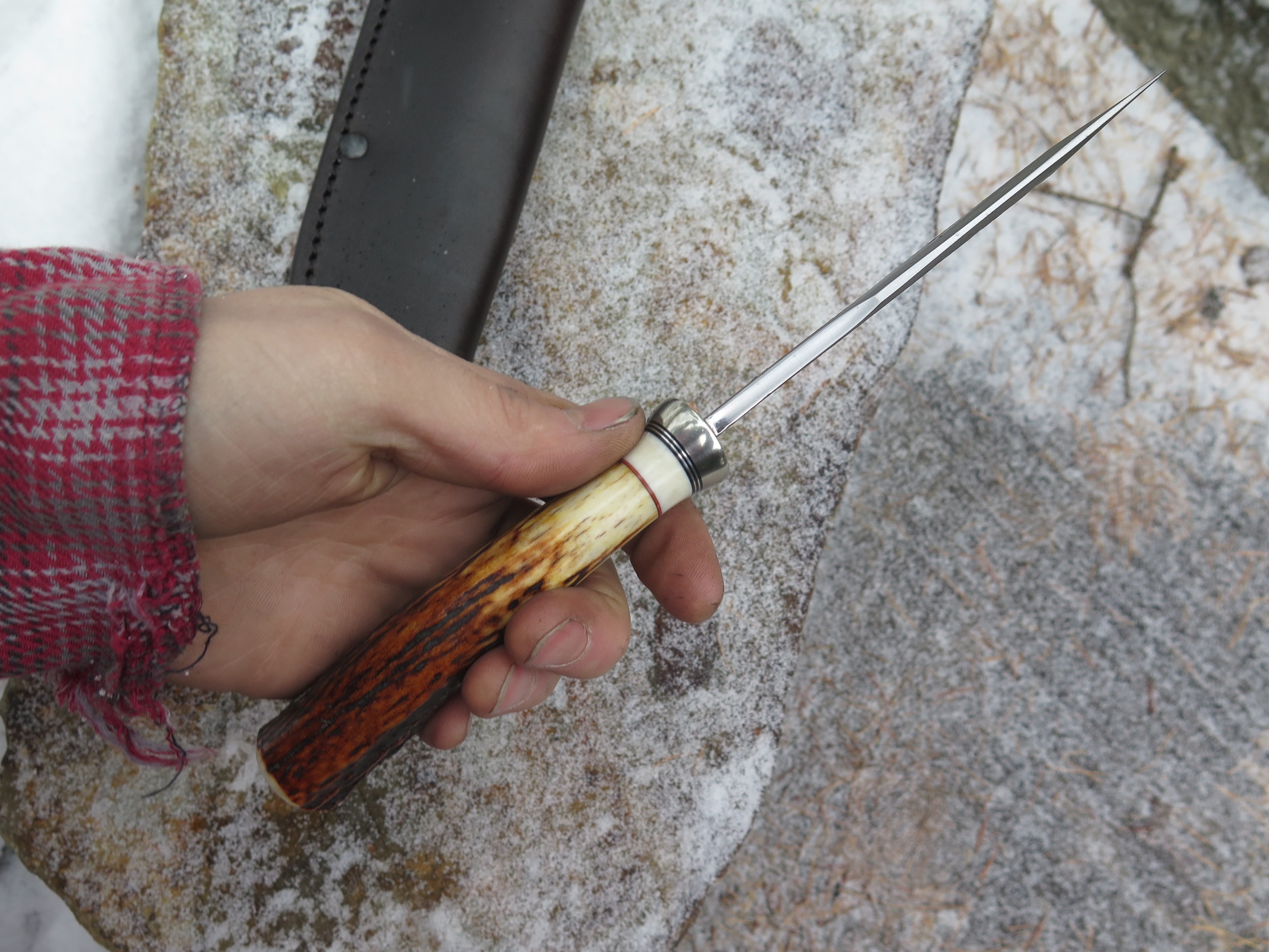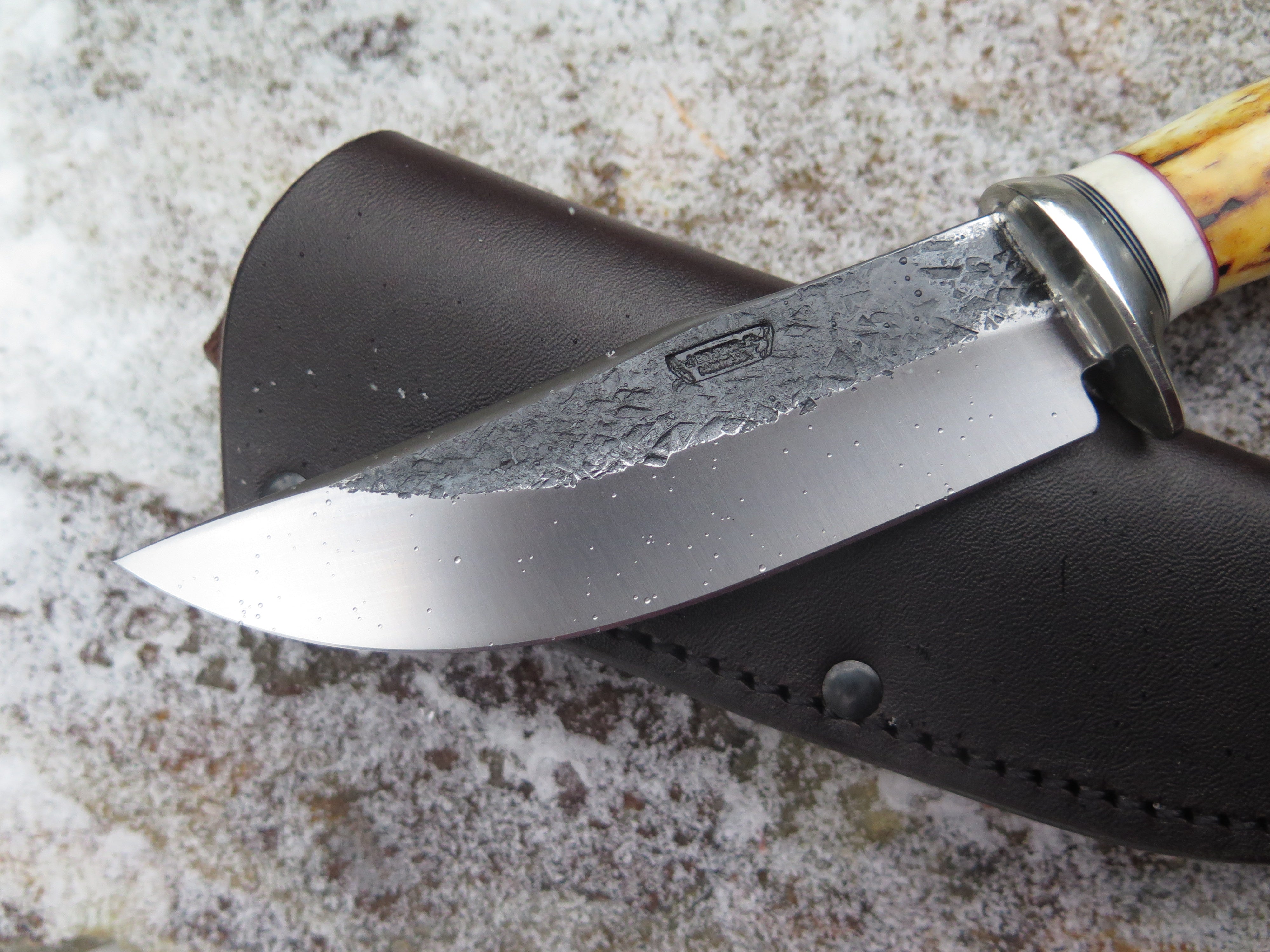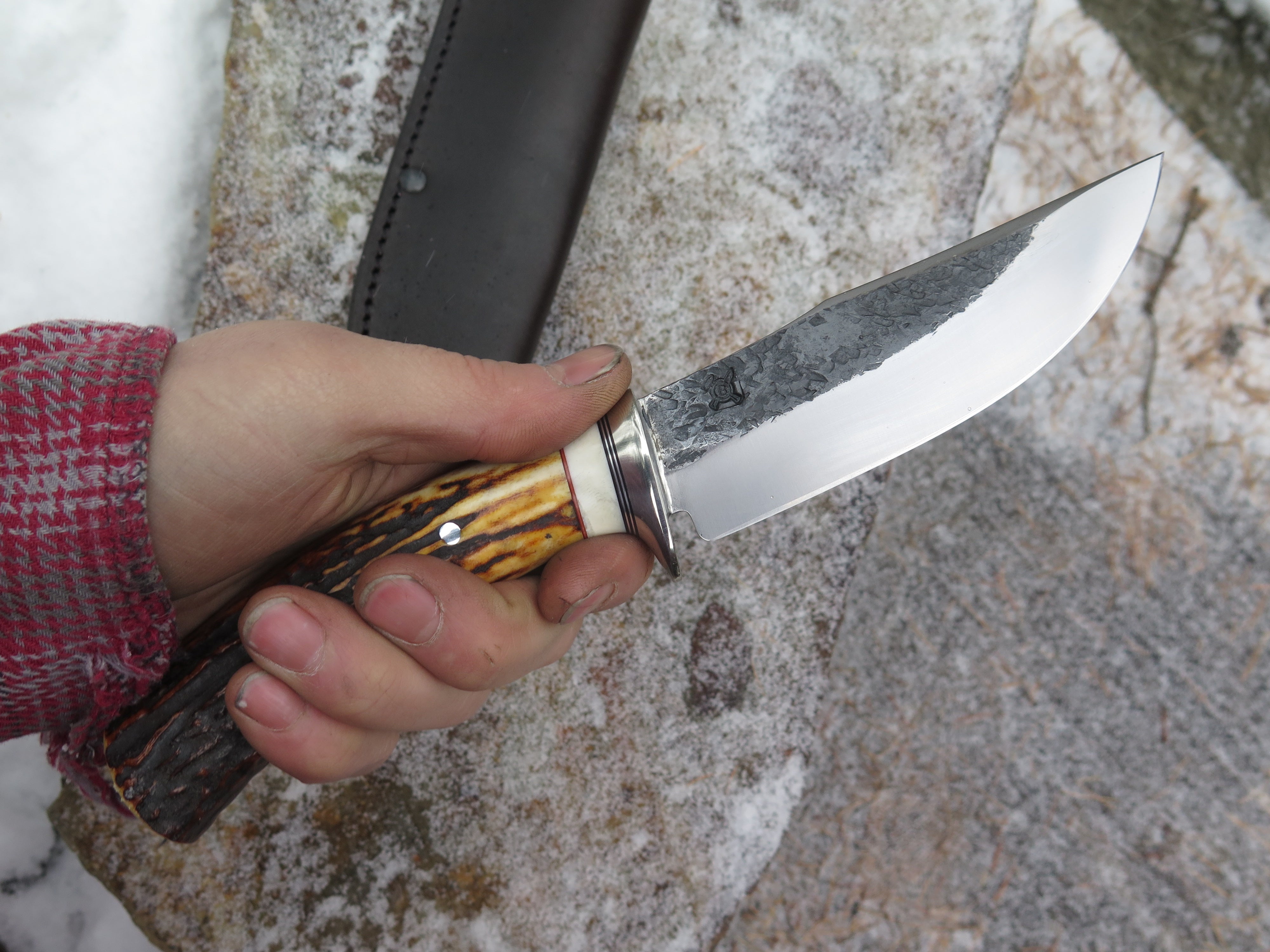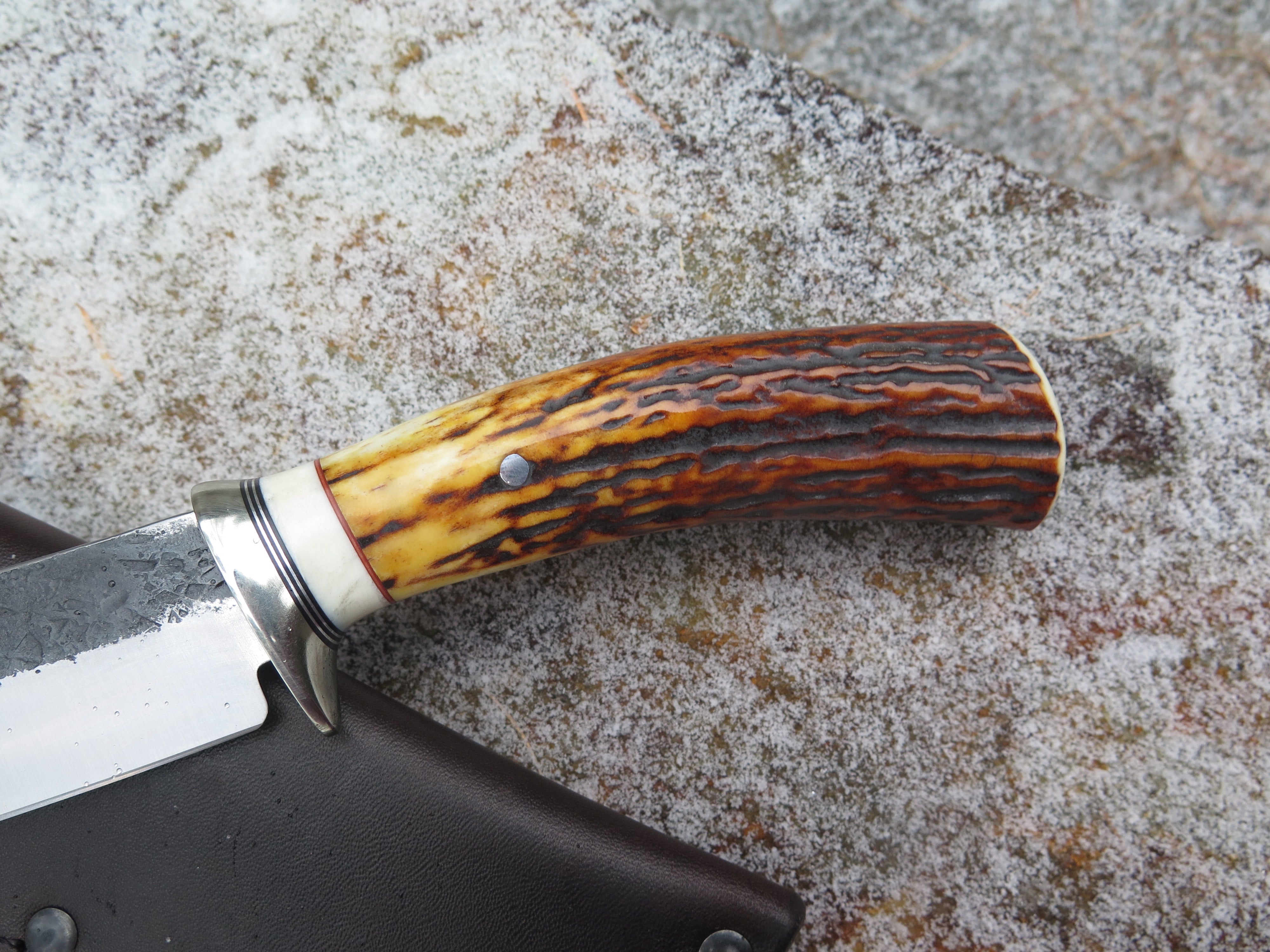 This incredible new Hunter from Behring Made© is hand forged from 3/16" thick high carbon 01 tool steel and it measures 5" from tip to guard with a razor sharp hollow grind and our hammermark finish. The nickel silver guard is soldered in place above black and maroon fiber, aluminum and mammoth ivory spacers. The premium sambar stag handle is pinned through the tang with aluminum and overall it measures 9 3/4". This one comes in a classic leather belt pouch sheath.