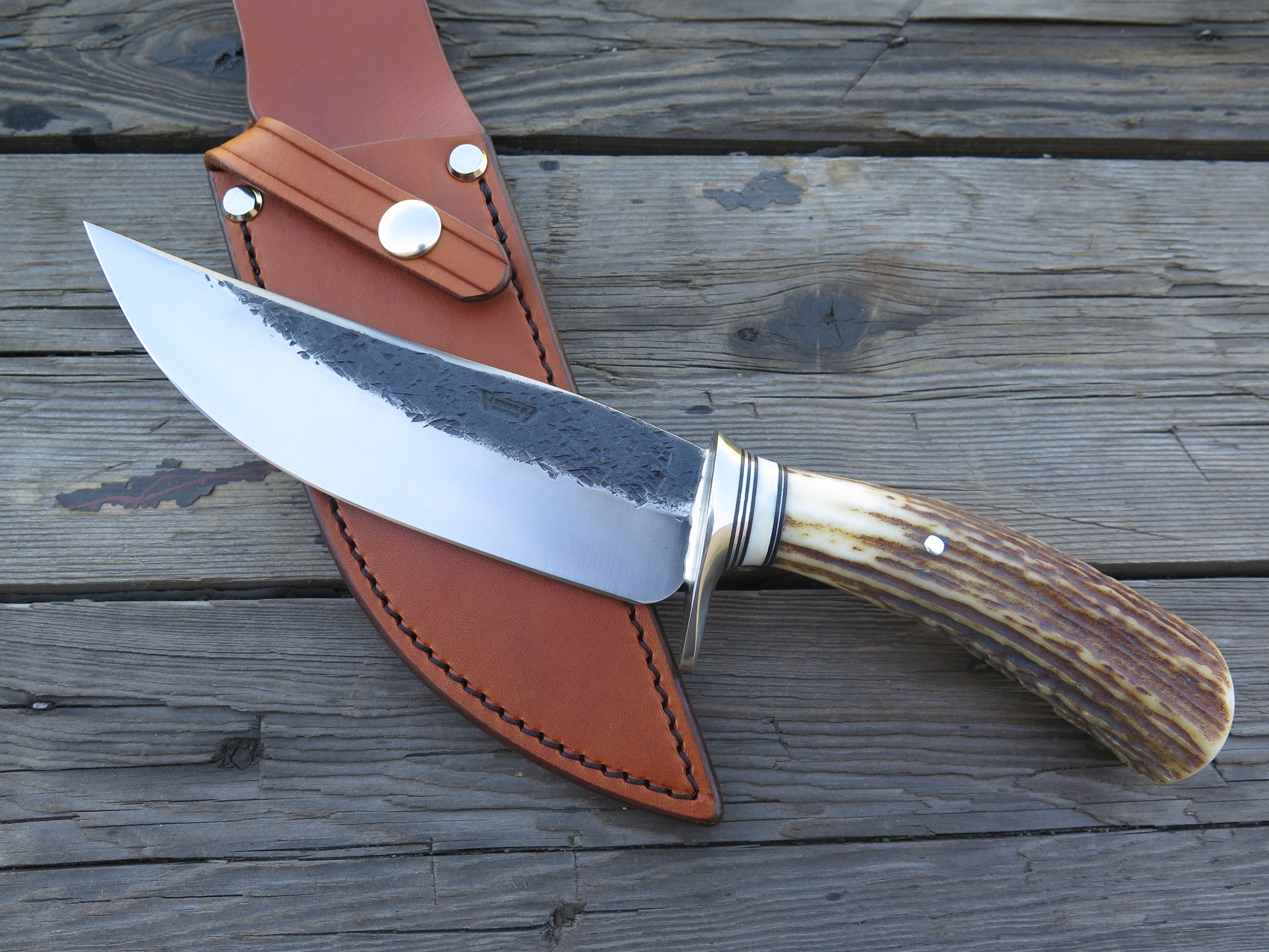 This incredible new Camp Knife from Behring Made© is hand forged from 1/4" thick high carbon 01 tool steel and it measures 6 1/4" from tip to guard with a razor sharp hollow grind with our hammermark finish. The nickel silver guard is soldered in place above black fiber, aluminum and premium fossil walrus ivory spacers as well as a remarkable premium sambar stag handle that's pinned through the tang with aluminum. The overall length measures 11 1/2" and it will come in a custom sheath from Warlander Leather.