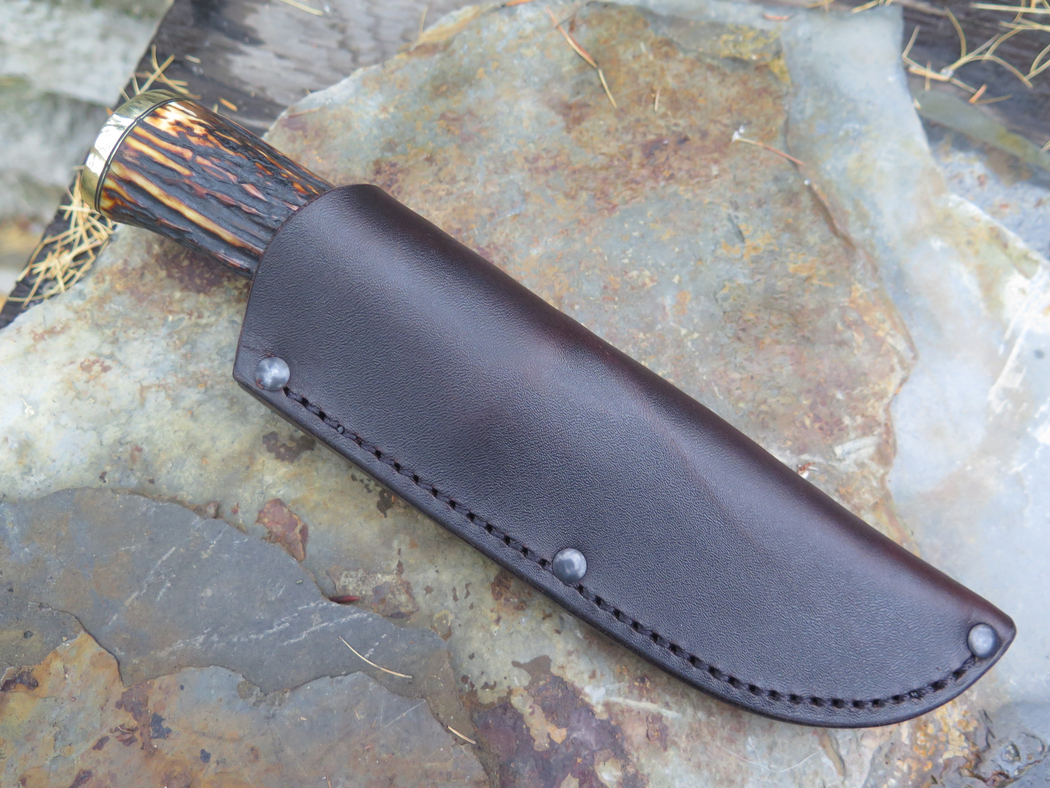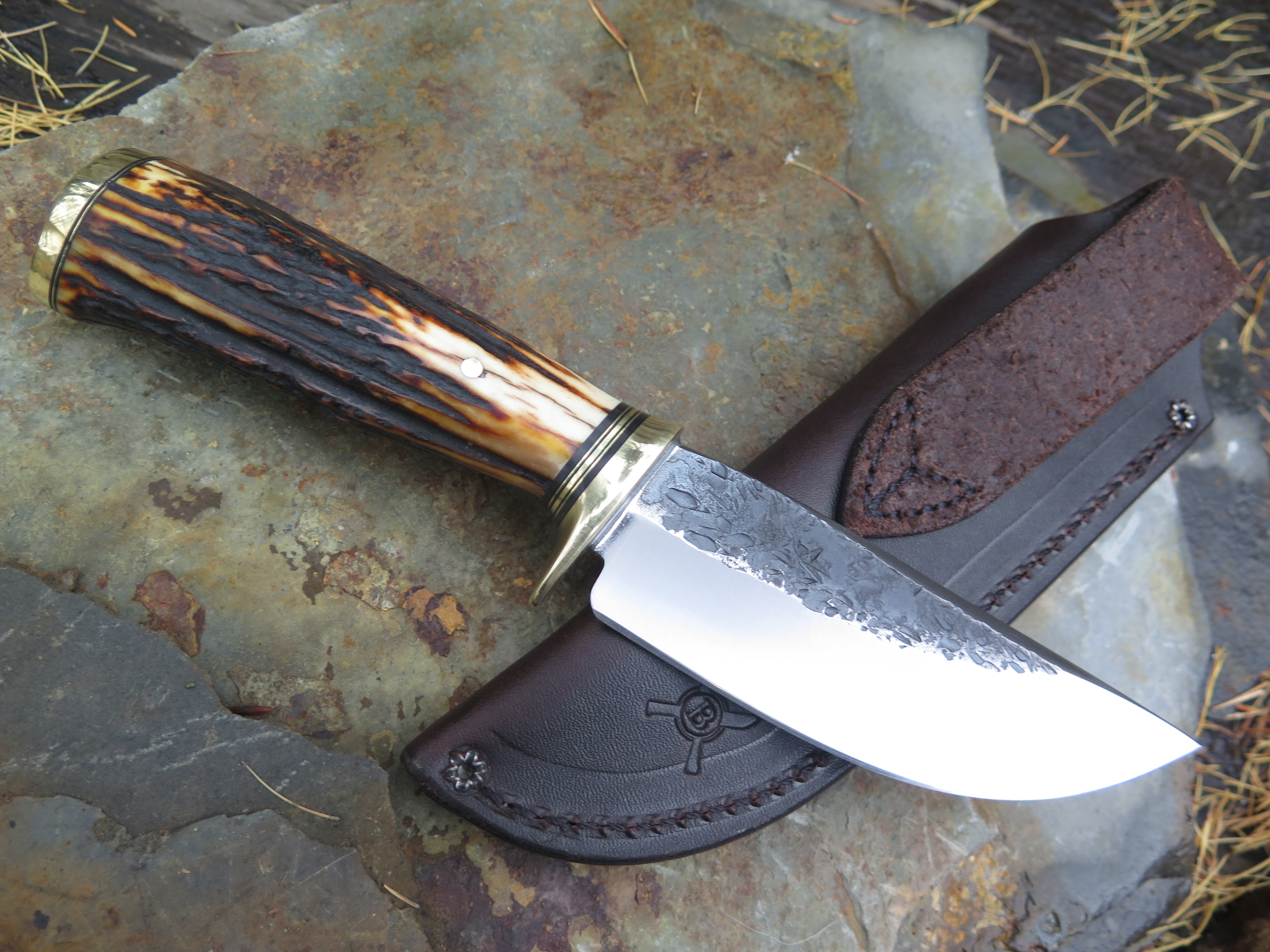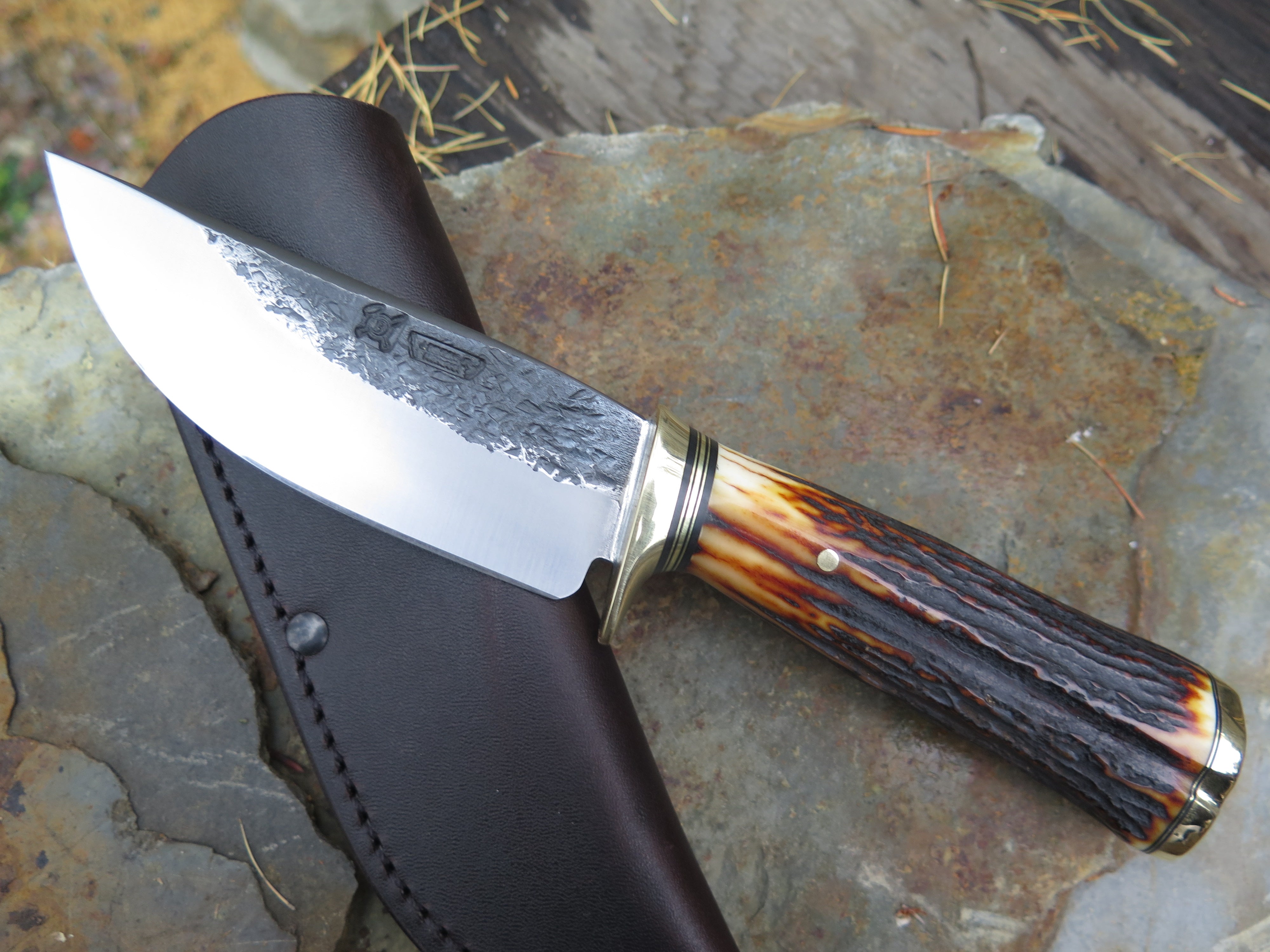 This incredible new Hunter from Behring Made© is hand forged from 3/16" thick high carbon 01 tool steel and it measures 4 3/4" from tip to guard with a razor sharp hollow grind and our hammermark finish. The brass guard is soldered in place above black fiber and brass spacers with a premium sambar stag handle that's both pinned and capped with brass. The overall length measures 9 3/8" and it comes in a classic leather belt pouch sheath.