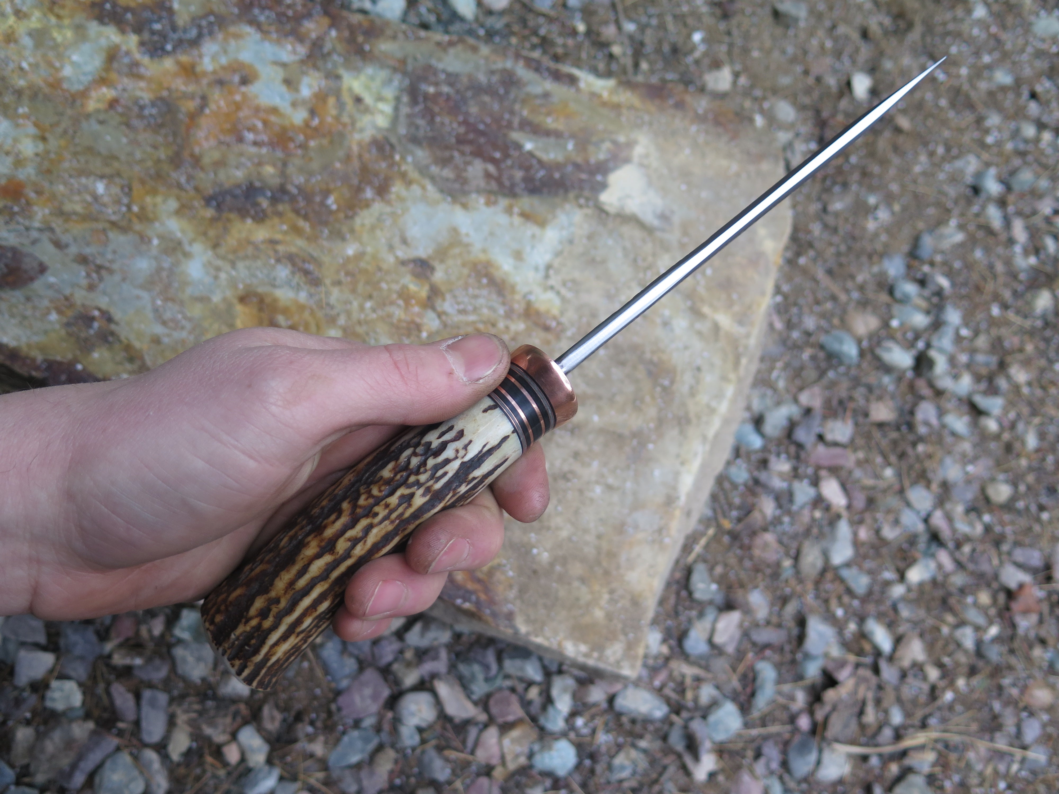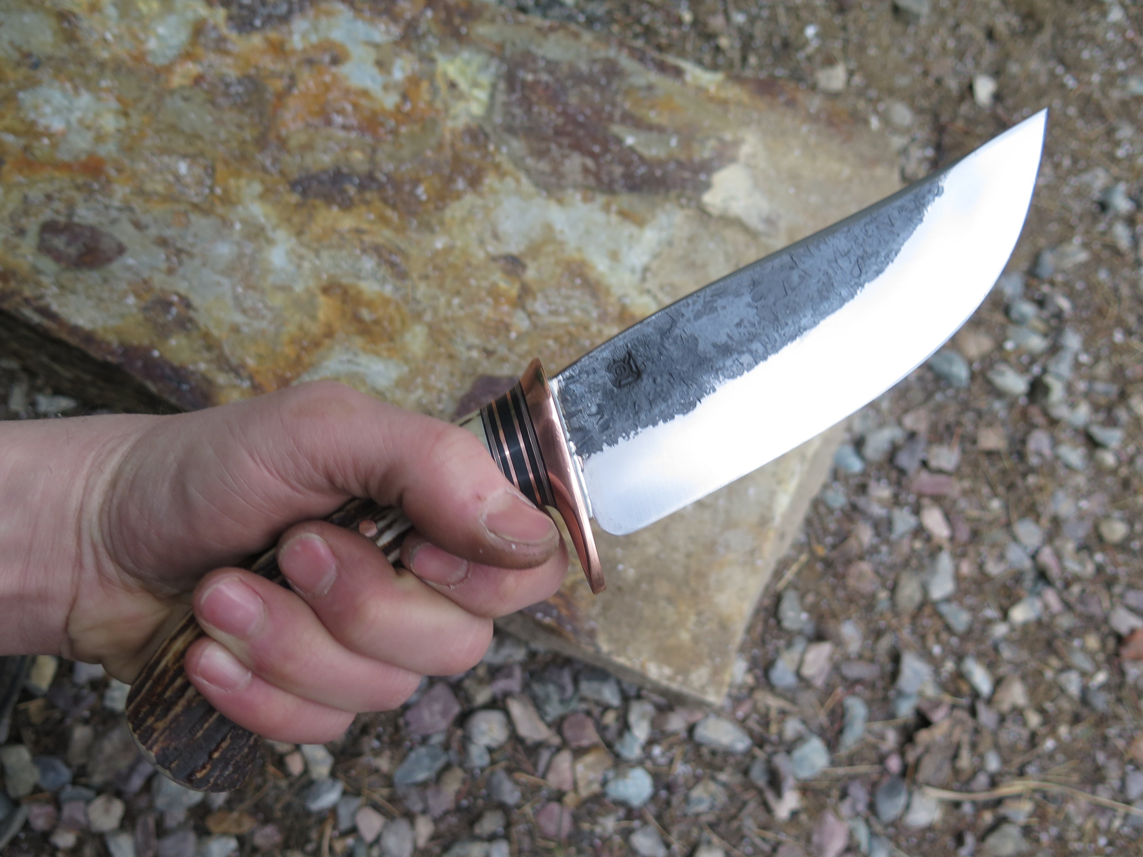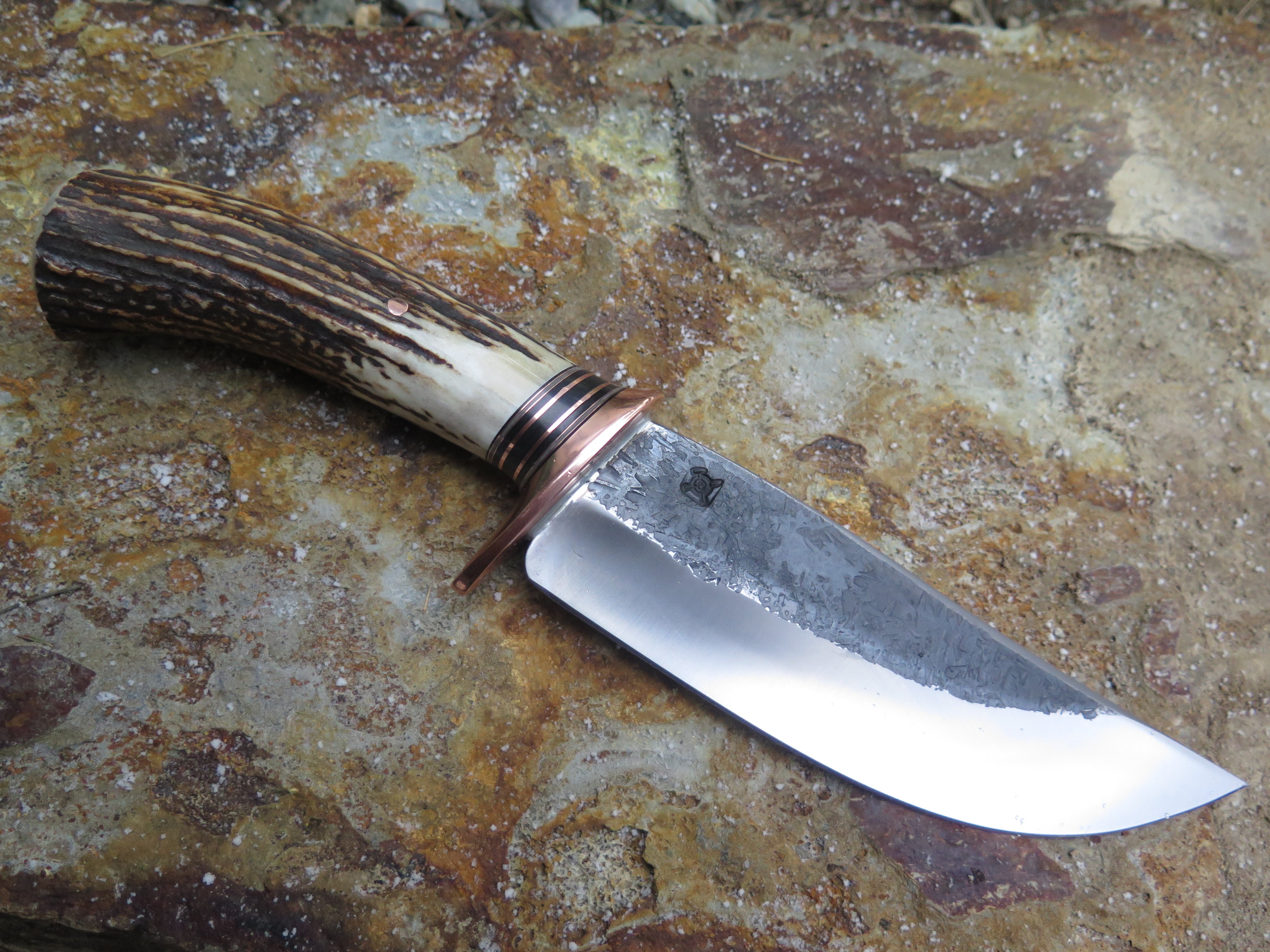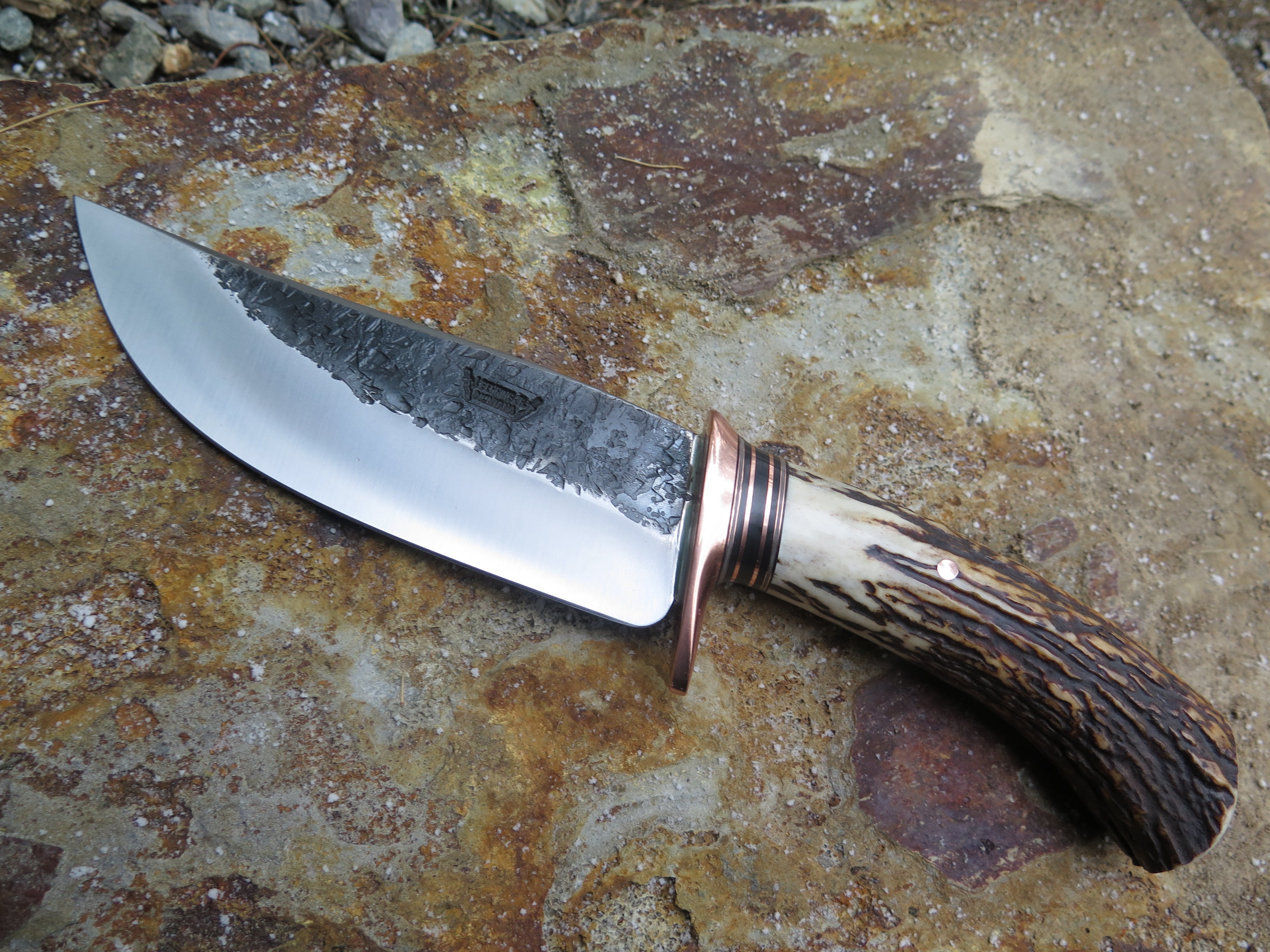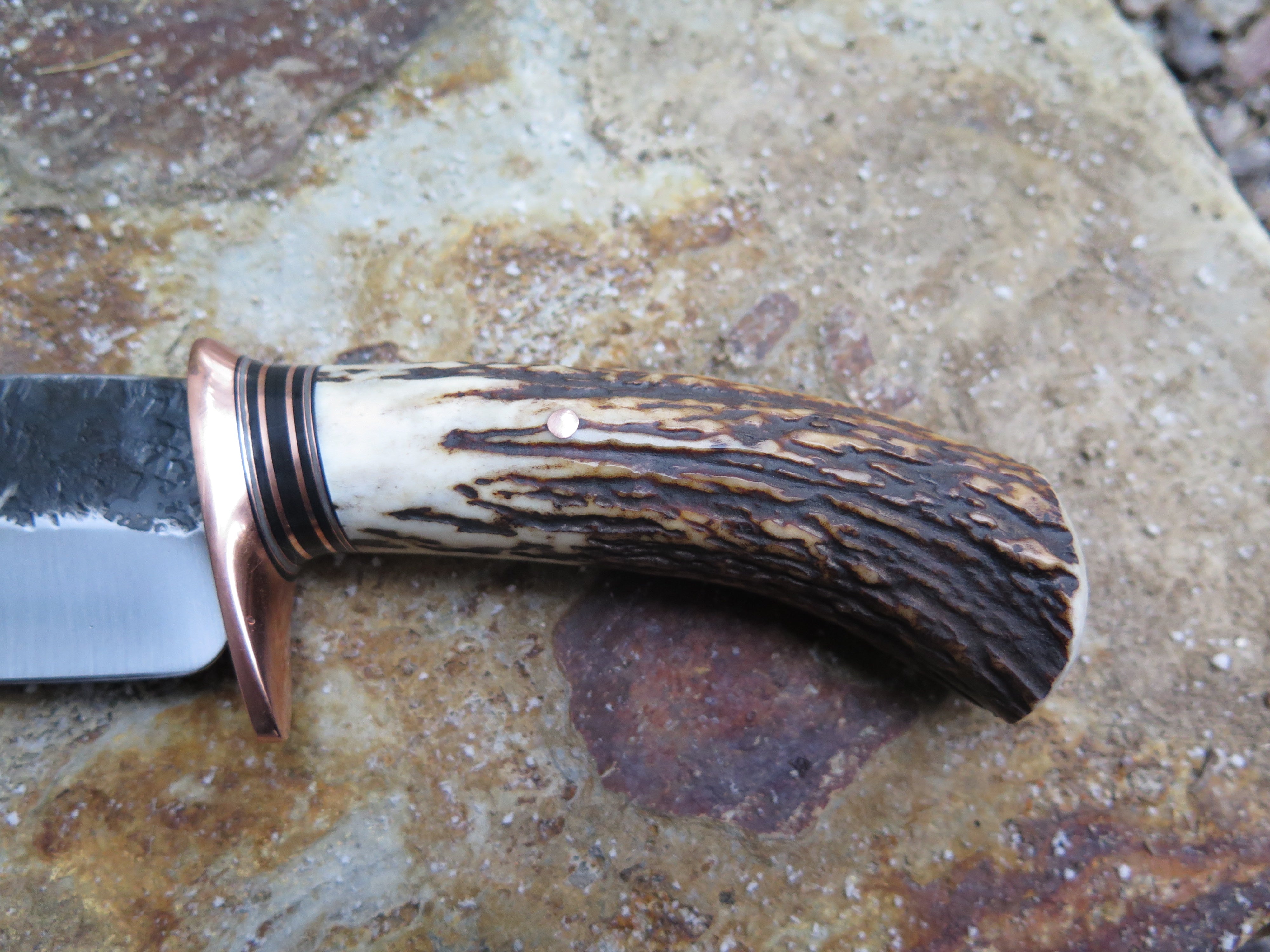 This beast of a Behring Made© Camp Knife is hand forged from 3/16" thick high carbon 01 tool steel and it measures 6" from tip to guard and 1 3/4" tall with a razor sharp hollow grind and our hammermark finish. The copper guard is soldered in place above black and grey fiber with copper spacers as well as a premium sambar stag handle that's pinned through the tang with copper. The overall length measures 10 3/4" and it will come in a custom sheath from Warlander Leather.