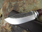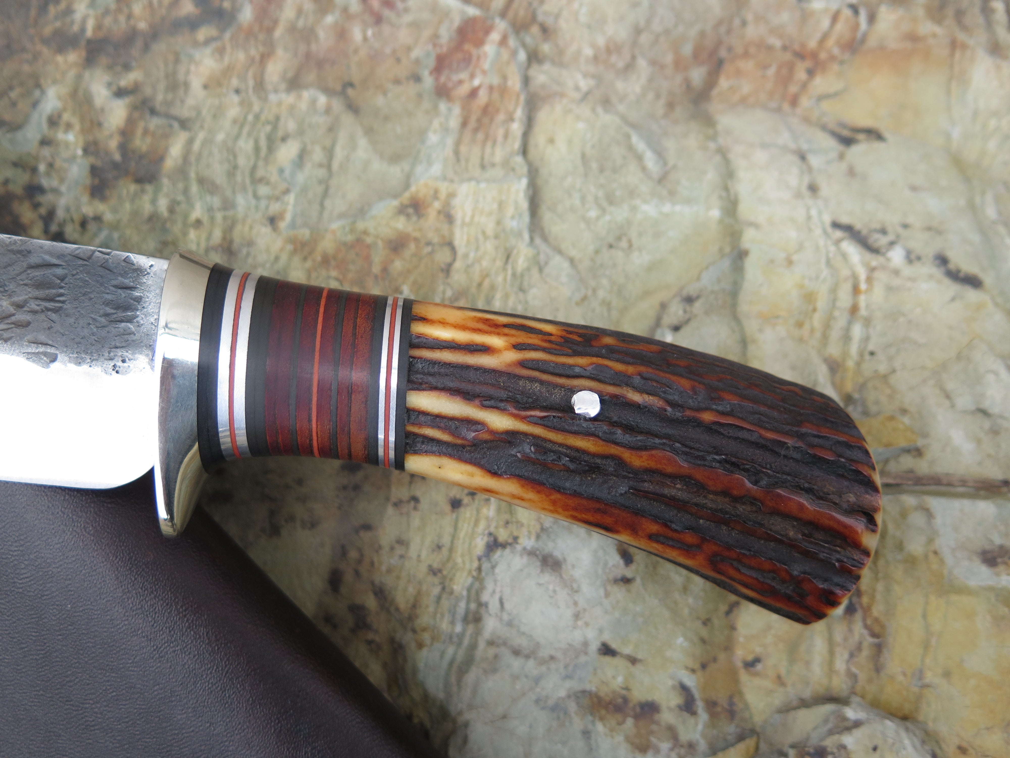 This incredible new one from Behring Made© is the Woodcraft, and we hand forged this fat boy from 3/16" thick high carbon 01 tool steel and it measures 5 1/2" from tip to guard with a razor sharp hollow grind and our hammermark finish. The nickel silver guard is soldered in place above black and maroon fiber, horsehide and aluminum spacers in addition to the grand slam handle made from premium sambar stag. Overall length measures 10" and it also comes in a Warlander Leather pouch sheath.