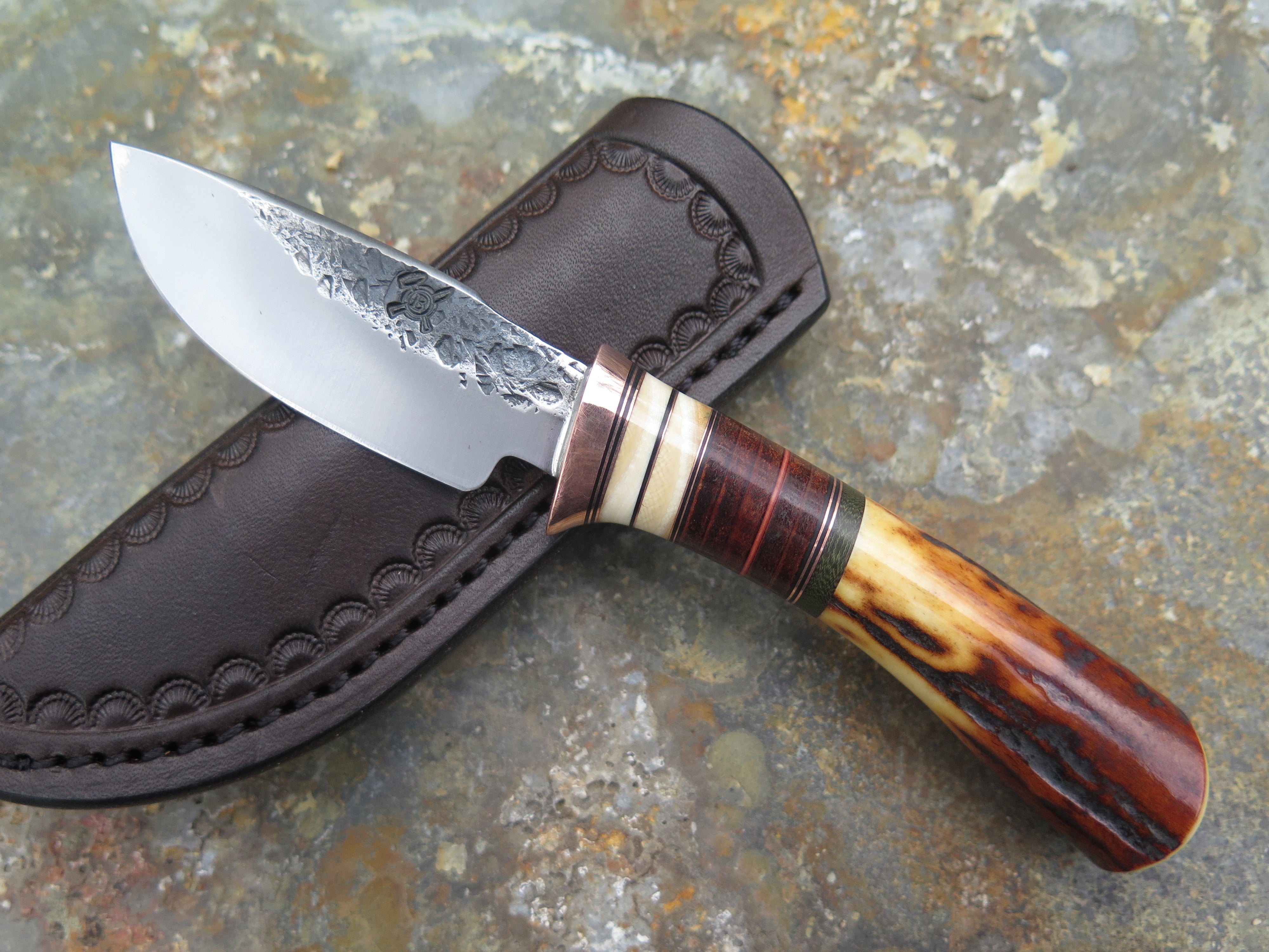 This beautiful new Pocket Alaskan from Behring Made© is hand forged out of 1/8" thick high carbon 01 tool steel and it measures 3" from tip to guard with a razor sharp hollow grind and our hammermark finish. The copper guard is soldered in place above black and maroon fiber, green micarta, horsehide, copper and two mammoth ivory spacers. The premium sambar stag brings the overall length to measure 6 5/8" and it comes in a spring clip sheath designed to ride in the right hand pocket of your jeans.