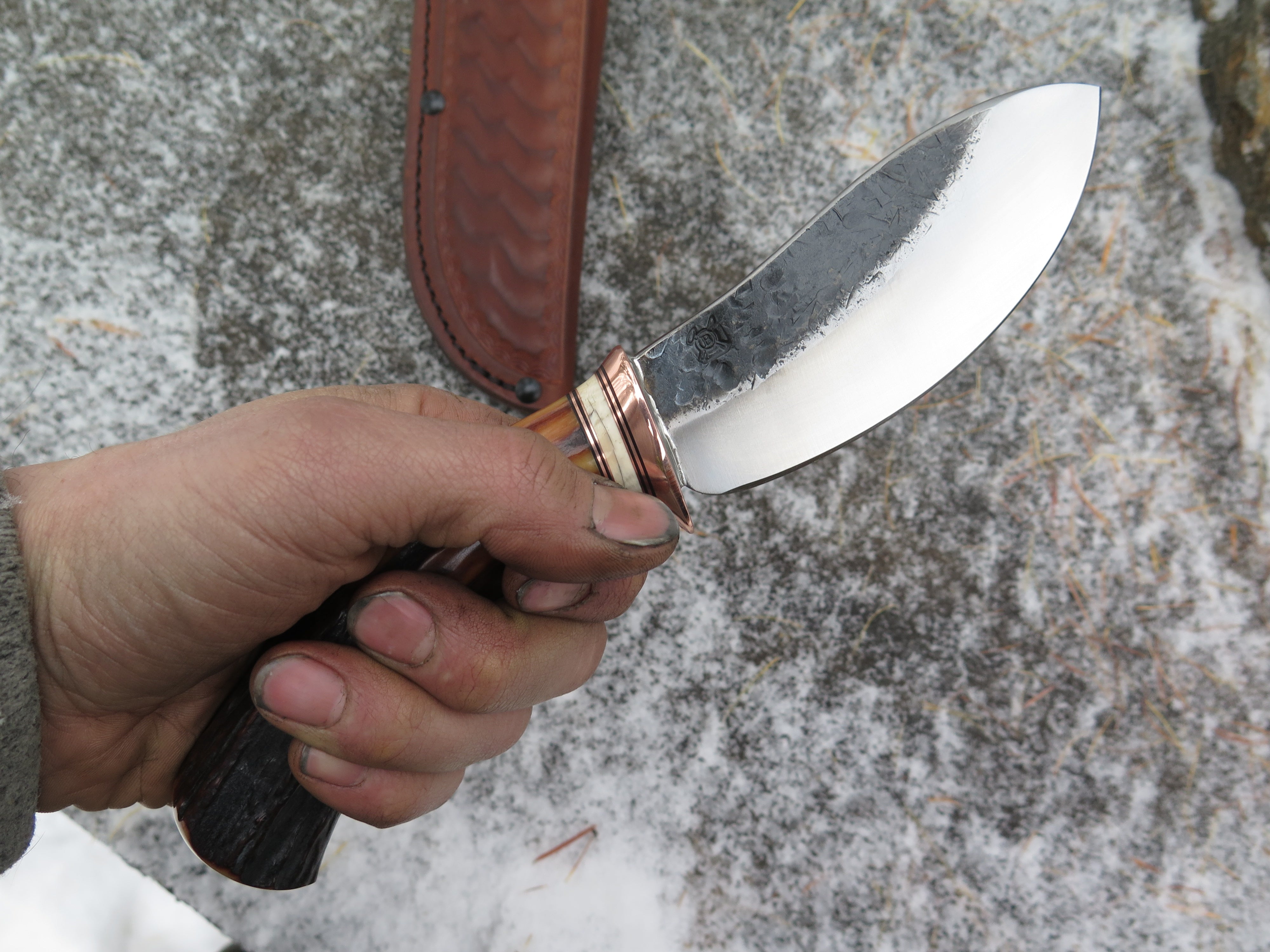This beautiful new Nessmuk from Behring Made© is hand forged from 3/16" thick high carbon 01 tool steel and measures 4 1/2" from tip to guard with a razor sharp hollow grind and our hammermark finish. The copper guard is soldered in place above black fiber, copper and ancient mammoth ivory spacers as well as a premium sambar stag handle that's pinned through the tang with copper. The overall length measures right under 8 3/4" and it comes in a premium leather belt pouch sheath, though substitutions are available upon request.