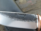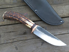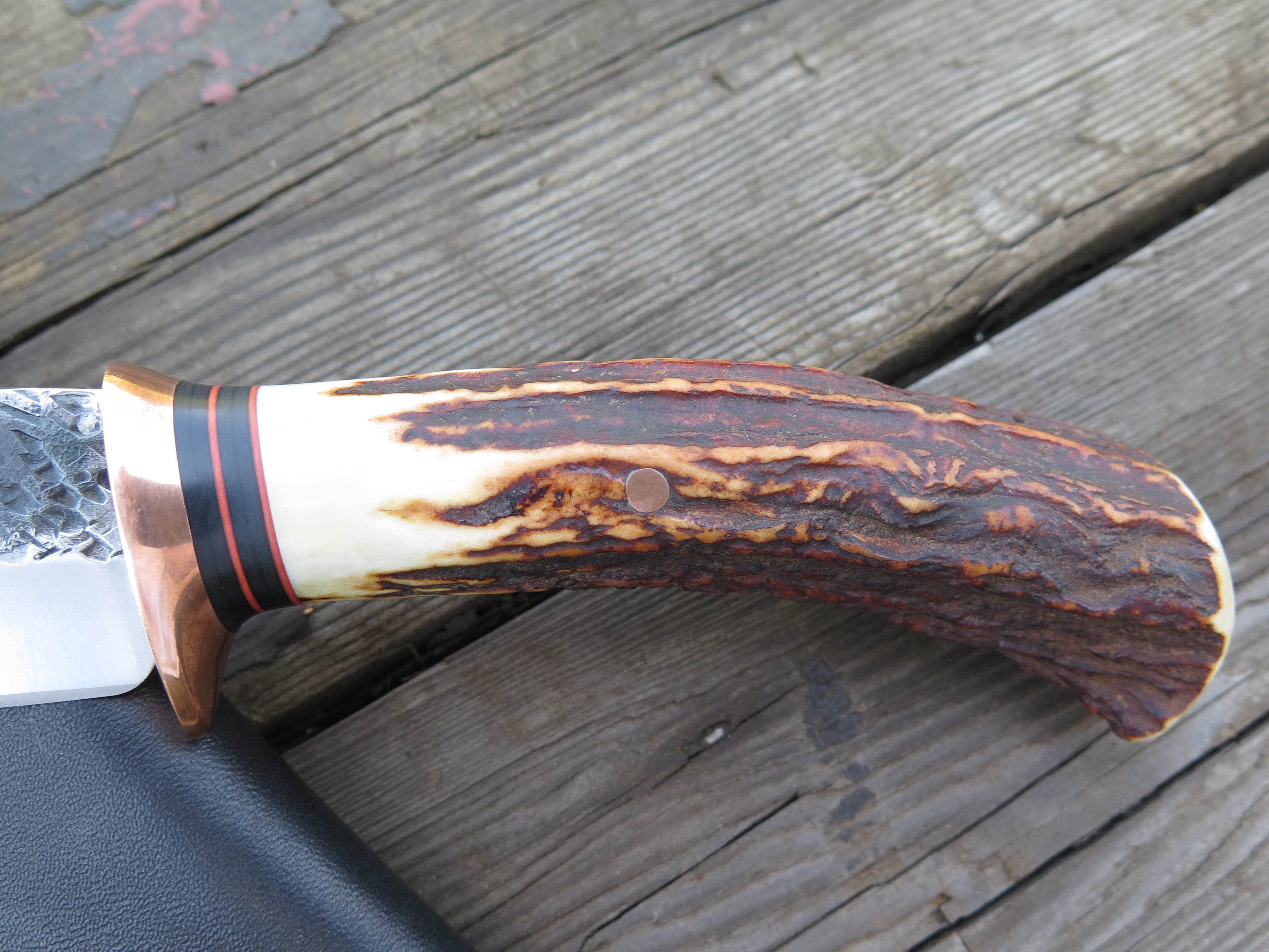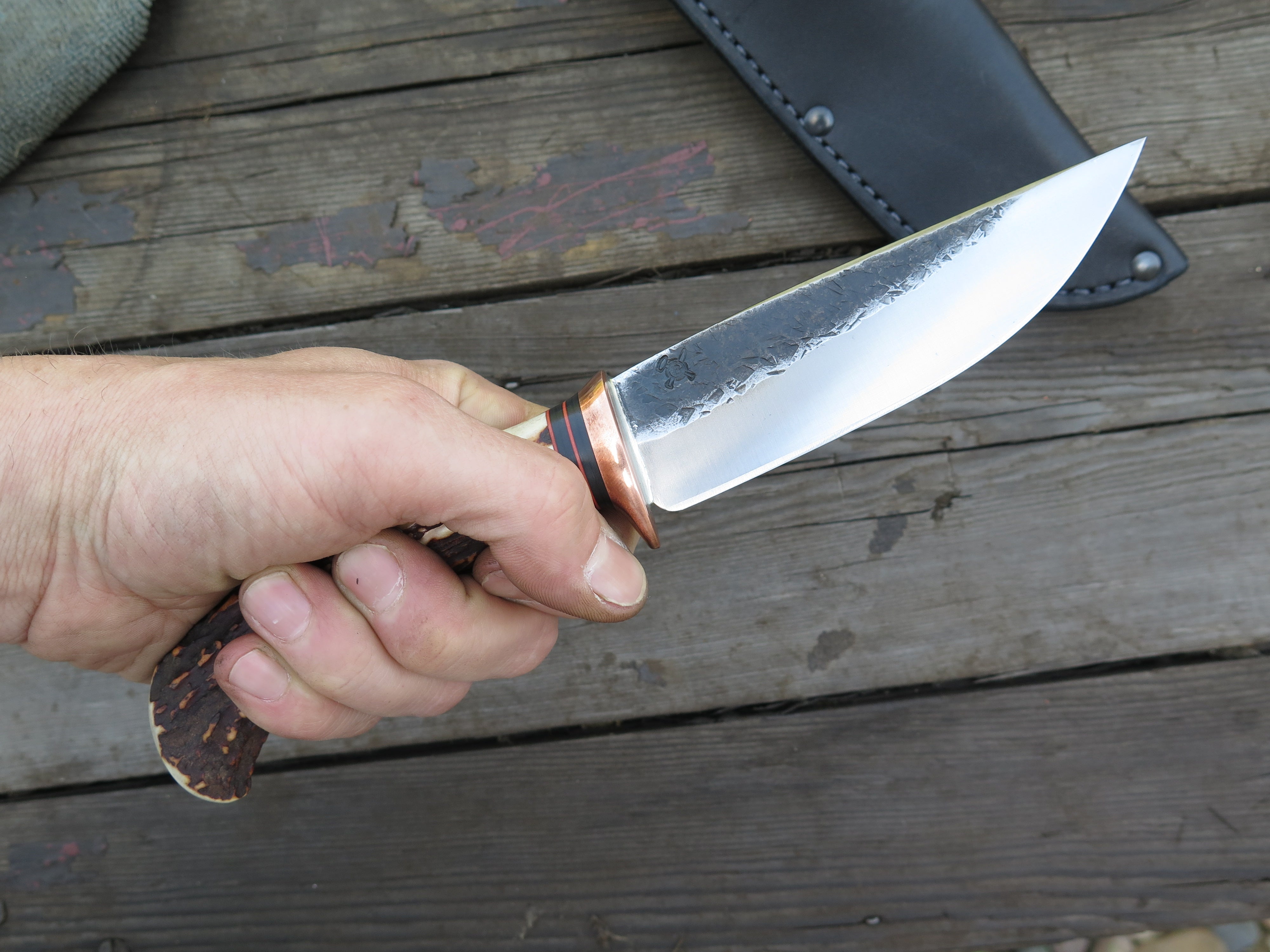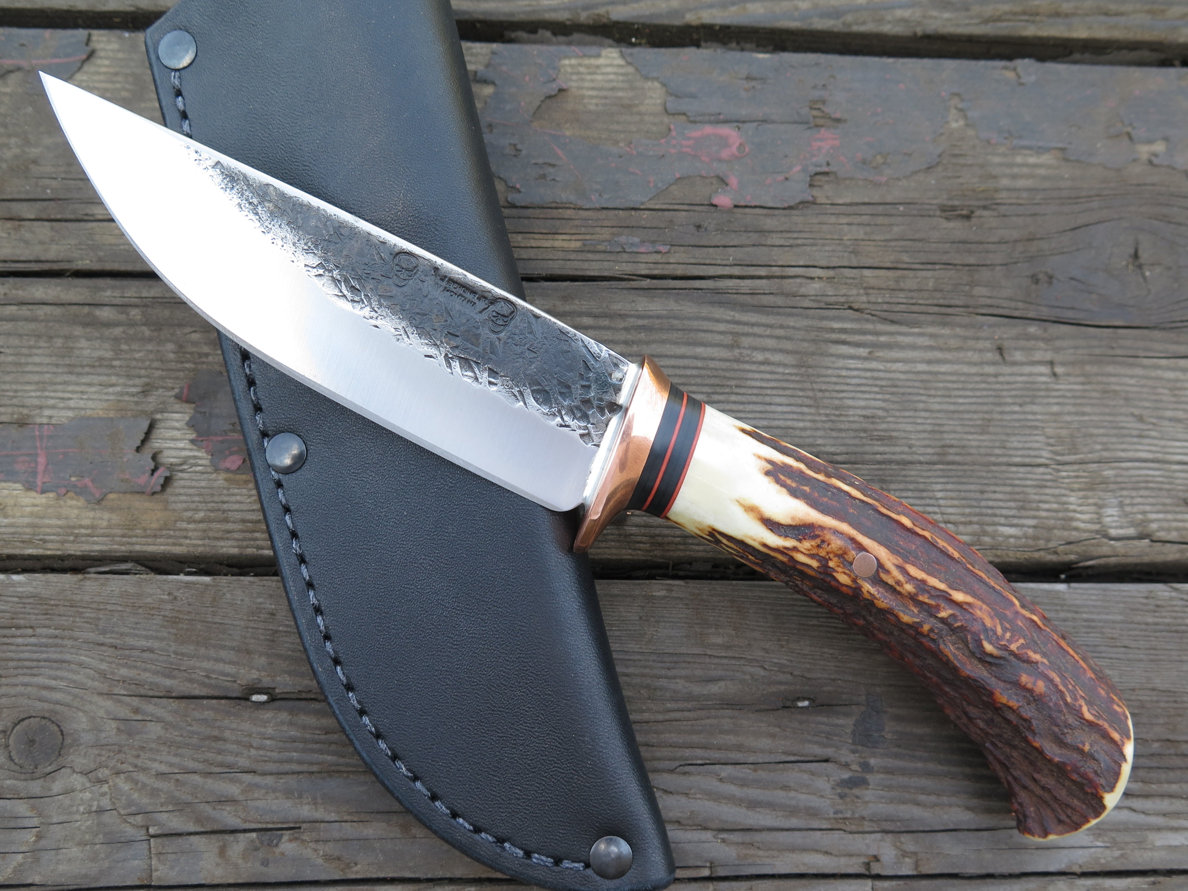 The Behring Made™ Mission Knife has been one of James' preferred shapes since he started out on his own in 2011. This latest one was hand forged from 3/16" thick high carbon 01 tool steel and it measures 4 3/4" from tip to guard with a razor sharp hollow grind and our hammermark finish, plus he stamped it with the double skulls for a bad ass touch. The copper guard is soldered in place above a simple black and maroon fiber spacer that provides a wonderful transition to this astounding sambar stag handle. The coloration is completely natural and the curvature provides a truly comfortable grip. We pinned that bad boy with copper and the overall length measures 9 1/2", plus it comes in a Warlander Leather pouch sheath. Guaranteed for life!
