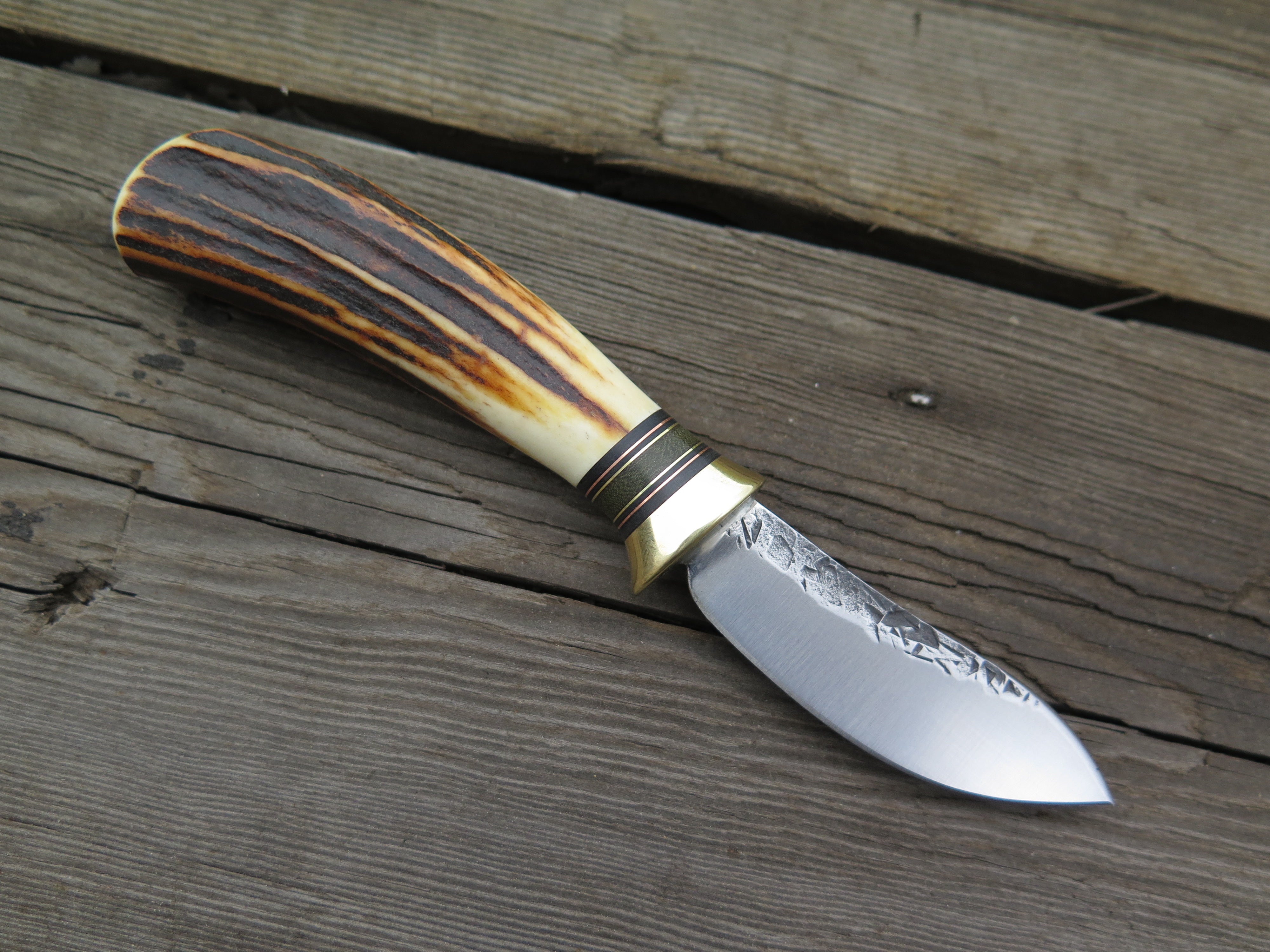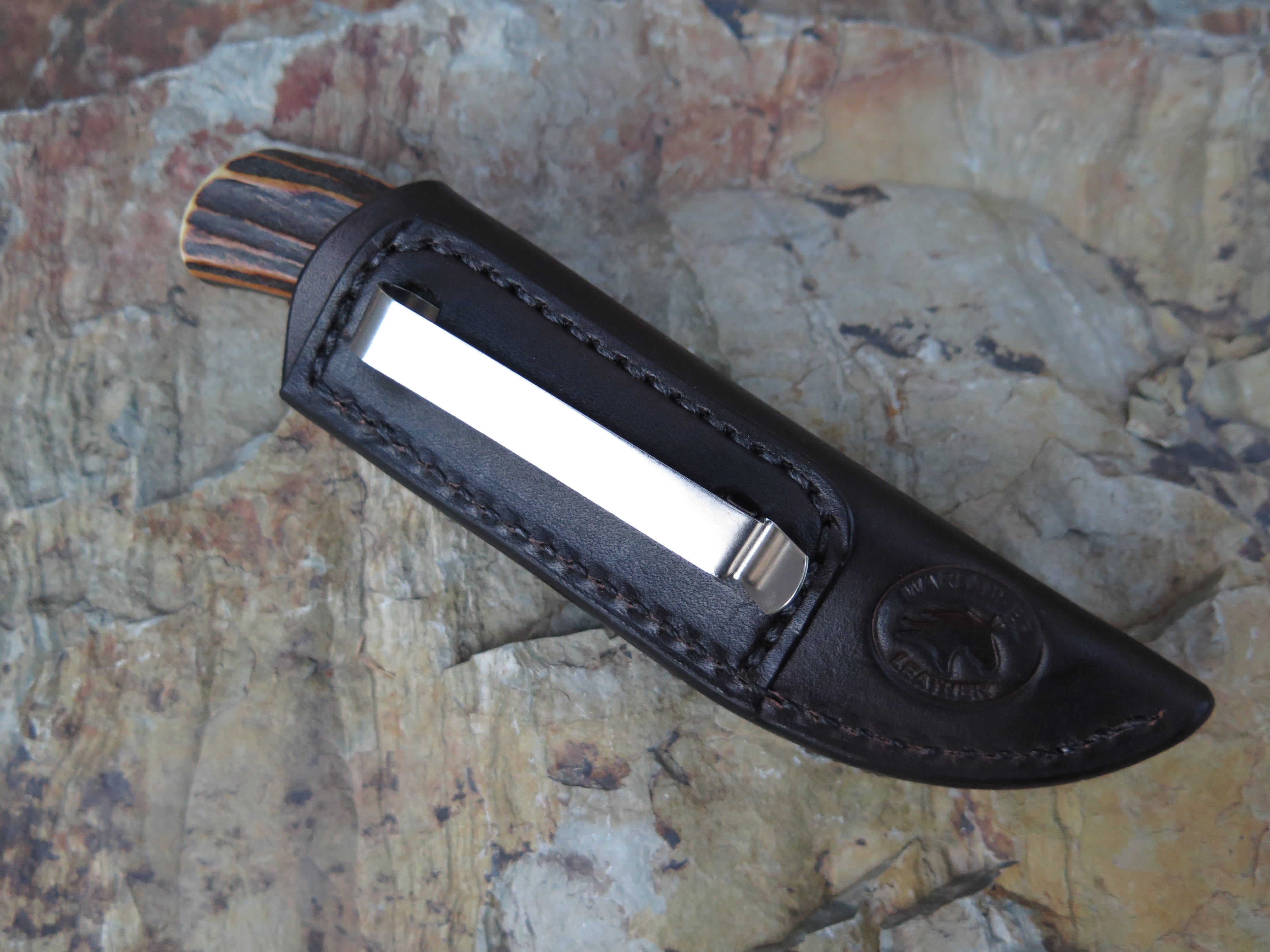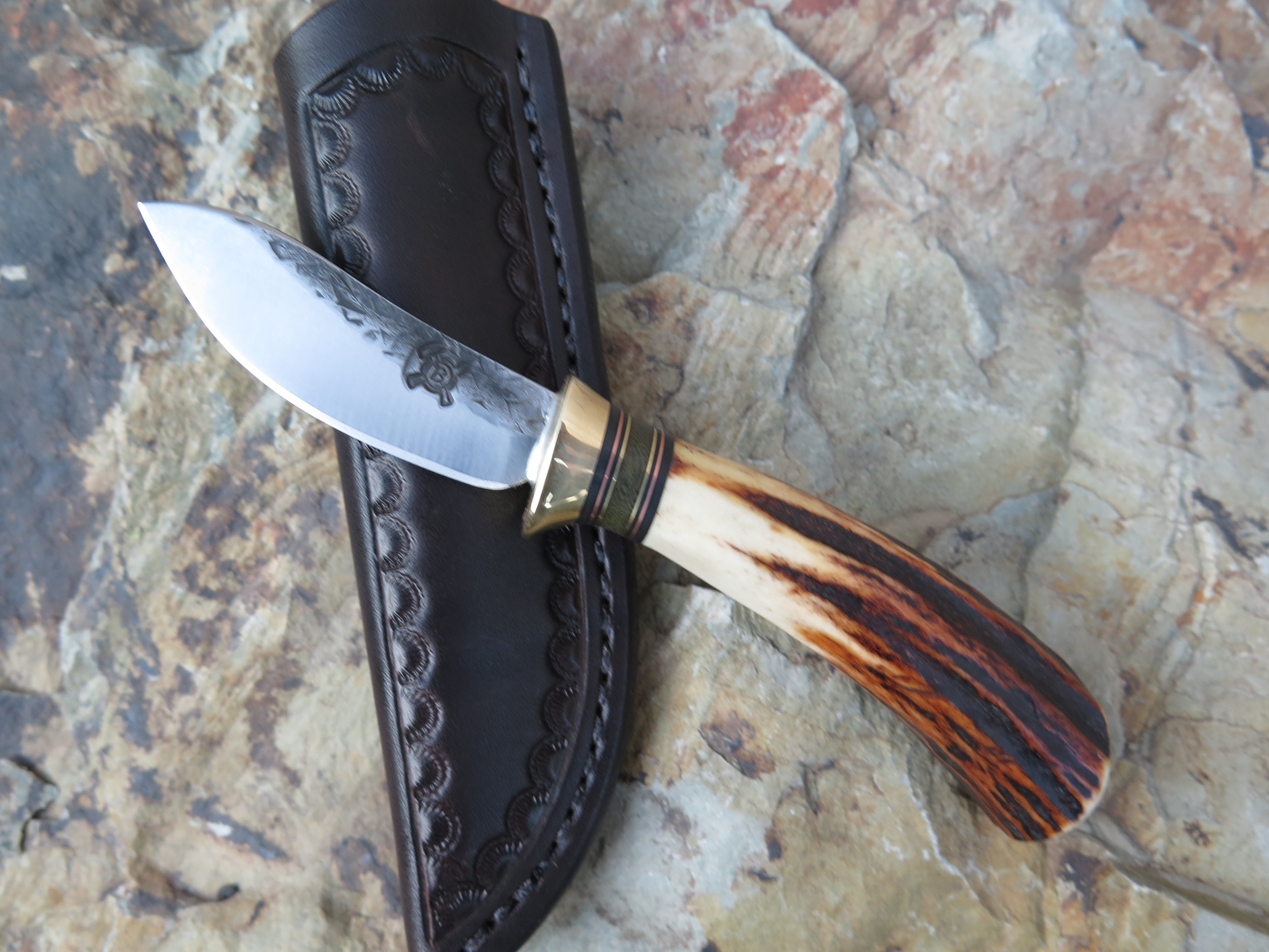 This addition to the Behring Made™ Pocket category is the Semi Skinner. Hand forged from 1/8" thick high carbon 01 tool steel, the blade measures 2 3/8" from tip to guard with a razor sharp hollow grind and our hammermark finish. The brass guard is soldered in place above black fiber, brass, copper and green micarta spacers as well as a premium hand selected sambar stag handle that brings our overall length to 5 3/4"- plus it comes in a custom Warlander Leather pocket sheath!