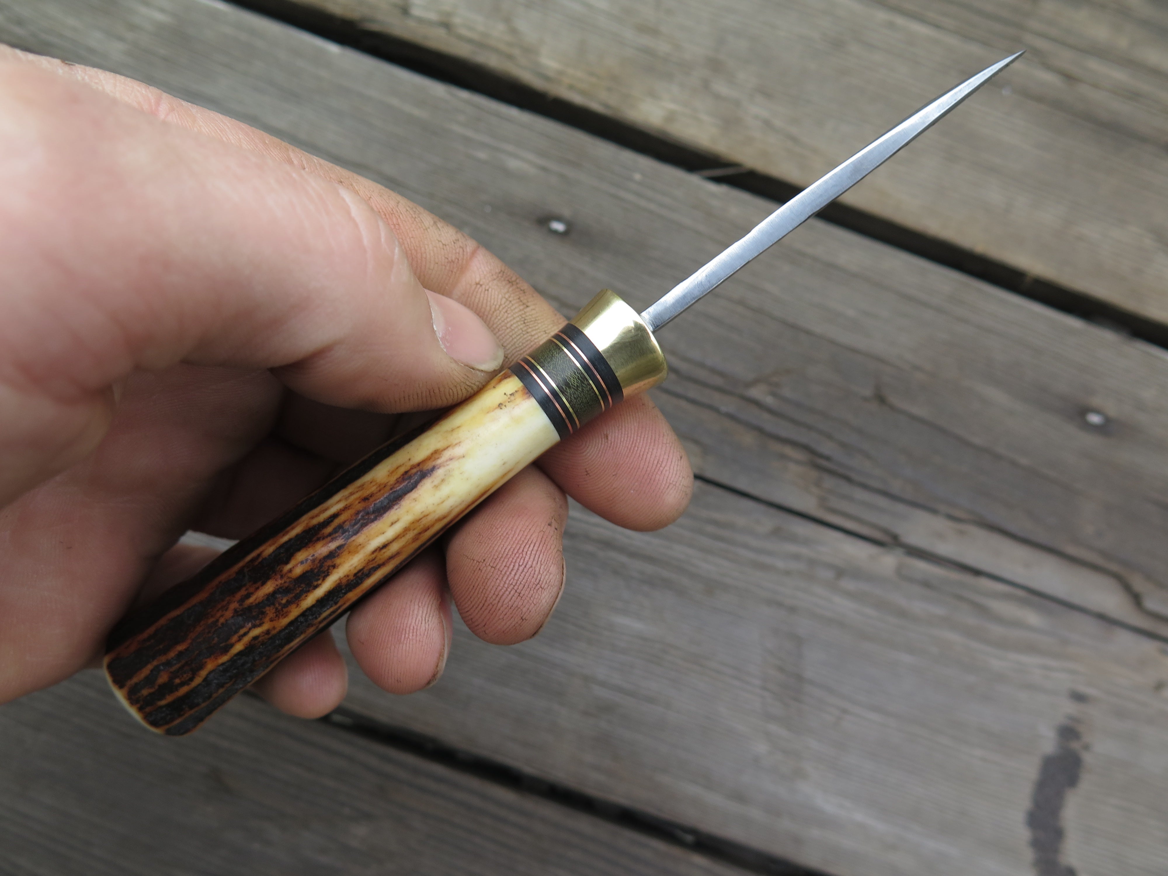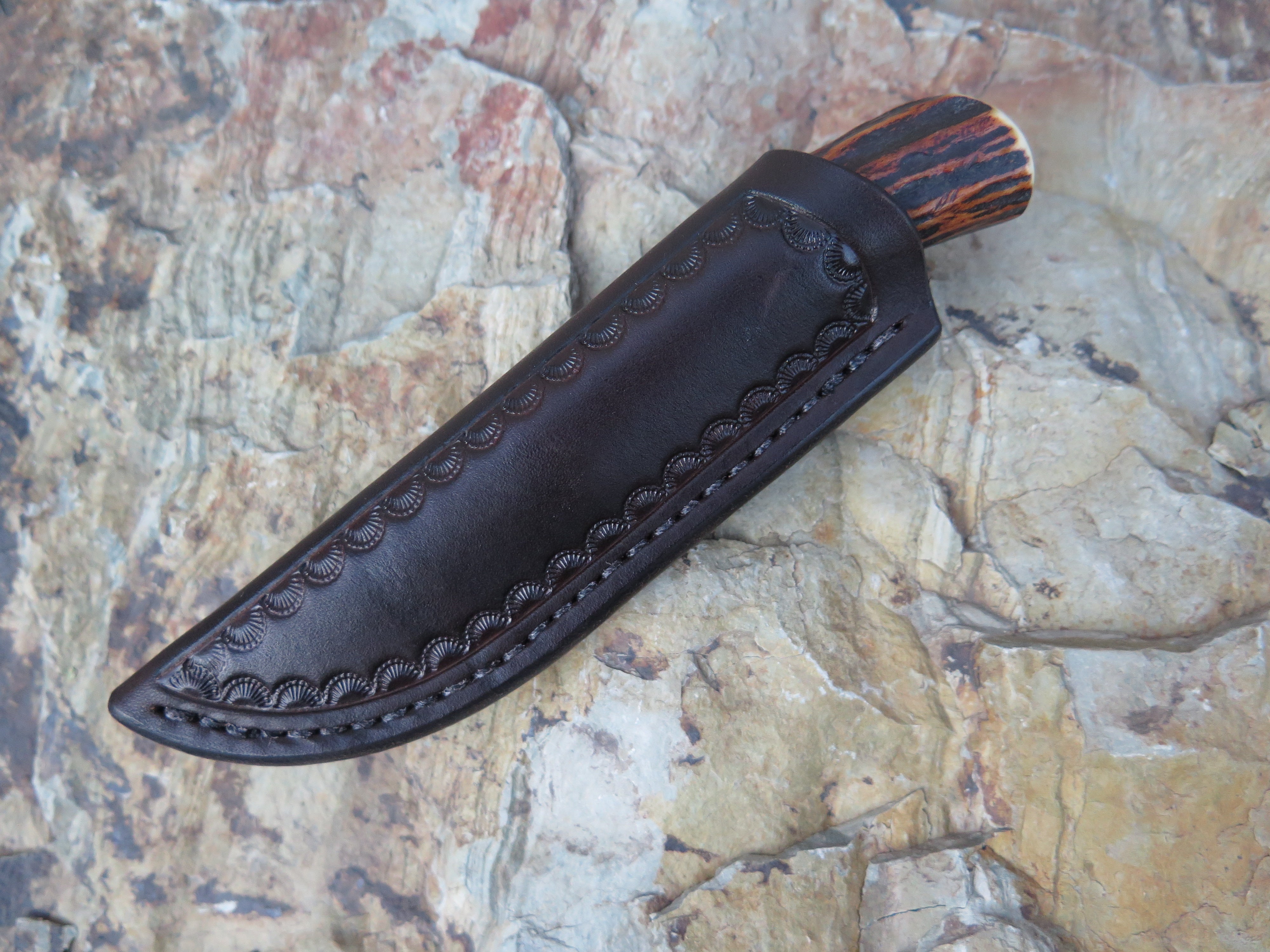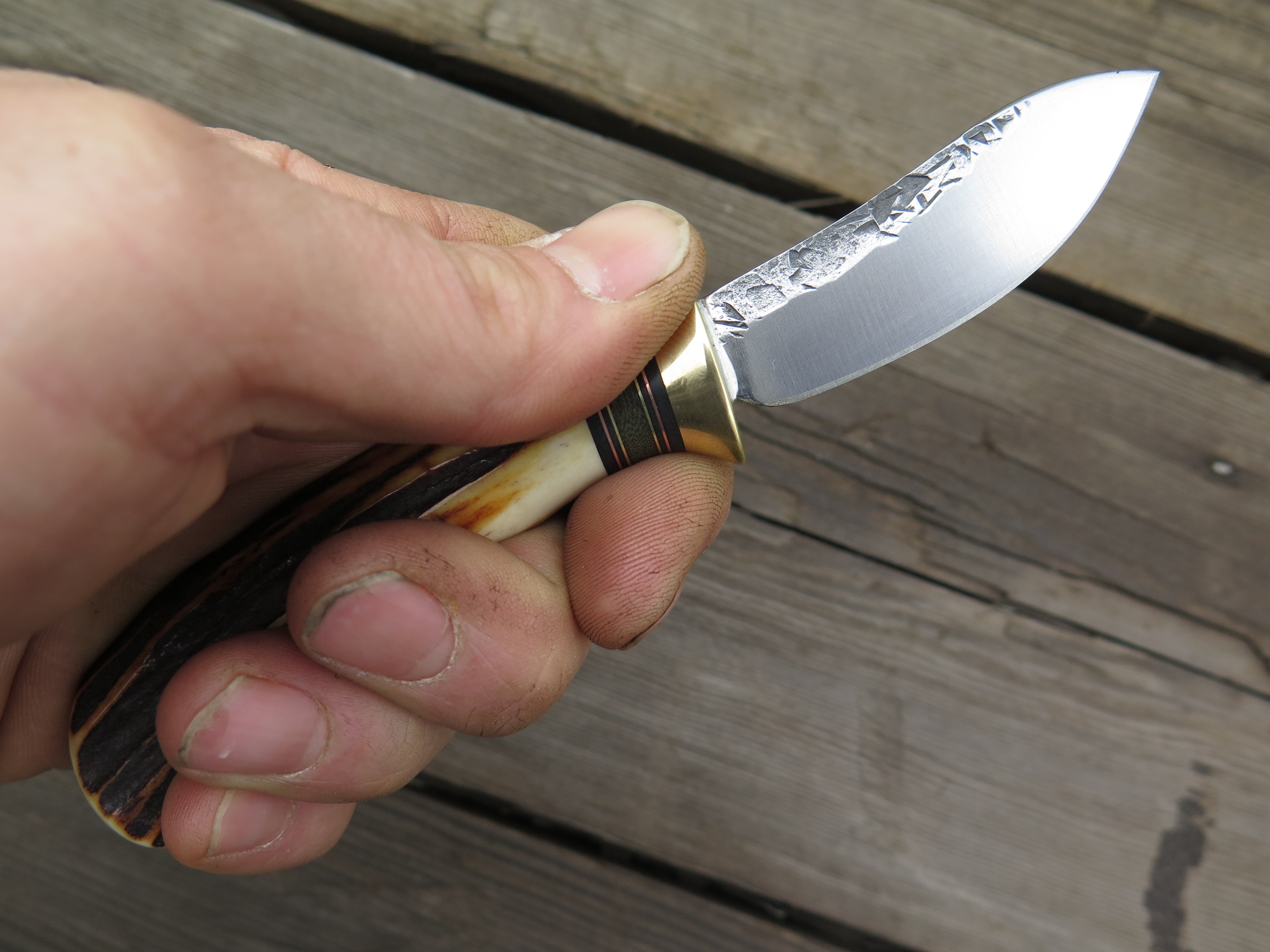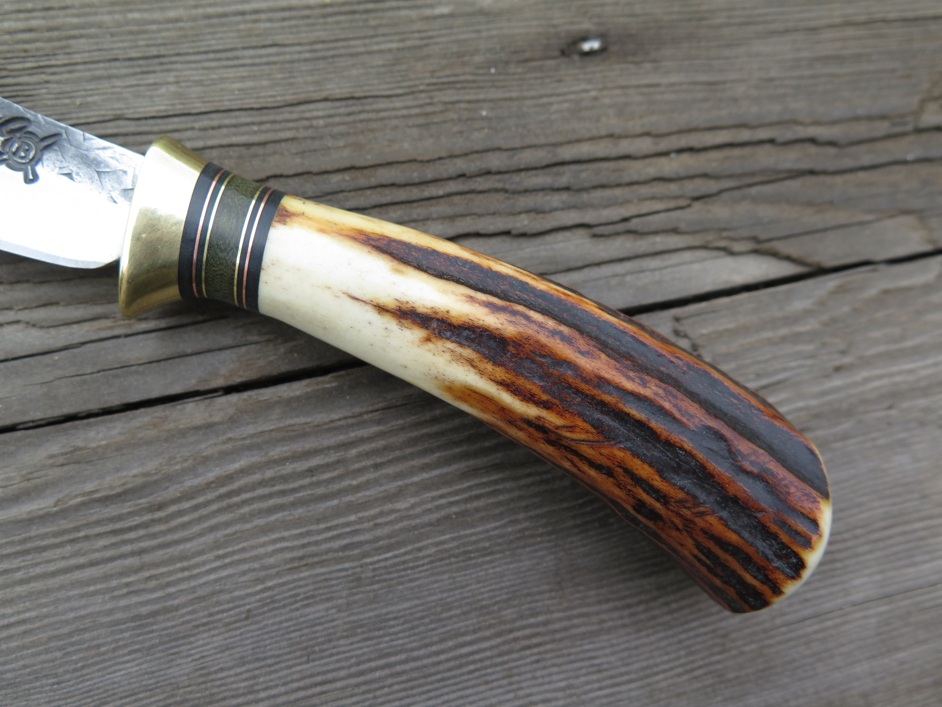 This addition to the Behring Made™ Pocket category is the Semi Skinner. Hand forged from 1/8" thick high carbon 01 tool steel, the blade measures 2 3/8" from tip to guard with a razor sharp hollow grind and our hammermark finish. The brass guard is soldered in place above black fiber, brass, copper and green micarta spacers as well as a premium hand selected sambar stag handle that brings our overall length to 5 3/4"- plus it comes in a custom Warlander Leather pocket sheath!