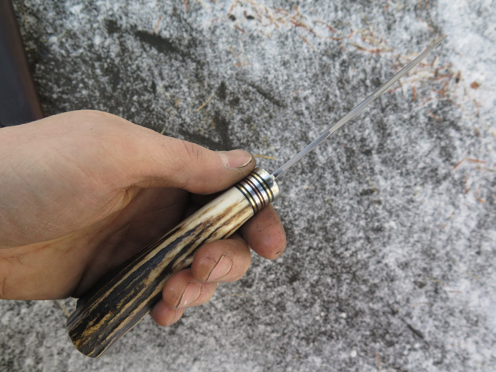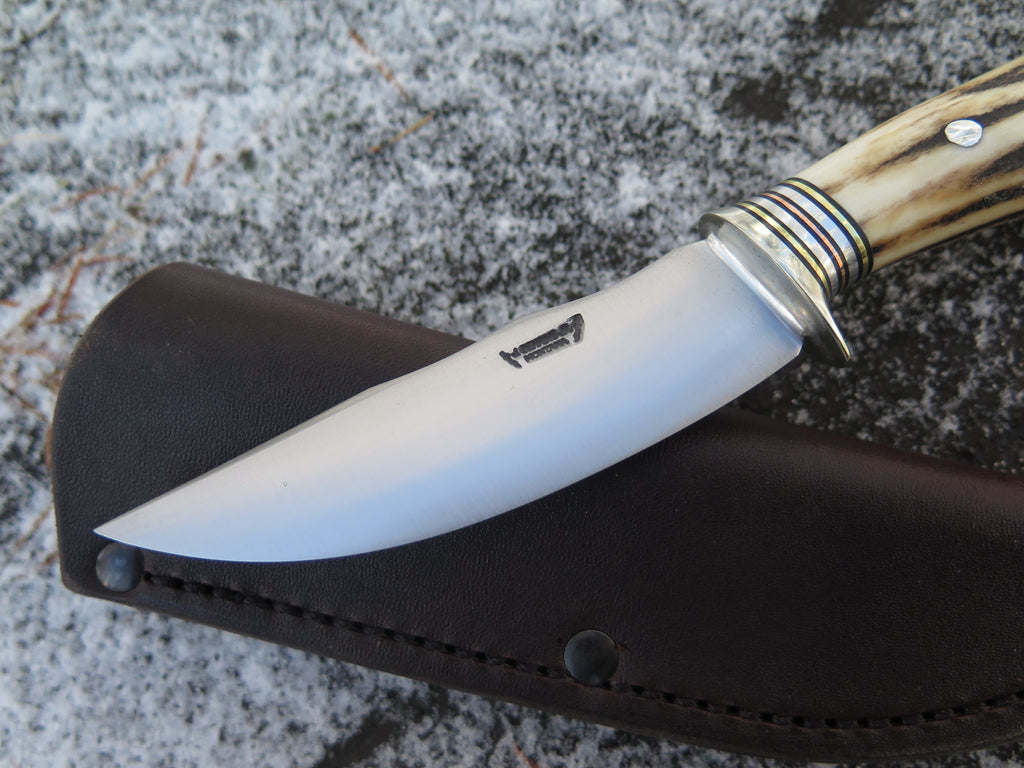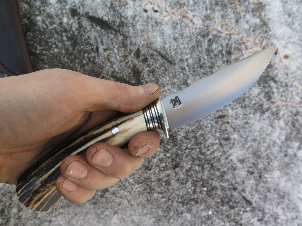 This new one from Behring Made© is inspired by the great Bill Scagel and some of his clip point designs. It is hand forged from 1/8" thick high carbon 01 tool steel and measures 4" from tip to guard with a razor sharp convex grind. The nickel silver guard is soldered in place above black fiber, copper, aluminum and brass spacers with a premium sambar stag handle that we pinned through the tang with aluminum. The overall length rings in at 8 1/2" and it comes in a classic leather belt pouch sheath, guaranteed for life!