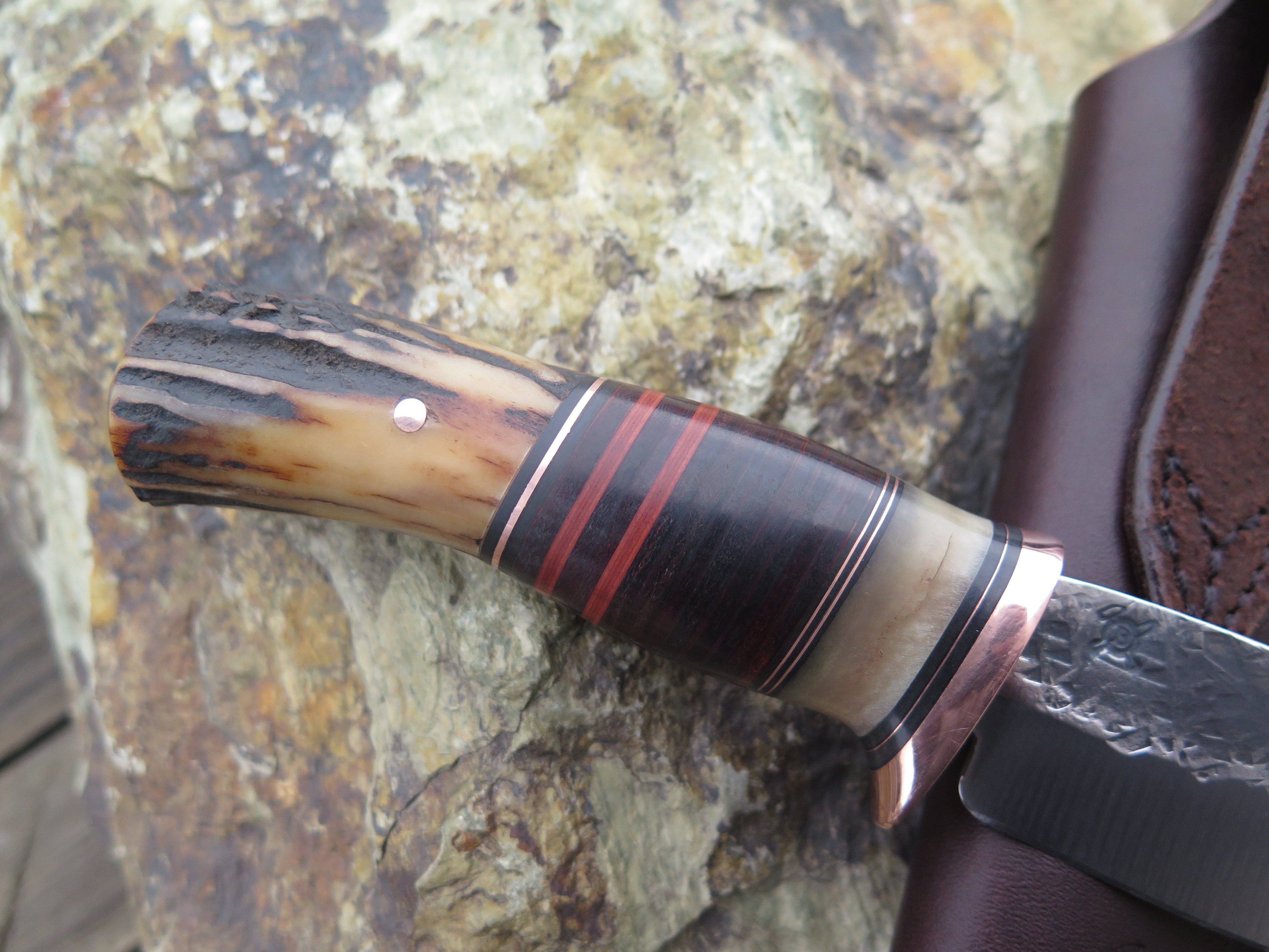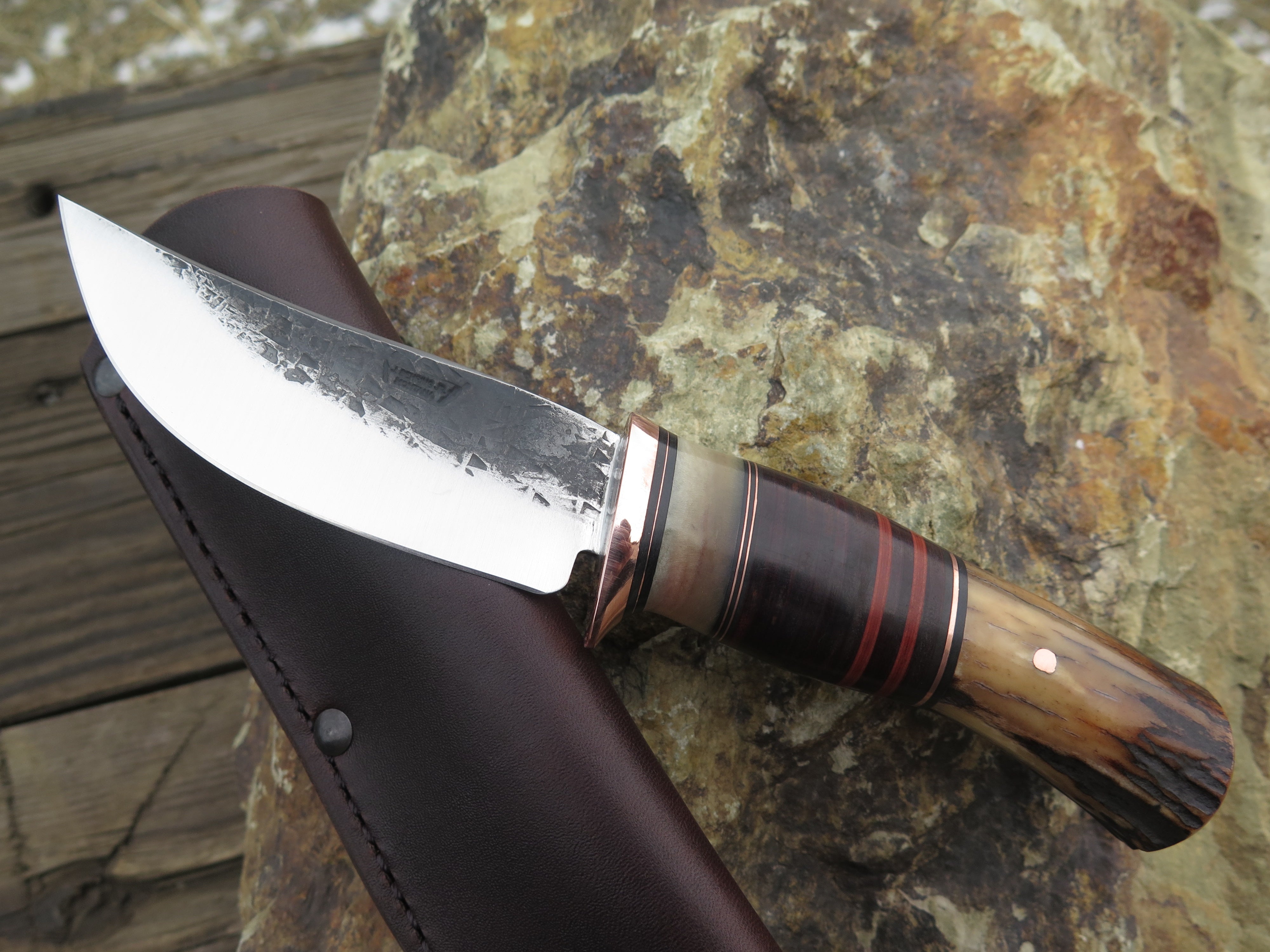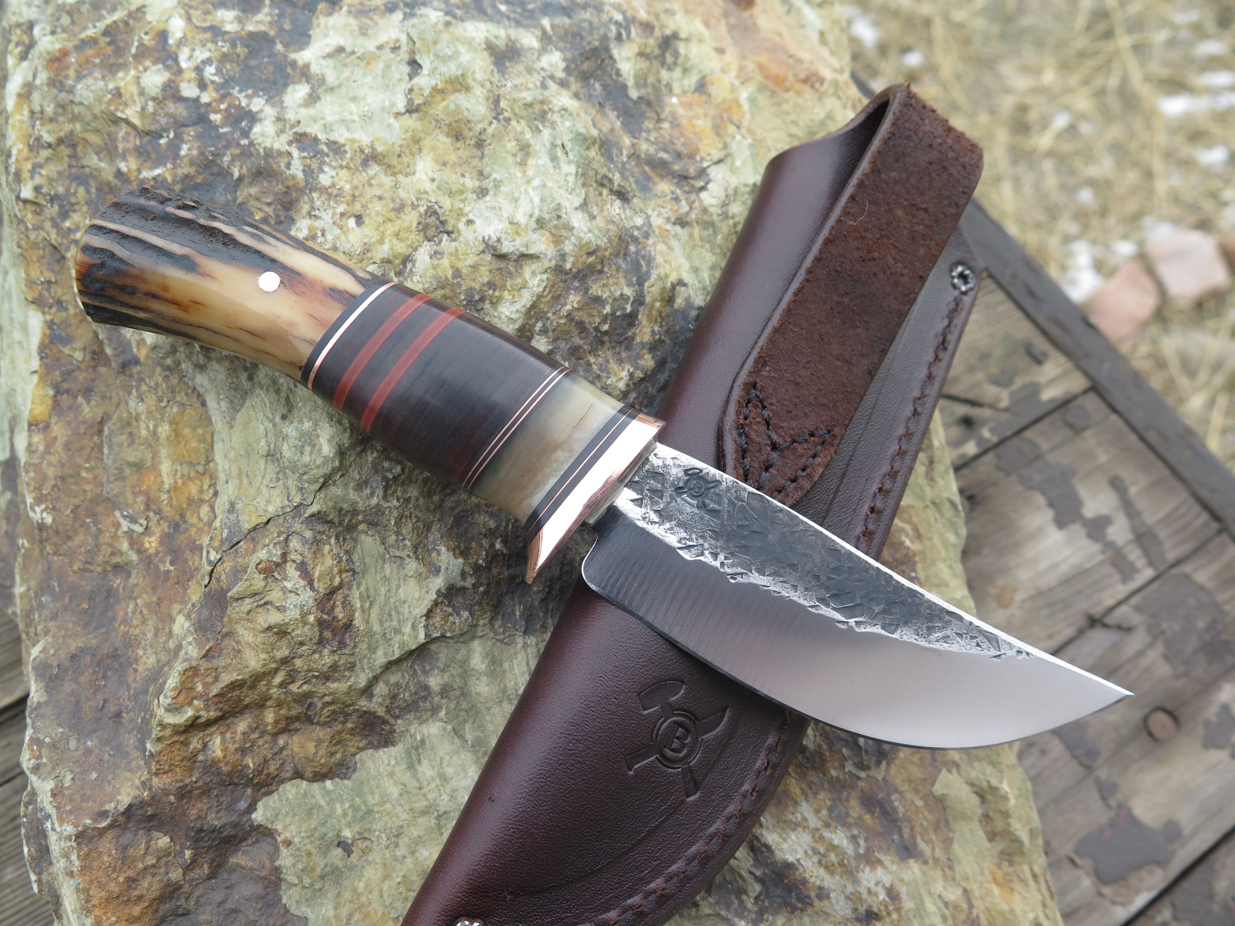 This classic Hunter from Behring Made© is hand forged from 1/8" thick high carbon 01 tool steel and it measures 4 1/4" from tip to guard with a razor sharp hollow grind and our hammermark finish. The copper guard is soldered in place above black and maroon fiber, copper, sheep horn and horsehide leather spacers with a premium sambar stag butt that's pinned through the tang with copper. The overall length measures 8 3/8" and it comes in a simple Warlander Leather pouch.