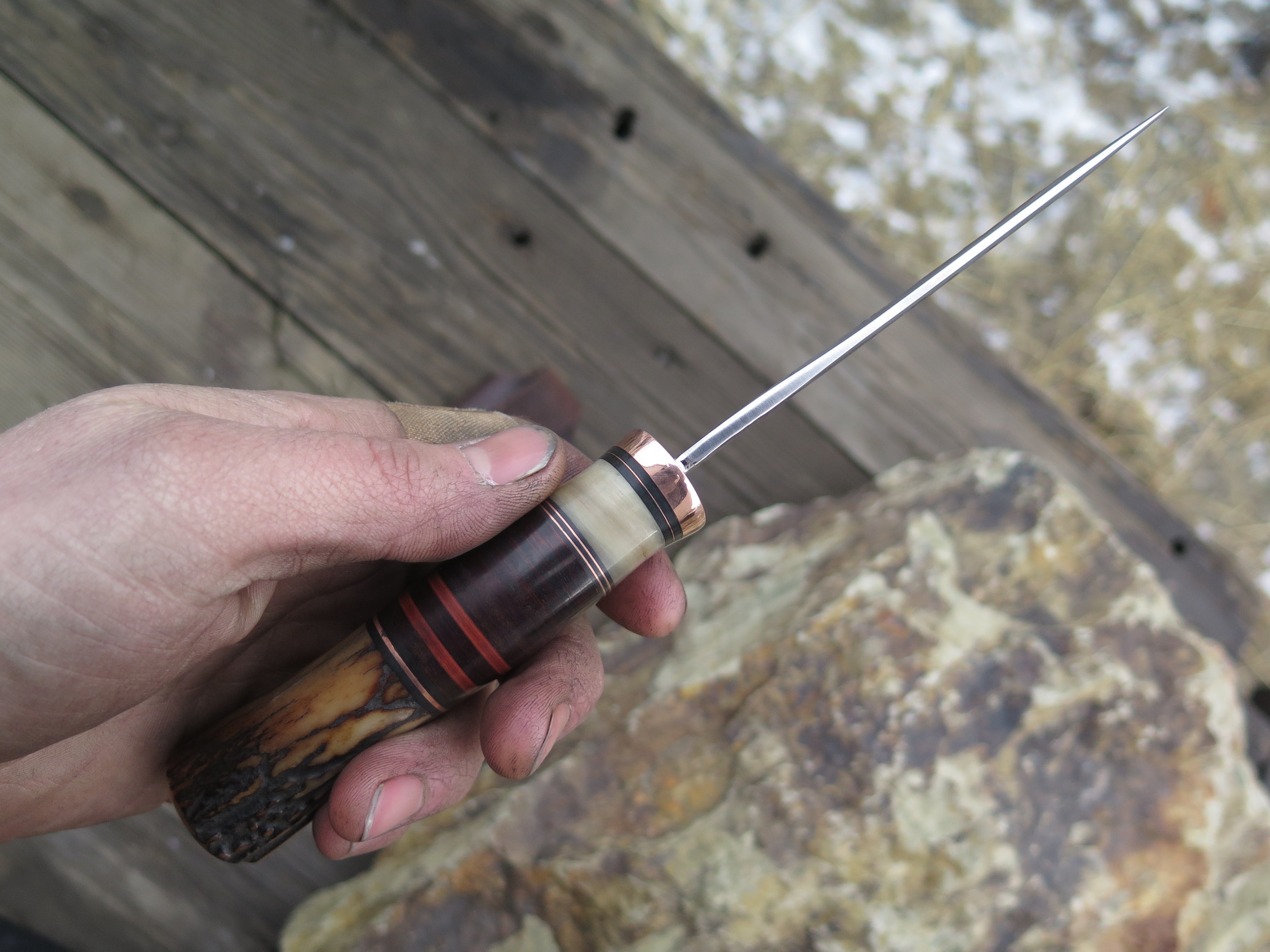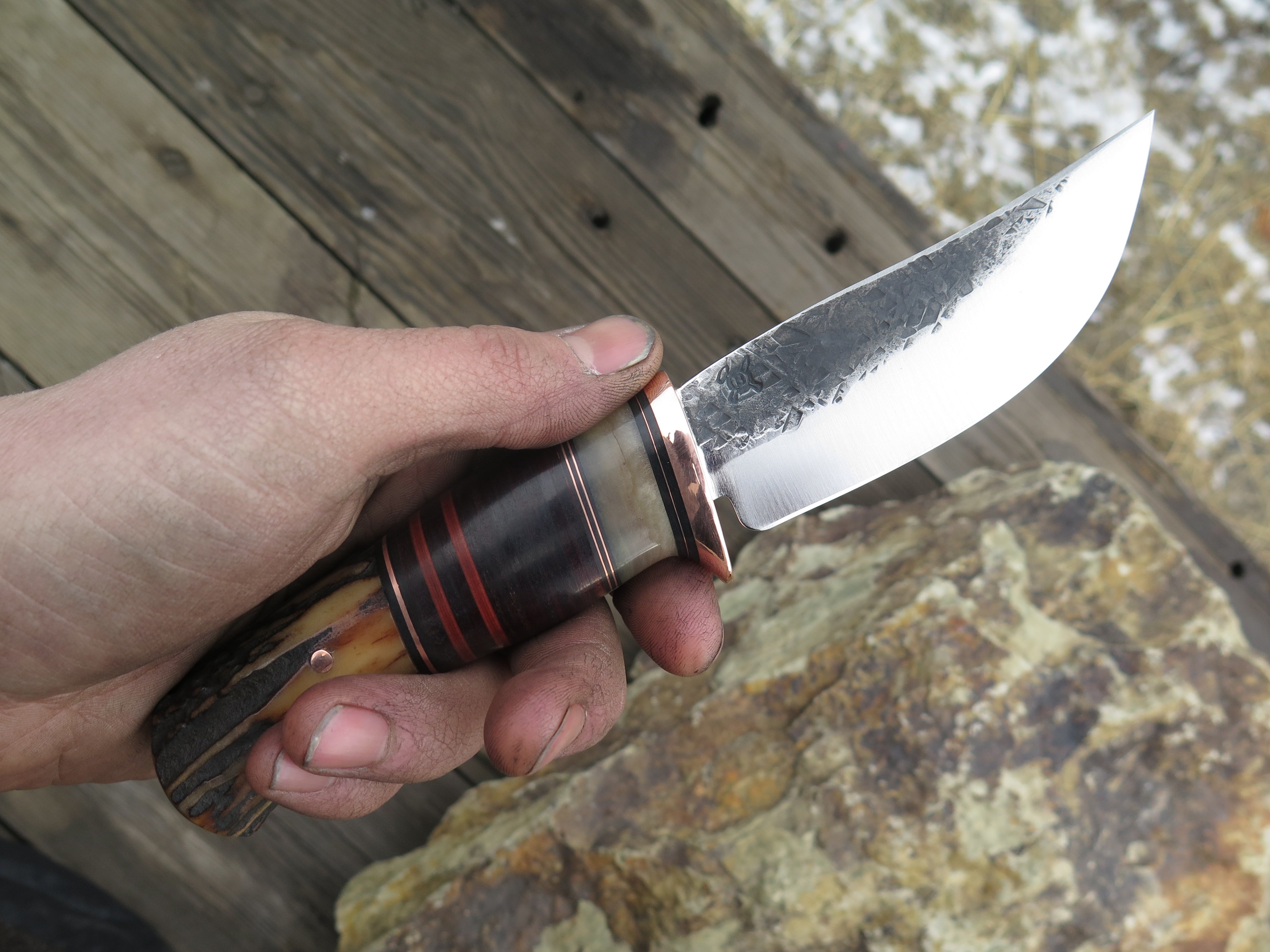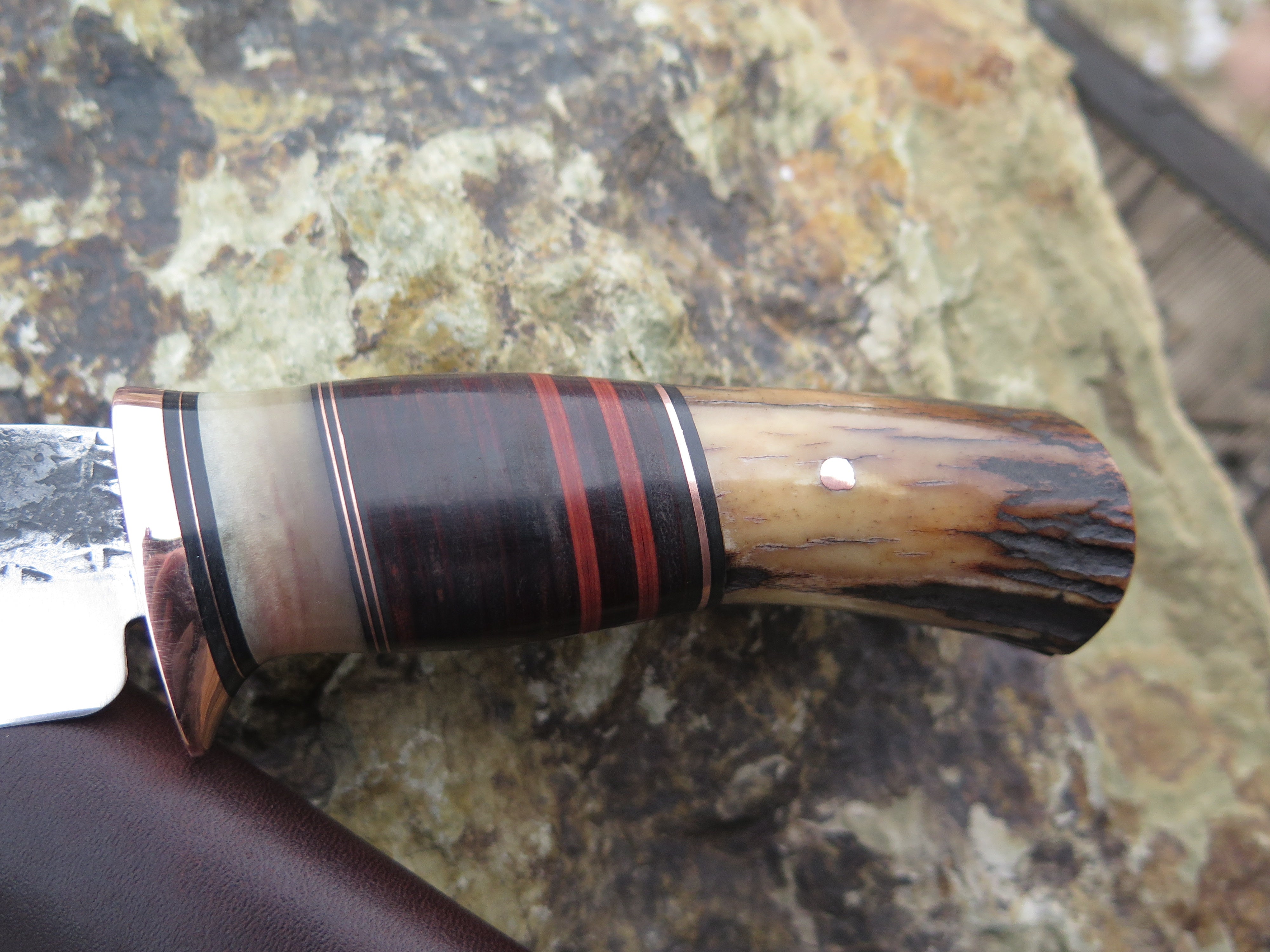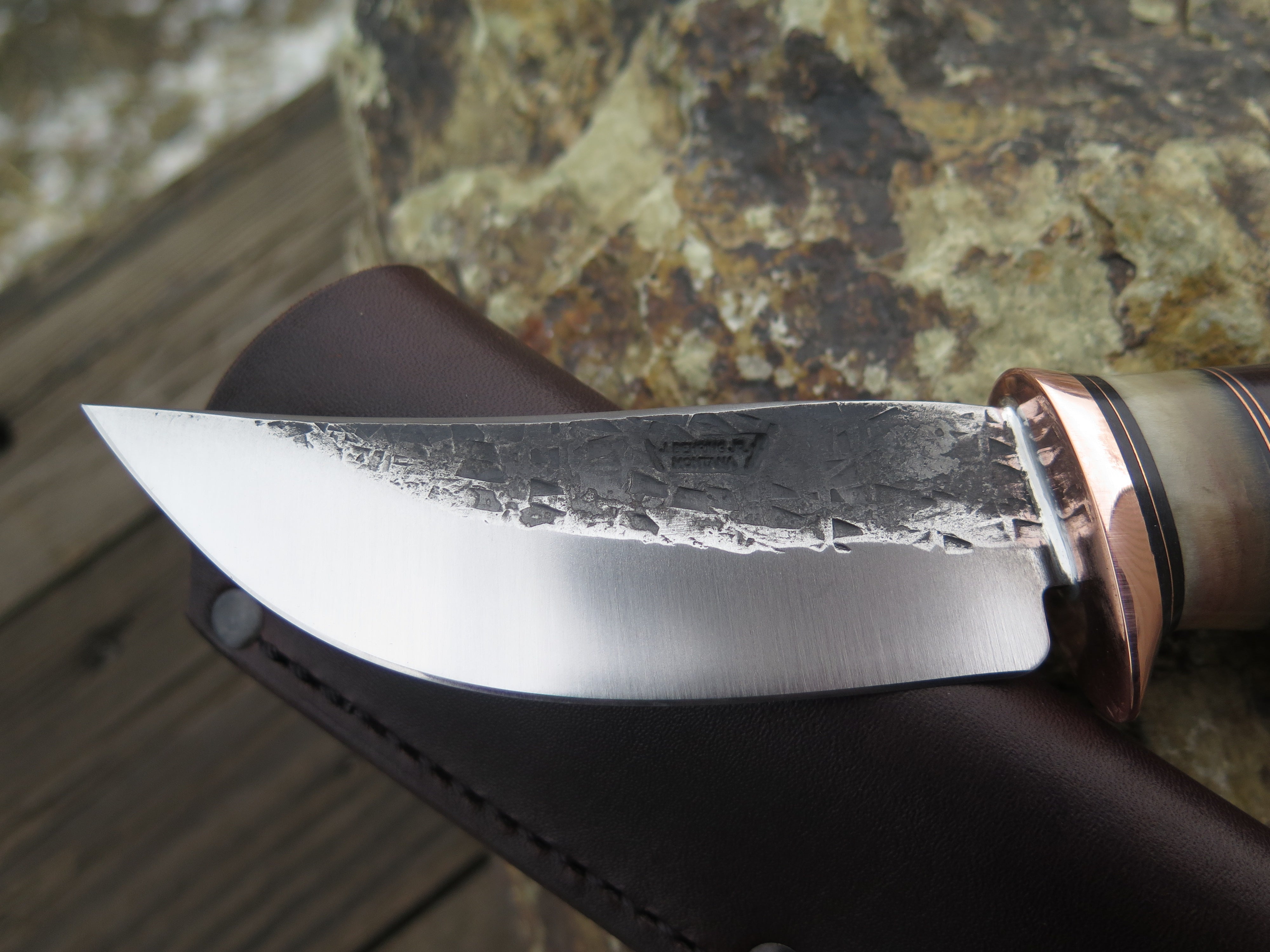 This classic Hunter from Behring Made© is hand forged from 1/8" thick high carbon 01 tool steel and it measures 4 1/4" from tip to guard with a razor sharp hollow grind and our hammermark finish. The copper guard is soldered in place above black and maroon fiber, copper, sheep horn and horsehide leather spacers with a premium sambar stag butt that's pinned through the tang with copper. The overall length measures 8 3/8" and it comes in a simple Warlander Leather pouch.