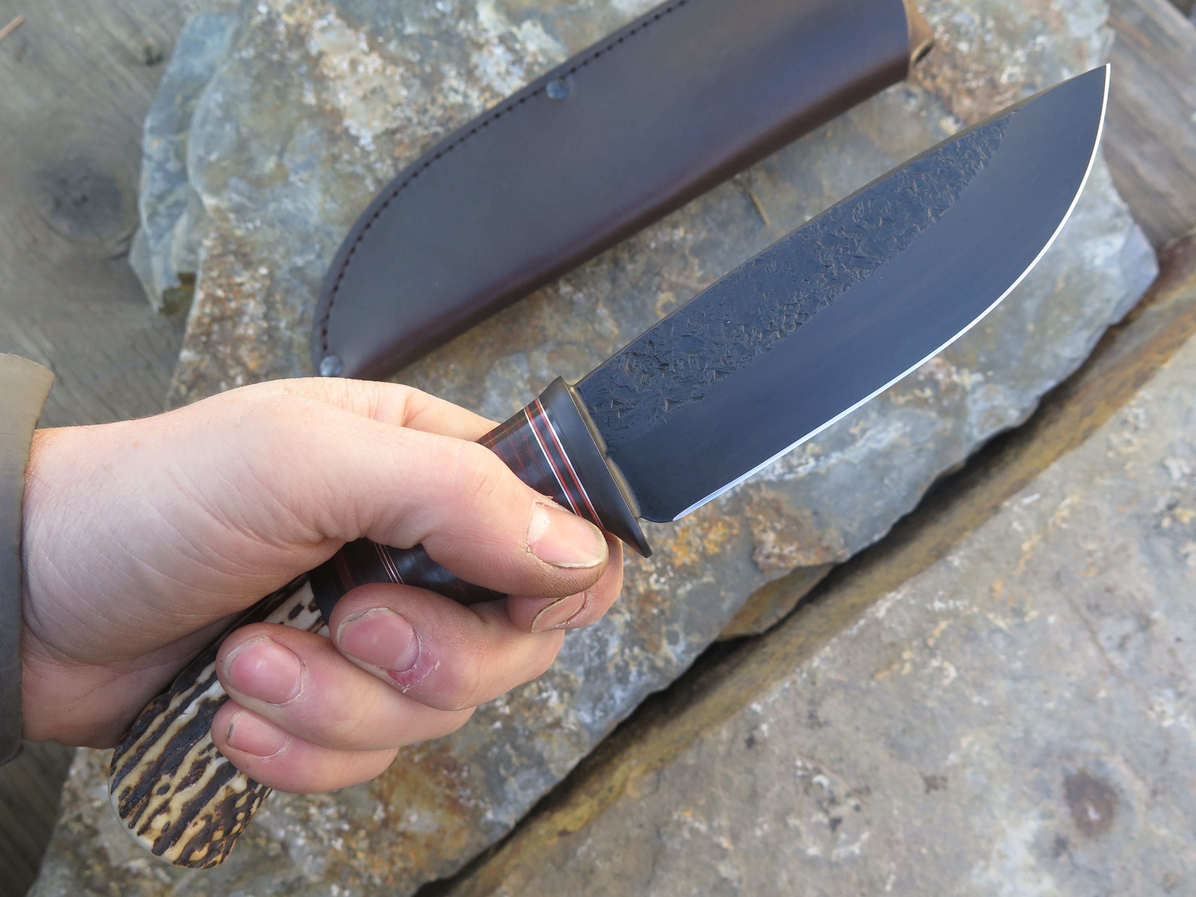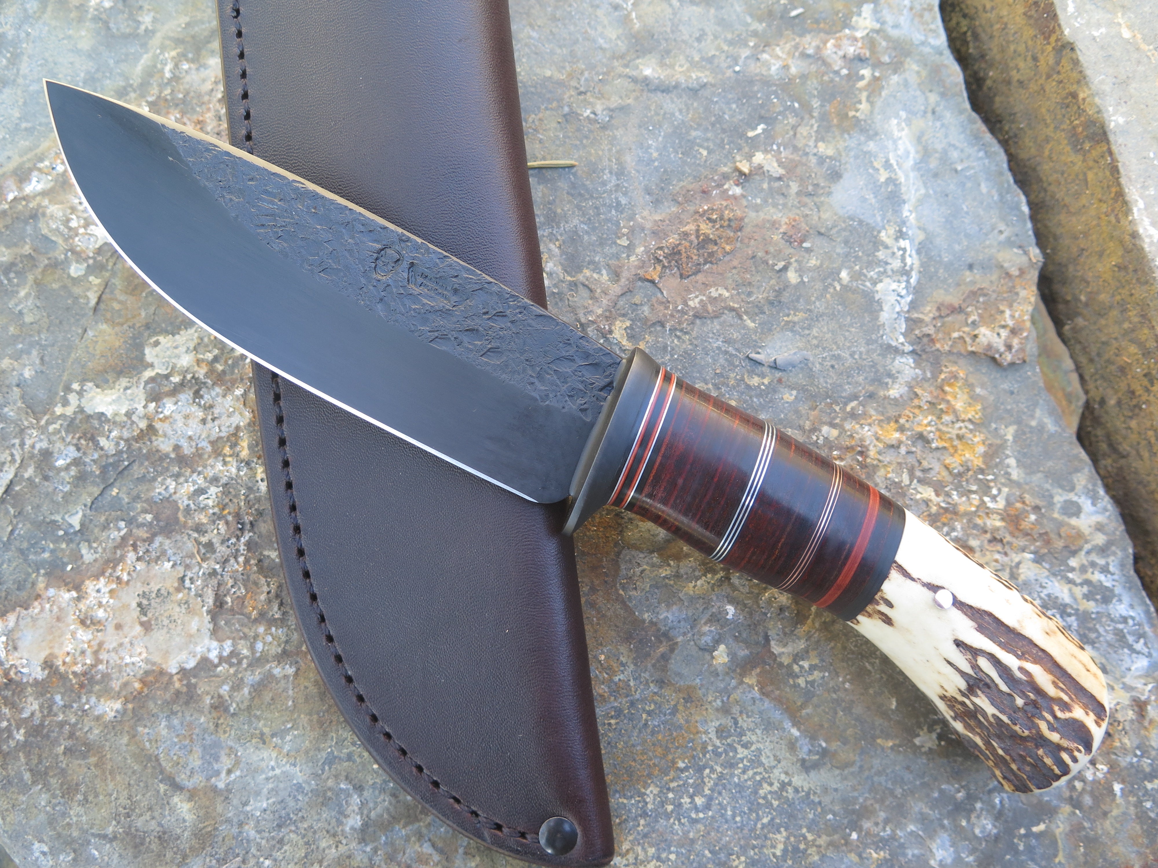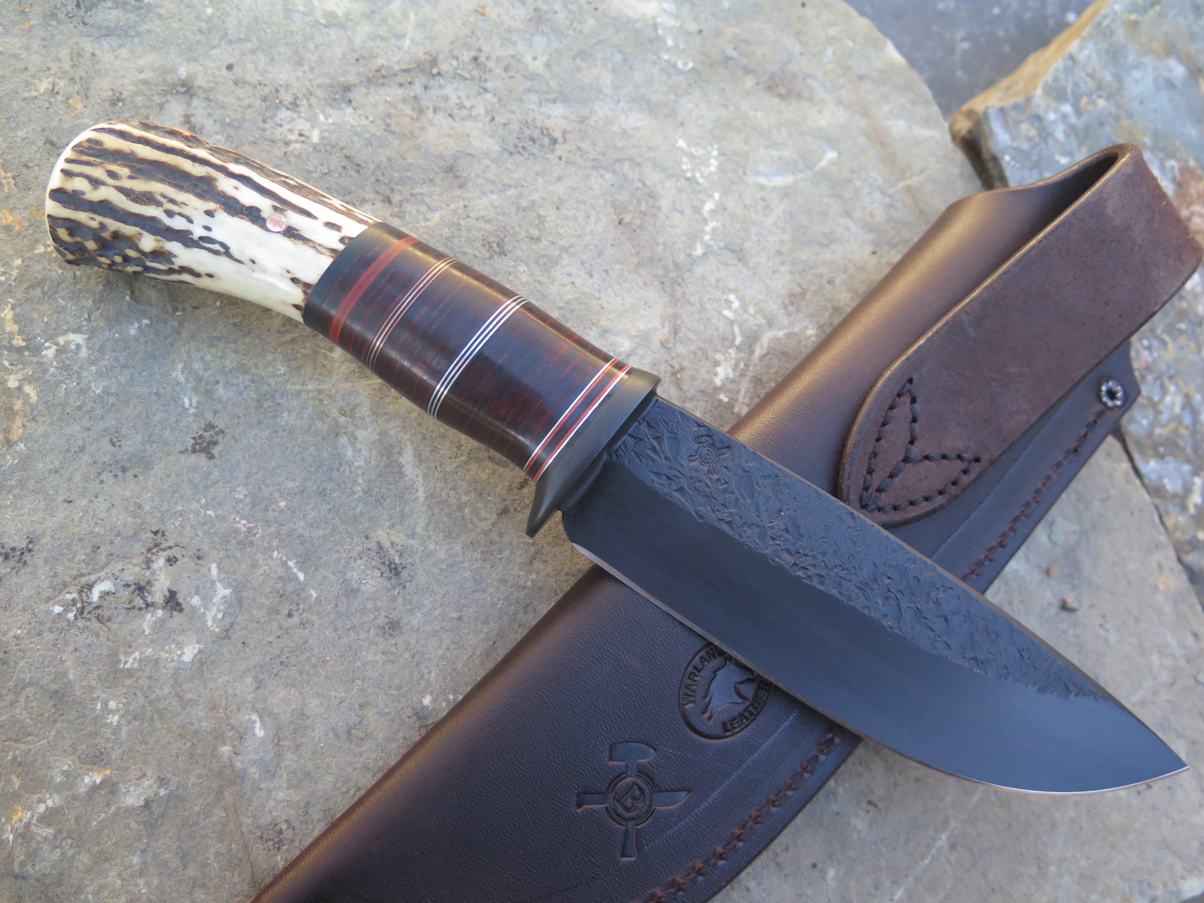 This beastly new Drop Point from Behring Made© is hand forged out of 3/16" thick high carbon 01 tool steel and it measures 5 1/4" from tip to guard with a razor sharp hollow grind, hammermarks and our forced patina blued finish. The blued steel guard is soldered in place above black and maroon fiber, copper, aluminum and horsehide leather spacers which top a premium sambar stag butt that is pinned through the tang with copper. The overall length measures 10 1/8" and this one comes in a classic leather belt pouch sheath.