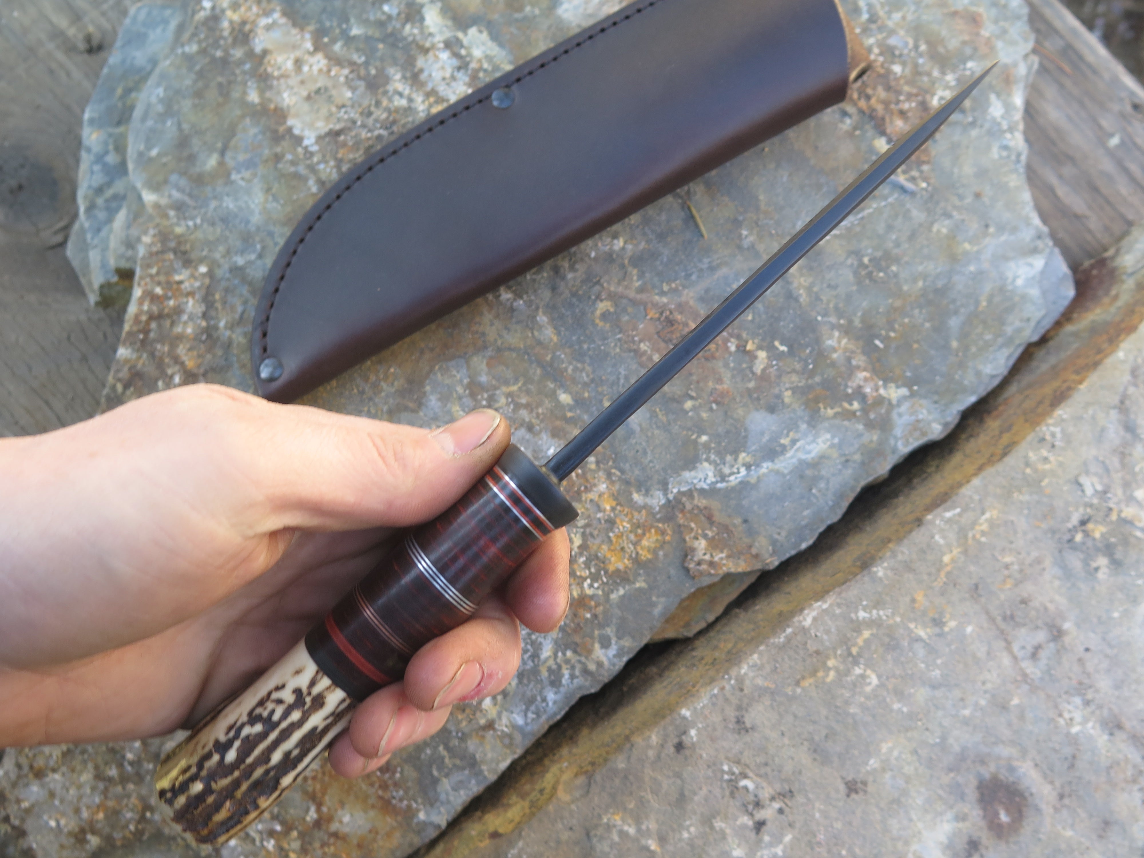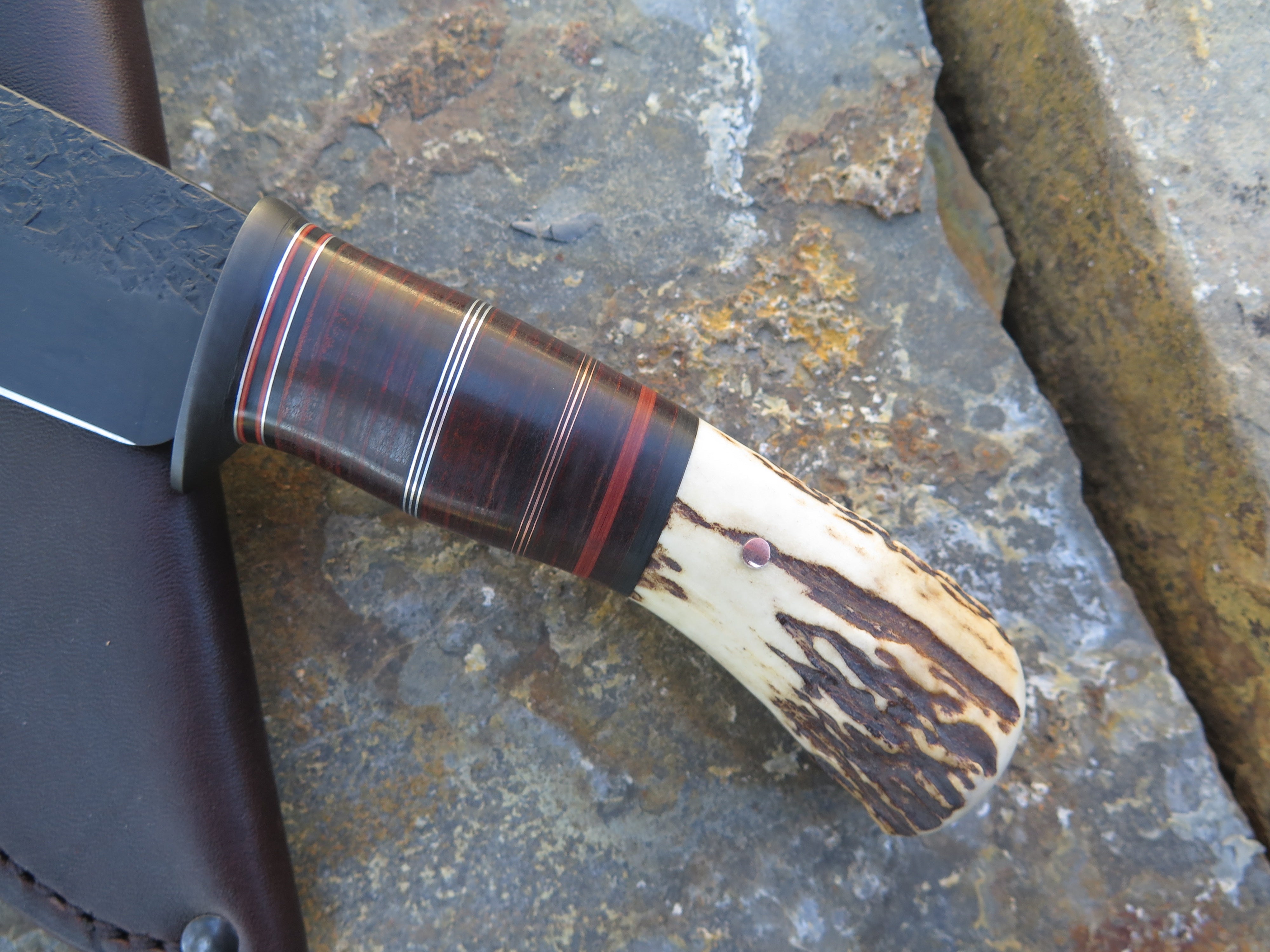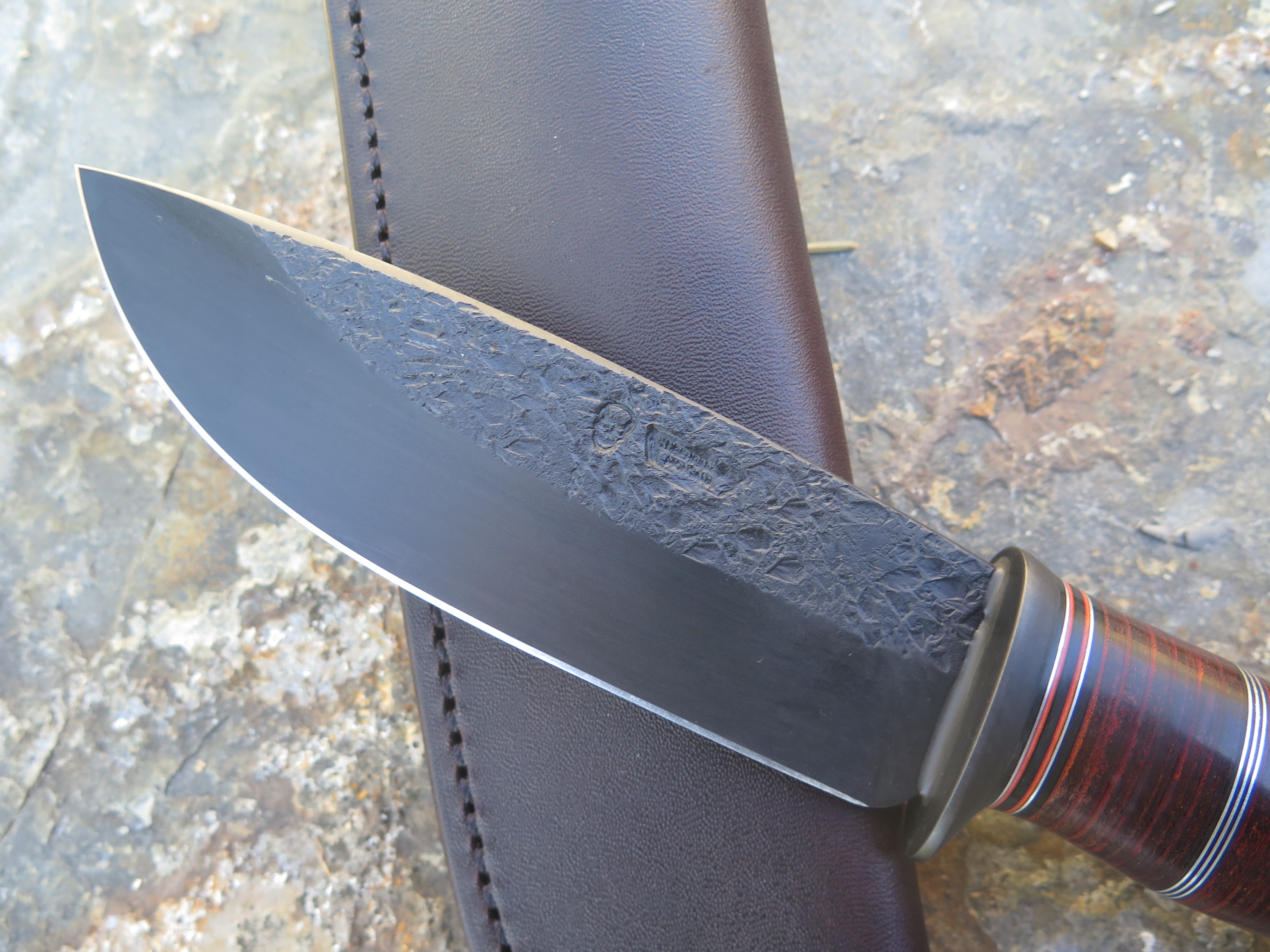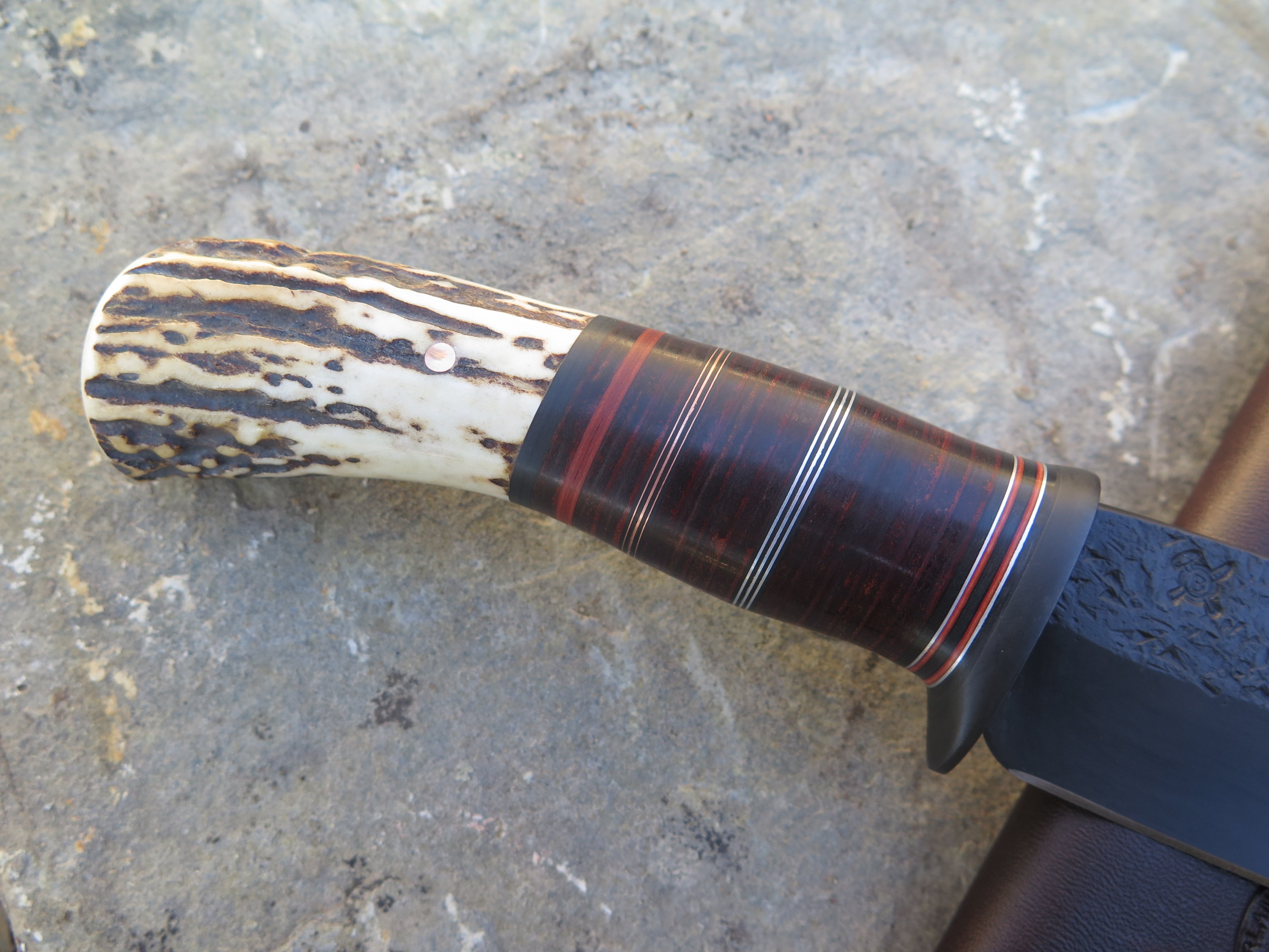 This beastly new Drop Point from Behring Made© is hand forged out of 3/16" thick high carbon 01 tool steel and it measures 5 1/4" from tip to guard with a razor sharp hollow grind, hammermarks and our forced patina blued finish. The blued steel guard is soldered in place above black and maroon fiber, copper, aluminum and horsehide leather spacers which top a premium sambar stag butt that is pinned through the tang with copper. The overall length measures 10 1/8" and this one comes in a classic leather belt pouch sheath.