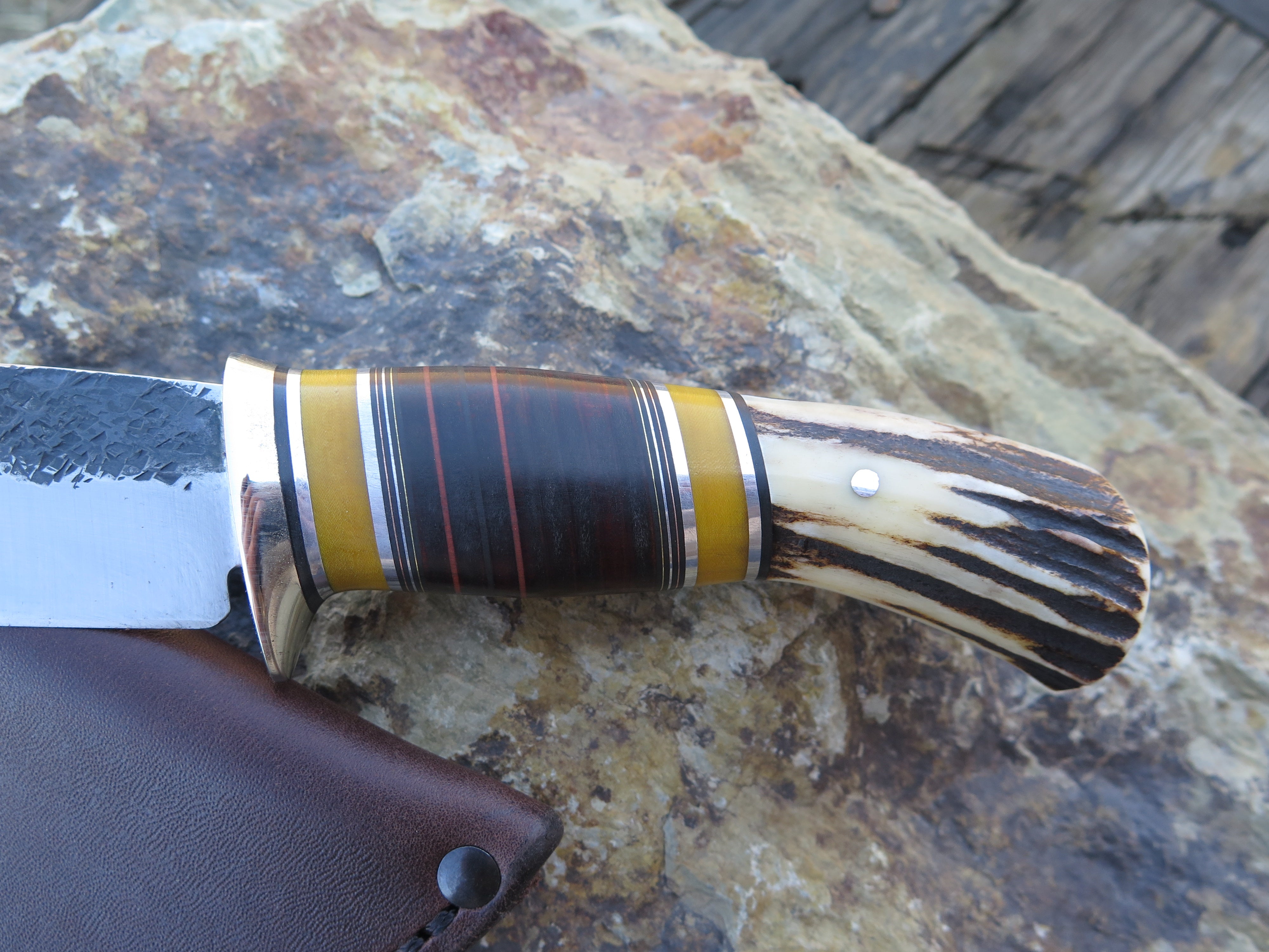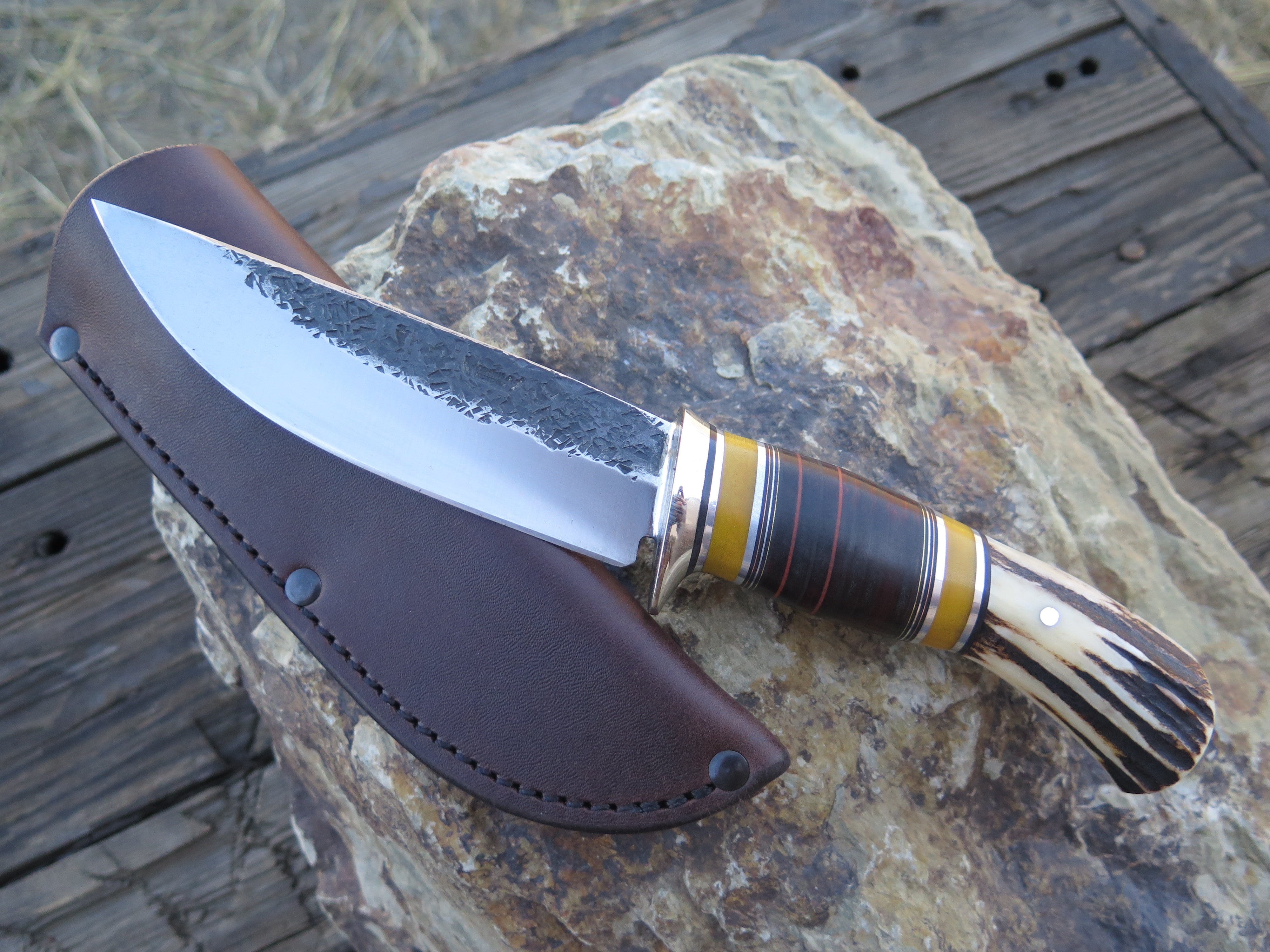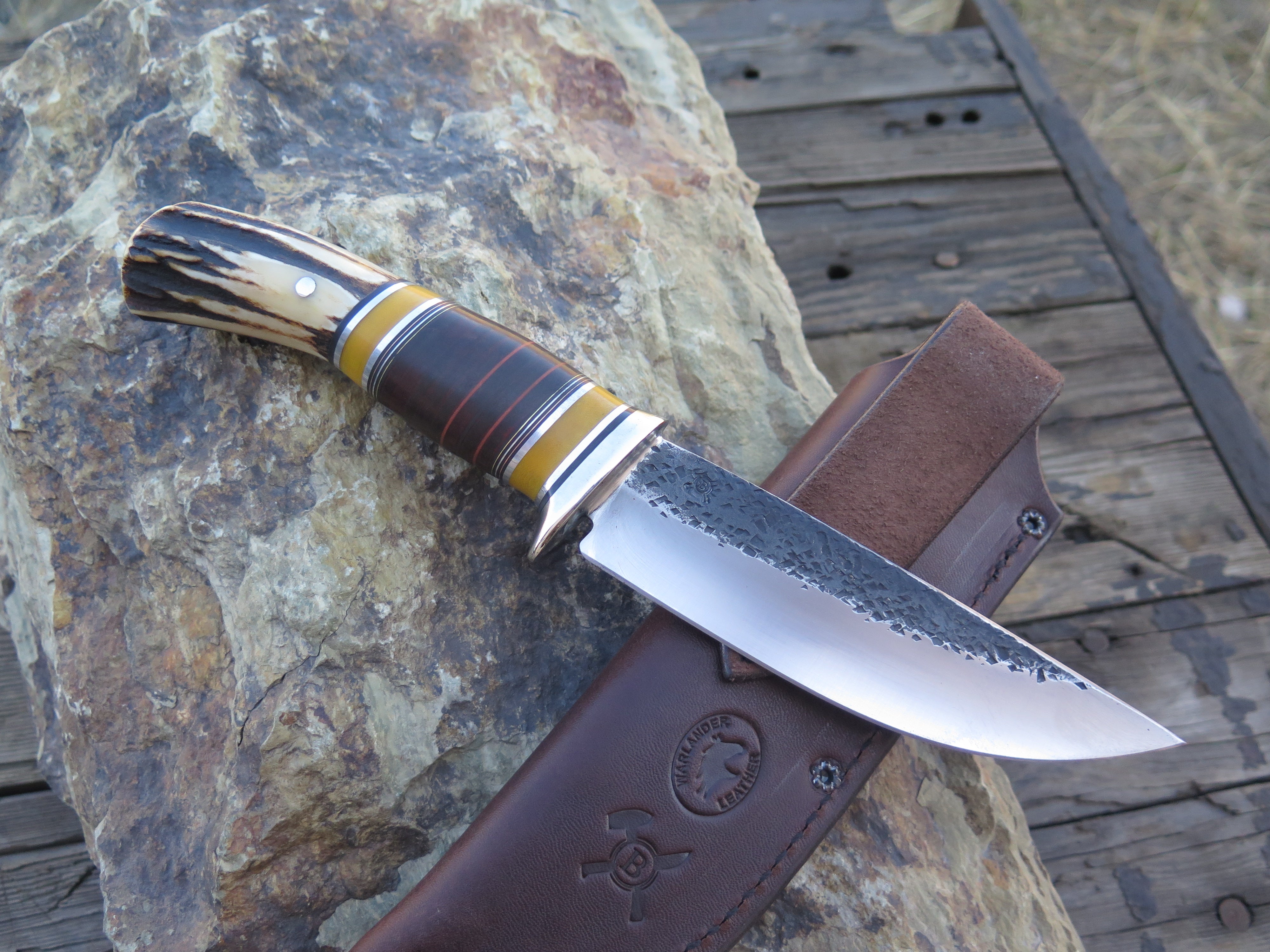 This classic Drop Point from Behring Made© is hand forged from 3/16" thick high carbon 01 tool steel and it measures 5 1/2" from tip to guard with a razor sharp hollow grind and our hammermark finish. The nickel silver guard is soldered in place above black and maroon fiber, yellow micarta, chocolate horsehide, aluminum and copper spacers as well as a premium sambar stag butt that is pinned through the tang with aluminum. The overall length measures 10" and it comes in a simple belt pouch sheath.