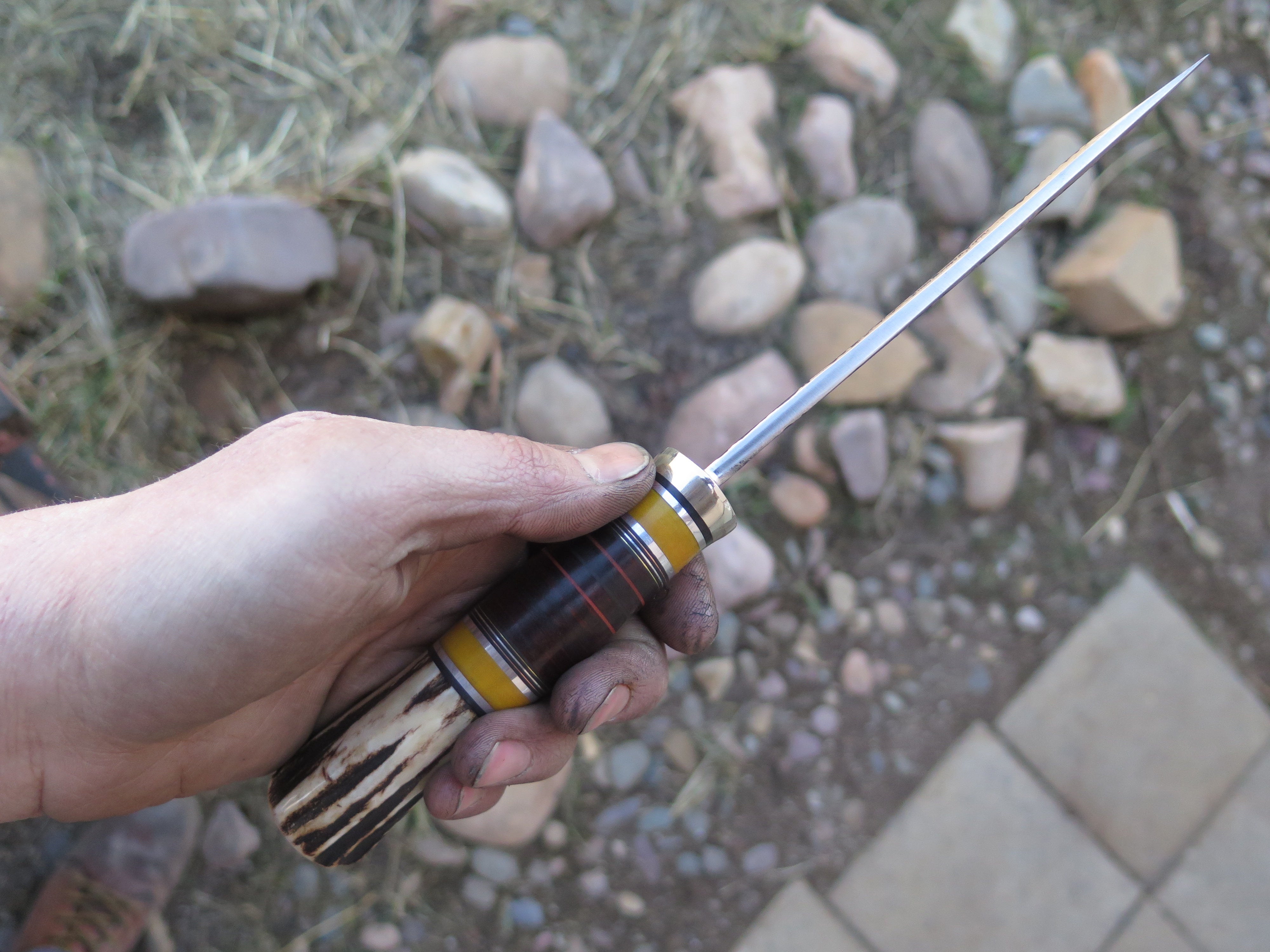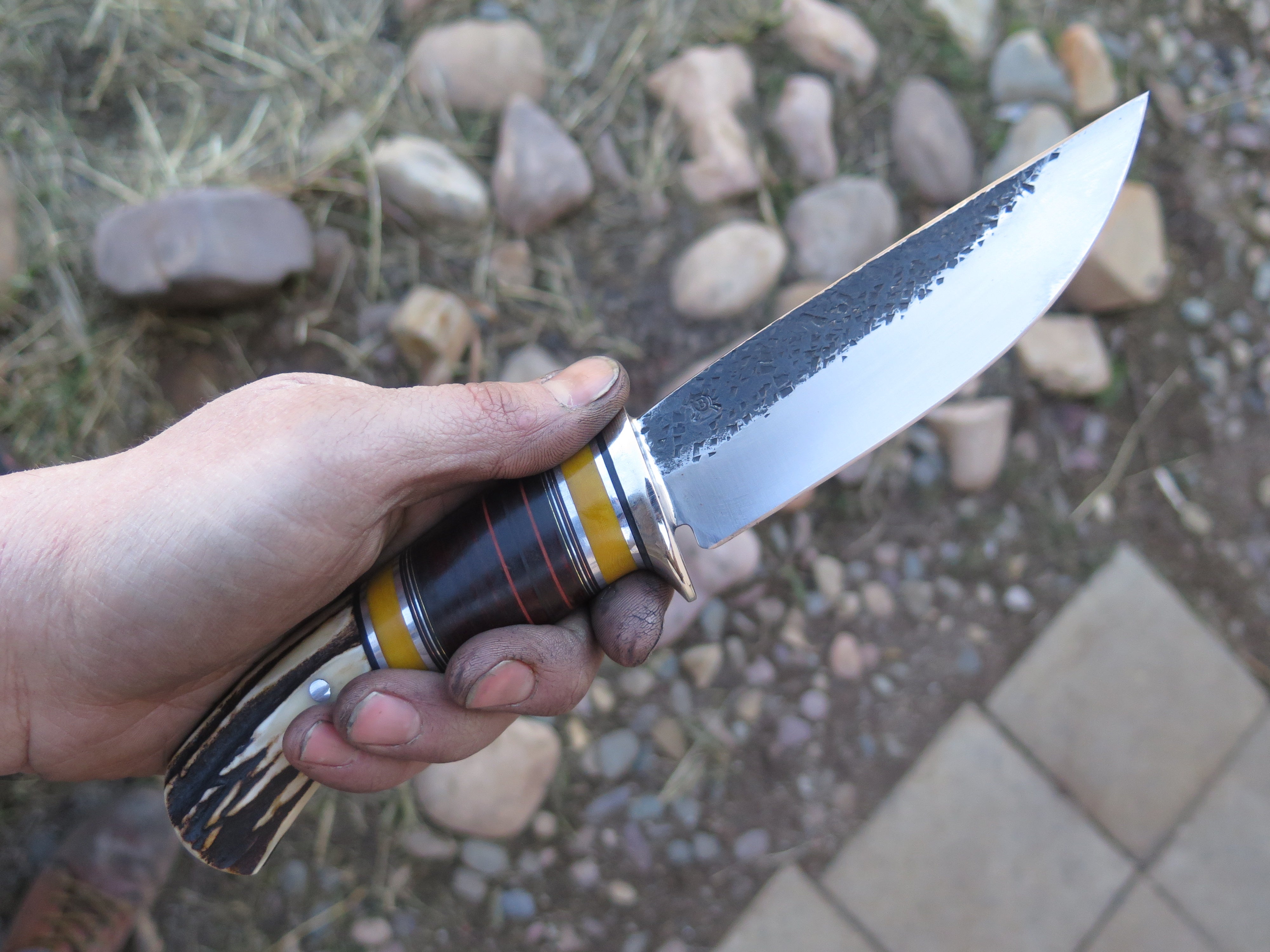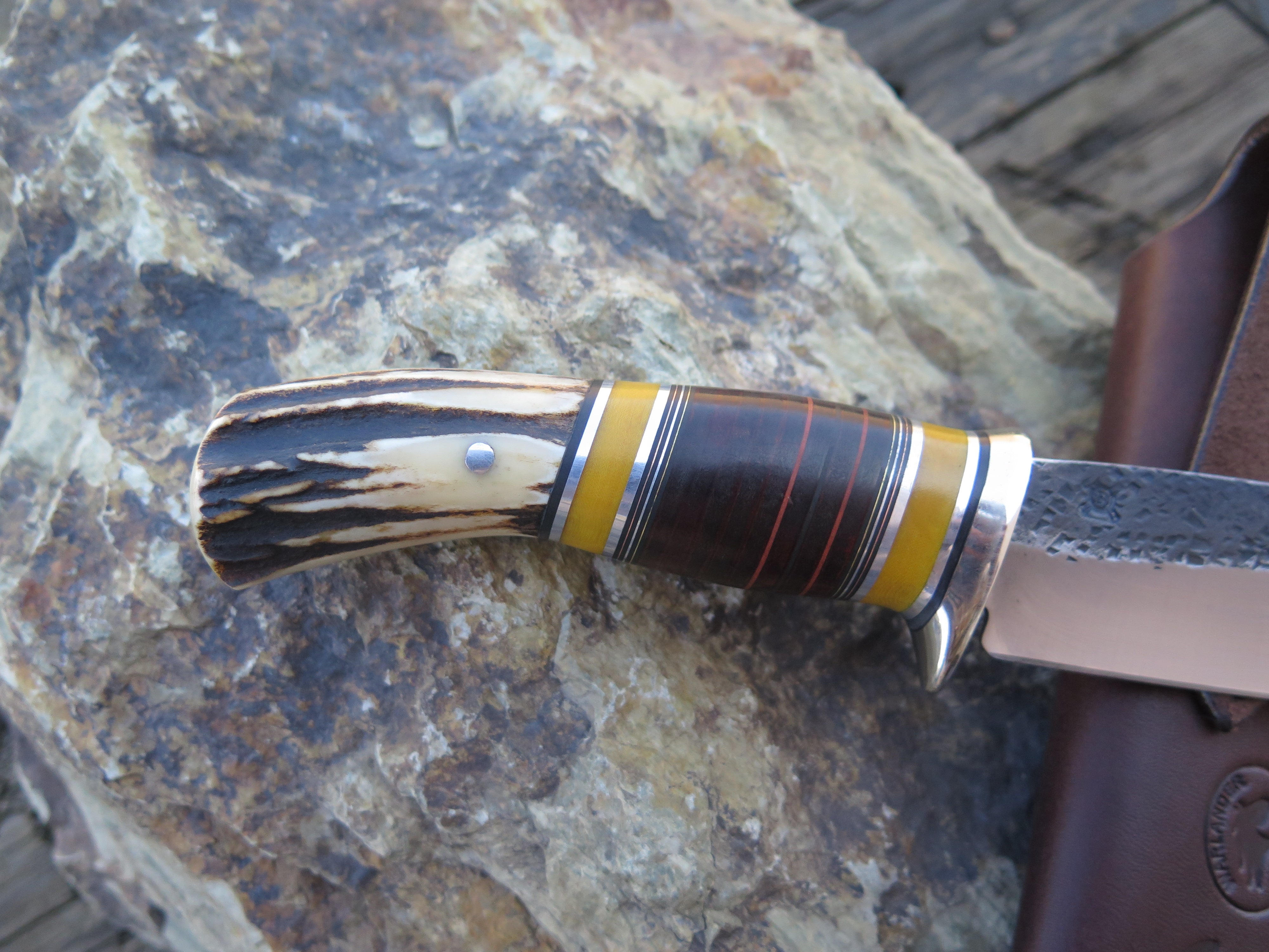 This classic Drop Point from Behring Made© is hand forged from 3/16" thick high carbon 01 tool steel and it measures 5 1/2" from tip to guard with a razor sharp hollow grind and our hammermark finish. The nickel silver guard is soldered in place above black and maroon fiber, yellow micarta, chocolate horsehide, aluminum and copper spacers as well as a premium sambar stag butt that is pinned through the tang with aluminum. The overall length measures 10" and it comes in a simple belt pouch sheath.