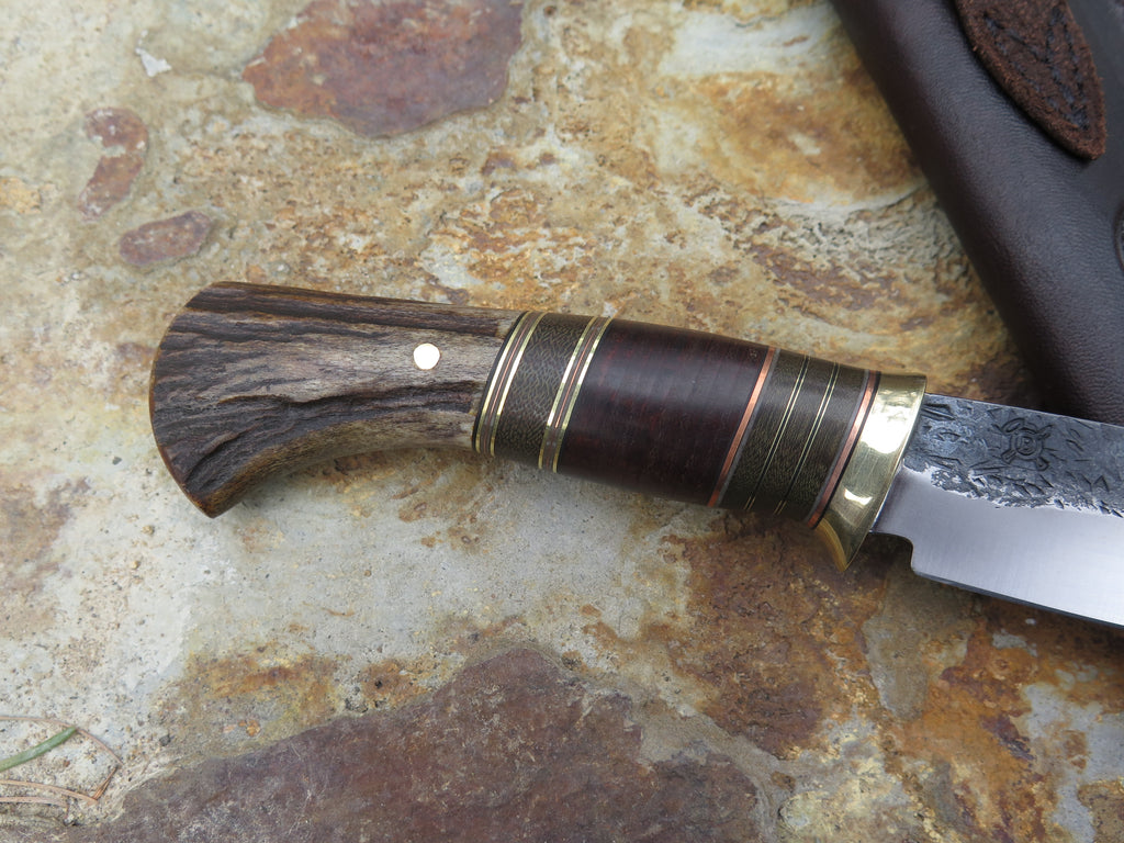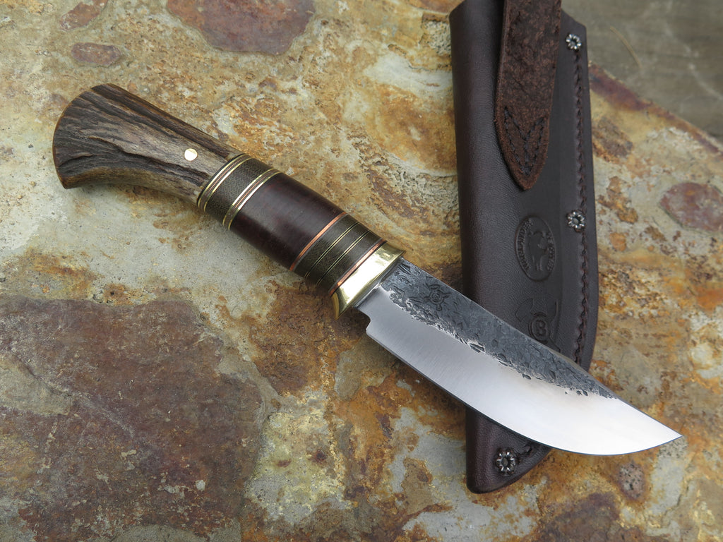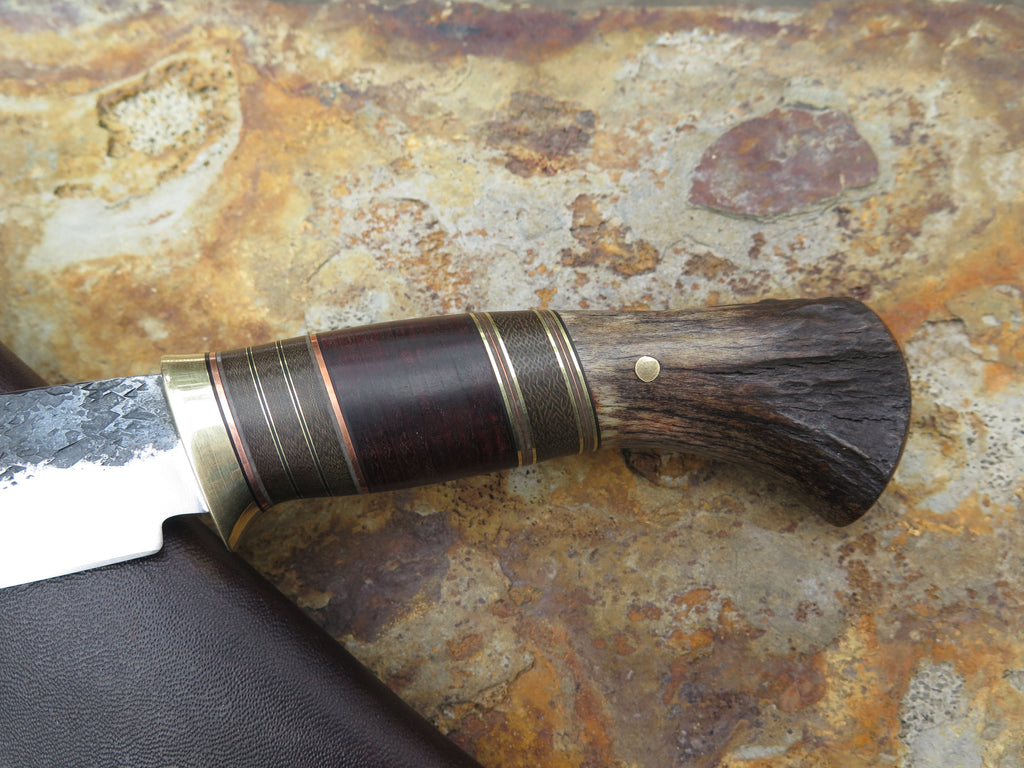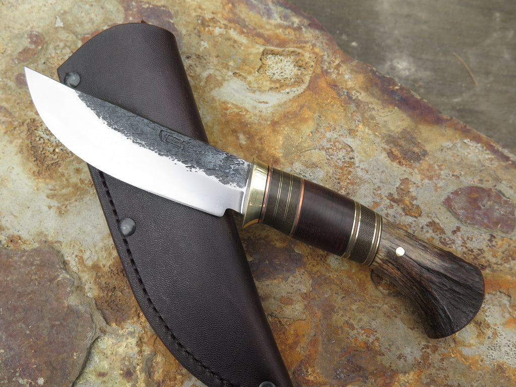 This beautiful new Clip Point from Behring Made© is hand forged from 1/8" thick high carbon 01 tool steel and it measures 4 1/4" from tip to guard with a razor sharp hollow grind and our hammermark finish. The brass guard is soldered in place above black and gray fiber, green micarta, copper, brass and horsehide spacers as well as a shiras moose butt that we pinned with brass. The overall length measures 8 1/2" and it comes in a classic leather belt pouch sheath.
