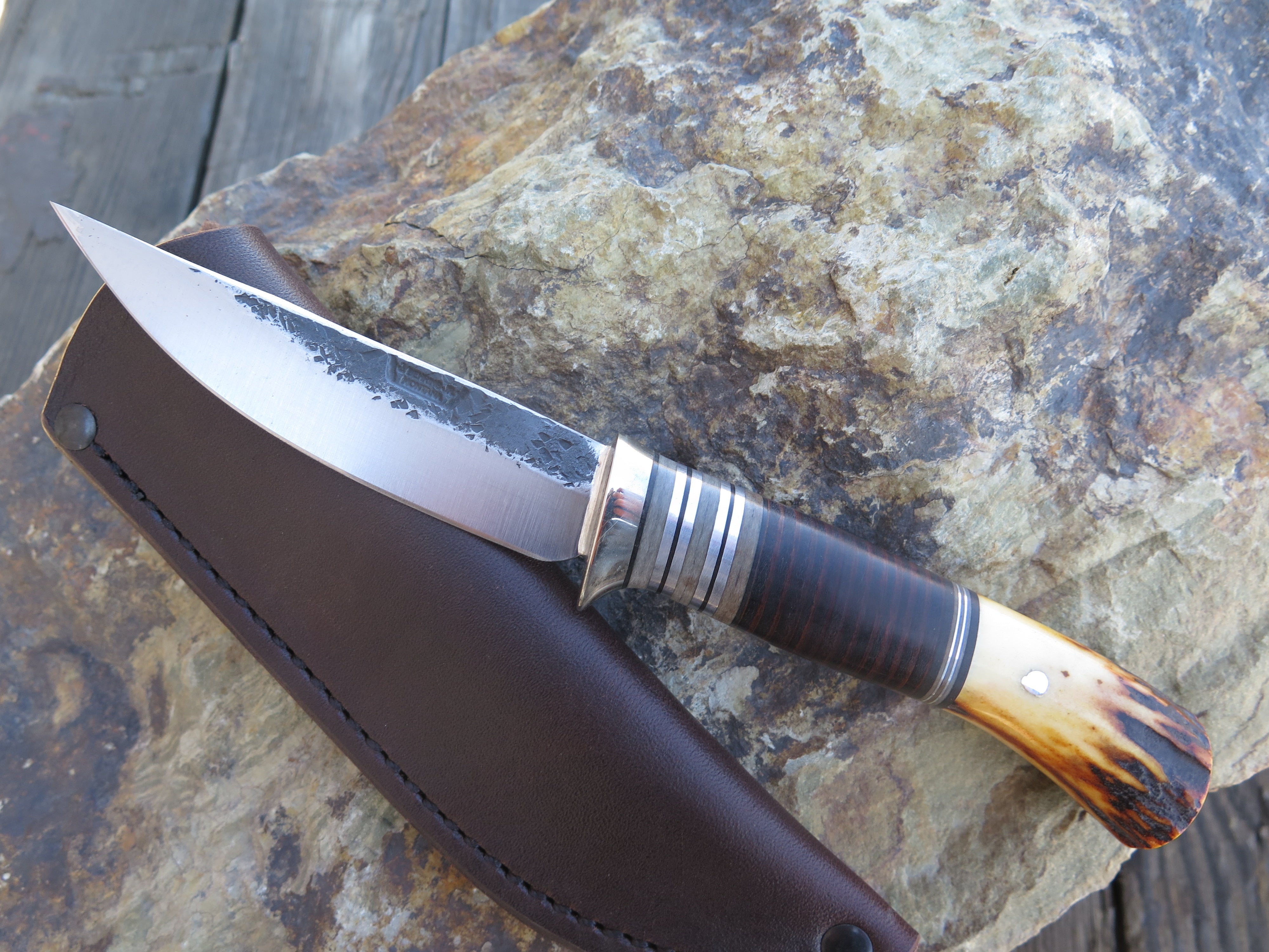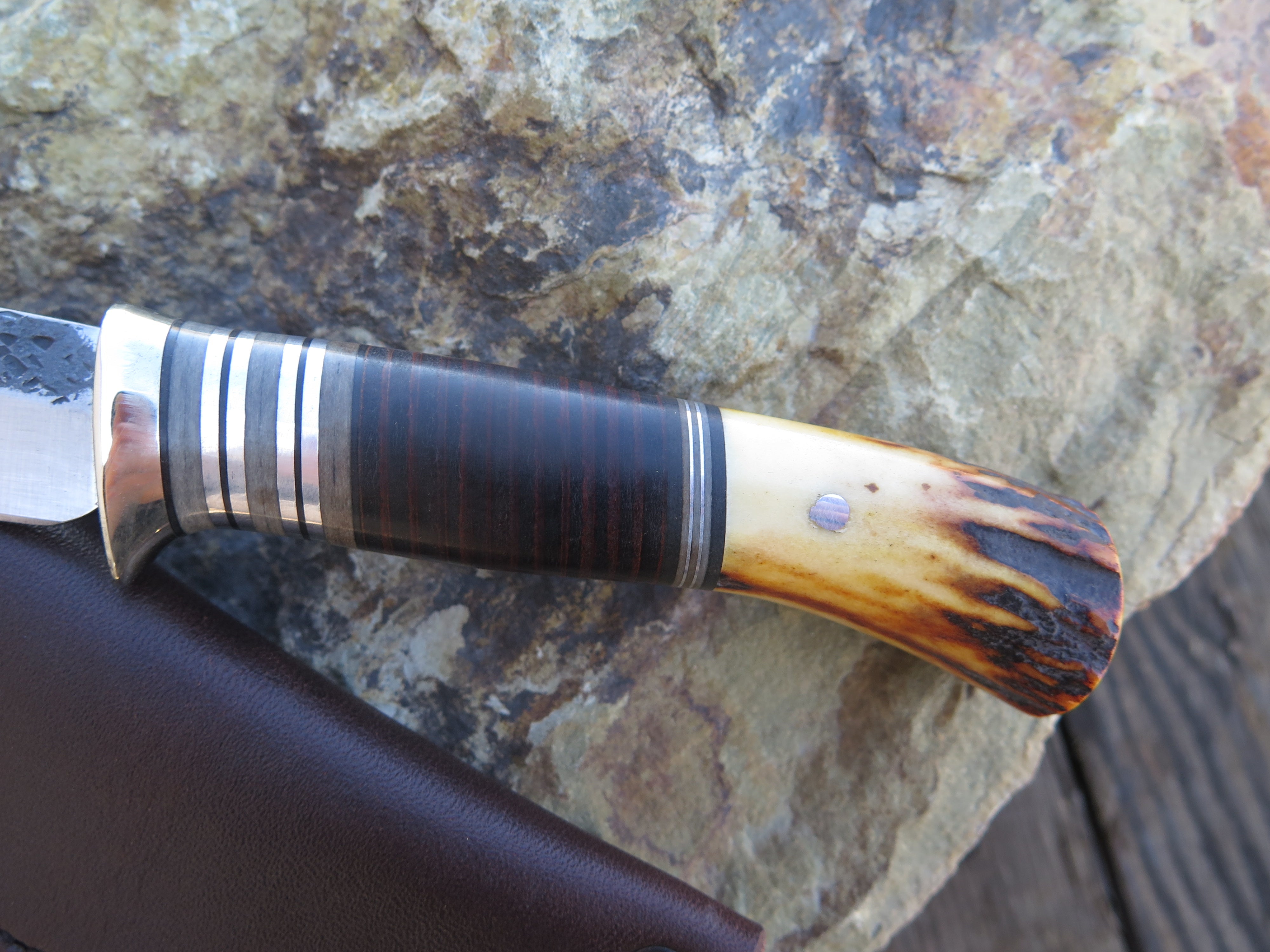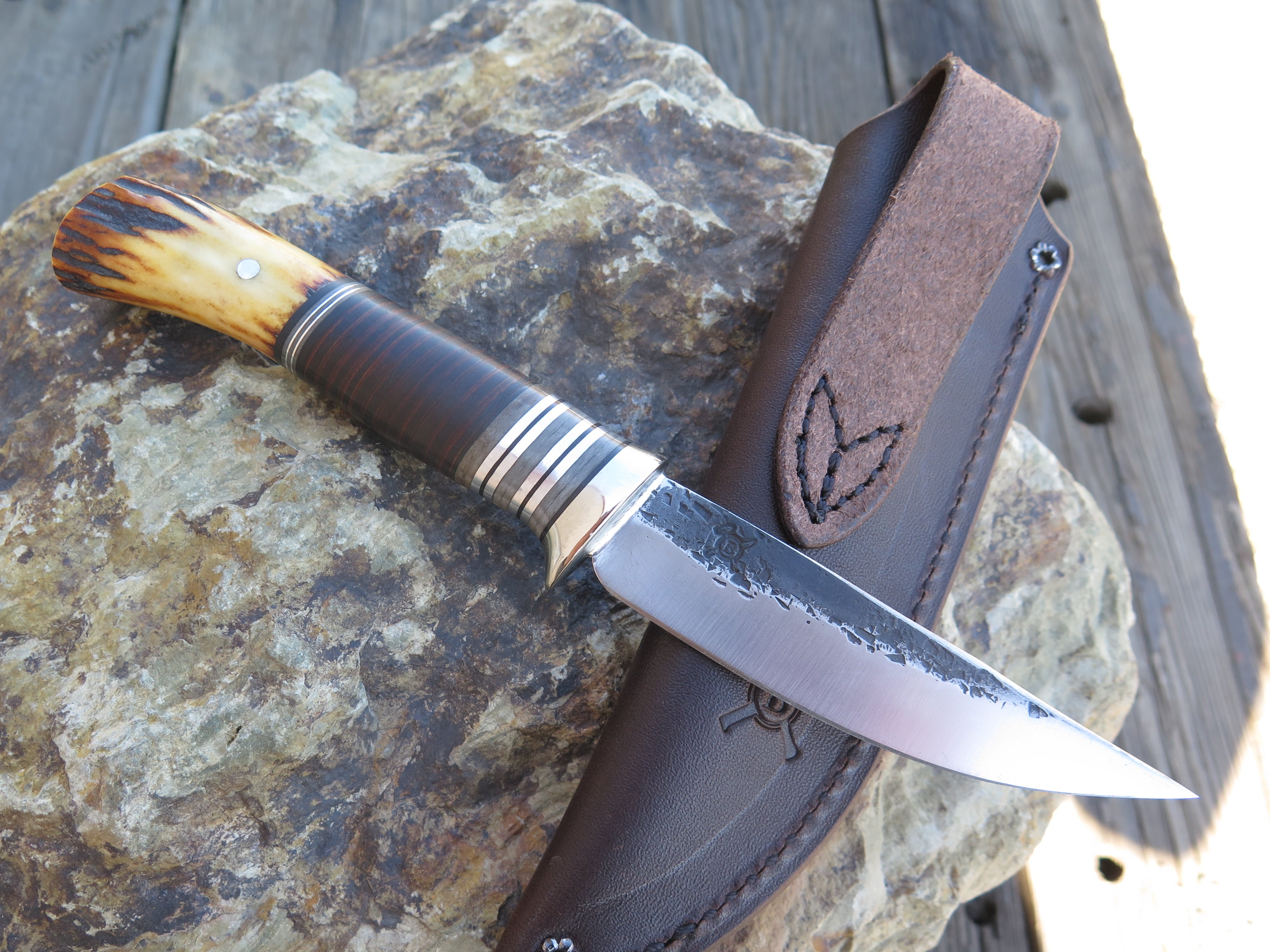This ever-classic Pintail from Behring Made© is hand forged from 1/8" thick high carbon 01 tool steel and it measures 3 3/4" from tip to guard with a razor sharp hollow grind and our hammermark finish. From rainbow trout to whitetails and everything in between, this blade shape is a remarkable user. The nickel silver guard is soldered in place above black and gray fiber, aluminum and chocolate horsehide leather spacers on top of a beautiful sambar stag butt that's pinned with aluminum. The overall length measures 8" and it comes in a simple pouch sheath for wear on the belt. Lefty sheaths available for a free swap!
