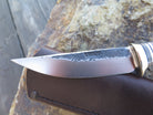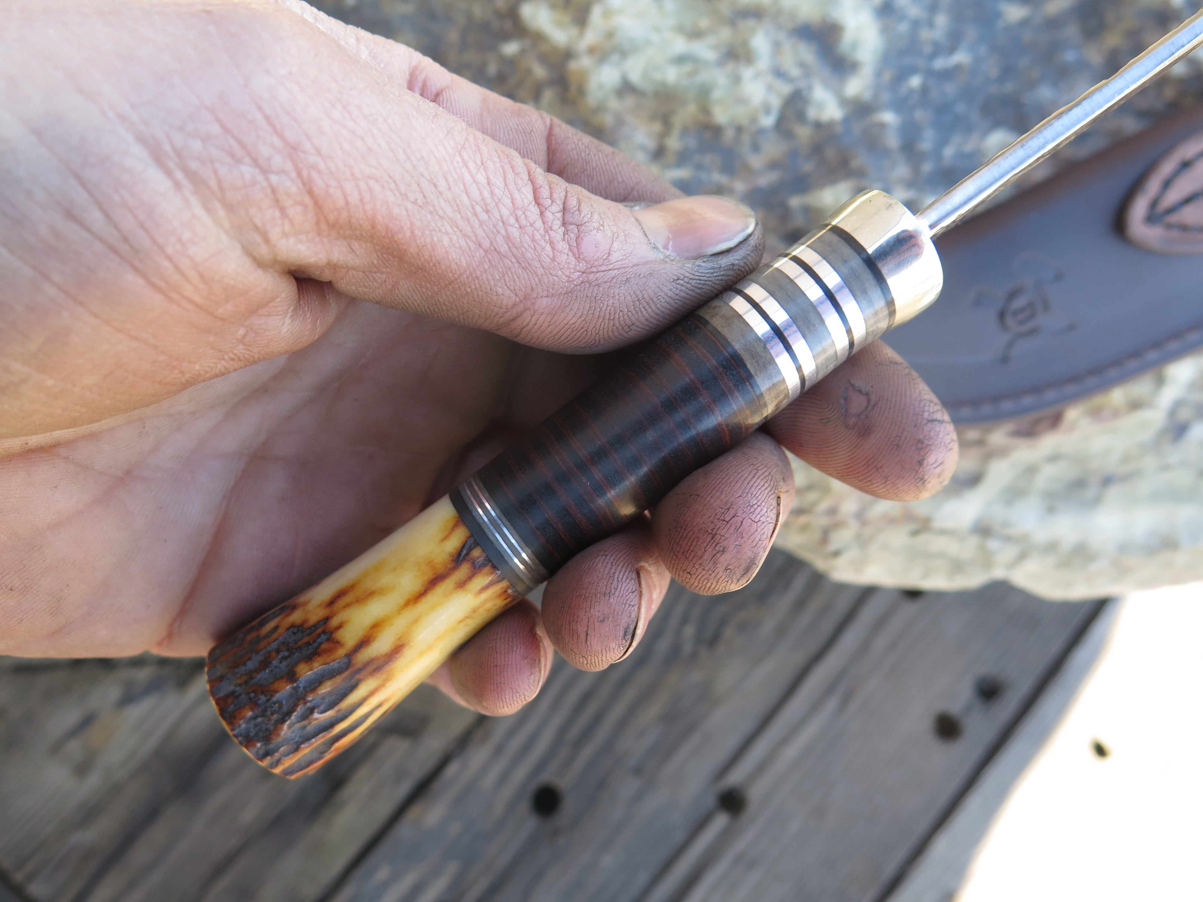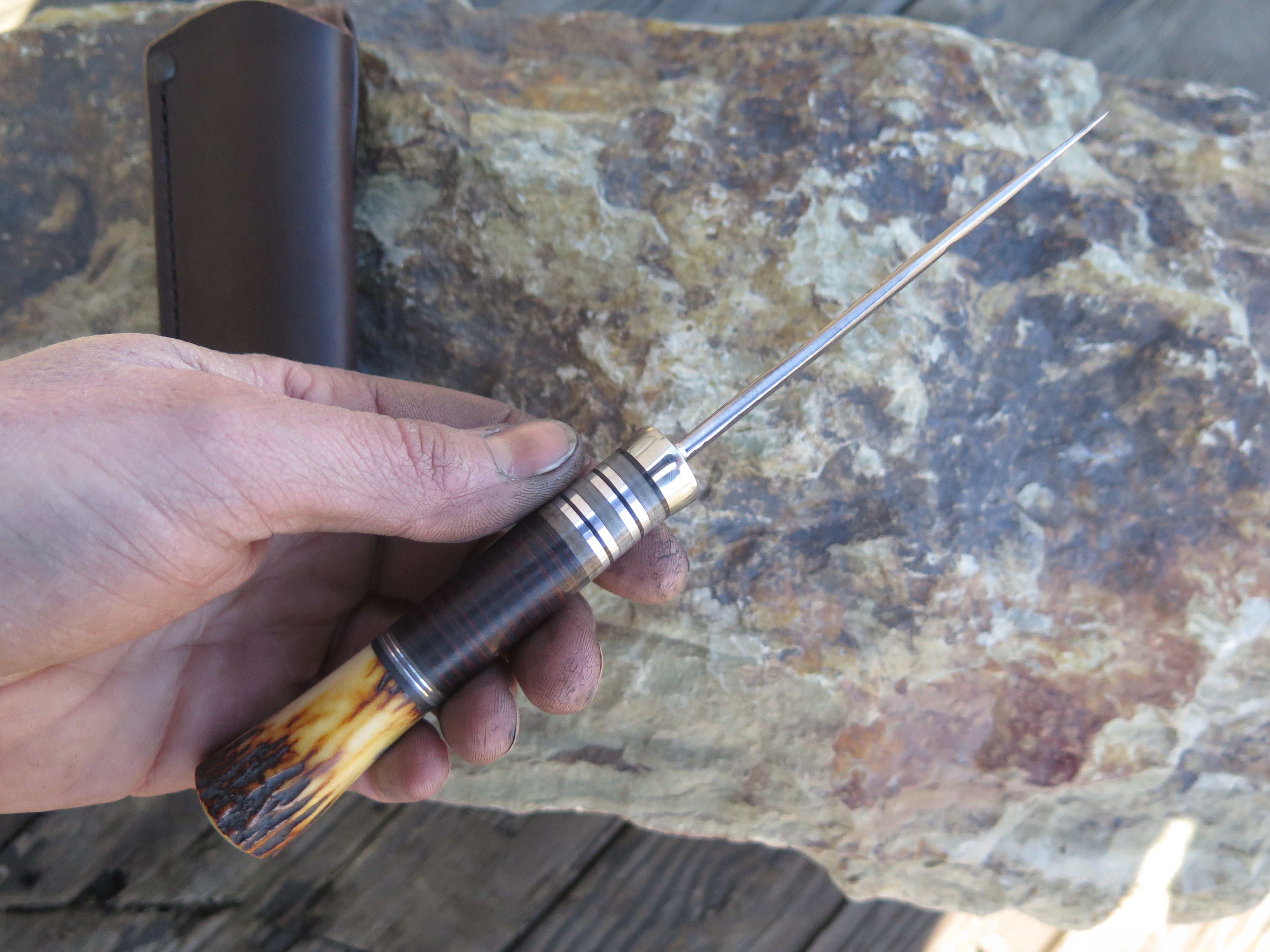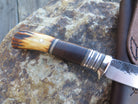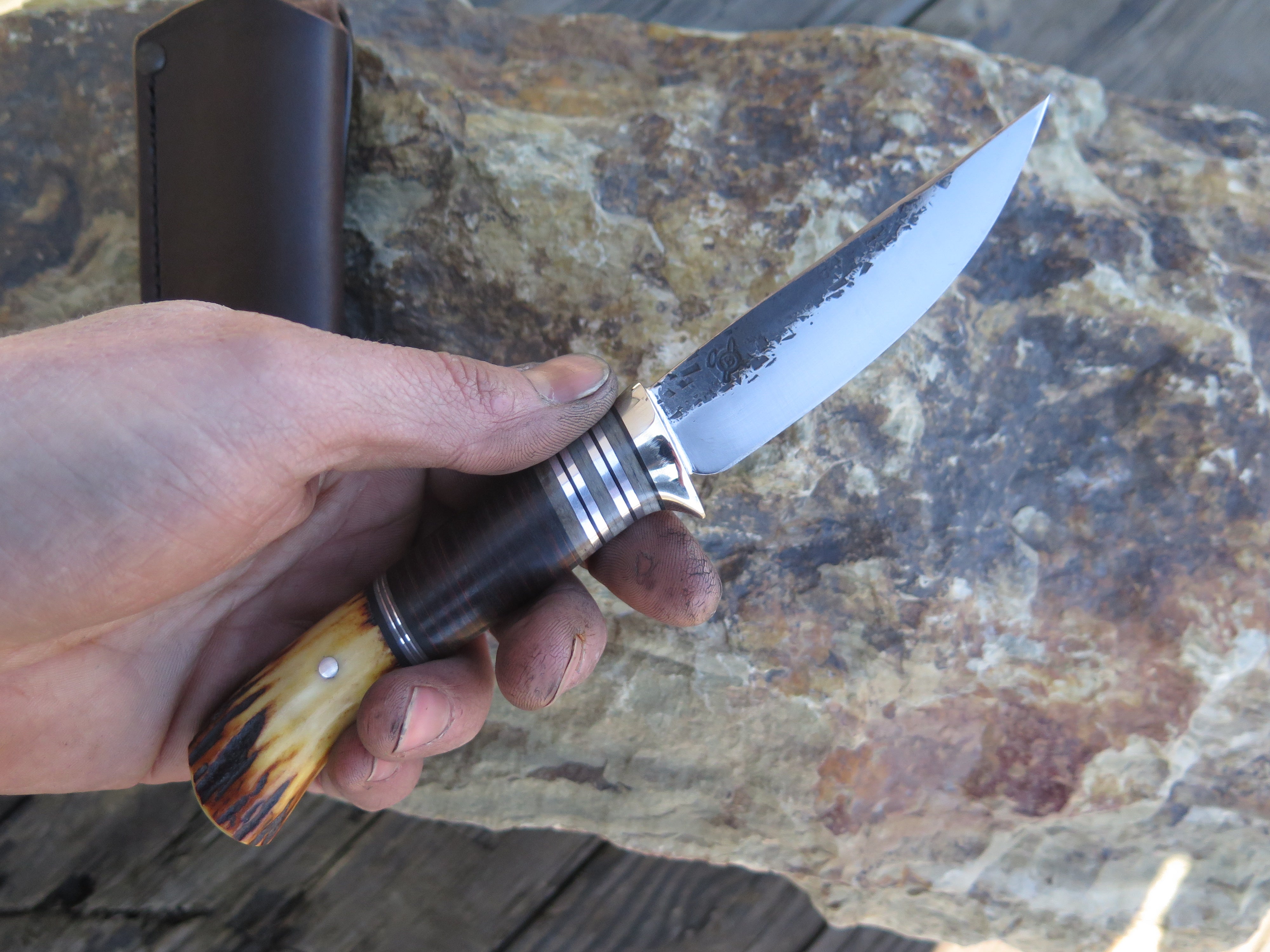 This ever-classic Pintail from Behring Made© is hand forged from 1/8" thick high carbon 01 tool steel and it measures 3 3/4" from tip to guard with a razor sharp hollow grind and our hammermark finish. From rainbow trout to whitetails and everything in between, this blade shape is a remarkable user. The nickel silver guard is soldered in place above black and gray fiber, aluminum and chocolate horsehide leather spacers on top of a beautiful sambar stag butt that's pinned with aluminum. The overall length measures 8" and it comes in a simple pouch sheath for wear on the belt. Lefty sheaths available for a free swap!