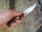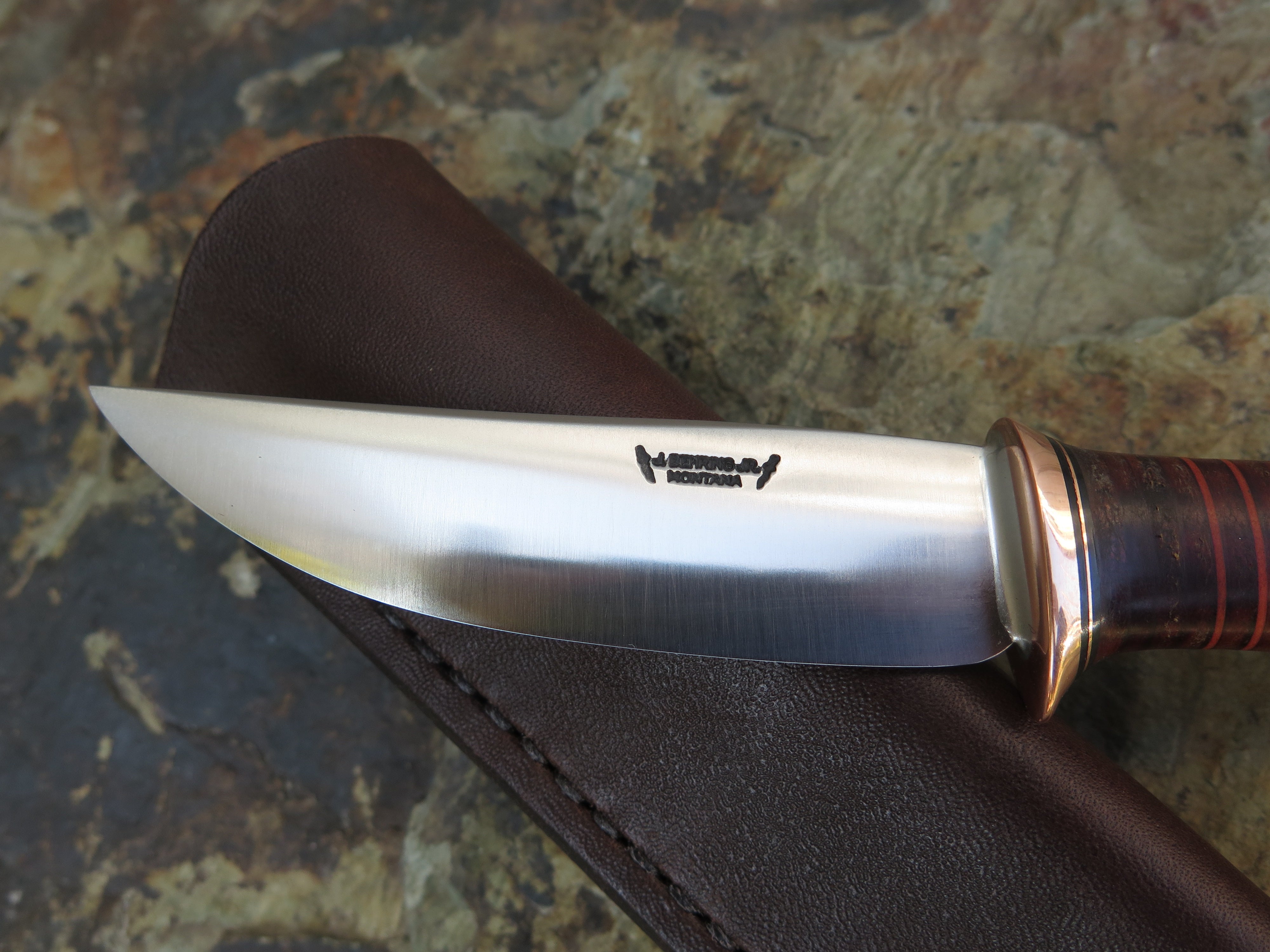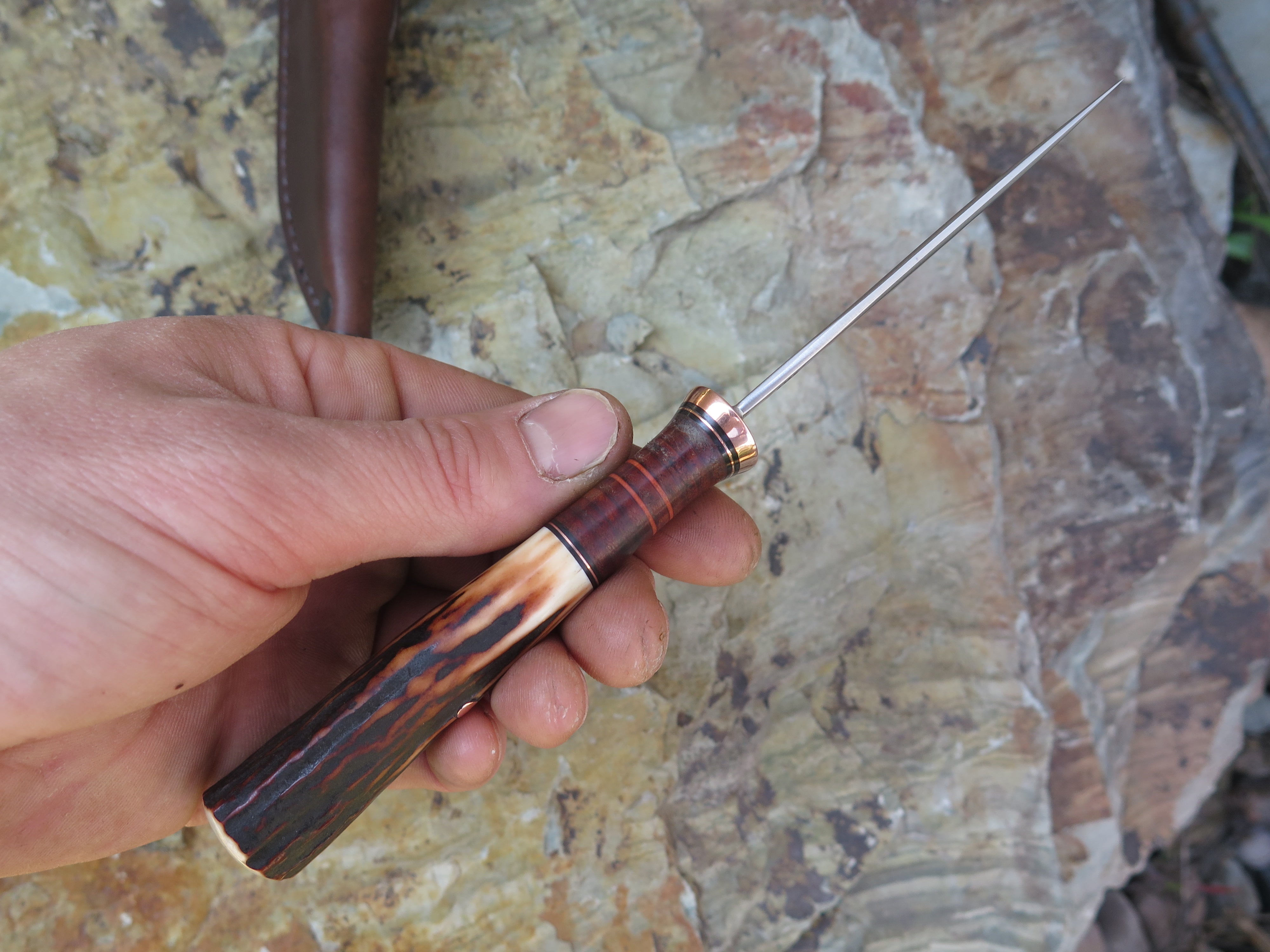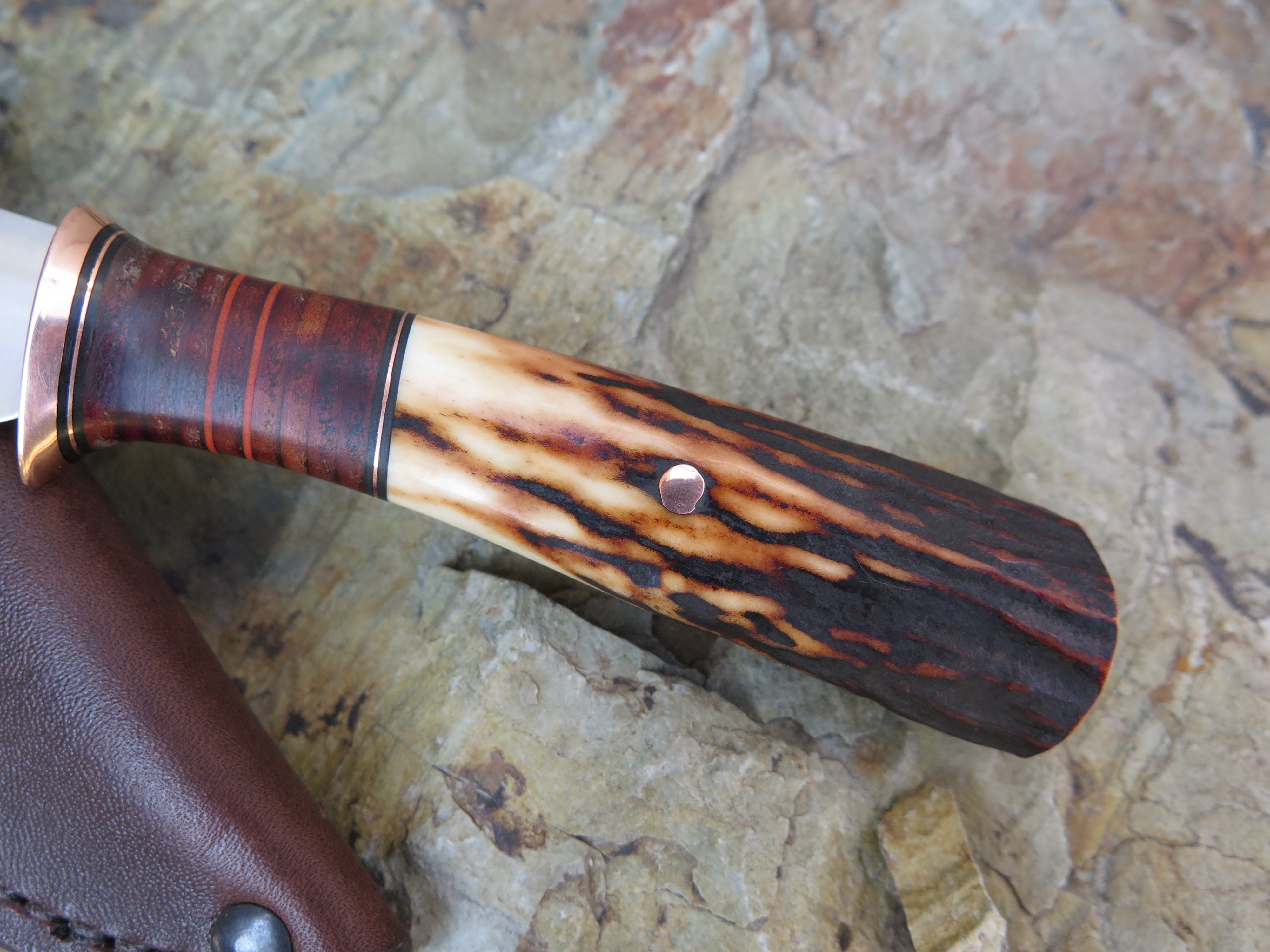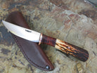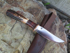 This Behring Made© Pintail is the perfect every day carry! The 1/8" thick high carbon 01 tool steel blade is hand forged and measures 3 1/2" from tip to guard with a razor sharp convex grind. The copper guard is hand soldered above black, maroon, horsehide and copper spacers, and the hand selected sambar stag handle brings the overall length to 7 31/2". It's a perfect field companion, and it ships in a Warlander Leather belt pouch.