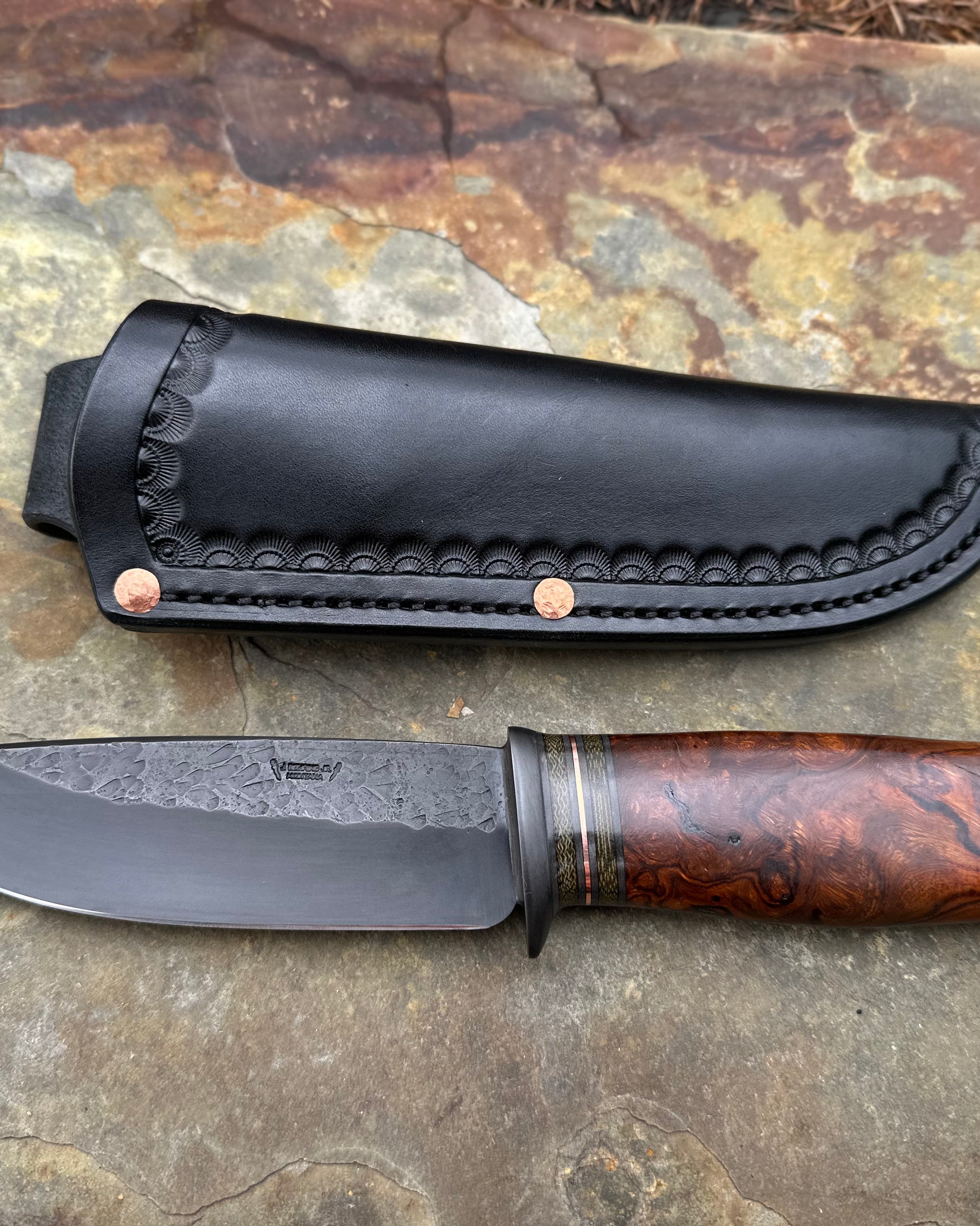 This new pocket knife from Behring Made is hand forged from 1/8" thick high carbon 01 tool steel and it measures 3" from tip to guard with a razor sharp hollow grind our hammermark finish. The brass guard is soldered in place above green micarta, black fiber, horsehide, brass and copper spacers the play beautifully with the amber colored sambar stag butt. The overall length measures a little over 6 1/2" and it comes in a custom sheath from Warlander Leather designed to be worn in the front right or rear pocket.