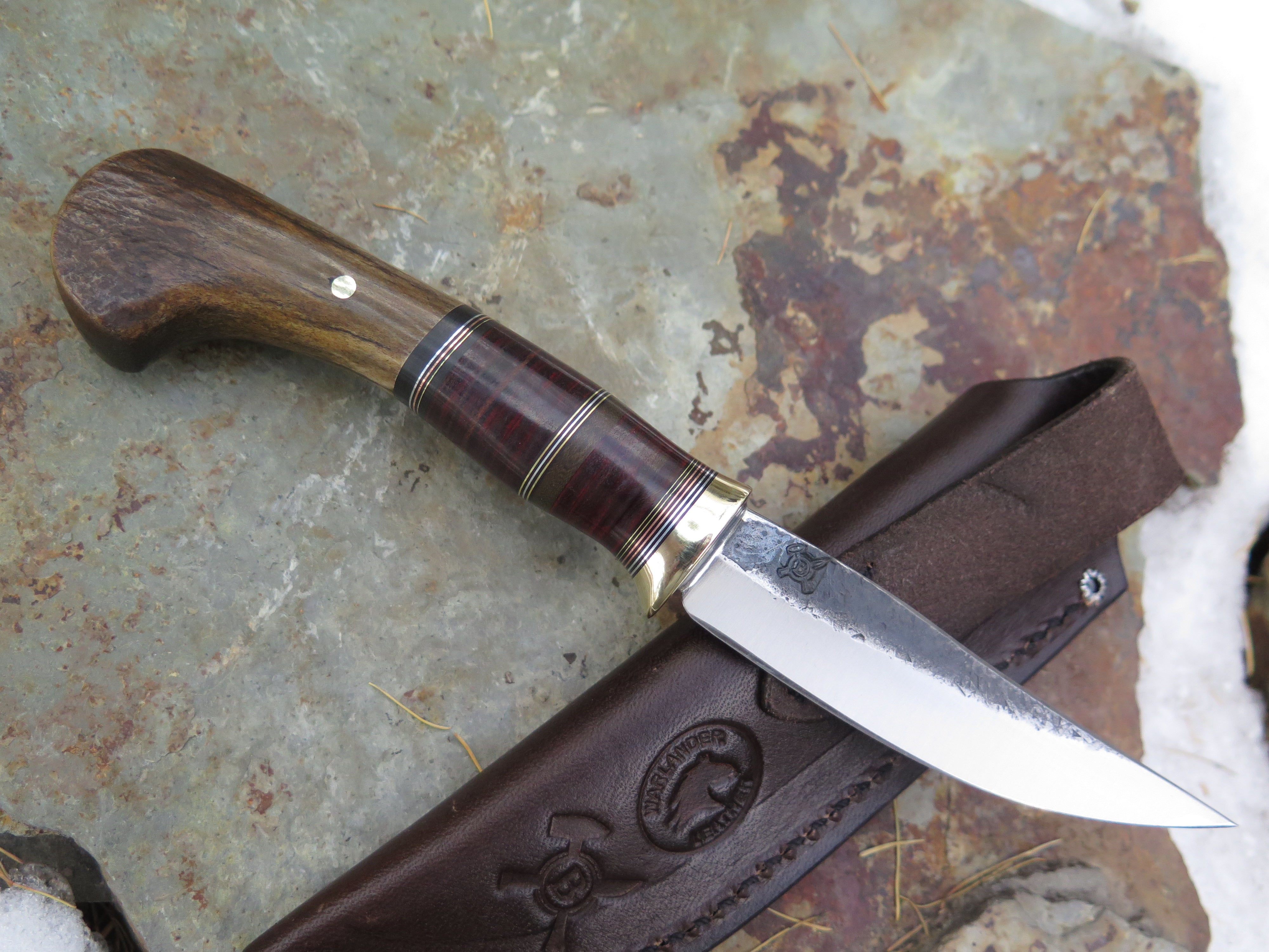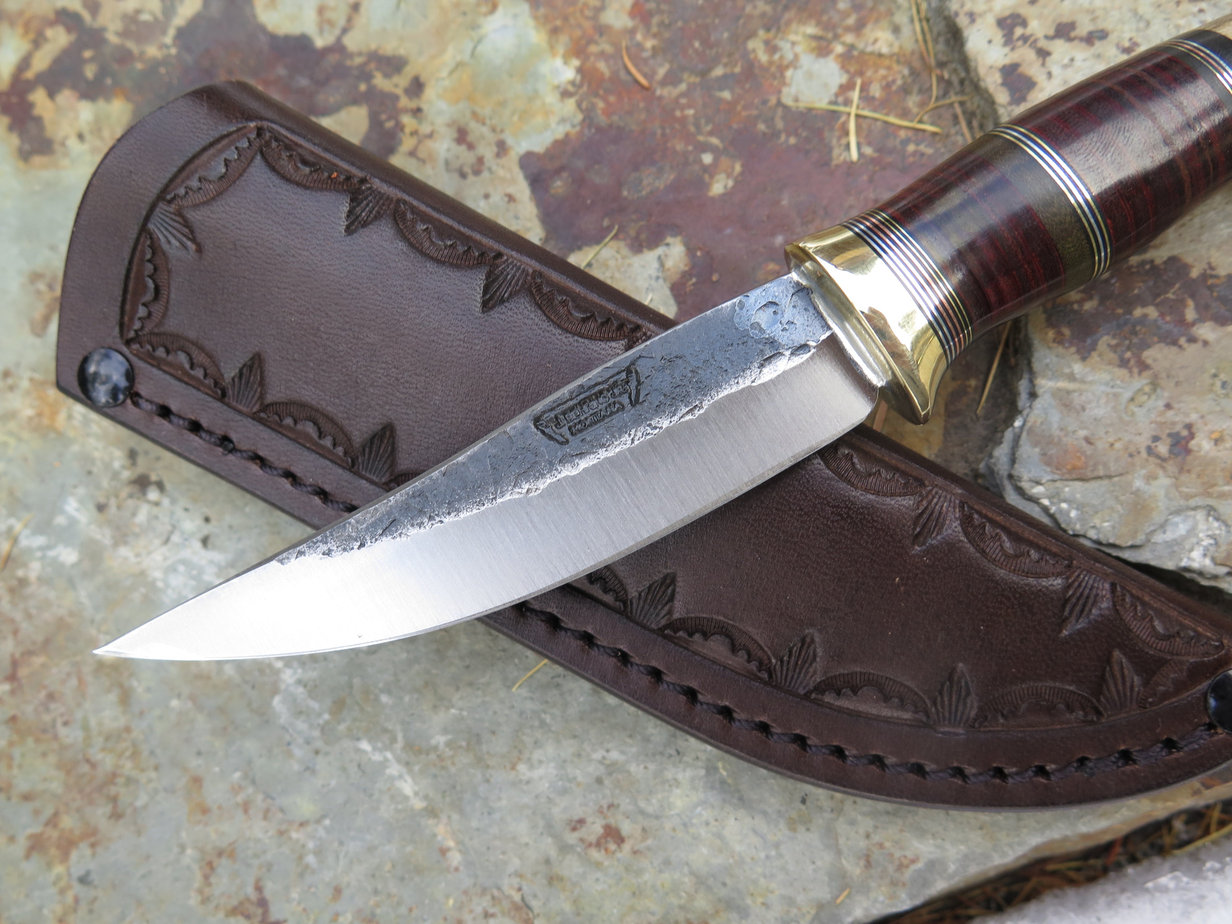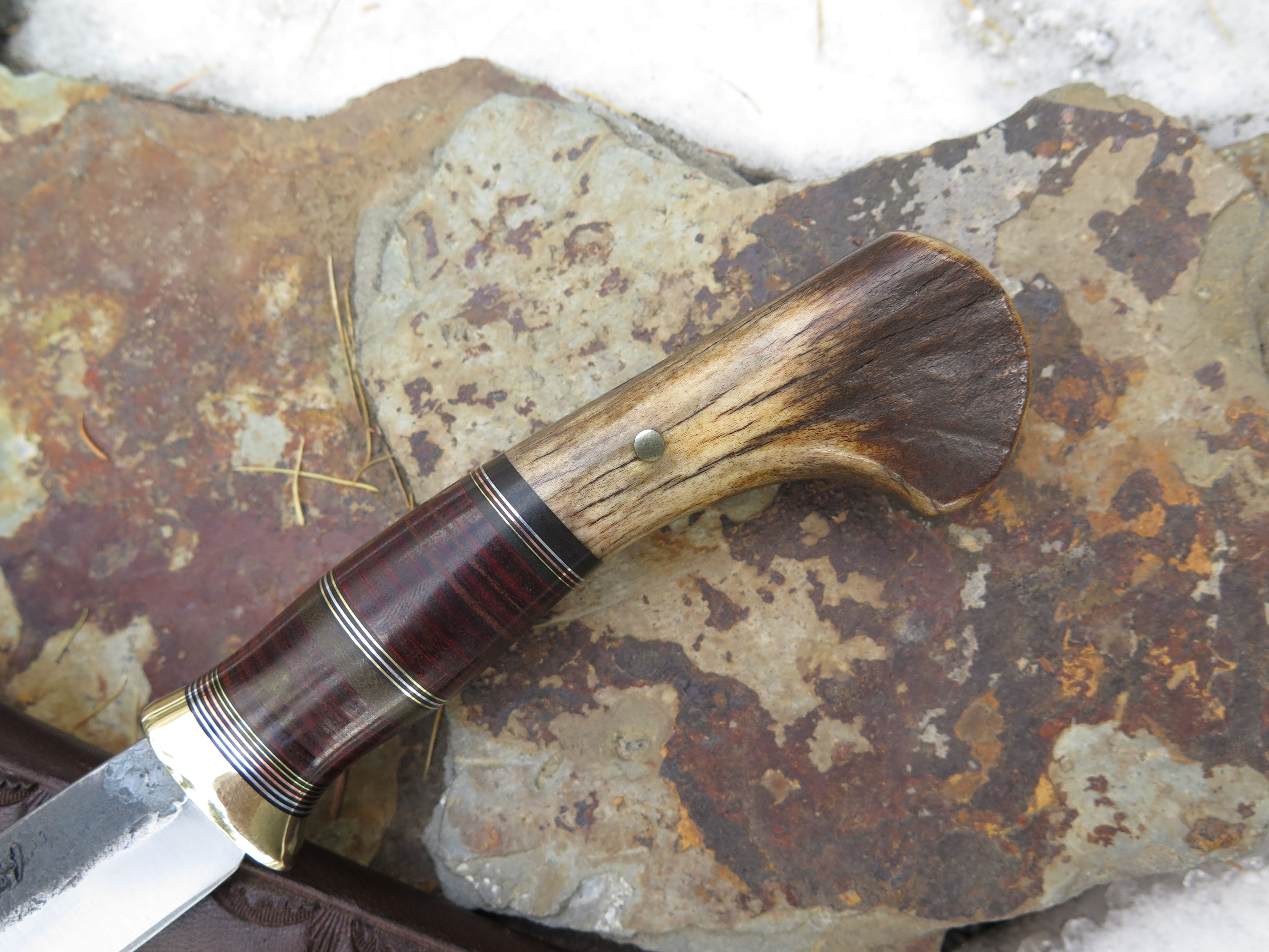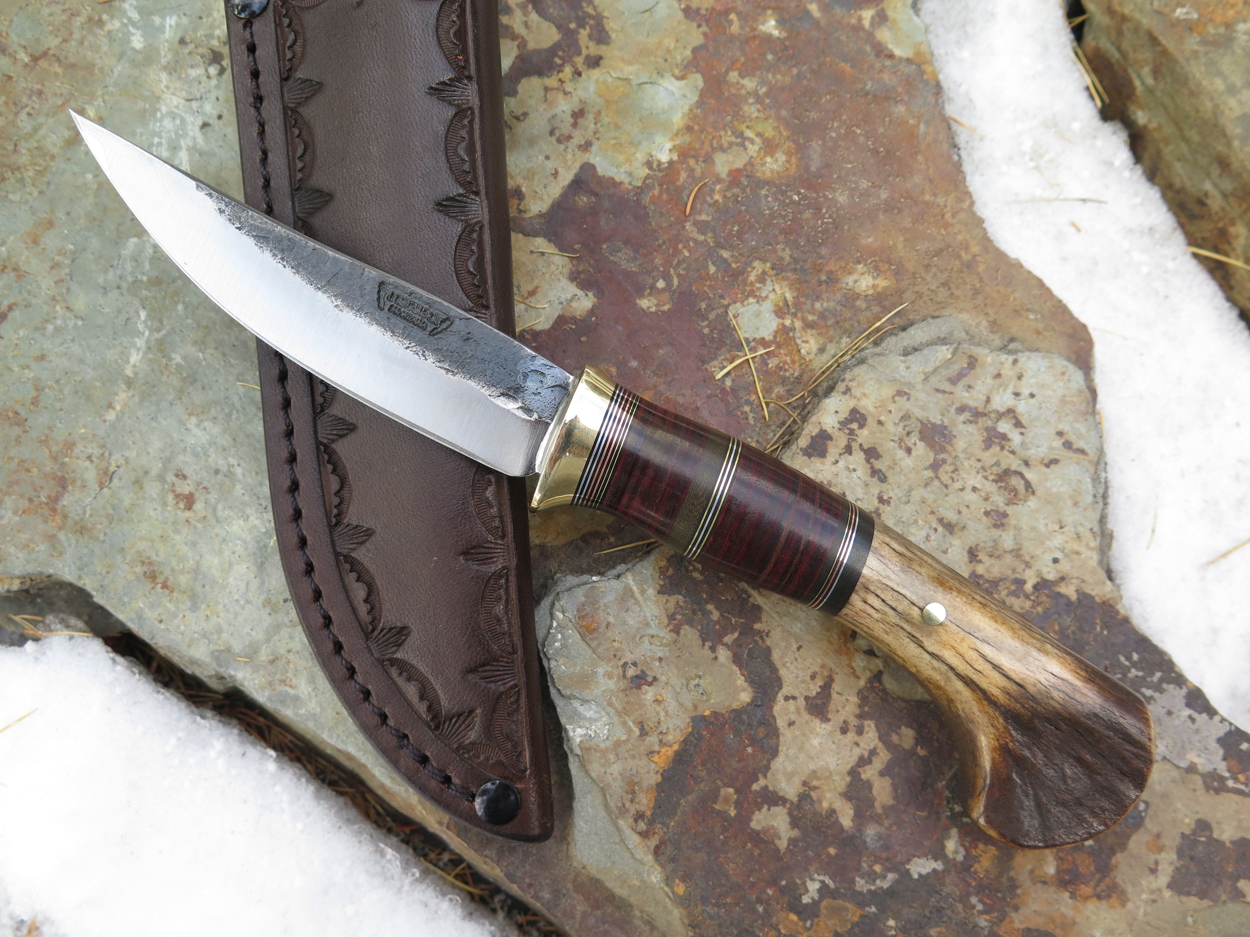 This beautiful new Pintail from Behring Made© is hand forged from 1/8" thick high carbon 01 tool steel and measures about 4" from tip to guard with a razor sharp hollow grind and our hammermark finish. The brass guard is soldered in place above black fiber, brass, copper, aluminum, green micarta and horsehide leather spacers as well as a shiras moose butt that is pinned through the tang with brass. The overall length measures 8 1/2" and it comes in the shown leather belt pouch sheath, though substitutions are available upon request.
