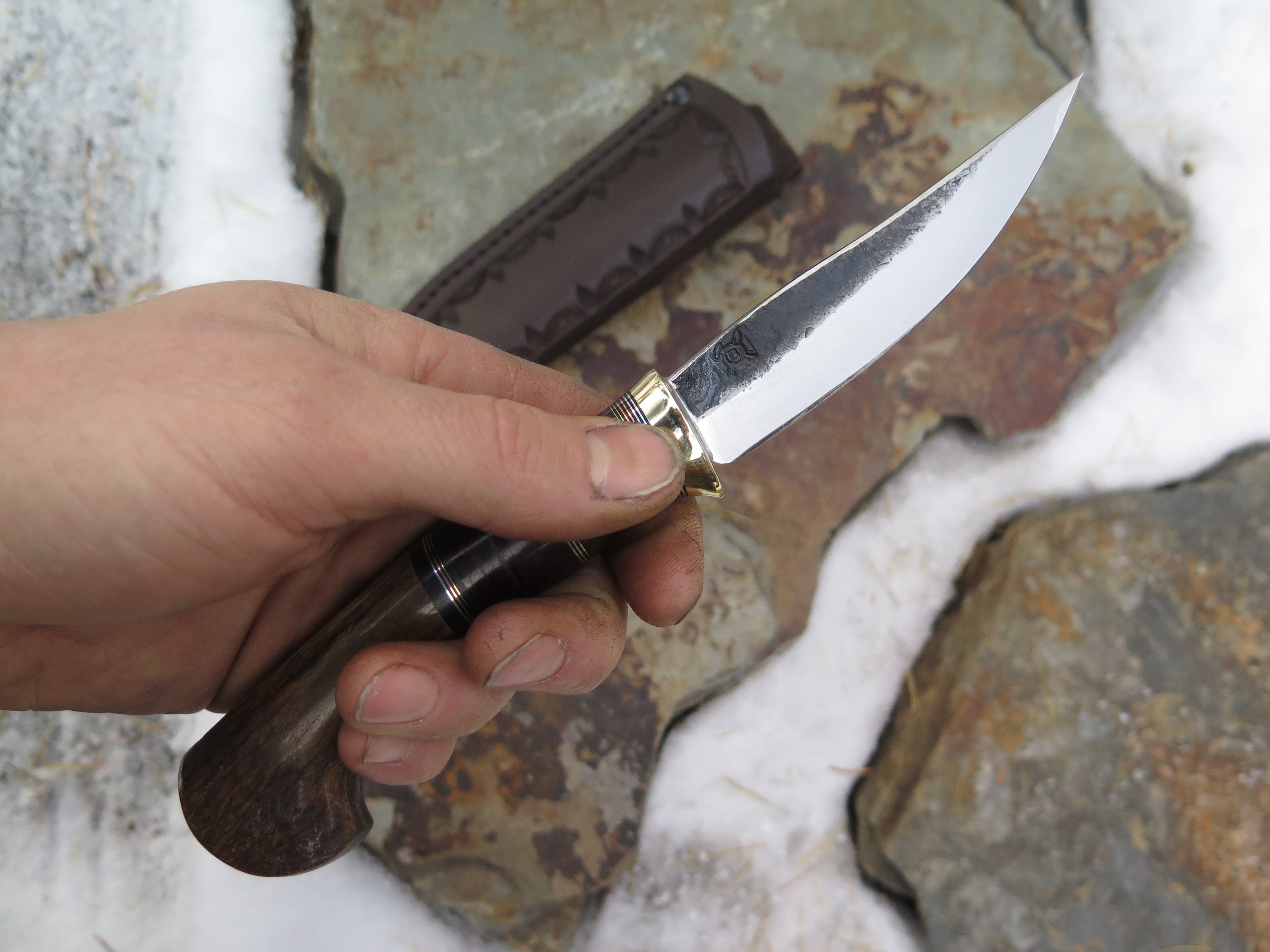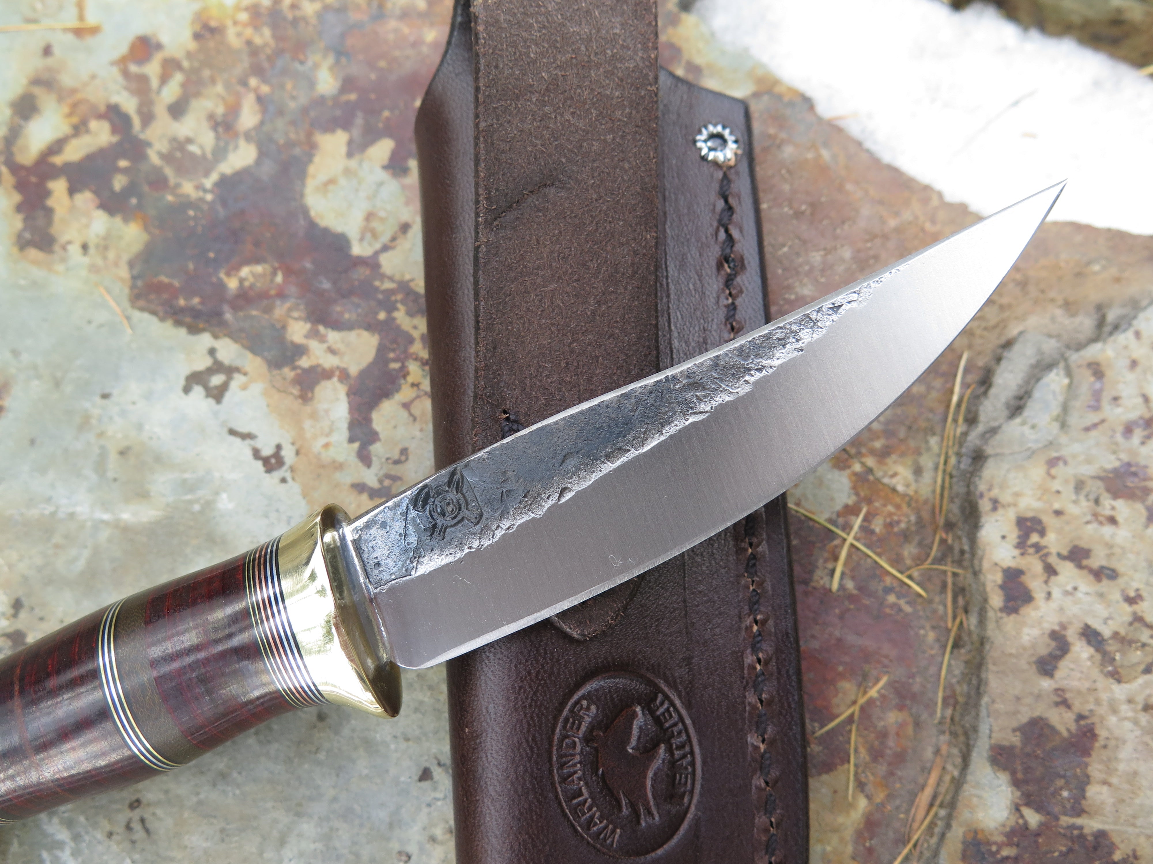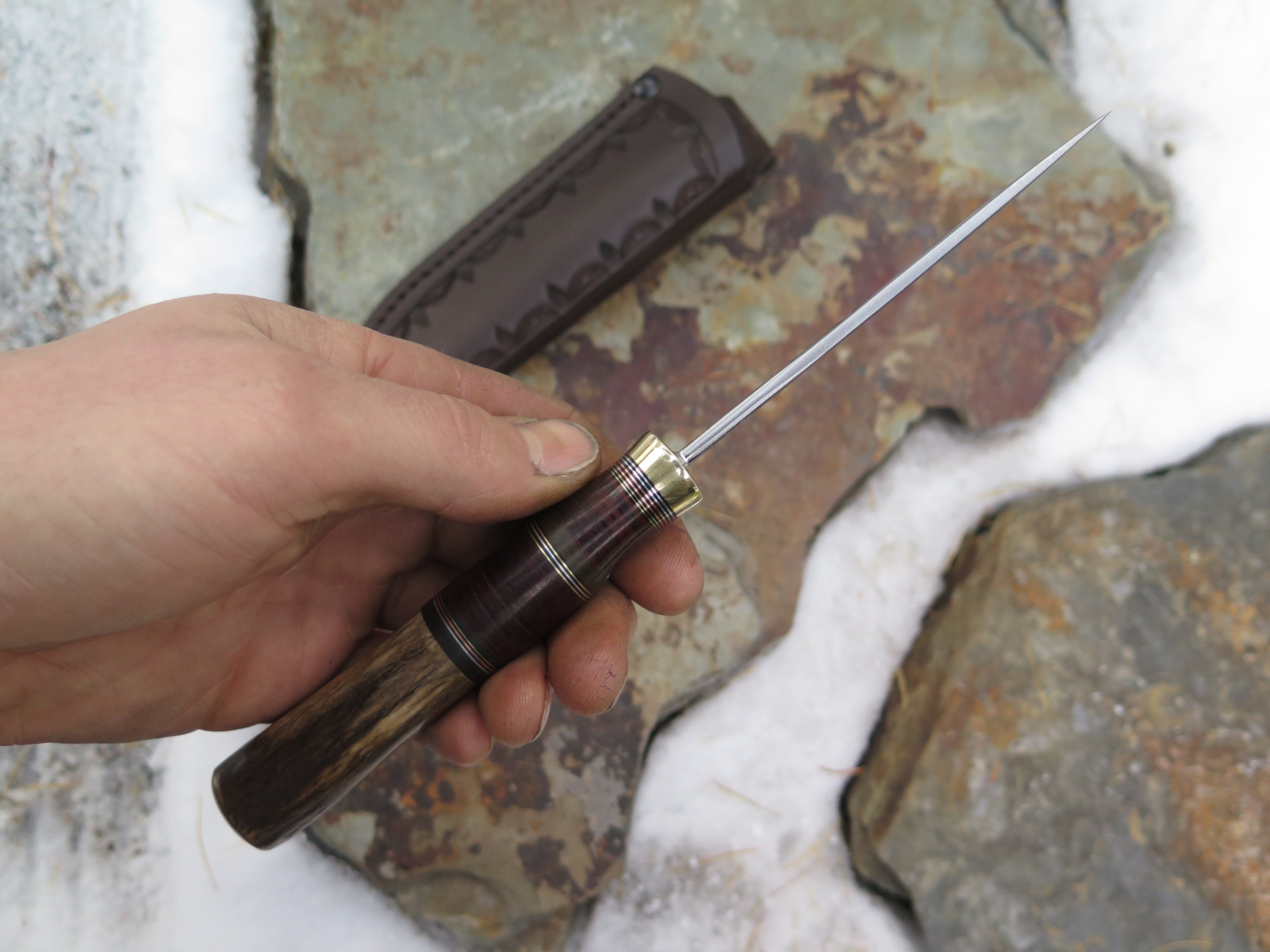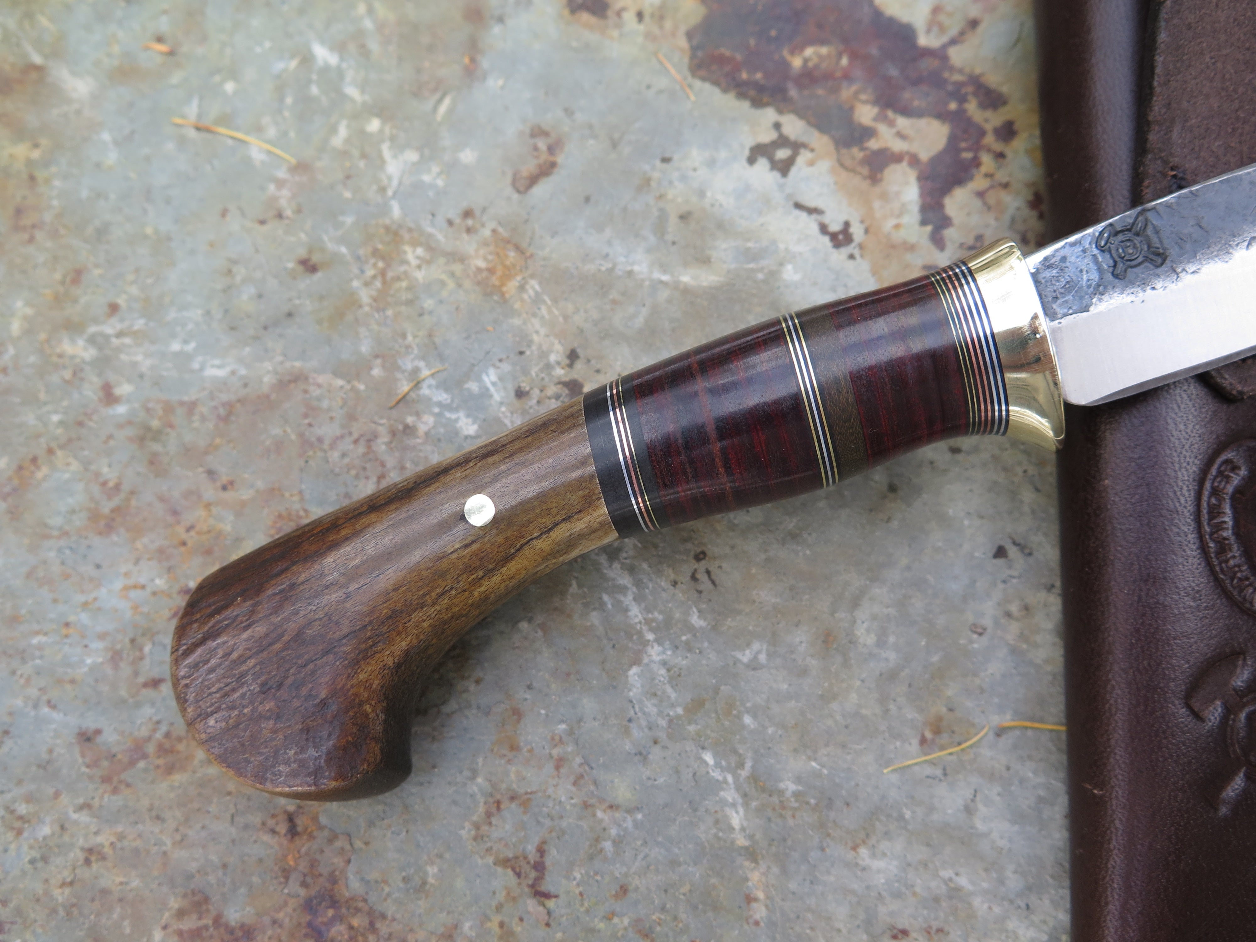 This beautiful new Pintail from Behring Made© is hand forged from 1/8" thick high carbon 01 tool steel and measures about 4" from tip to guard with a razor sharp hollow grind and our hammermark finish. The brass guard is soldered in place above black fiber, brass, copper, aluminum, green micarta and horsehide leather spacers as well as a shiras moose butt that is pinned through the tang with brass. The overall length measures 8 1/2" and it comes in the shown leather belt pouch sheath, though substitutions are available upon request.