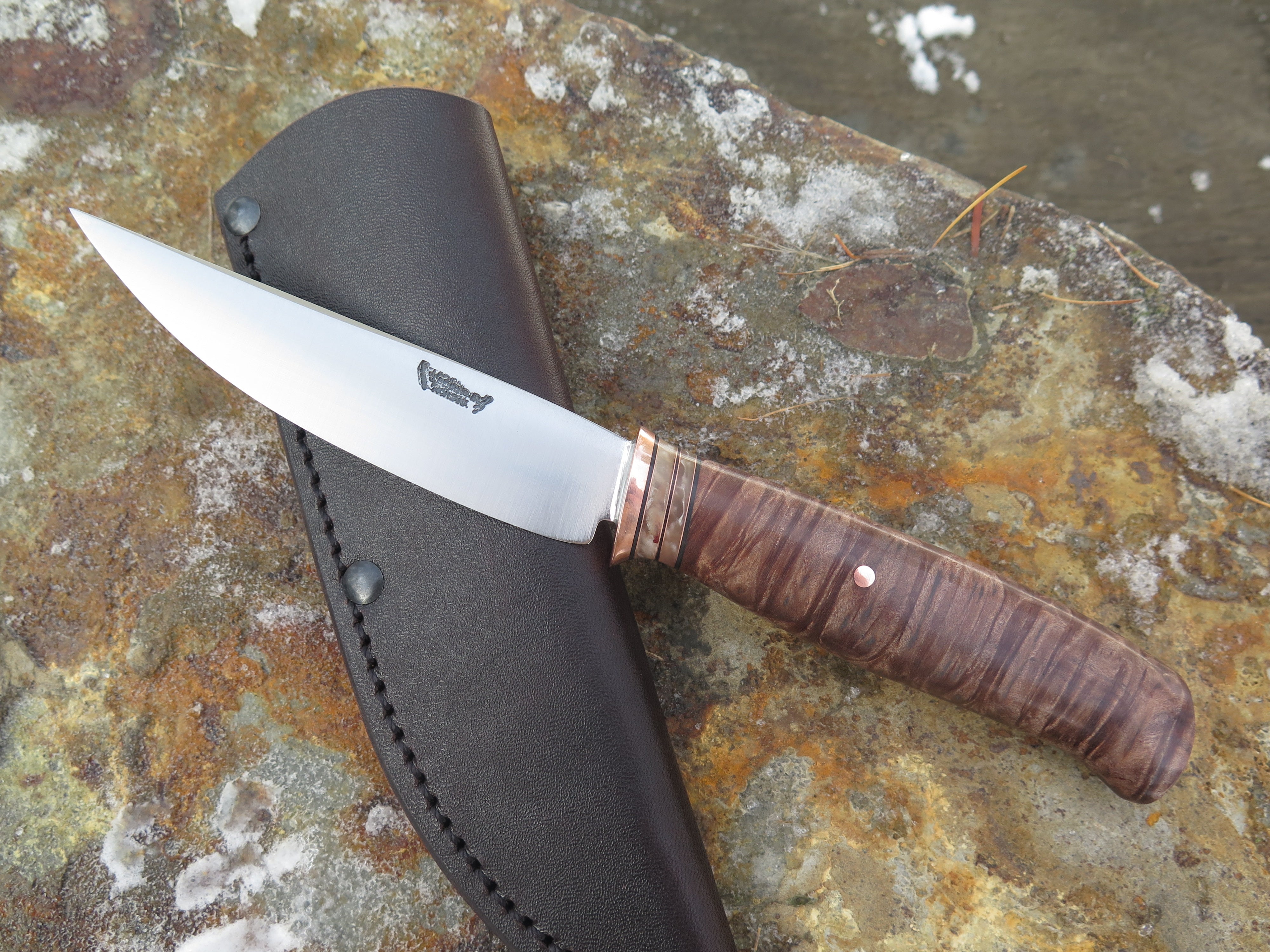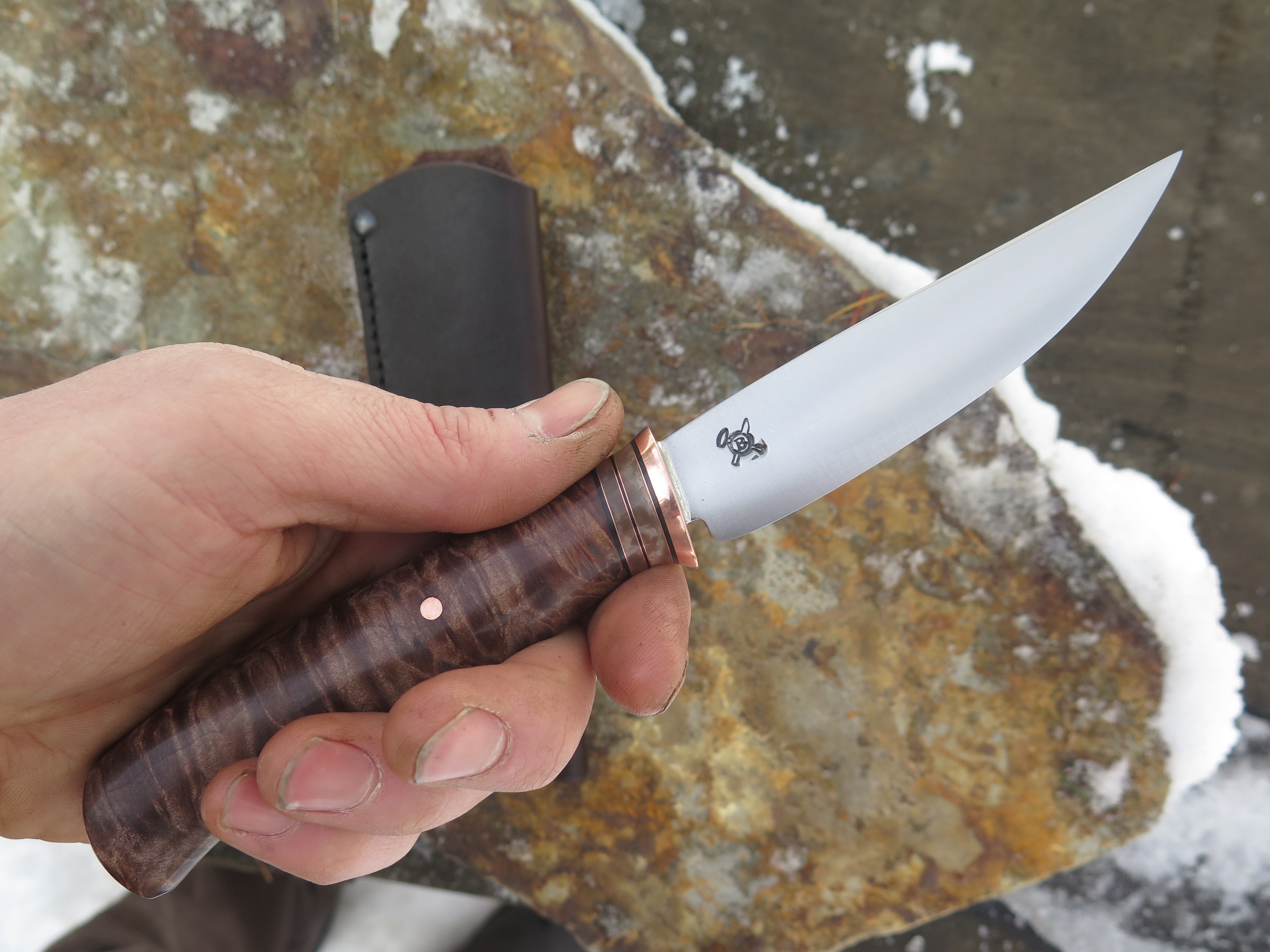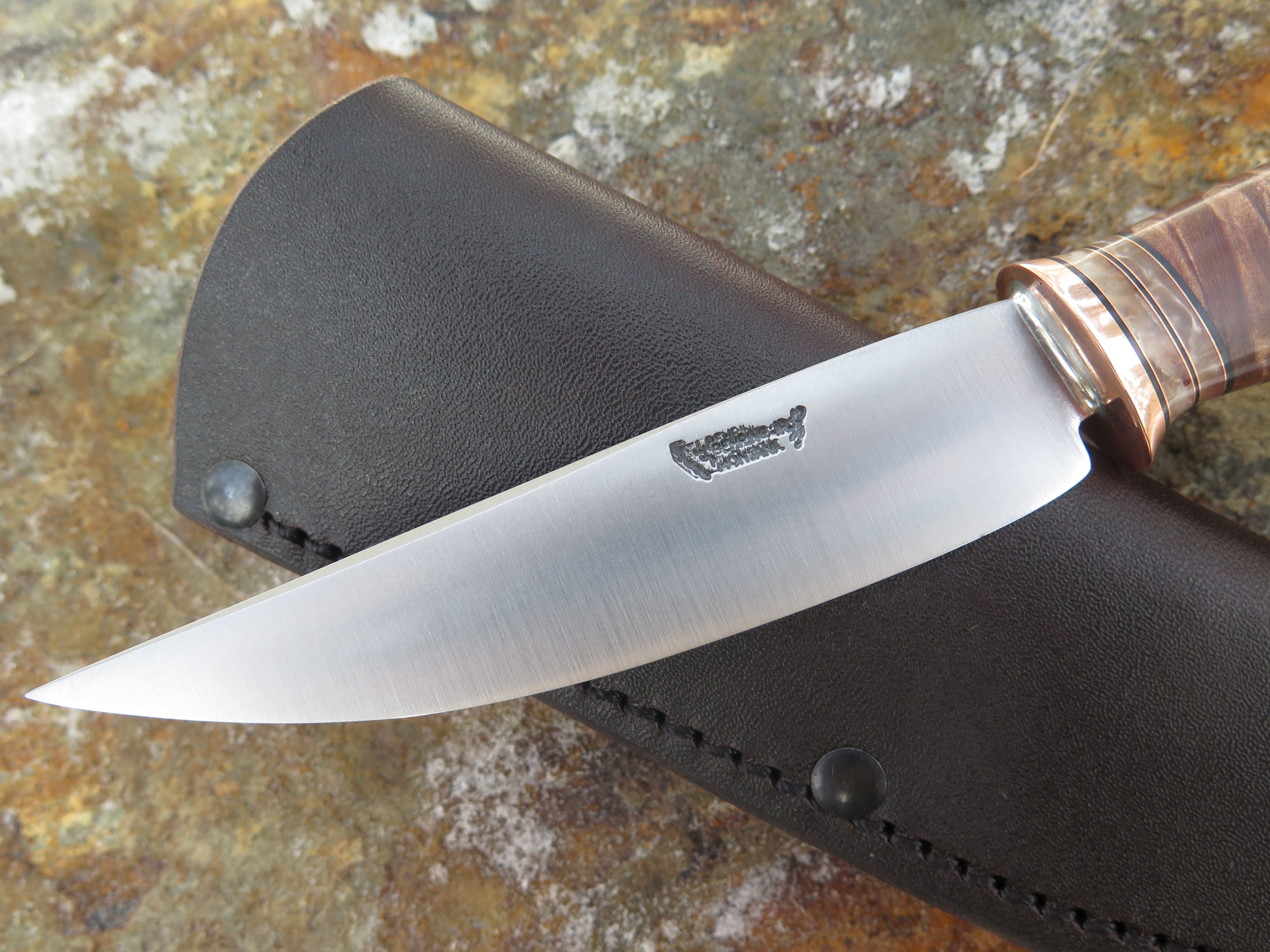 This beautiful new Pintail from Behring Made© is hand forged from 1/8" thick high carbon 01 tool steel and it measures 4 1/4" from tip to guard with a razor sharp convex grind that won't quit. The copper guard is soldered in place above black fiber, copper and two musk ox boss spacers in addition to an outstanding spalted maple handle that's pinned through the tang with copper. The overall length measures 8 5/8" and it comes in a classic leather belt pouch sheath.