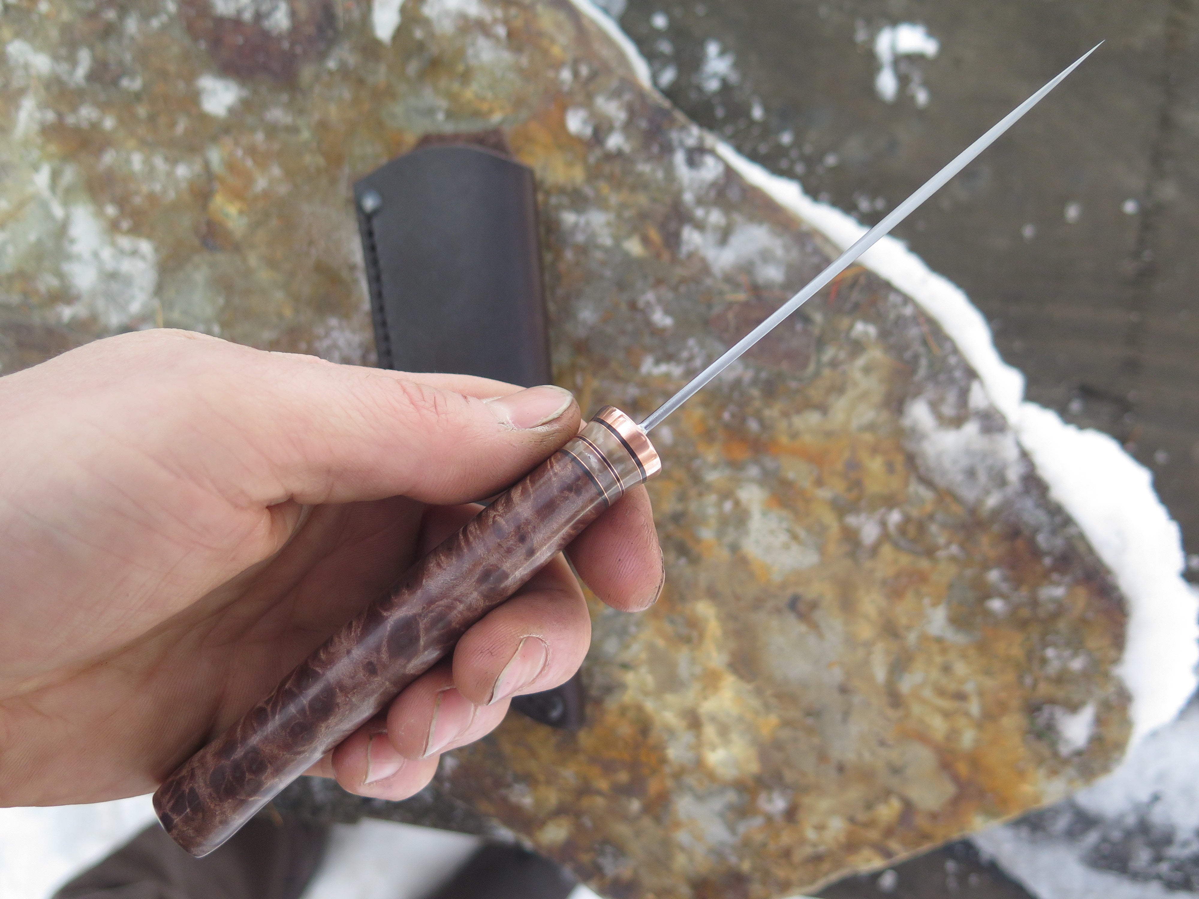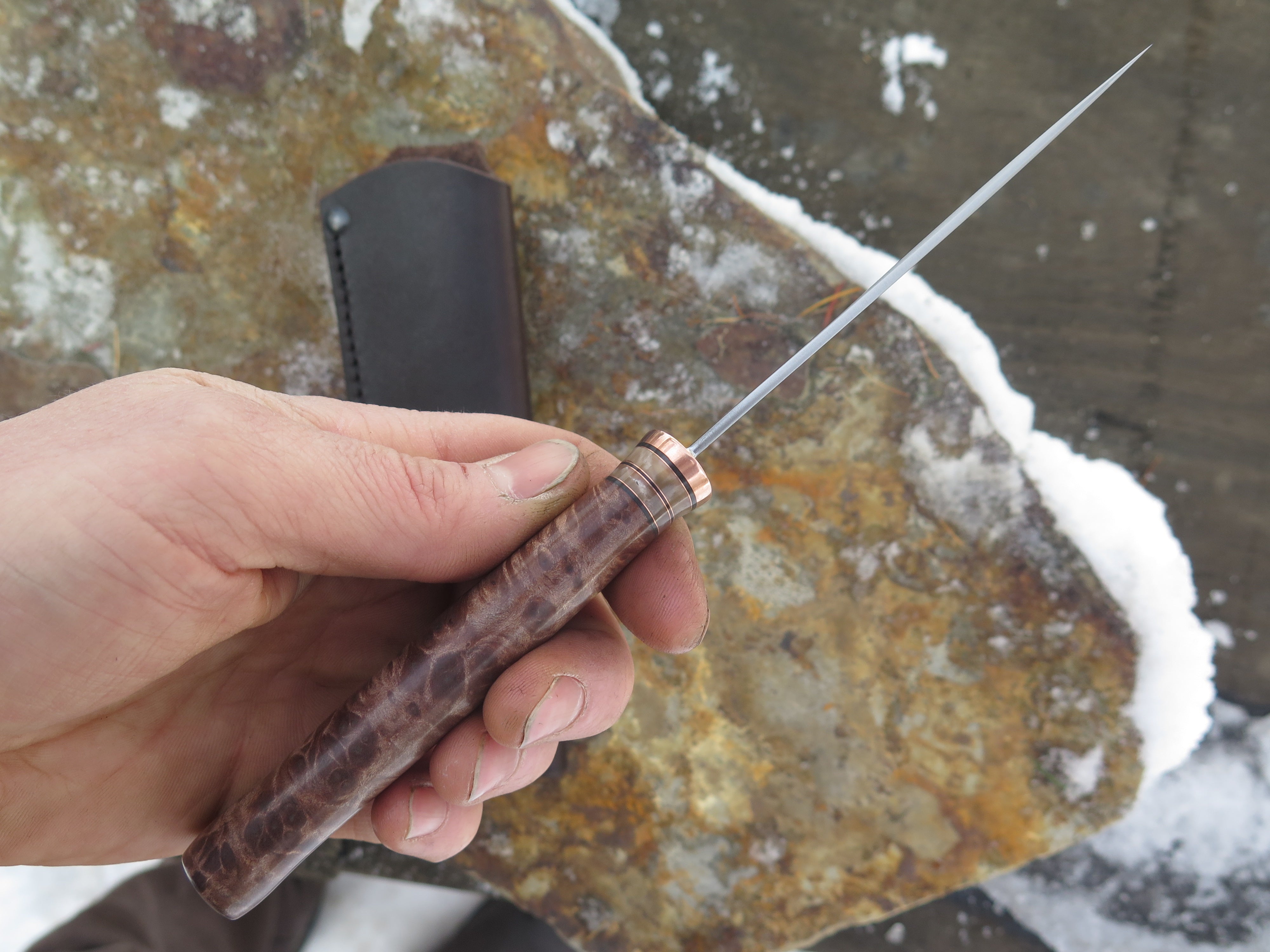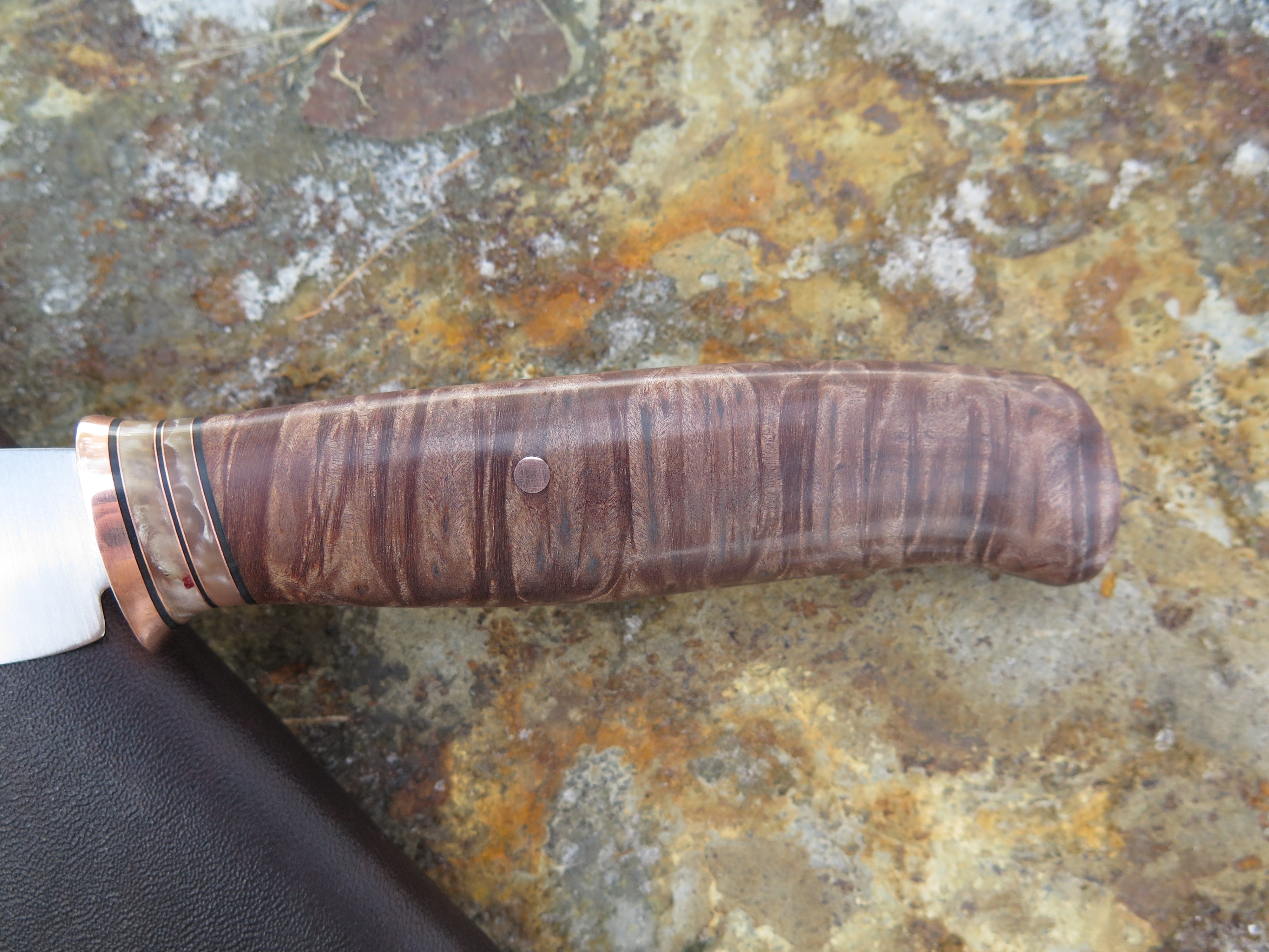 This beautiful new Pintail from Behring Made© is hand forged from 1/8" thick high carbon 01 tool steel and it measures 4 1/4" from tip to guard with a razor sharp convex grind that won't quit. The copper guard is soldered in place above black fiber, copper and two musk ox boss spacers in addition to an outstanding spalted maple handle that's pinned through the tang with copper. The overall length measures 8 5/8" and it comes in a classic leather belt pouch sheath.